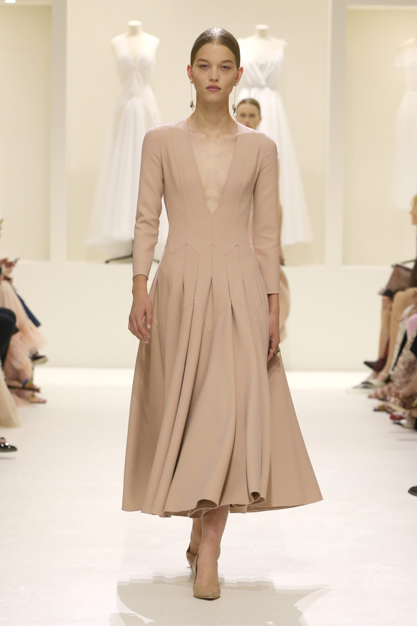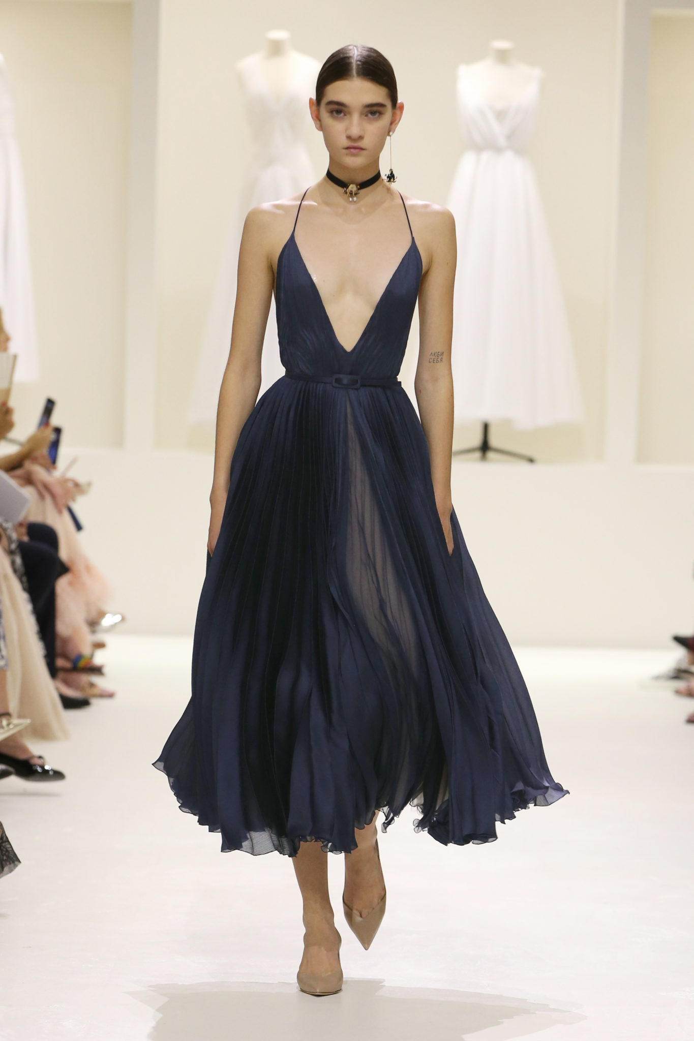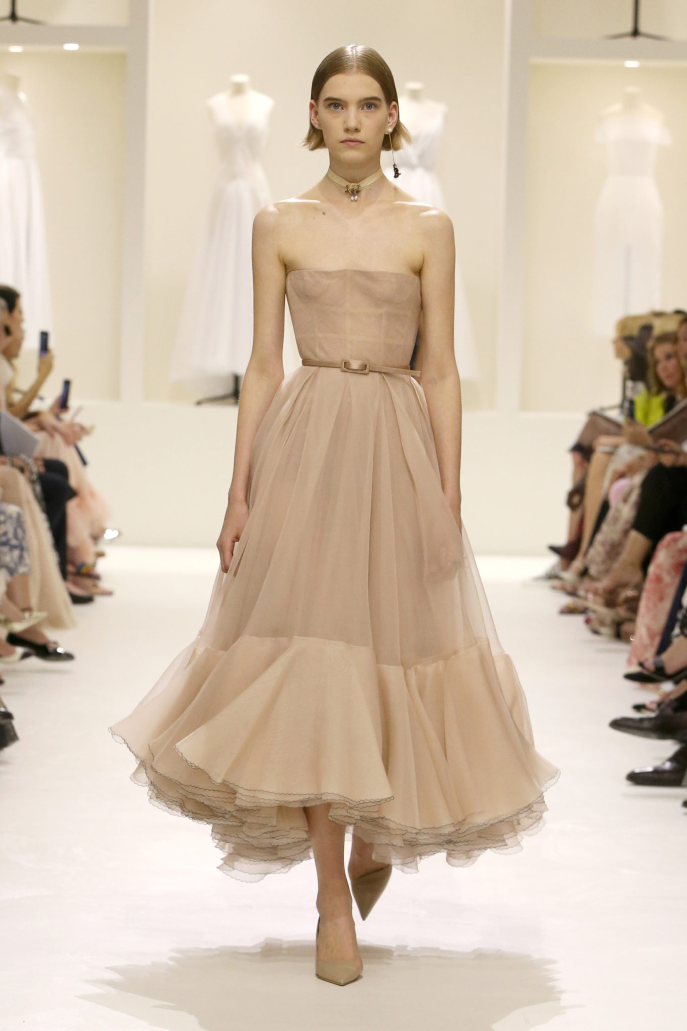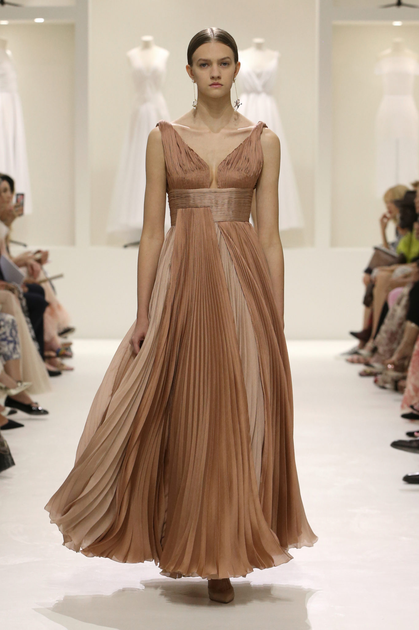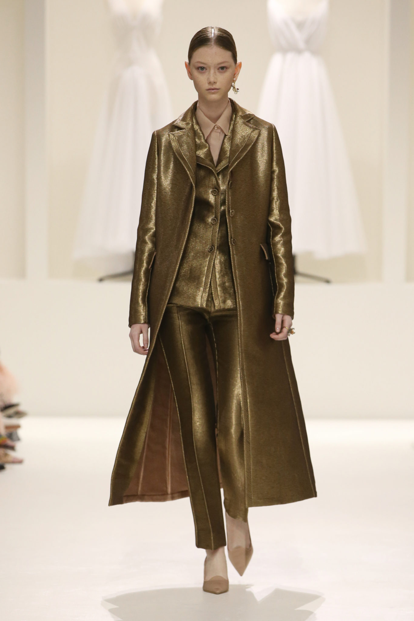«Curieusement, c’est peut-être le désordre inhérent au désir et à la subjectivité qui rend la psychanalyse lacanienne et l’art d’avant-garde si remarquablement radicaux, faisant de tous deux des idéaux pour une négociation des créations étranges de la couture.» Alison Bancroft*Est-il possible de célébrer la haute couture tout en faisant une lecture critique de celle-ci ? Est-il possible d’être fidèle aux règles strictes édictées par la Chambre syndicale de la haute couture** tout en les décomposant pour créer un ordre nouveau ? Ce sont ces interrogations que Maria Grazia Chiuri a soulevées pour cette collection haute couture automne-hiver 2018-2019, à l’issue de l’exposition Christian Dior, couturier du rêve, qui a mis en lumière, au musée des Arts décoratifs, les créations de la haute couture en rendant hommage à ce lieu sacré et intemporel : l’atelier. Les ateliers sont des temples, gardiens de la pensée. C’est au cœur de cette mémoire de la couture – cette série d’images, de formes, de couleurs et d’attitudes – que se déploie la vision créative de Maria Grazia Chiuri. La couture est une instance de l’avant-garde, une forme d’art qui se développe grâce à l’imagination. Une réflexion qui cultive l’audace de répéter des gestes codifiés tout en cherchant à les enfreindre. Car la couture est aujourd’hui, avant tout, un geste conceptuel. A l’image d’un ready-made de Marcel Duchamp. Ce sont parfois des tissus qui guident le projet, qui sont travaillés dans d’anciennes manufactures qui ne peuvent produire que quelques mètres à la fois et auxquelles on a demandé d’introduire un élément inhabituel ou un nouveau savoir-faire ; chaque matière pouvant subir des modifications qui accentuent ses effets de manière inattendue. D’autres fois, l’idée première vient de la volonté de reconstruire le rituel et la façon de s’habiller au gré des occasions qui rythment une journée. La haute couture, c’est la possibilité de porter une qualité unique, d’adapter l’œuvre parfaite à son propre corps. Maria Grazia Chiuri revient aux fondamentaux et imagine des tailleurs dans lesquels les manches de la veste Bar deviennent des ailes de chauve-souris. La véritable transgression étant de se référer aux règles d’usage tout en détournant leur syntaxe. La palette des couleurs poudrées (brique, vert, rose ou orange), en dialogue avec le Nude, colore les vêtements, mais aussi les accessoires – bijoux fantaisie raffinés, voilettes et chapeaux – telle une continuité complémentaire du corps que la couture met à l’honneur. Les robes du soir, éblouissantes par leurs différents plissés, ou par leurs jeux de superpositions, contrastent avec des bustiers simples qui offrent une dissonance surprenante. La forme sculpturale d’une robe de soie rouge cousue d’une seule pièce ouvre la voie à une série de créations majestueuses et intimes, à la fois retenues et explosives : la couture devient alors un lieu psychologique de résistance féminine. Alison Bancroft assimile, dans un sens lacanien, la couture au mode d’expression des avant-gardes : réappropriation de pratiques séculaires rejetées par le désir de nouveauté et réinterprétation des traditions par des valeurs contemporaines. C’est par cette rencontre entre un système de règles établies et la créativité la plus libre que, pour Maria Grazia Chiuri, la couture devient rébellion : une sorte de « guérilla » idéologique qui explose aux frontières d’une tradition ancrée, sans jamais les outrepasser.