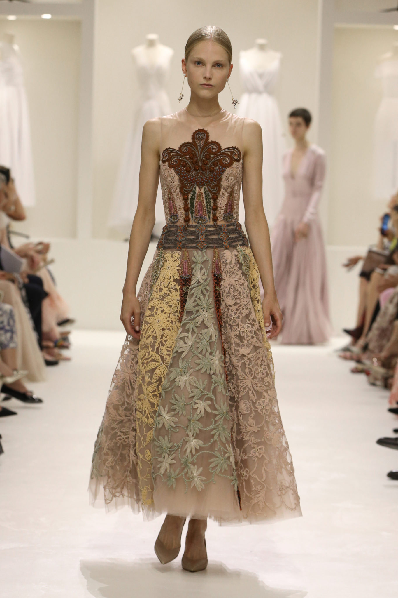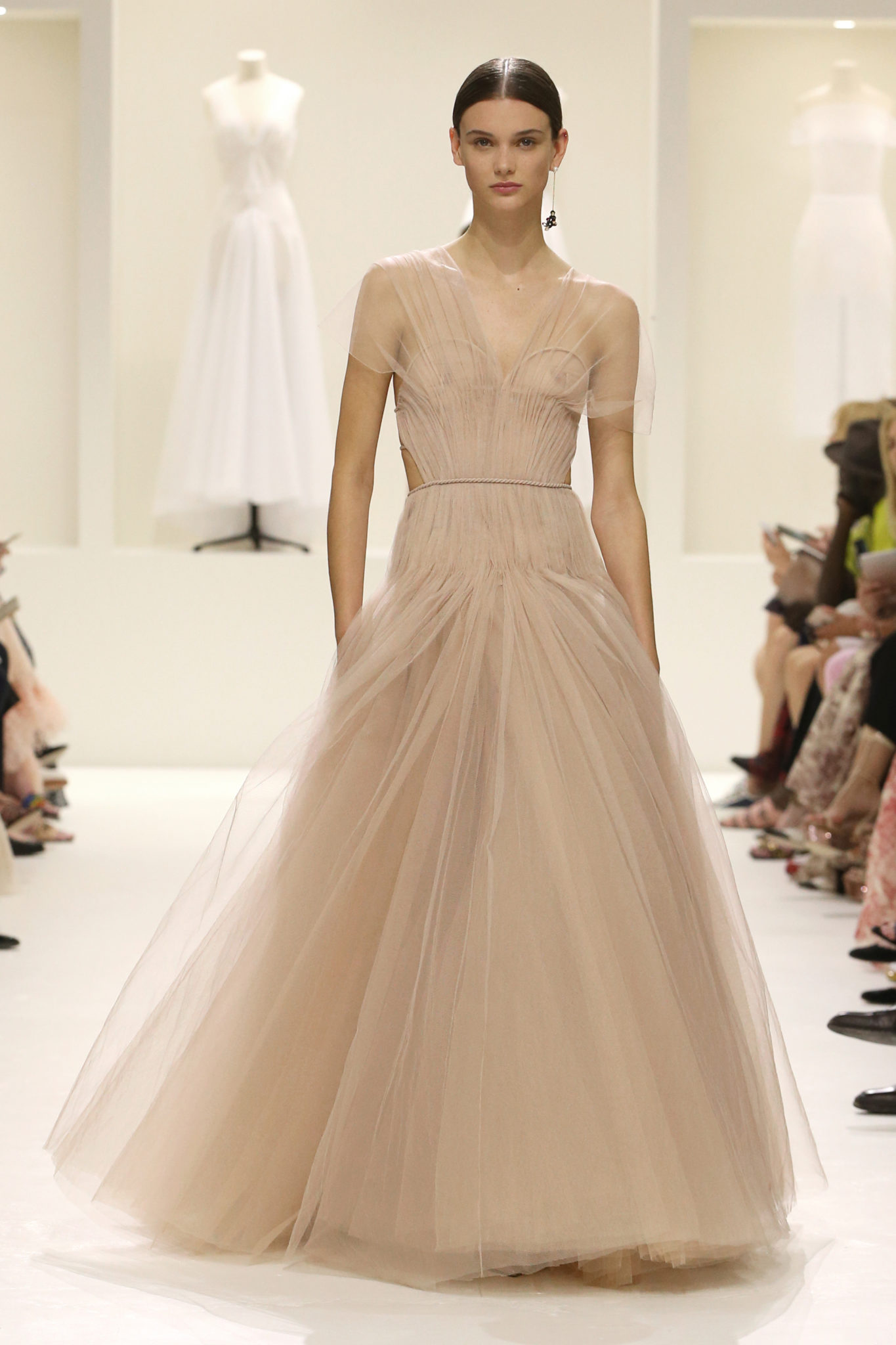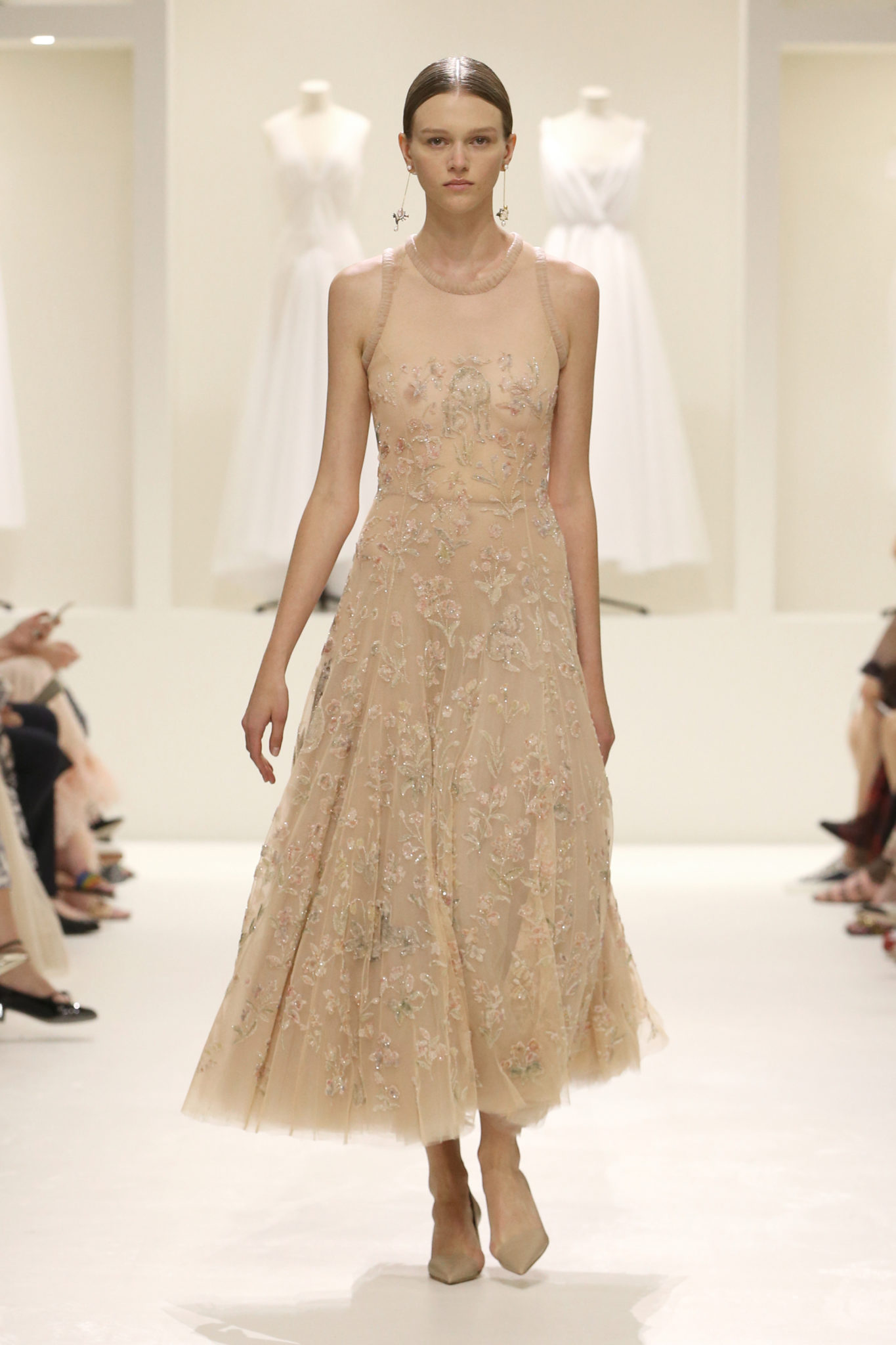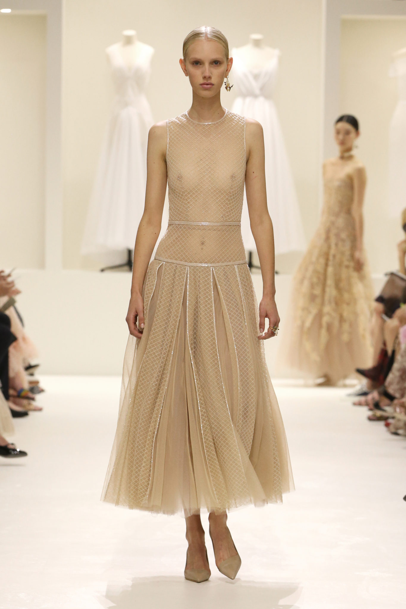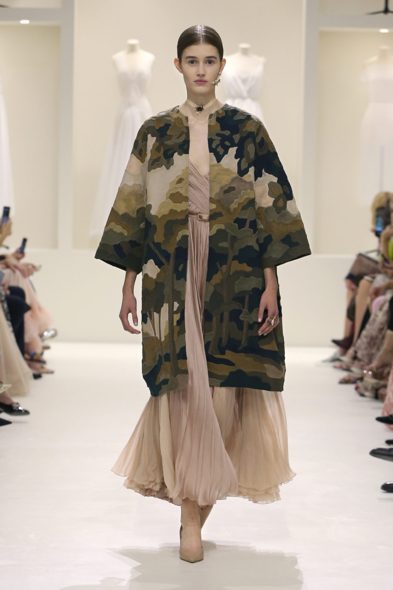 «Curieusement, c’est peut-être le désordre inhérent au désir et à la subjectivité qui rend la psychanalyse lacanienne et l’art d’avant-garde si remarquablement radicaux, faisant de tous deux des idéaux pour une négociation des créations étranges de la couture.» Alison Bancroft*Est-il possible de célébrer la haute couture tout en faisant une lecture critique de celle-ci ? Est-il possible d’être fidèle aux règles strictes édictées par la Chambre syndicale de la haute couture** tout en les décomposant pour créer un ordre nouveau ? Ce sont ces interrogations que Maria Grazia Chiuri a soulevées pour cette collection haute couture automne-hiver 2018-2019, à l’issue de l’exposition Christian Dior, couturier du rêve, qui a mis en lumière, au musée des Arts décoratifs, les créations de la haute couture en rendant hommage à ce lieu sacré et intemporel : l’atelier. Les ateliers sont des temples, gardiens de la pensée. C’est au cœur de cette mémoire de la couture – cette série d’images, de formes, de couleurs et d’attitudes – que se déploie la vision créative de Maria Grazia Chiuri. La couture est une instance de l’avant-garde, une forme d’art qui se développe grâce à l’imagination. Une réflexion qui cultive l’audace de répéter des gestes codifiés tout en cherchant à les enfreindre. Car la couture est aujourd’hui, avant tout, un geste conceptuel. A l’image d’un ready-made de Marcel Duchamp. Ce sont parfois des tissus qui guident le projet, qui sont travaillés dans d’anciennes manufactures qui ne peuvent produire que quelques mètres à la fois et auxquelles on a demandé d’introduire un élément inhabituel ou un nouveau savoir-faire ; chaque matière pouvant subir des modifications qui accentuent ses effets de manière inattendue. D’autres fois, l’idée première vient de la volonté de reconstruire le rituel et la façon de s’habiller au gré des occasions qui rythment une journée. La haute couture, c’est la possibilité de porter une qualité unique, d’adapter l’œuvre parfaite à son propre corps. Maria Grazia Chiuri revient aux fondamentaux et imagine des tailleurs dans lesquels les manches de la veste Bar deviennent des ailes de chauve-souris. La véritable transgression étant de se référer aux règles d’usage tout en détournant leur syntaxe. La palette des couleurs poudrées (brique, vert, rose ou orange), en dialogue avec le Nude, colore les vêtements, mais aussi les accessoires – bijoux fantaisie raffinés, voilettes et chapeaux – telle une continuité complémentaire du corps que la couture met à l’honneur. Les robes du soir, éblouissantes par leurs différents plissés, ou par leurs jeux de superpositions, contrastent avec des bustiers simples qui offrent une dissonance surprenante. La forme sculpturale d’une robe de soie rouge cousue d’une seule pièce ouvre la voie à une série de créations majestueuses et intimes, à la fois retenues et explosives : la couture devient alors un lieu psychologique de résistance féminine. Alison Bancroft assimile, dans un sens lacanien, la couture au mode d’expression des avant-gardes : réappropriation de pratiques séculaires rejetées par le désir de nouveauté et réinterprétation des traditions par des valeurs contemporaines. C’est par cette rencontre entre un système de règles établies et la créativité la plus libre que, pour Maria Grazia Chiuri, la couture devient rébellion : une sorte de « guérilla » idéologique qui explose aux frontières d’une tradition ancrée, sans jamais les outrepasser.
