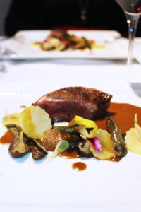 - Magret de canard de Saint-Joseph, rôti sur coffre, poire de terre, champignons confits & jus au sirop la cuite