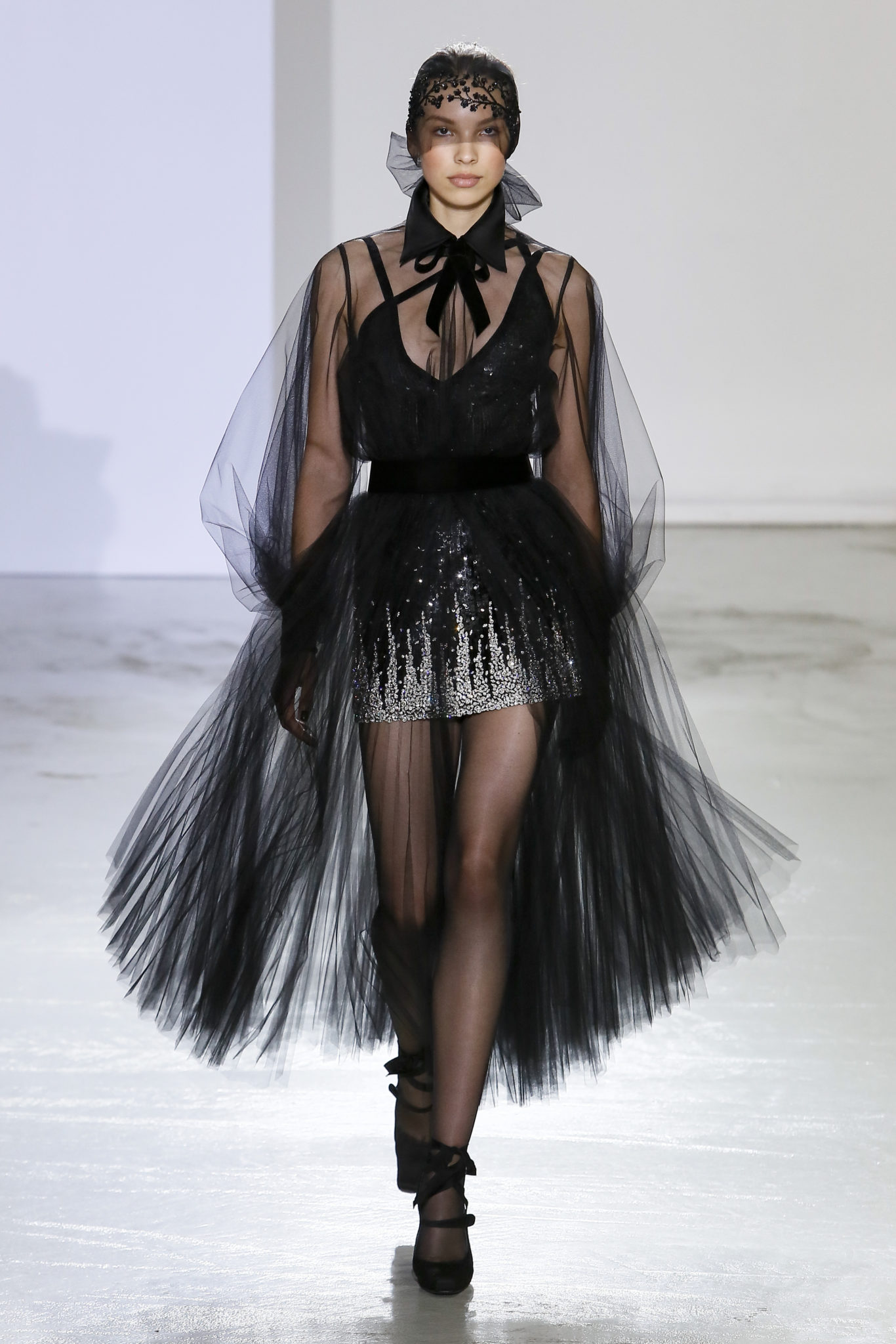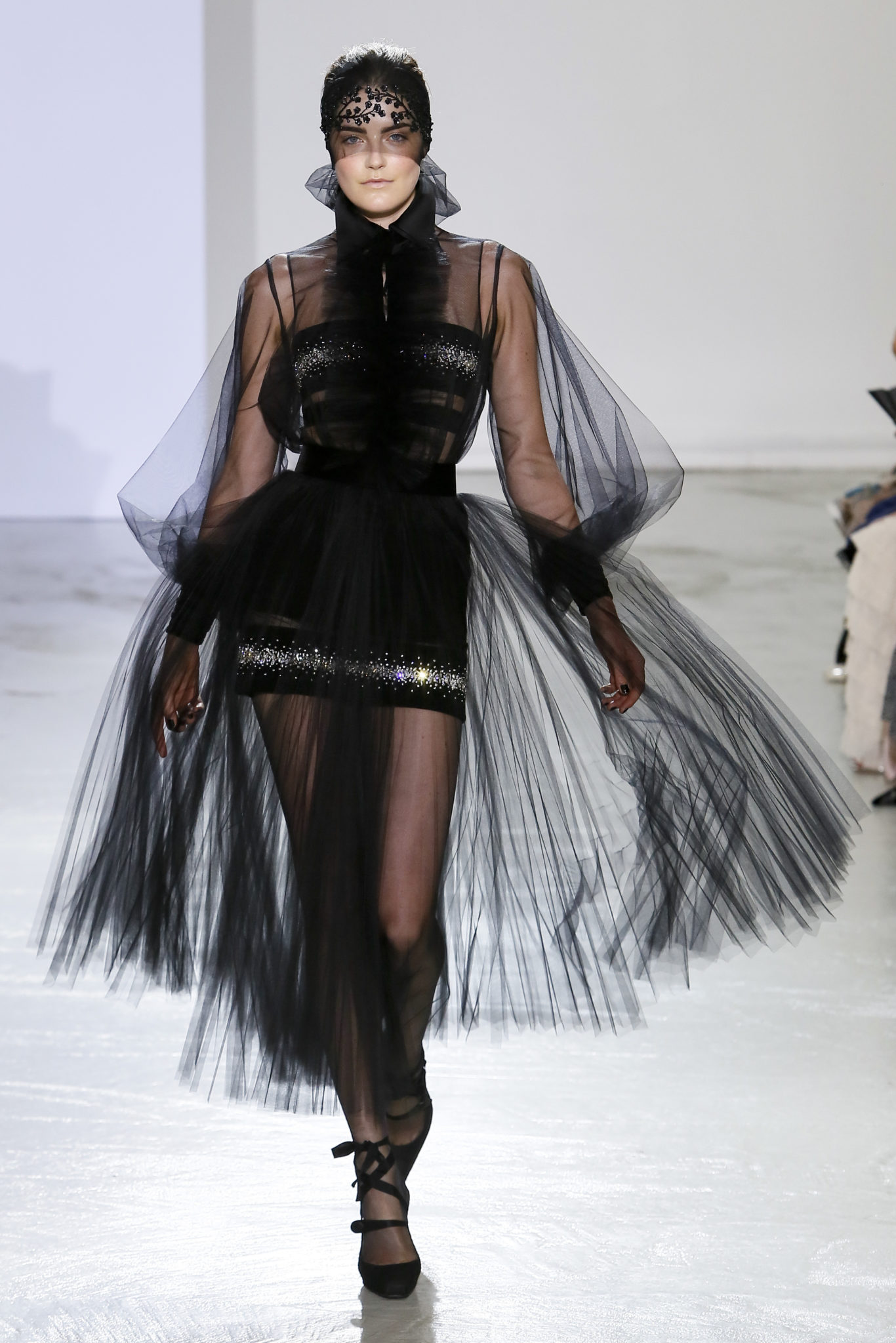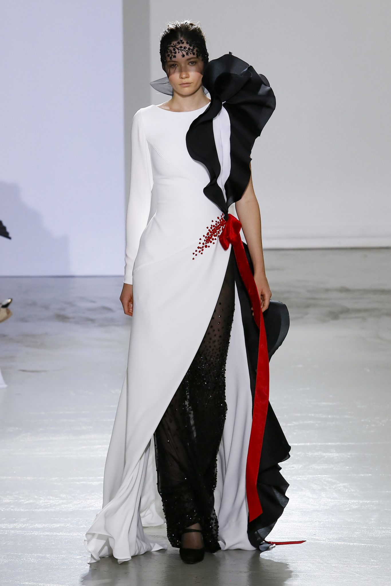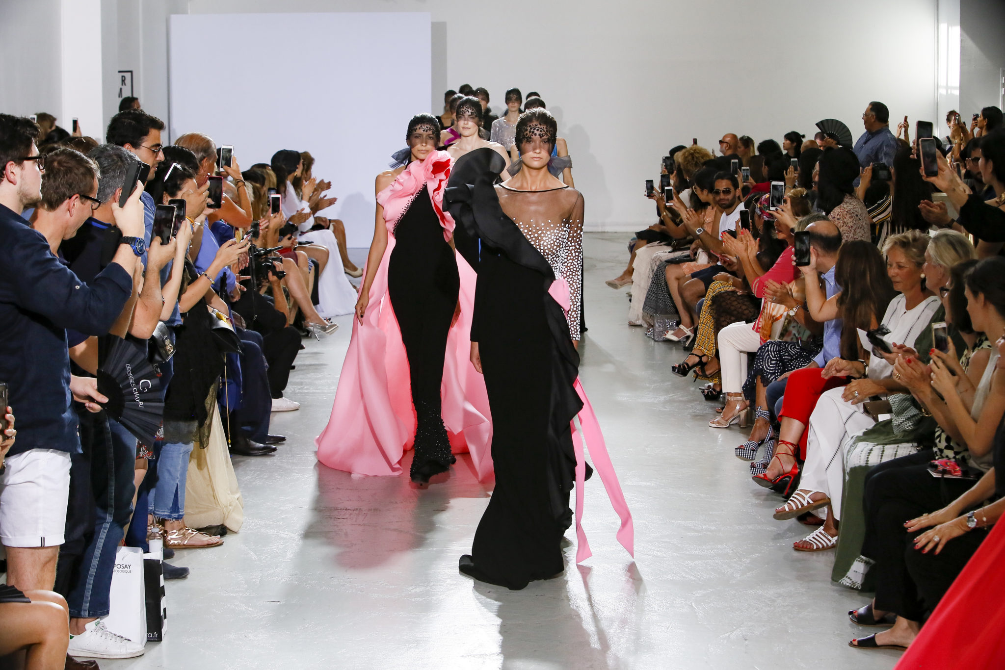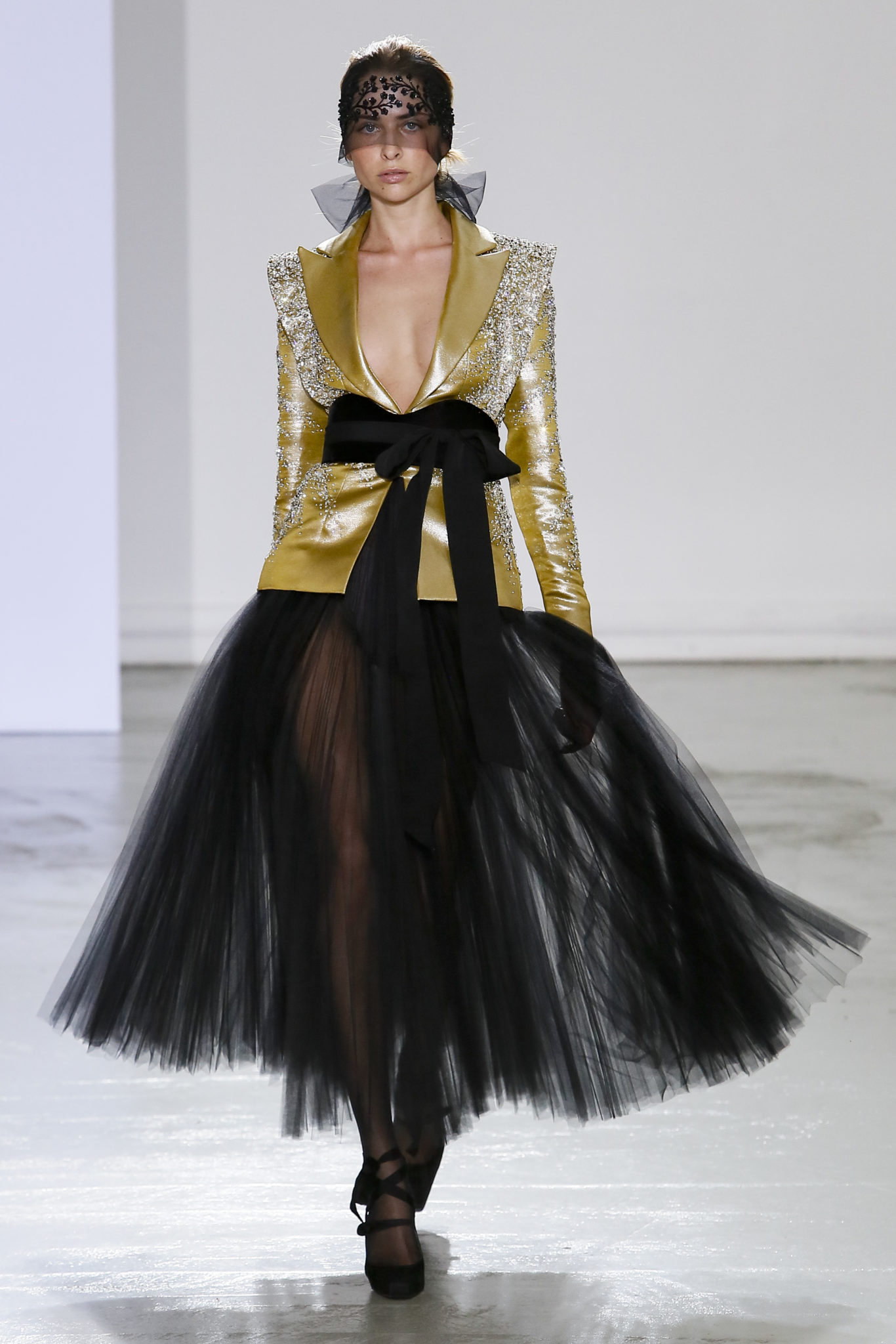 AUTOMNE-HIVER 2018-2019 Georges Chakra sème allégrement le trouble, celui d’une beauté actuelle avec une allure fin de siècle. Un brin mystérieuse, excentrique. Le noir fait autorité, l’argent, le rouge, le shocking pink et l’orange flamboyant viennent perturber l’ordre établi du noir. Le tulle plissé, la mousseline découpée, des mille-feuilles de gaze, viennent parfois se poser sur une robe, une veste, un col ou bien encore une jupe. De la brillance avec de la dentelle lamée, velours lumineux, jais, cristaux et sequins. Les volumes structurés, les bustes corsetés, les tailles marquées imposent une silhouette altière. Des effets graphiques donnés par des découpes soulignées de rubans de velours. Le tulle omniprésent dans la collection se pare de mille feux pour une robe de mariée en parfaite parité entre fragilité et puissance.
