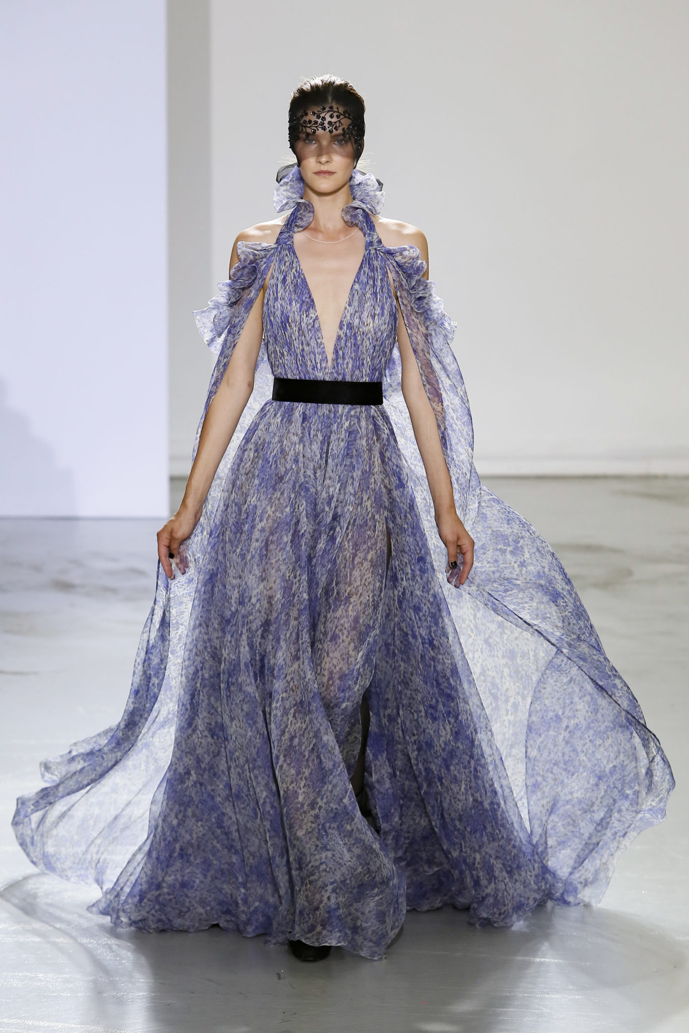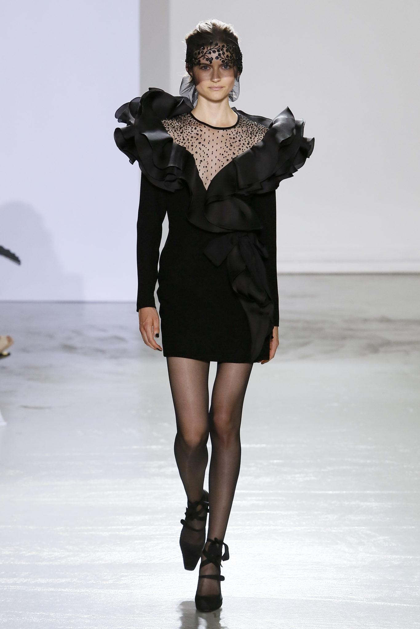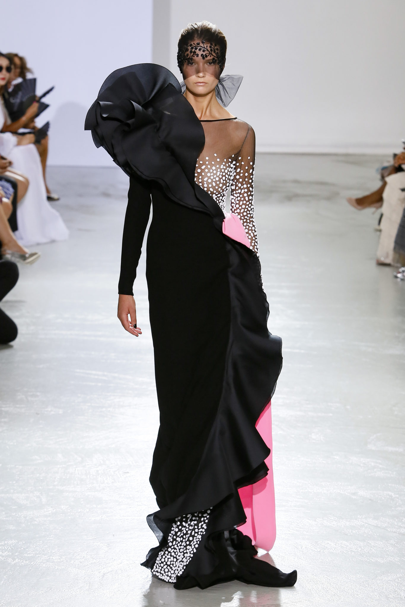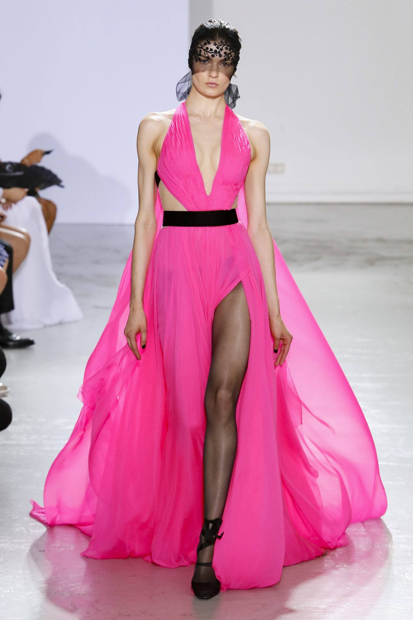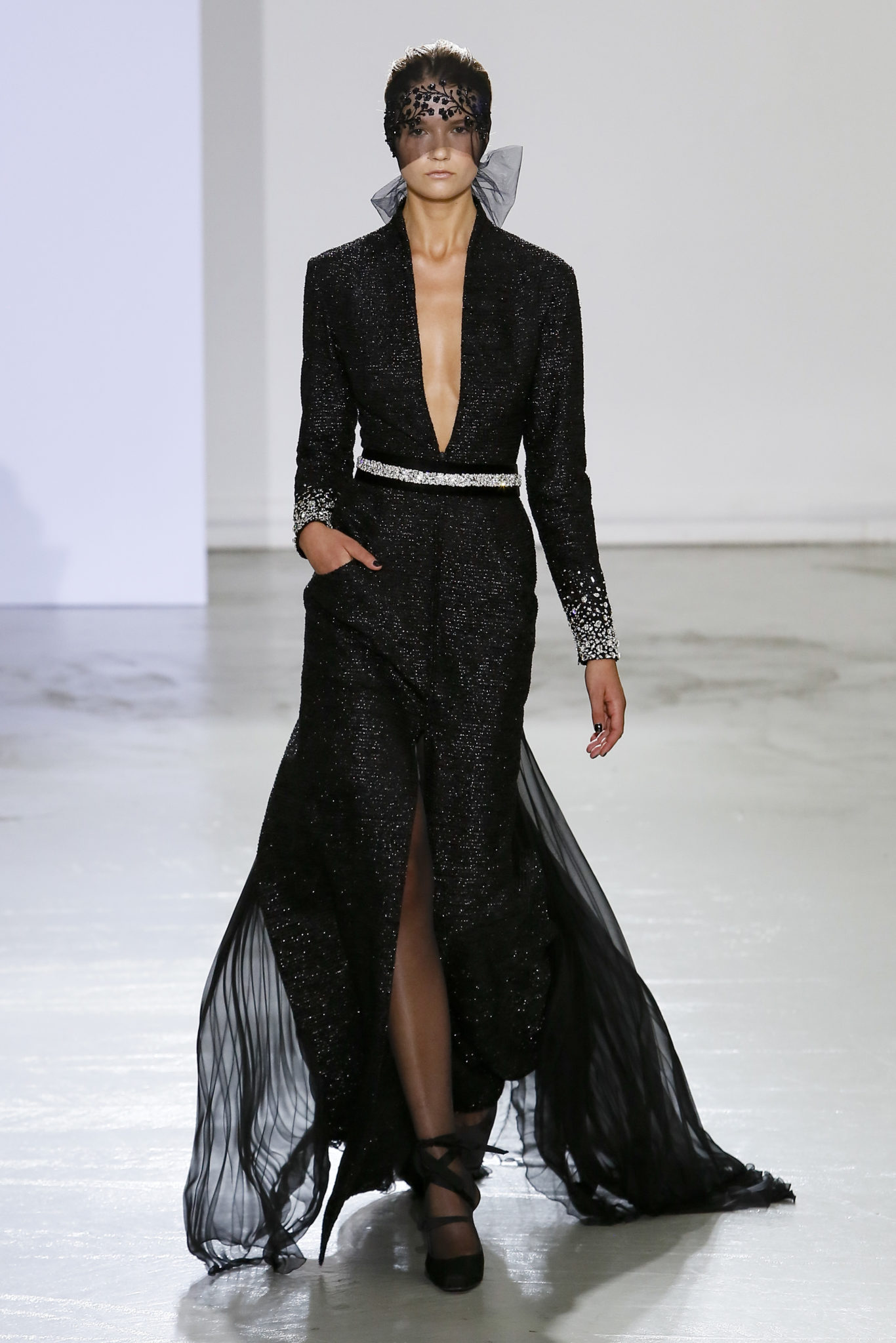 AUTOMNE-HIVER 2018-2019 Georges Chakra sème allégrement le trouble, celui d’une beauté actuelle avec une allure fin de siècle. Un brin mystérieuse, excentrique. Le noir fait autorité, l’argent, le rouge, le shocking pink et l’orange flamboyant viennent perturber l’ordre établi du noir. Le tulle plissé, la mousseline découpée, des mille-feuilles de gaze, viennent parfois se poser sur une robe, une veste, un col ou bien encore une jupe. De la brillance avec de la dentelle lamée, velours lumineux, jais, cristaux et sequins. Les volumes structurés, les bustes corsetés, les tailles marquées imposent une silhouette altière. Des effets graphiques donnés par des découpes soulignées de rubans de velours. Le tulle omniprésent dans la collection se pare de mille feux pour une robe de mariée en parfaite parité entre fragilité et puissance.