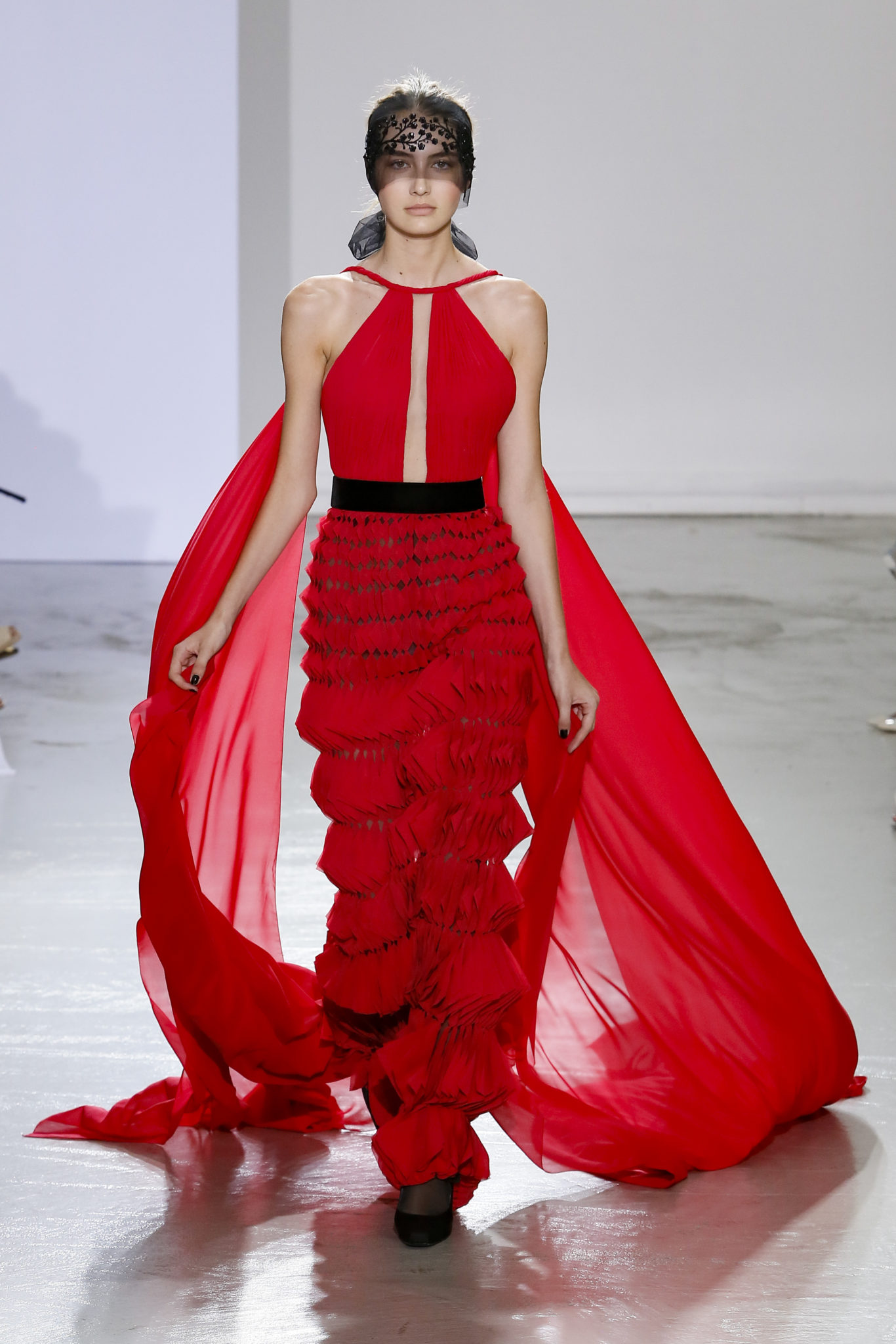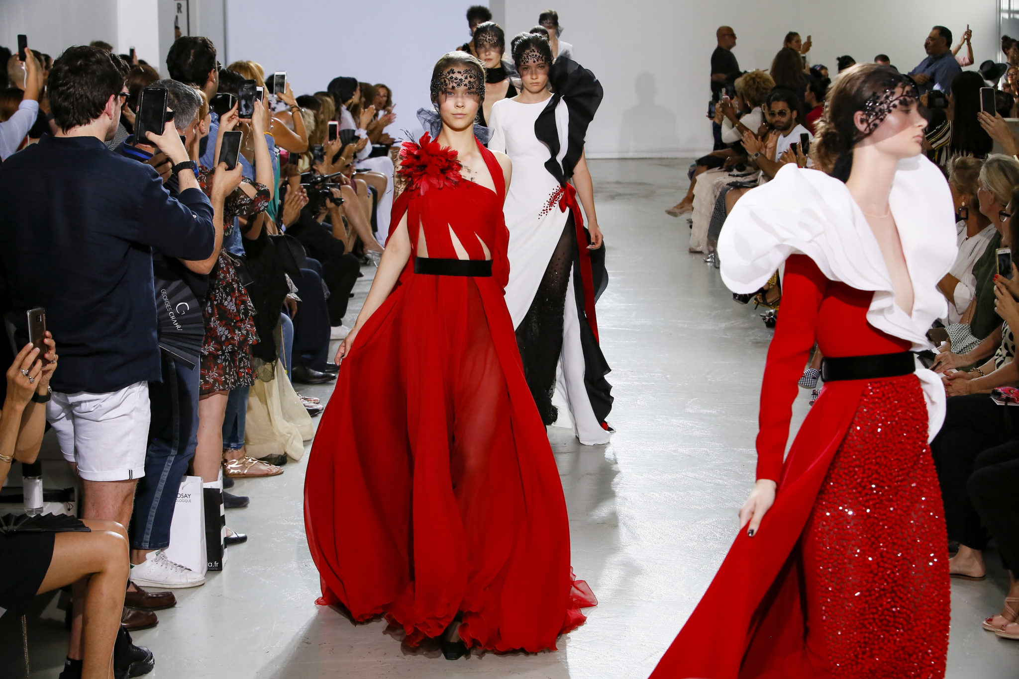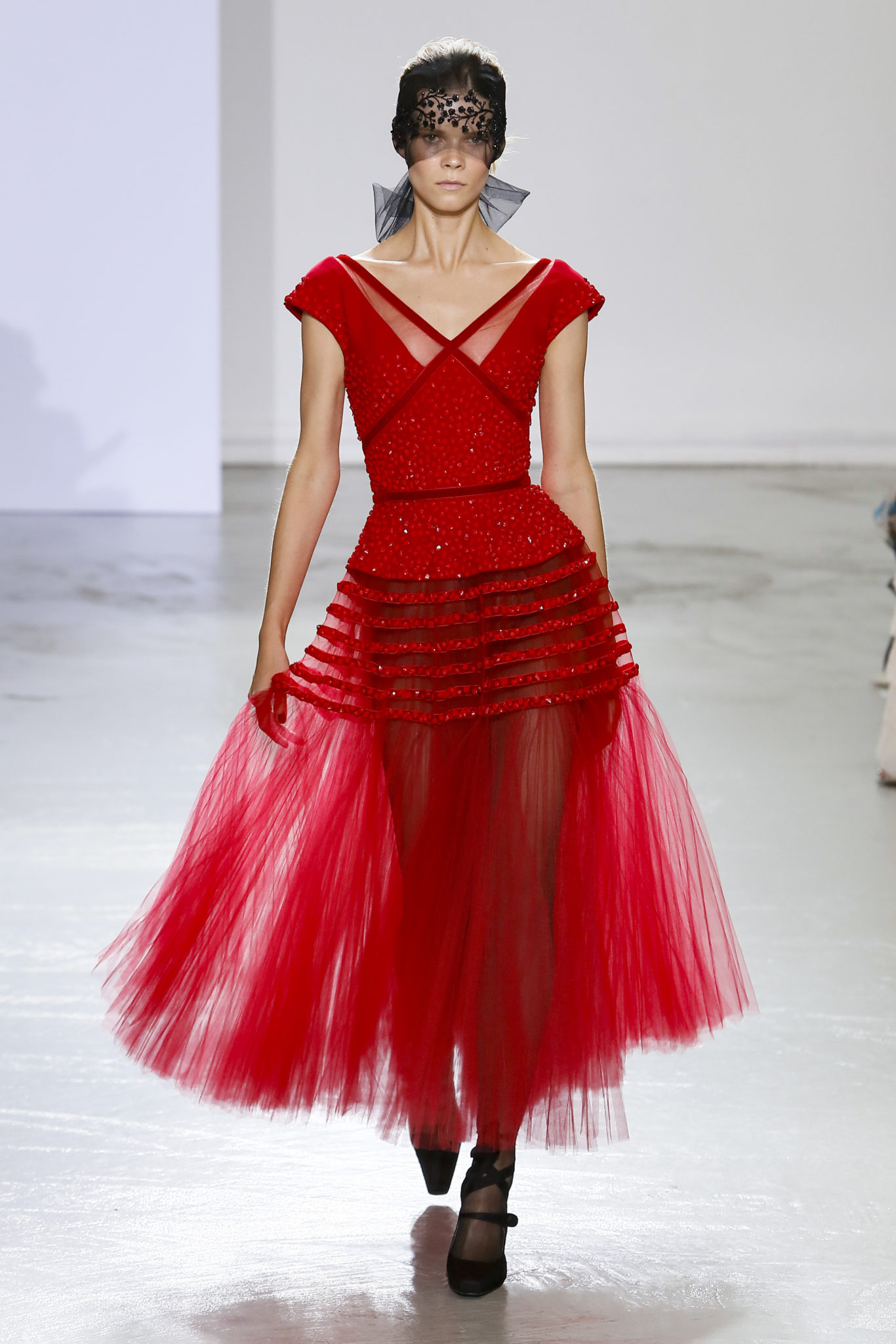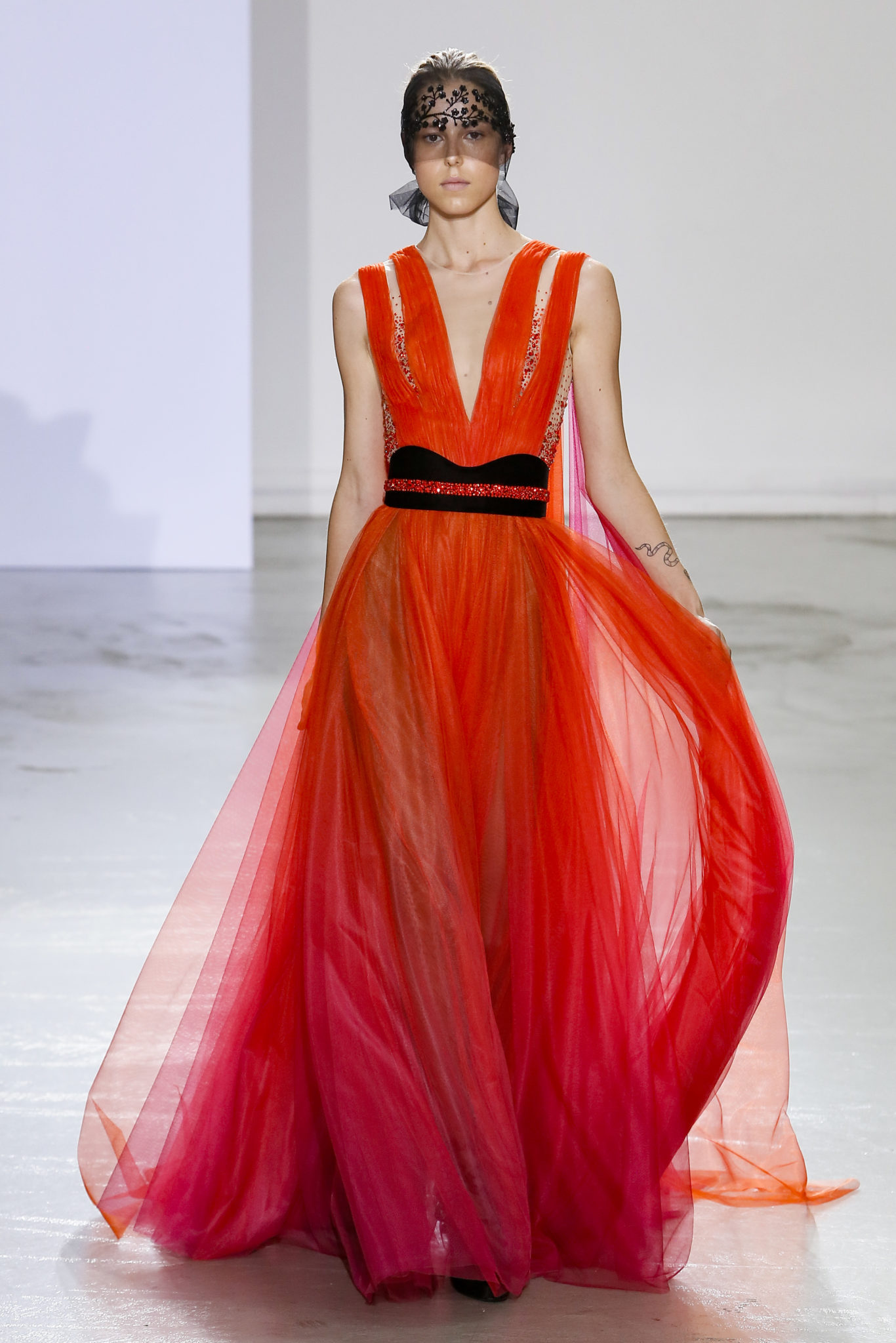 AUTOMNE-HIVER 2018-2019 Georges Chakra sème allégrement le trouble, celui d’une beauté actuelle avec une allure fin de siècle. Un brin mystérieuse, excentrique. Le noir fait autorité, l’argent, le rouge, le shocking pink et l’orange flamboyant viennent perturber l’ordre établi du noir. Le tulle plissé, la mousseline découpée, des mille-feuilles de gaze, viennent parfois se poser sur une robe, une veste, un col ou bien encore une jupe. De la brillance avec de la dentelle lamée, velours lumineux, jais, cristaux et sequins. Les volumes structurés, les bustes corsetés, les tailles marquées imposent une silhouette altière. Des effets graphiques donnés par des découpes soulignées de rubans de velours. Le tulle omniprésent dans la collection se pare de mille feux pour une robe de mariée en parfaite parité entre fragilité et puissance.