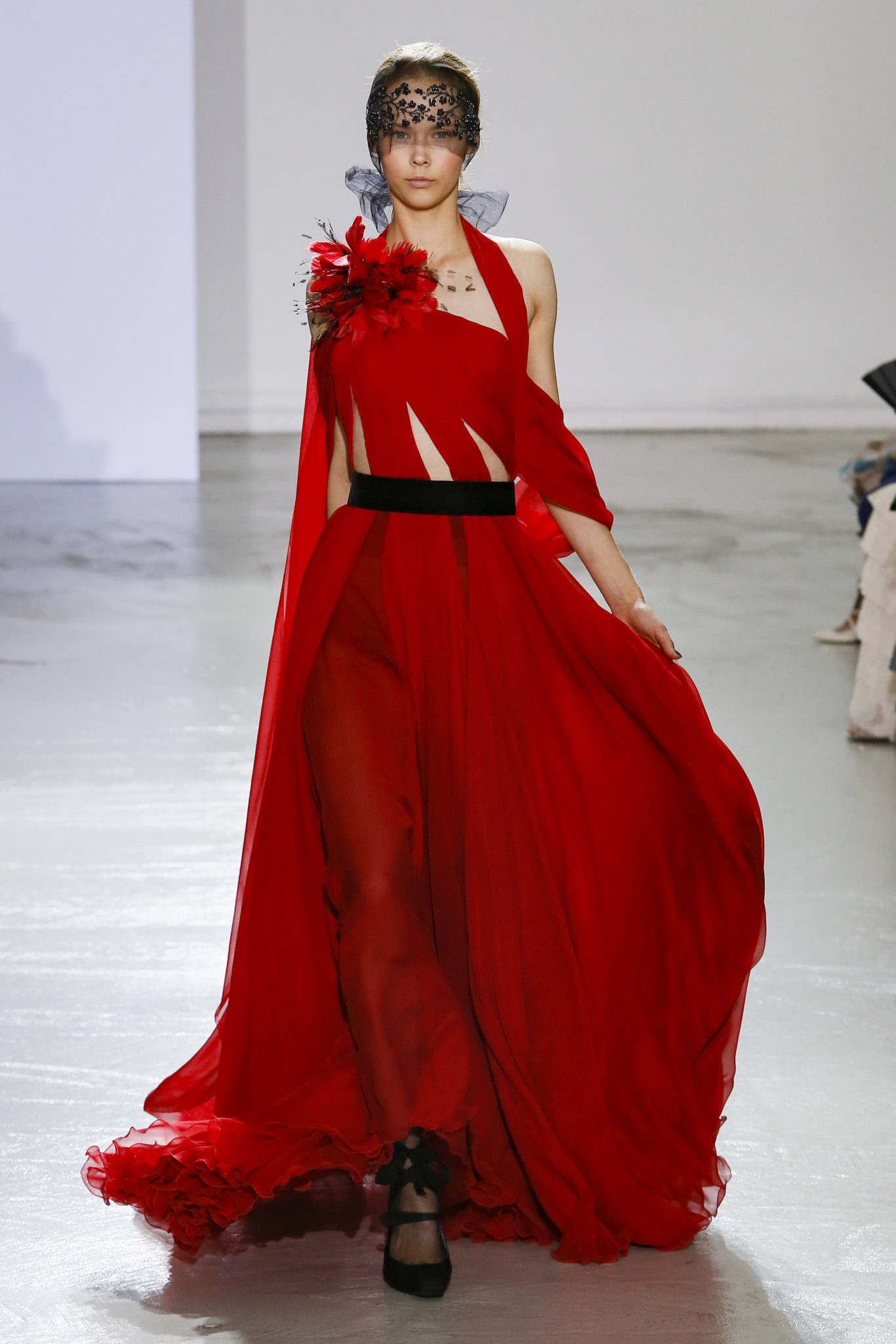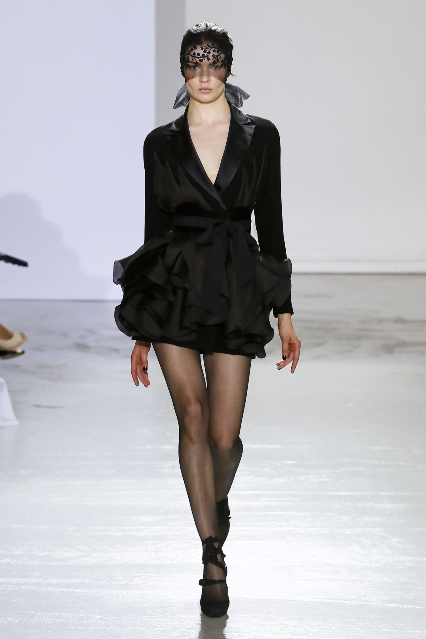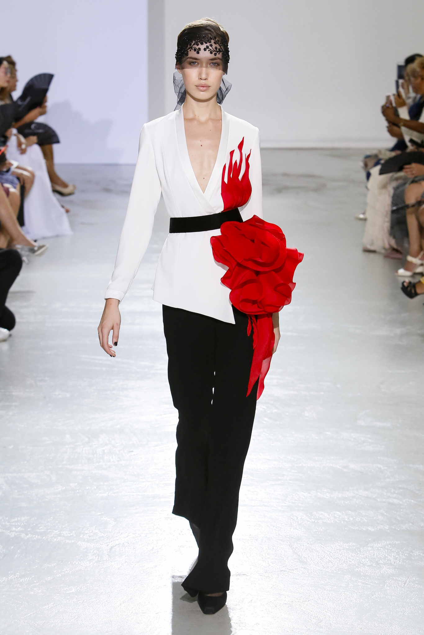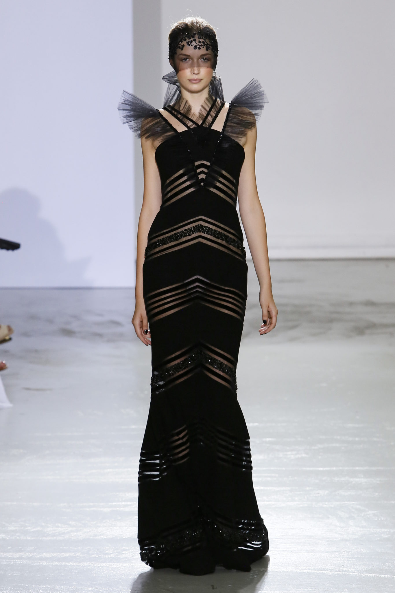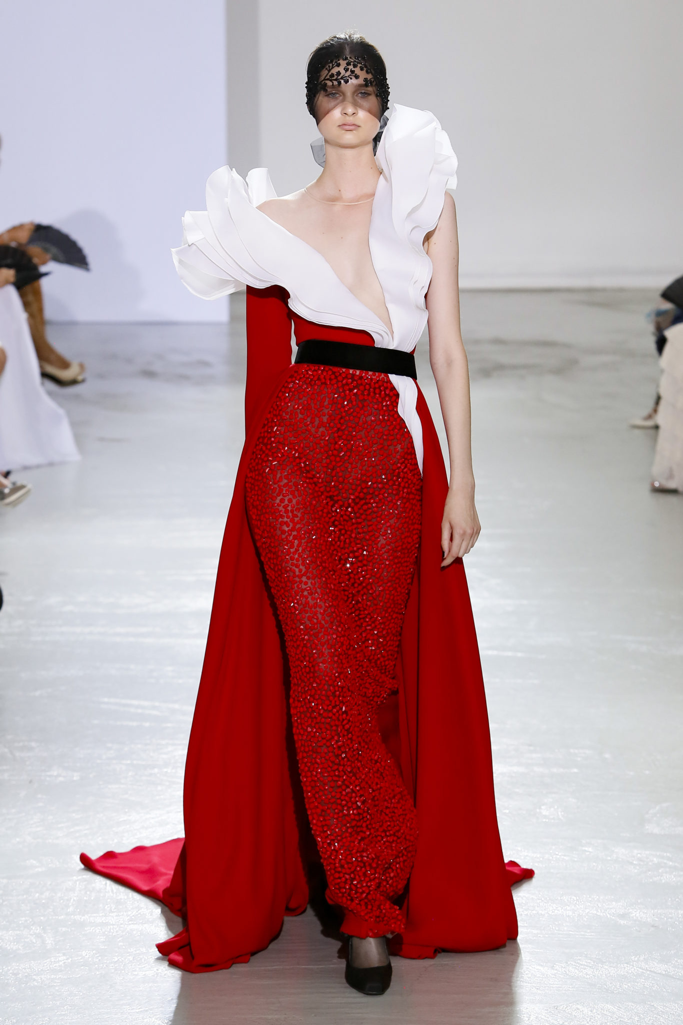 AUTOMNE-HIVER 2018-2019 Georges Chakra sème allégrement le trouble, celui d’une beauté actuelle avec une allure fin de siècle. Un brin mystérieuse, excentrique. Le noir fait autorité, l’argent, le rouge, le shocking pink et l’orange flamboyant viennent perturber l’ordre établi du noir. Le tulle plissé, la mousseline découpée, des mille-feuilles de gaze, viennent parfois se poser sur une robe, une veste, un col ou bien encore une jupe. De la brillance avec de la dentelle lamée, velours lumineux, jais, cristaux et sequins. Les volumes structurés, les bustes corsetés, les tailles marquées imposent une silhouette altière. Des effets graphiques donnés par des découpes soulignées de rubans de velours. Le tulle omniprésent dans la collection se pare de mille feux pour une robe de mariée en parfaite parité entre fragilité et puissance.