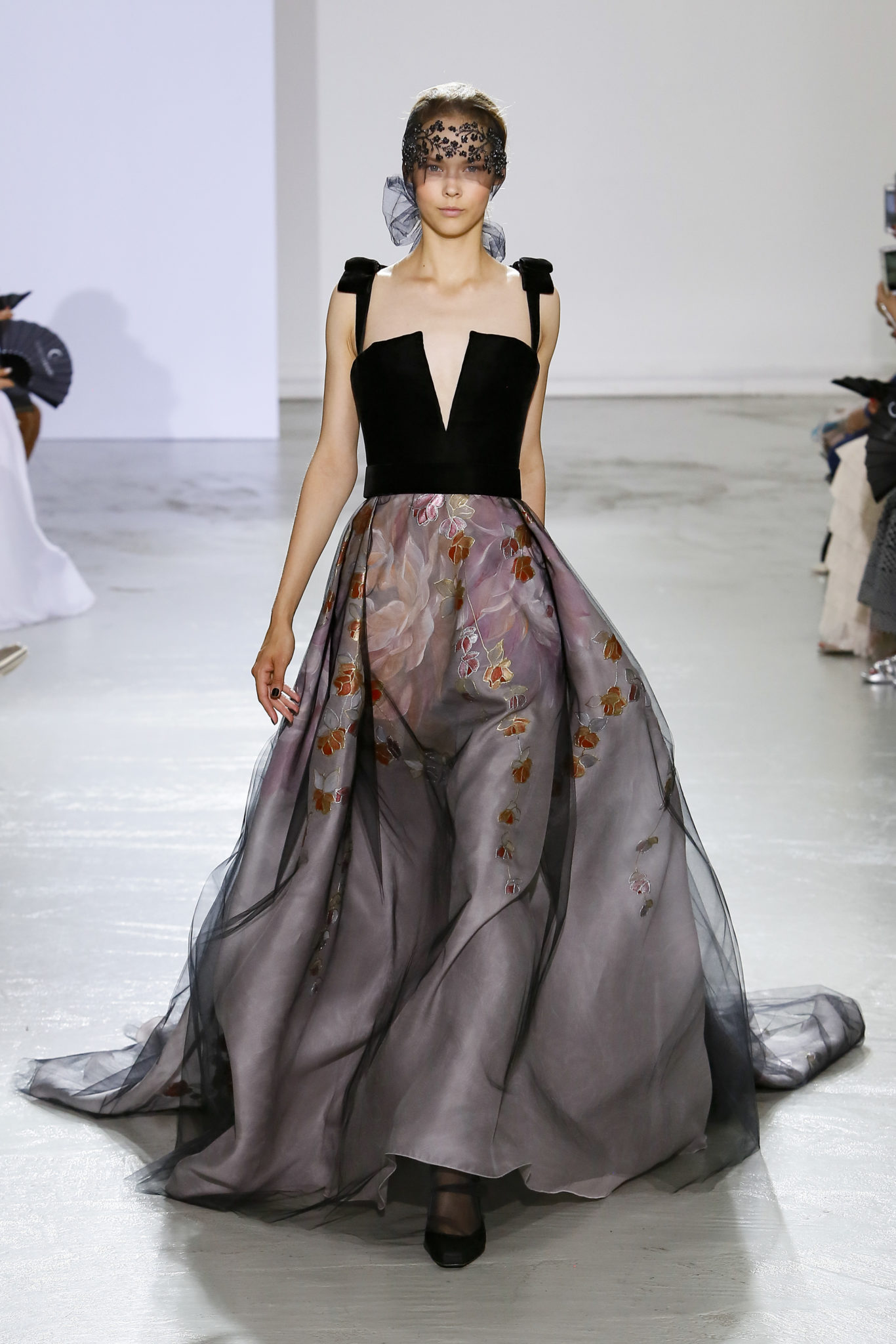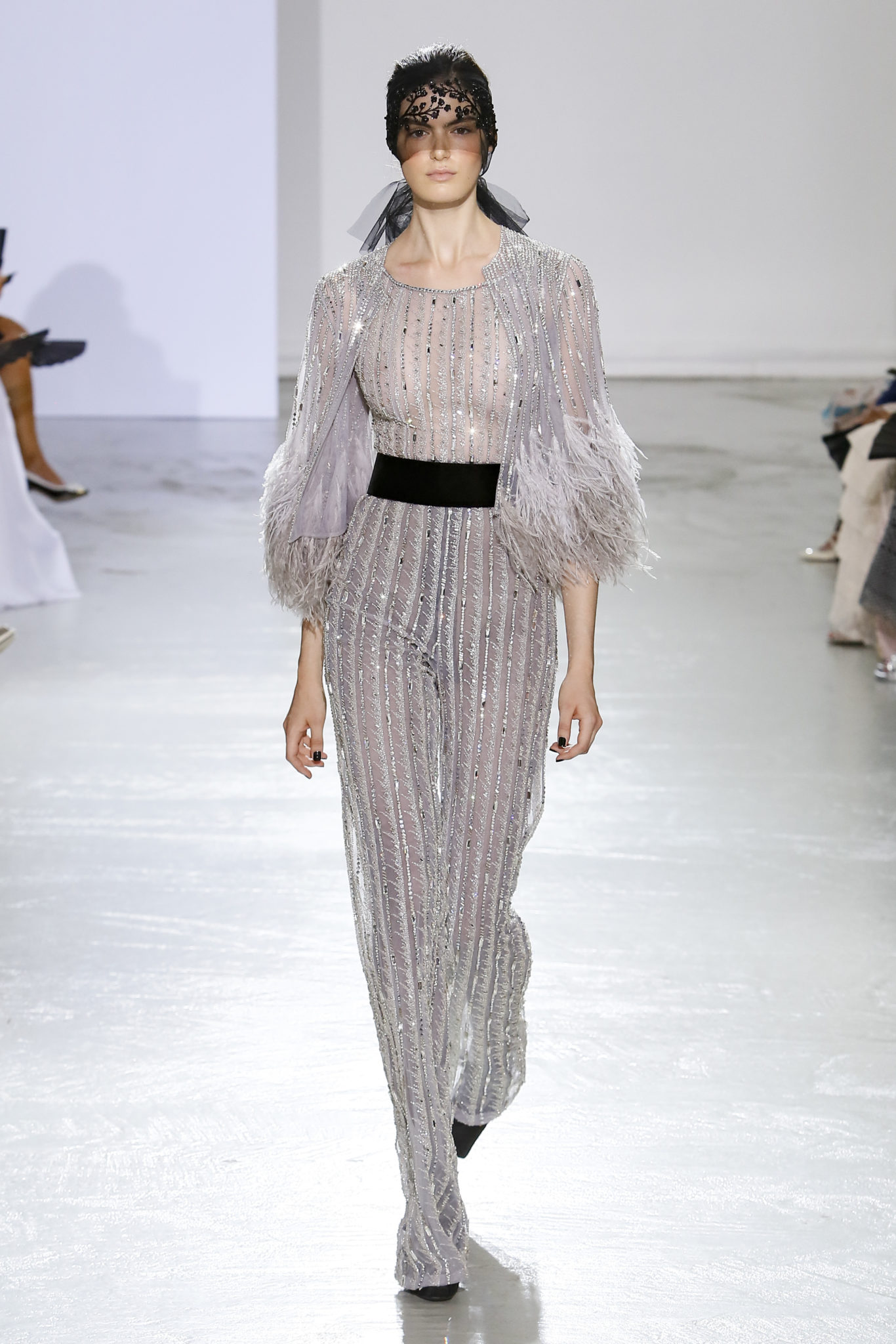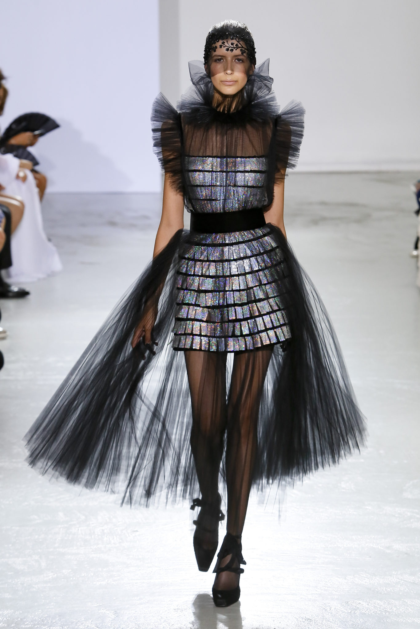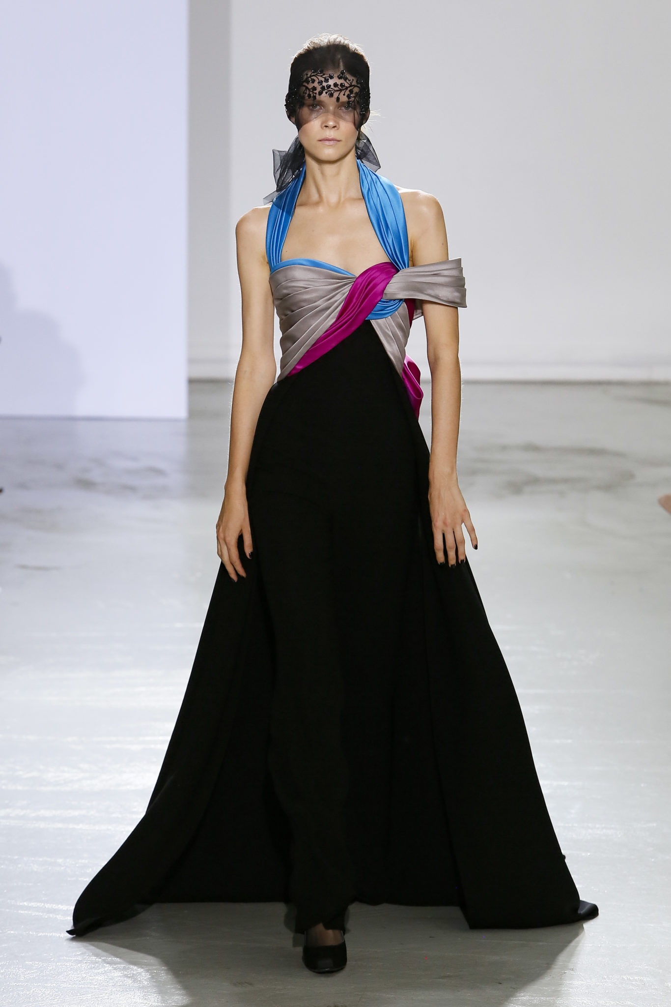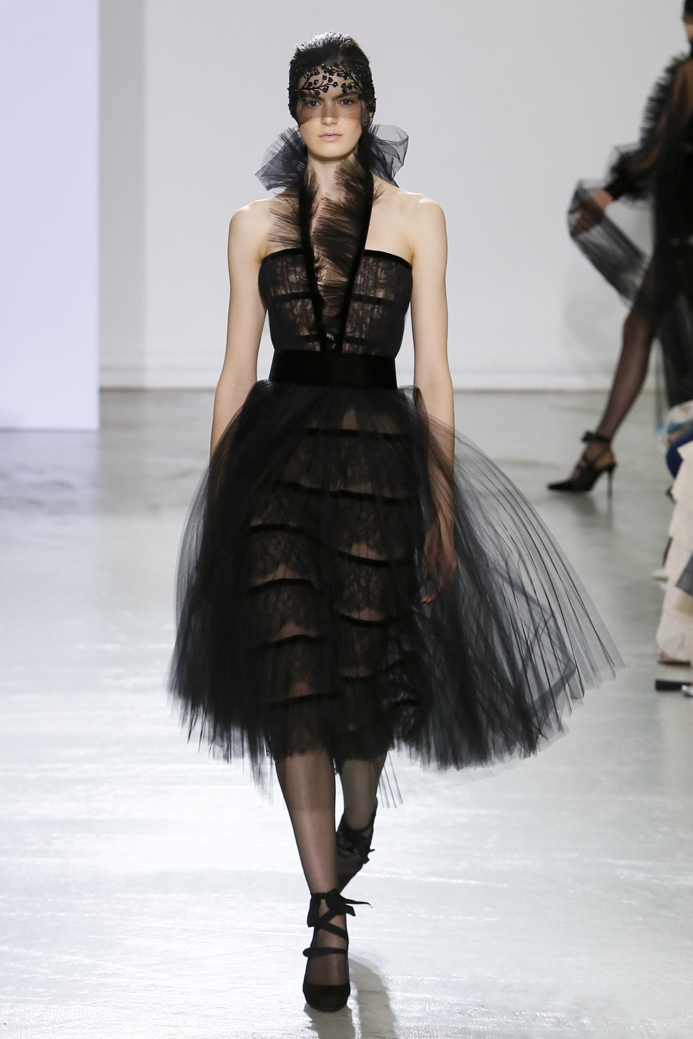 AUTOMNE-HIVER 2018-2019 Georges Chakra sème allégrement le trouble, celui d’une beauté actuelle avec une allure fin de siècle. Un brin mystérieuse, excentrique. Le noir fait autorité, l’argent, le rouge, le shocking pink et l’orange flamboyant viennent perturber l’ordre établi du noir. Le tulle plissé, la mousseline découpée, des mille-feuilles de gaze, viennent parfois se poser sur une robe, une veste, un col ou bien encore une jupe. De la brillance avec de la dentelle lamée, velours lumineux, jais, cristaux et sequins. Les volumes structurés, les bustes corsetés, les tailles marquées imposent une silhouette altière. Des effets graphiques donnés par des découpes soulignées de rubans de velours. Le tulle omniprésent dans la collection se pare de mille feux pour une robe de mariée en parfaite parité entre fragilité et puissance.