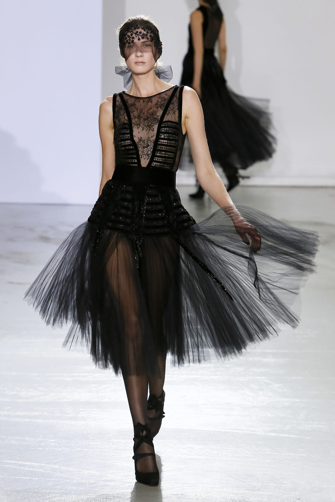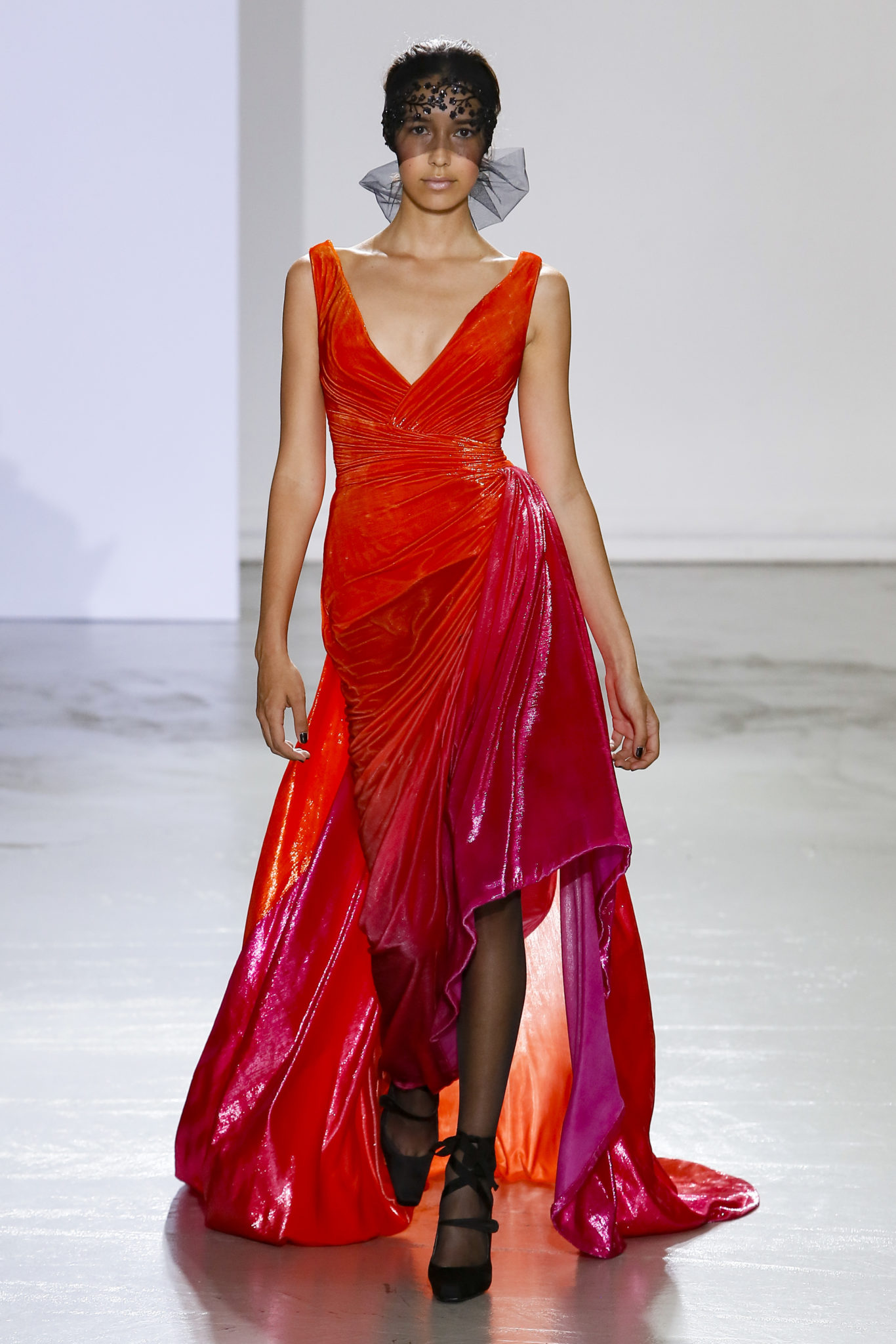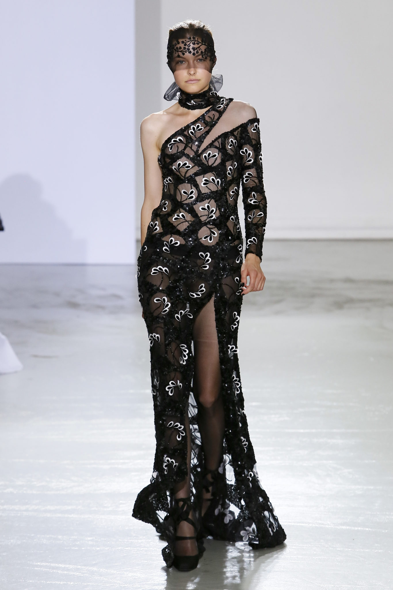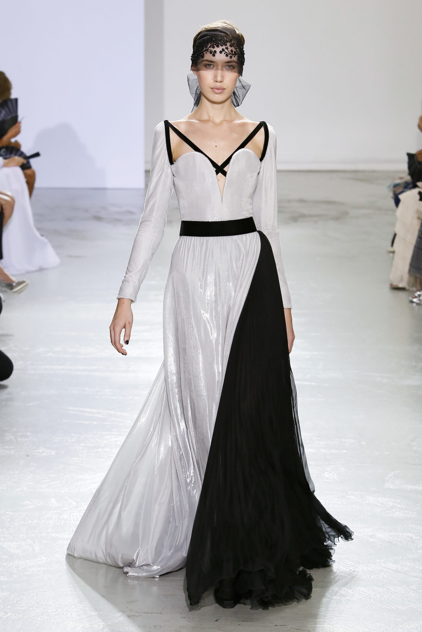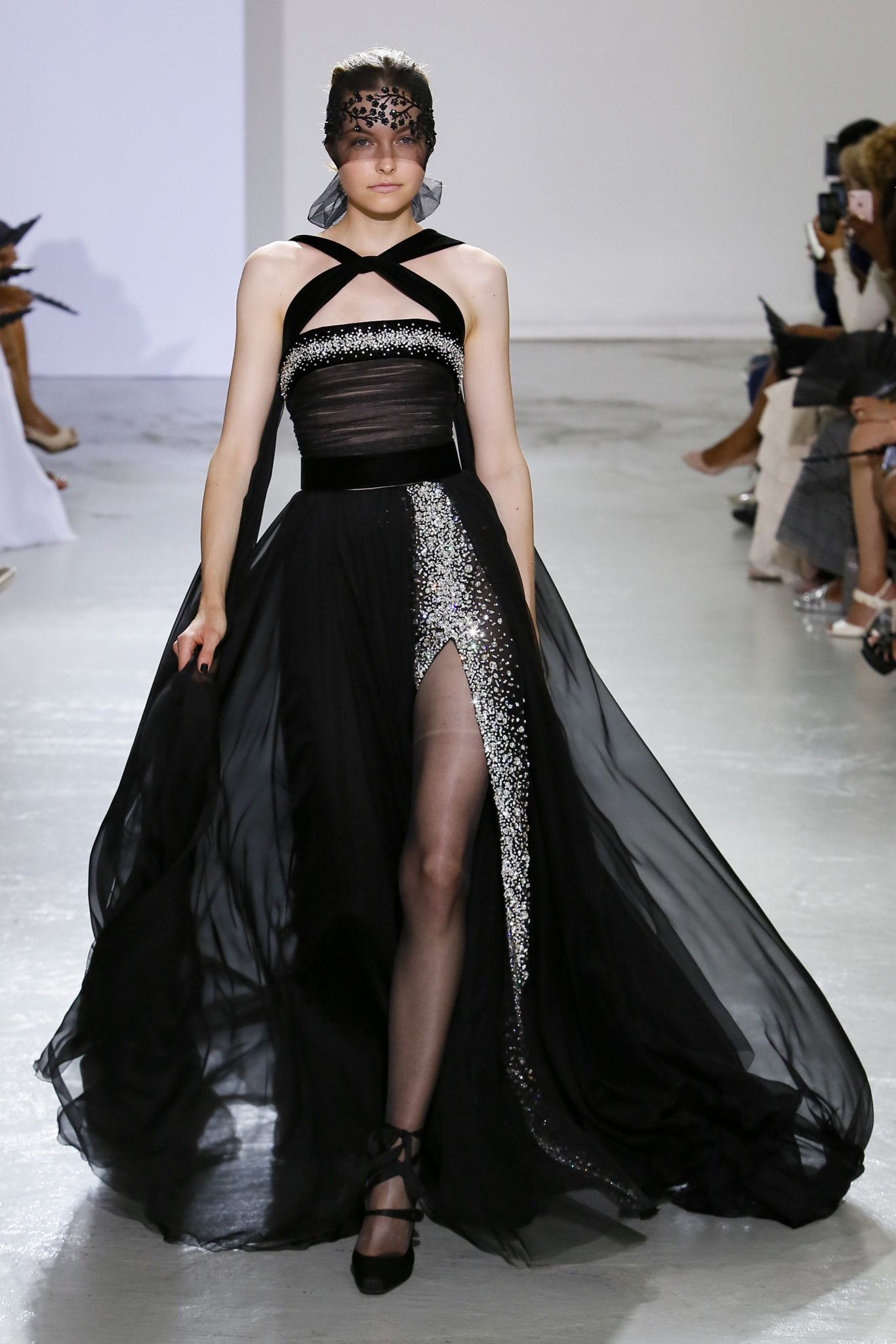 AUTOMNE-HIVER 2018-2019 Georges Chakra sème allégrement le trouble, celui d’une beauté actuelle avec une allure fin de siècle. Un brin mystérieuse, excentrique. Le noir fait autorité, l’argent, le rouge, le shocking pink et l’orange flamboyant viennent perturber l’ordre établi du noir. Le tulle plissé, la mousseline découpée, des mille-feuilles de gaze, viennent parfois se poser sur une robe, une veste, un col ou bien encore une jupe. De la brillance avec de la dentelle lamée, velours lumineux, jais, cristaux et sequins. Les volumes structurés, les bustes corsetés, les tailles marquées imposent une silhouette altière. Des effets graphiques donnés par des découpes soulignées de rubans de velours. Le tulle omniprésent dans la collection se pare de mille feux pour une robe de mariée en parfaite parité entre fragilité et puissance.
