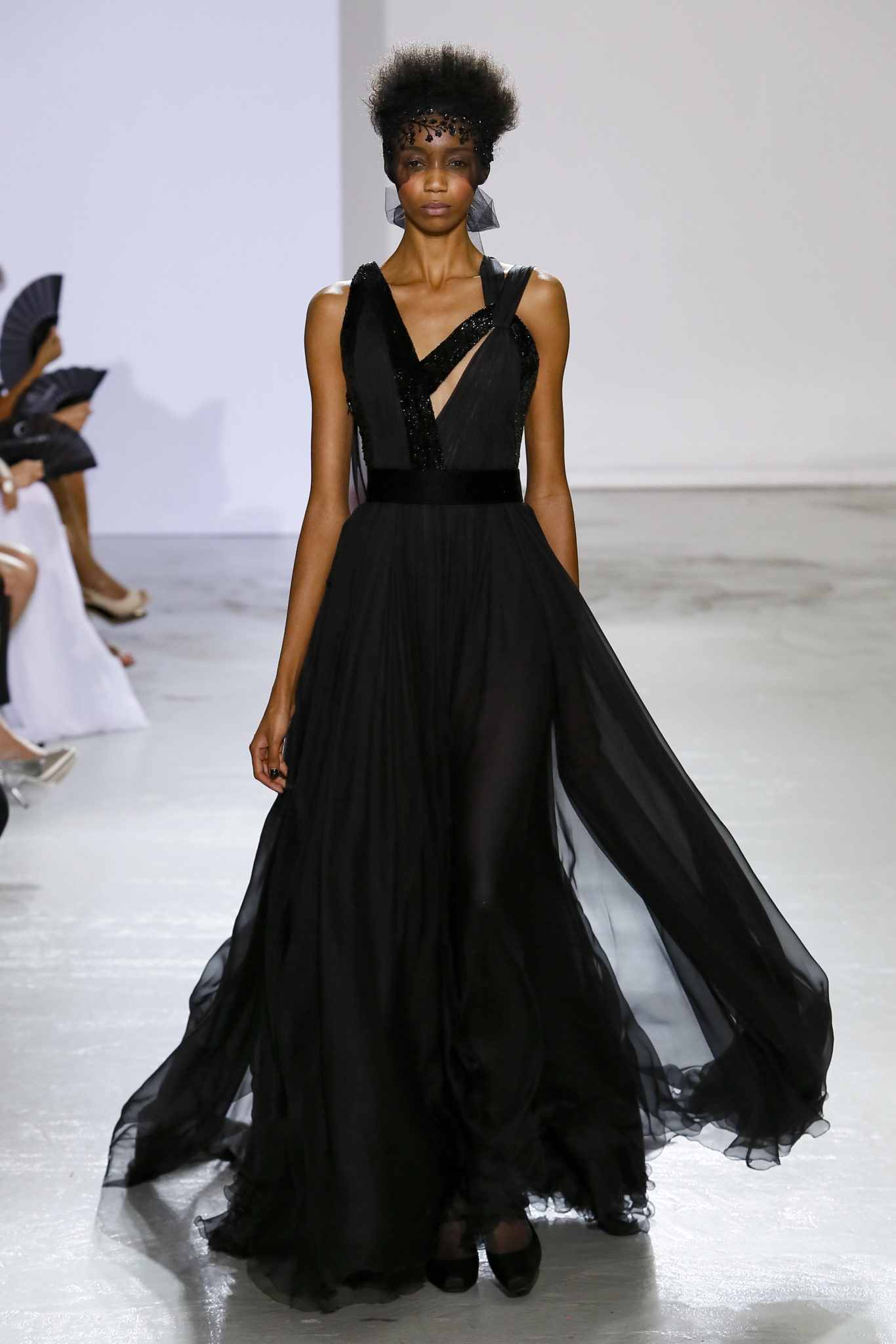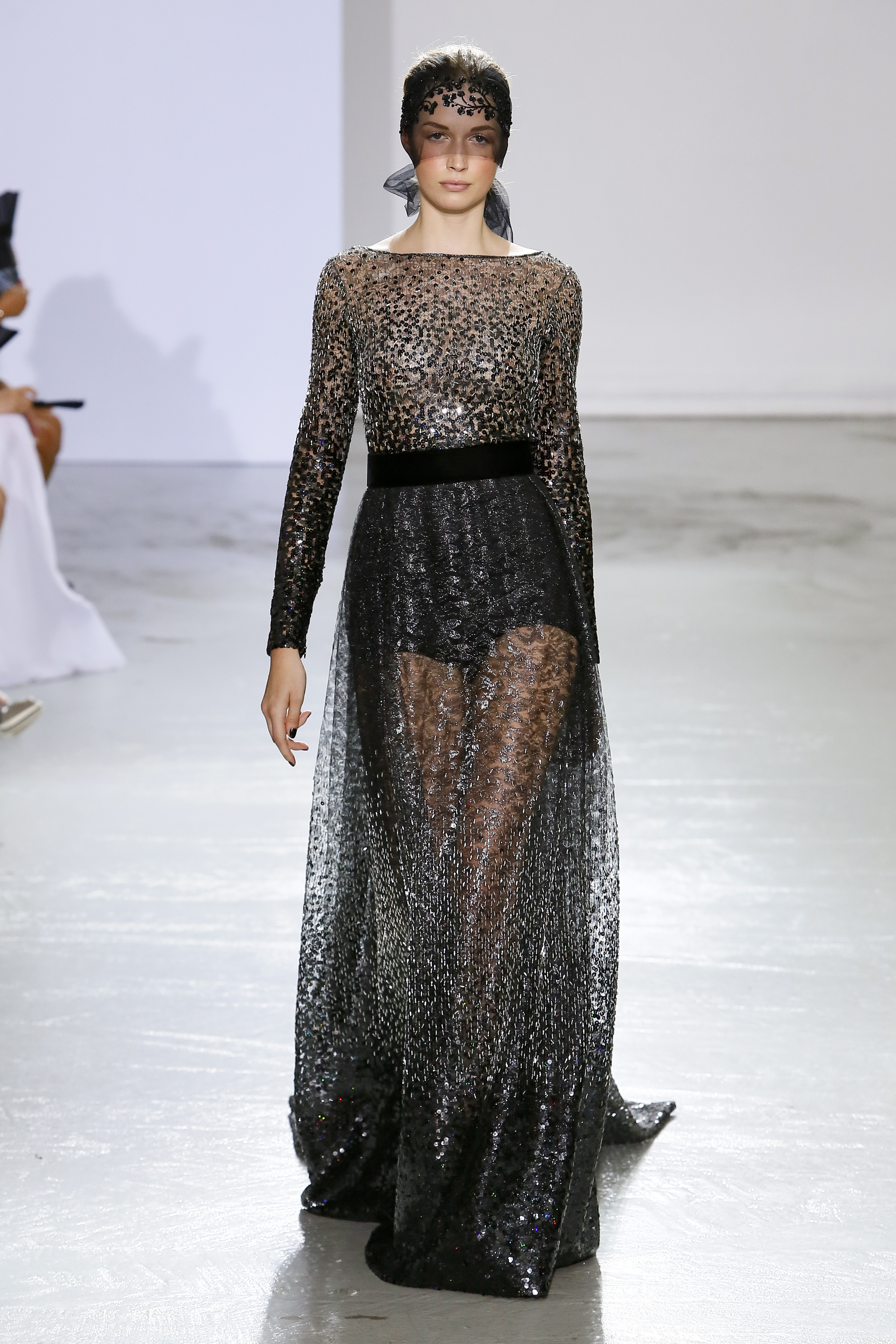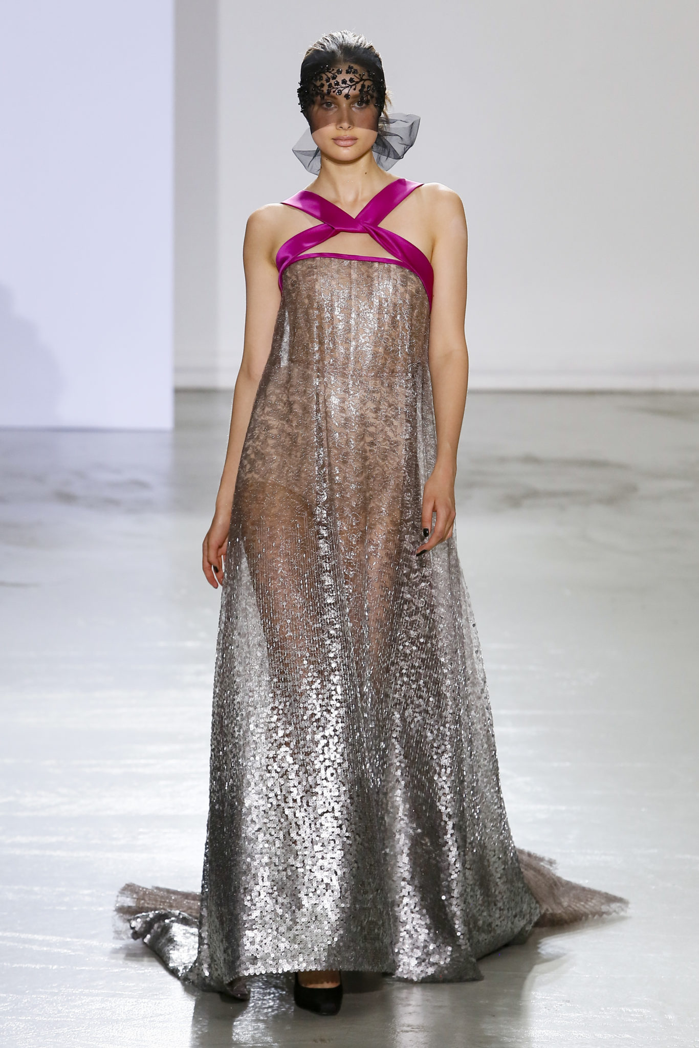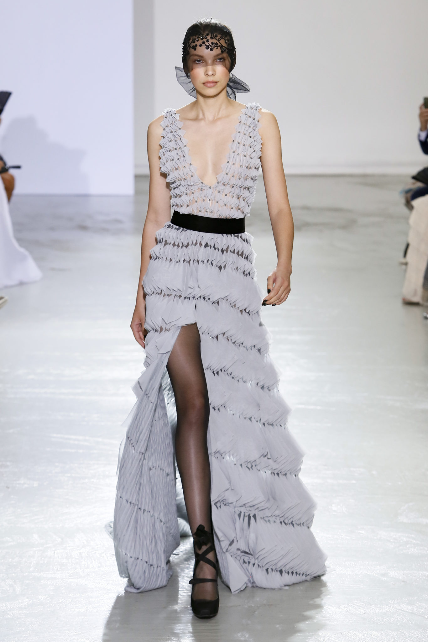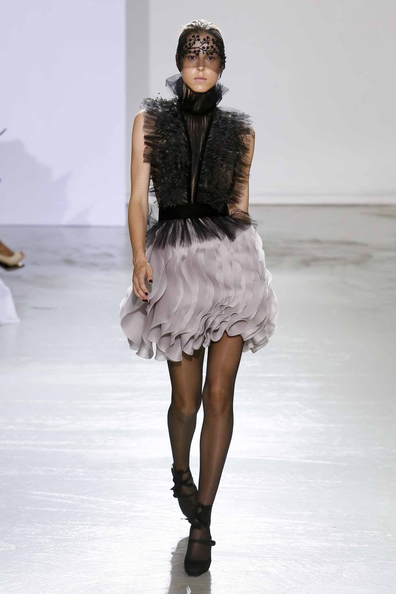 AUTOMNE-HIVER 2018-2019 Georges Chakra sème allégrement le trouble, celui d’une beauté actuelle avec une allure fin de siècle. Un brin mystérieuse, excentrique. Le noir fait autorité, l’argent, le rouge, le shocking pink et l’orange flamboyant viennent perturber l’ordre établi du noir. Le tulle plissé, la mousseline découpée, des mille-feuilles de gaze, viennent parfois se poser sur une robe, une veste, un col ou bien encore une jupe. De la brillance avec de la dentelle lamée, velours lumineux, jais, cristaux et sequins. Les volumes structurés, les bustes corsetés, les tailles marquées imposent une silhouette altière. Des effets graphiques donnés par des découpes soulignées de rubans de velours. Le tulle omniprésent dans la collection se pare de mille feux pour une robe de mariée en parfaite parité entre fragilité et puissance.