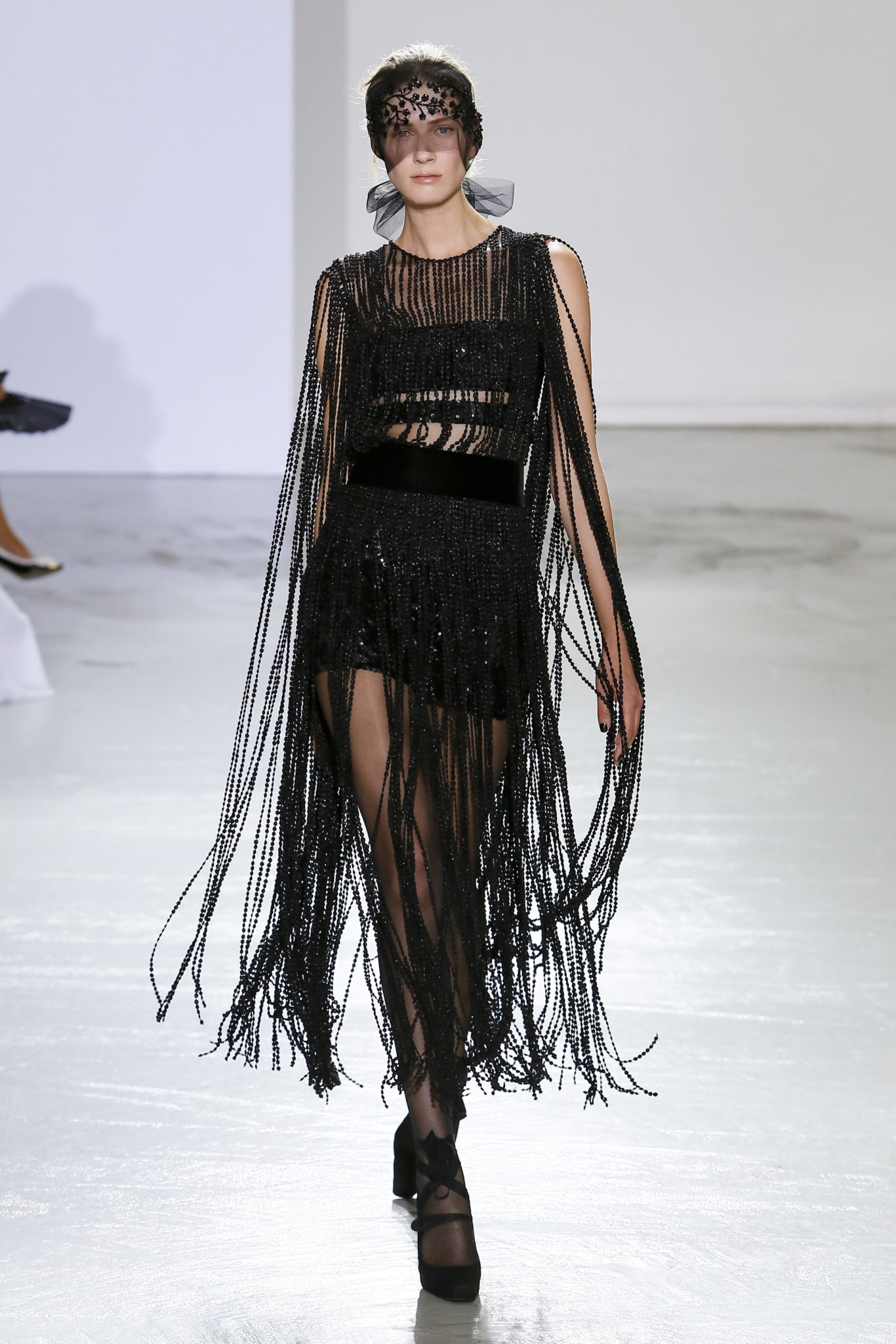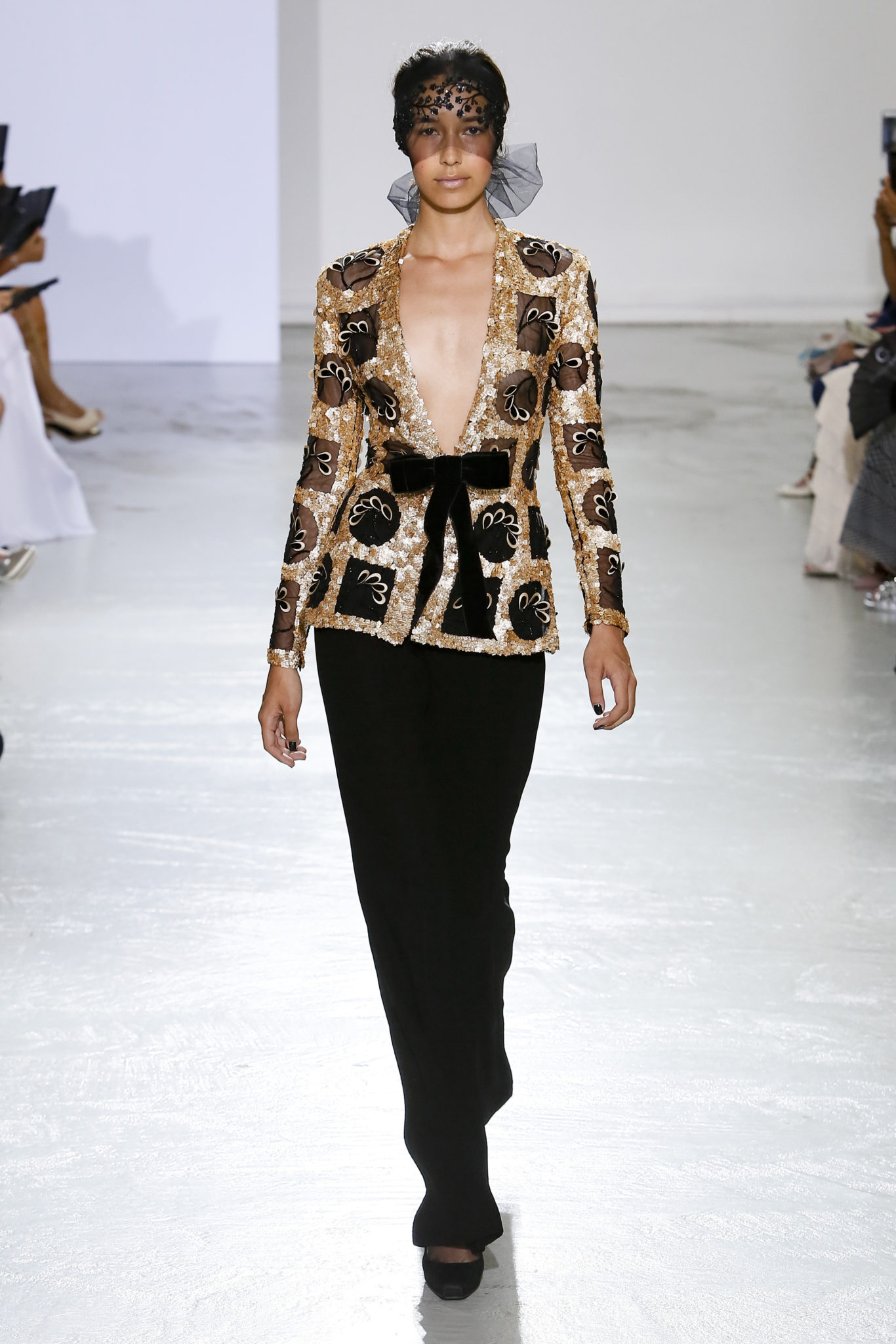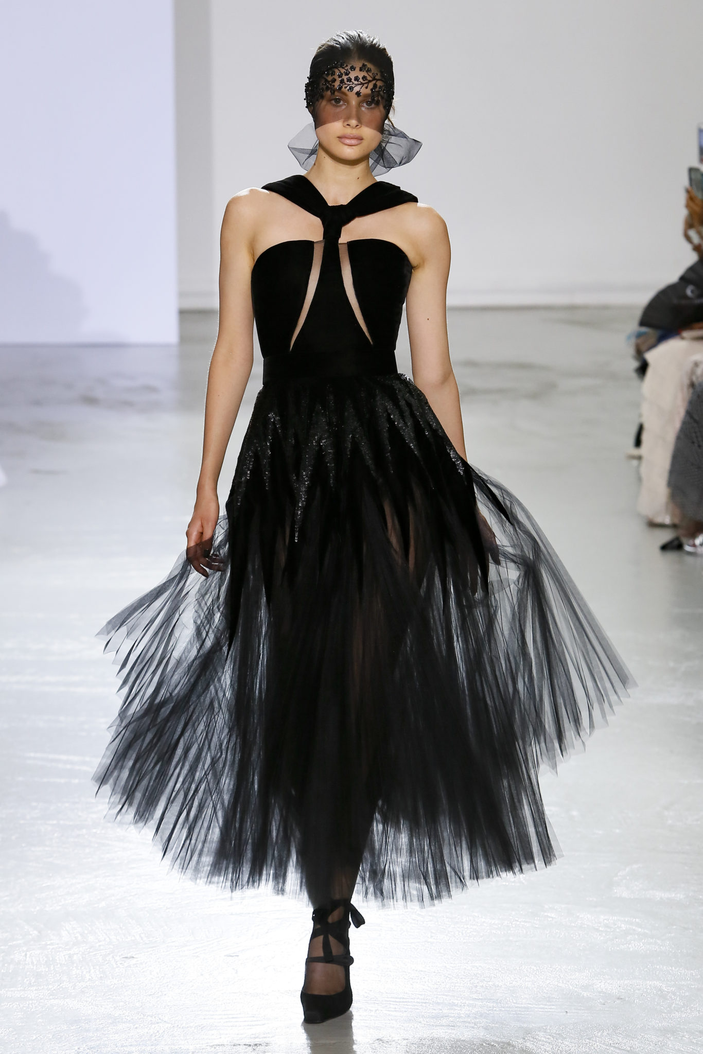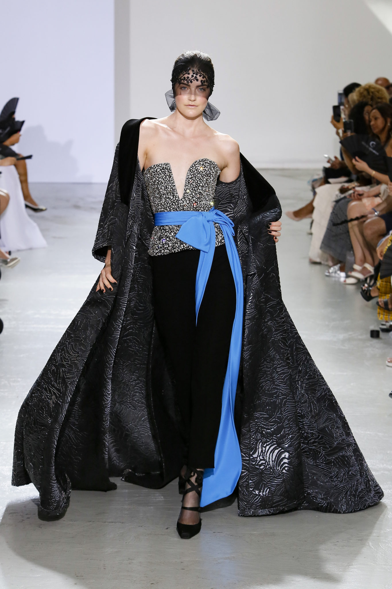 AUTOMNE-HIVER 2018-2019 Georges Chakra sème allégrement le trouble, celui d’une beauté actuelle avec une allure fin de siècle. Un brin mystérieuse, excentrique. Le noir fait autorité, l’argent, le rouge, le shocking pink et l’orange flamboyant viennent perturber l’ordre établi du noir. Le tulle plissé, la mousseline découpée, des mille-feuilles de gaze, viennent parfois se poser sur une robe, une veste, un col ou bien encore une jupe. De la brillance avec de la dentelle lamée, velours lumineux, jais, cristaux et sequins. Les volumes structurés, les bustes corsetés, les tailles marquées imposent une silhouette altière. Des effets graphiques donnés par des découpes soulignées de rubans de velours. Le tulle omniprésent dans la collection se pare de mille feux pour une robe de mariée en parfaite parité entre fragilité et puissance.