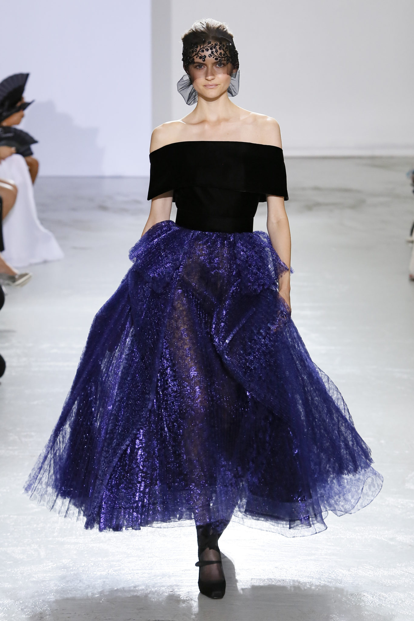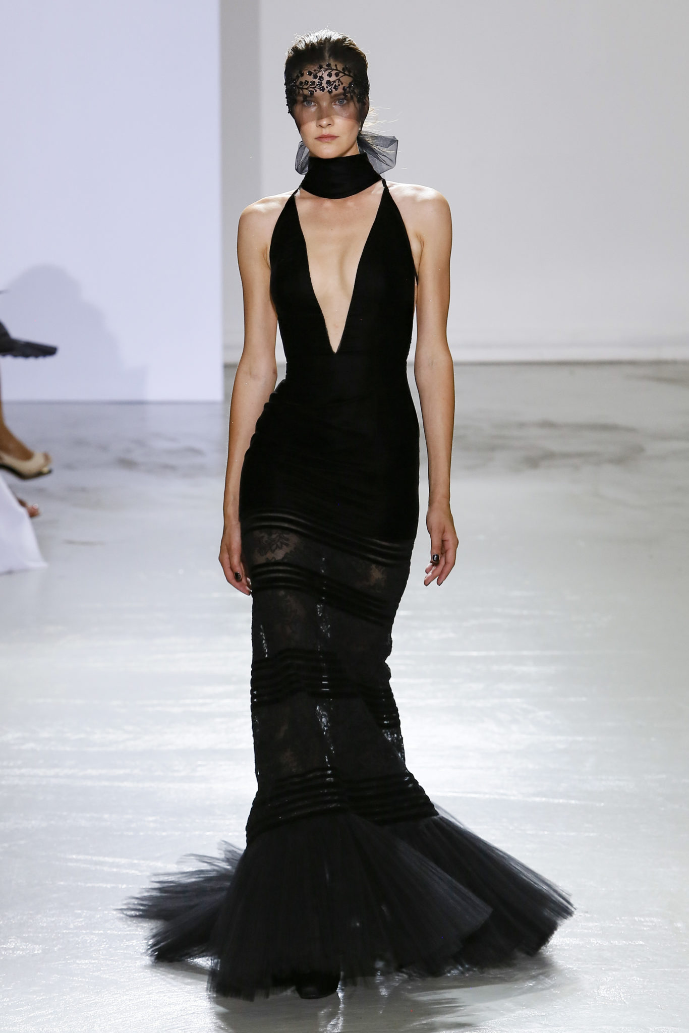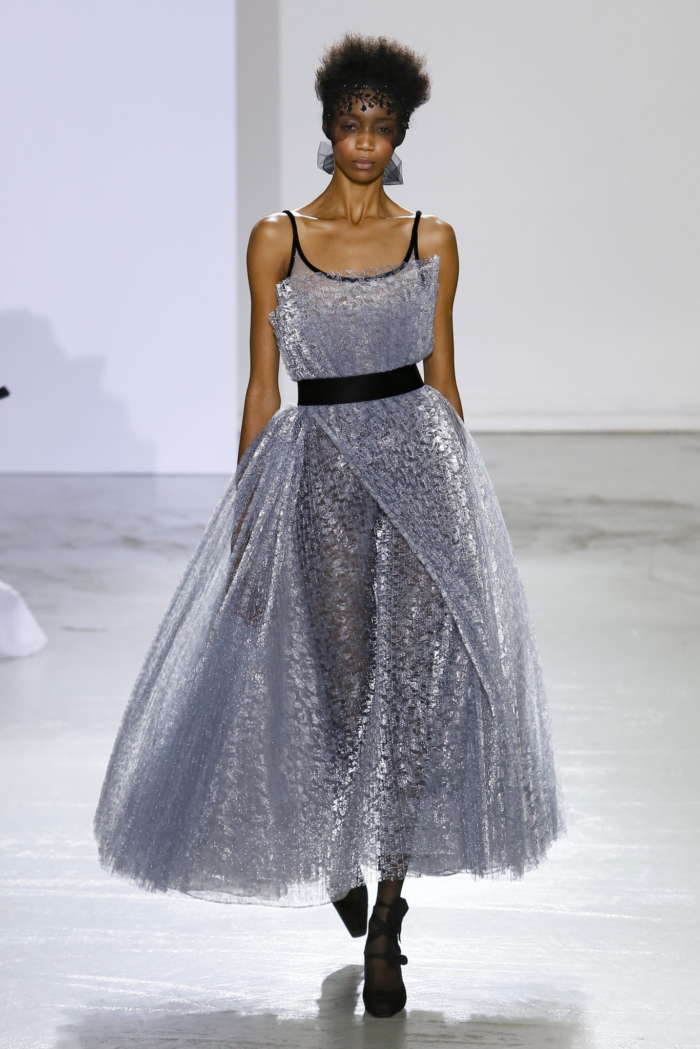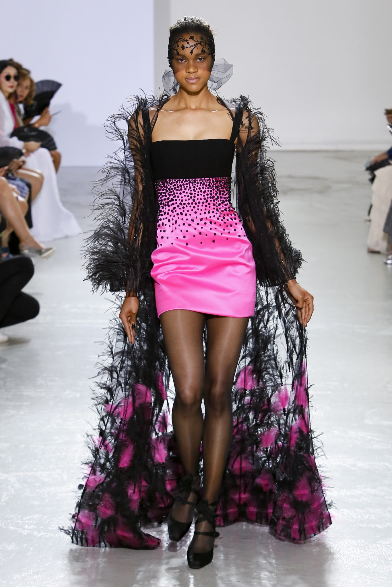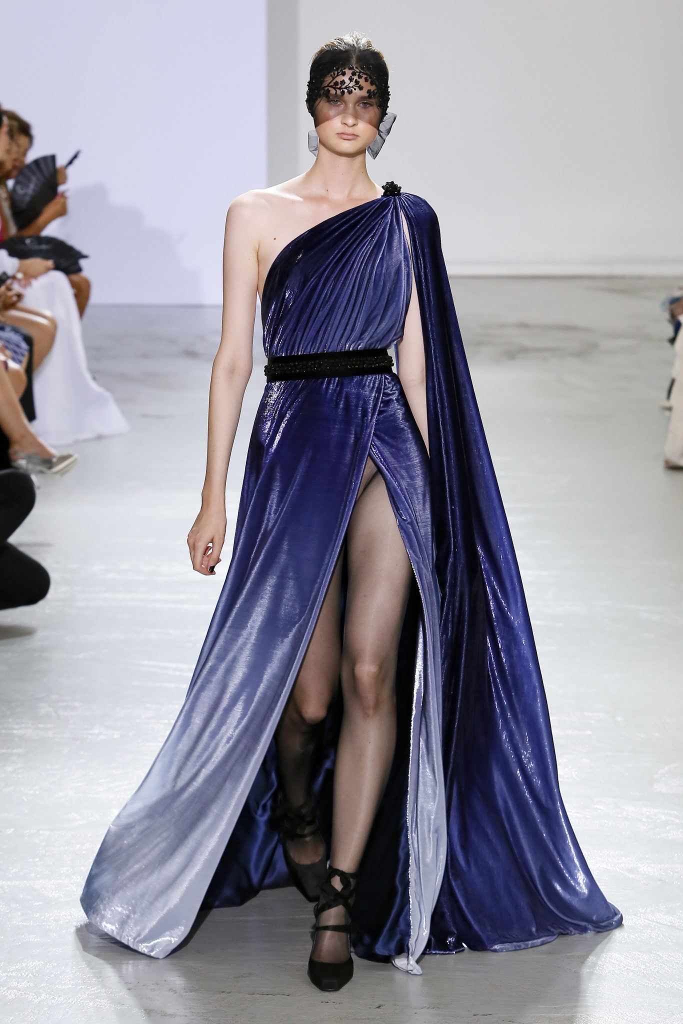 AUTOMNE-HIVER 2018-2019 Georges Chakra sème allégrement le trouble, celui d’une beauté actuelle avec une allure fin de siècle. Un brin mystérieuse, excentrique. Le noir fait autorité, l’argent, le rouge, le shocking pink et l’orange flamboyant viennent perturber l’ordre établi du noir. Le tulle plissé, la mousseline découpée, des mille-feuilles de gaze, viennent parfois se poser sur une robe, une veste, un col ou bien encore une jupe. De la brillance avec de la dentelle lamée, velours lumineux, jais, cristaux et sequins. Les volumes structurés, les bustes corsetés, les tailles marquées imposent une silhouette altière. Des effets graphiques donnés par des découpes soulignées de rubans de velours. Le tulle omniprésent dans la collection se pare de mille feux pour une robe de mariée en parfaite parité entre fragilité et puissance.