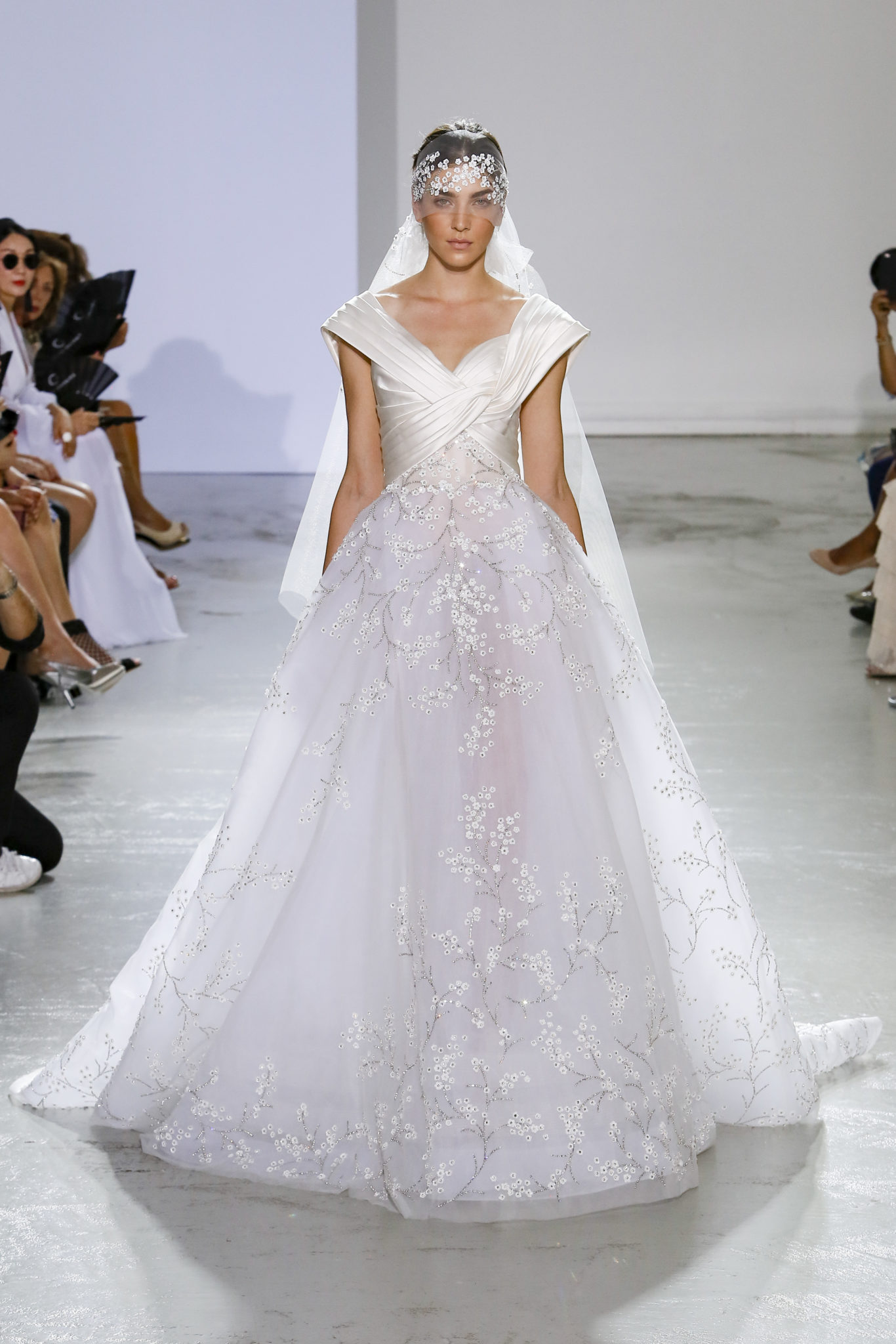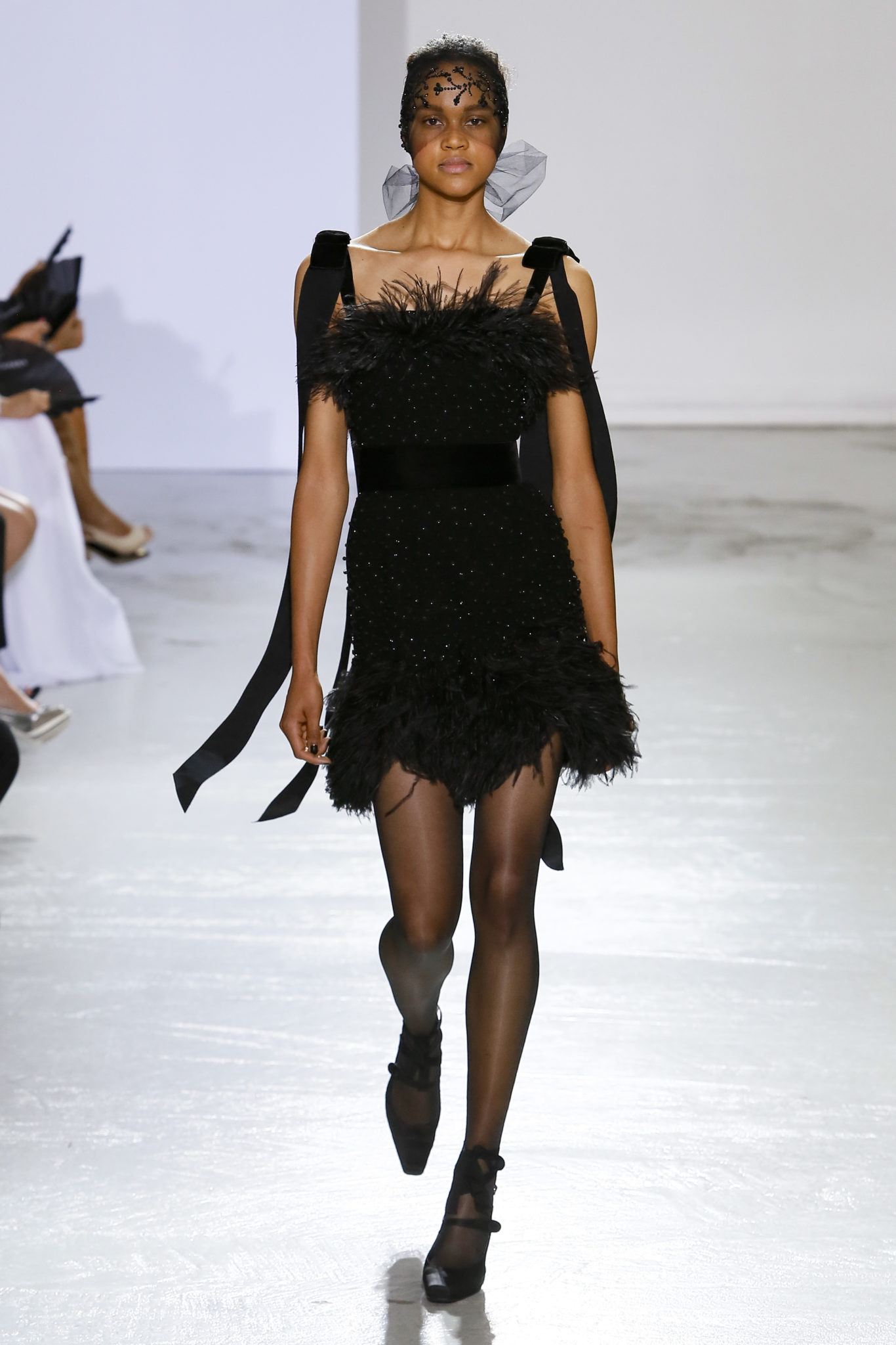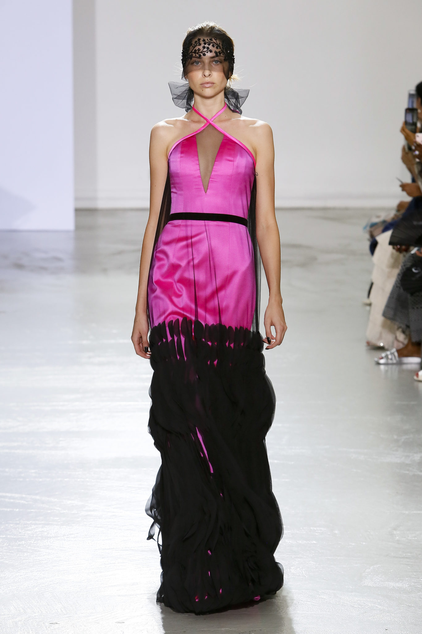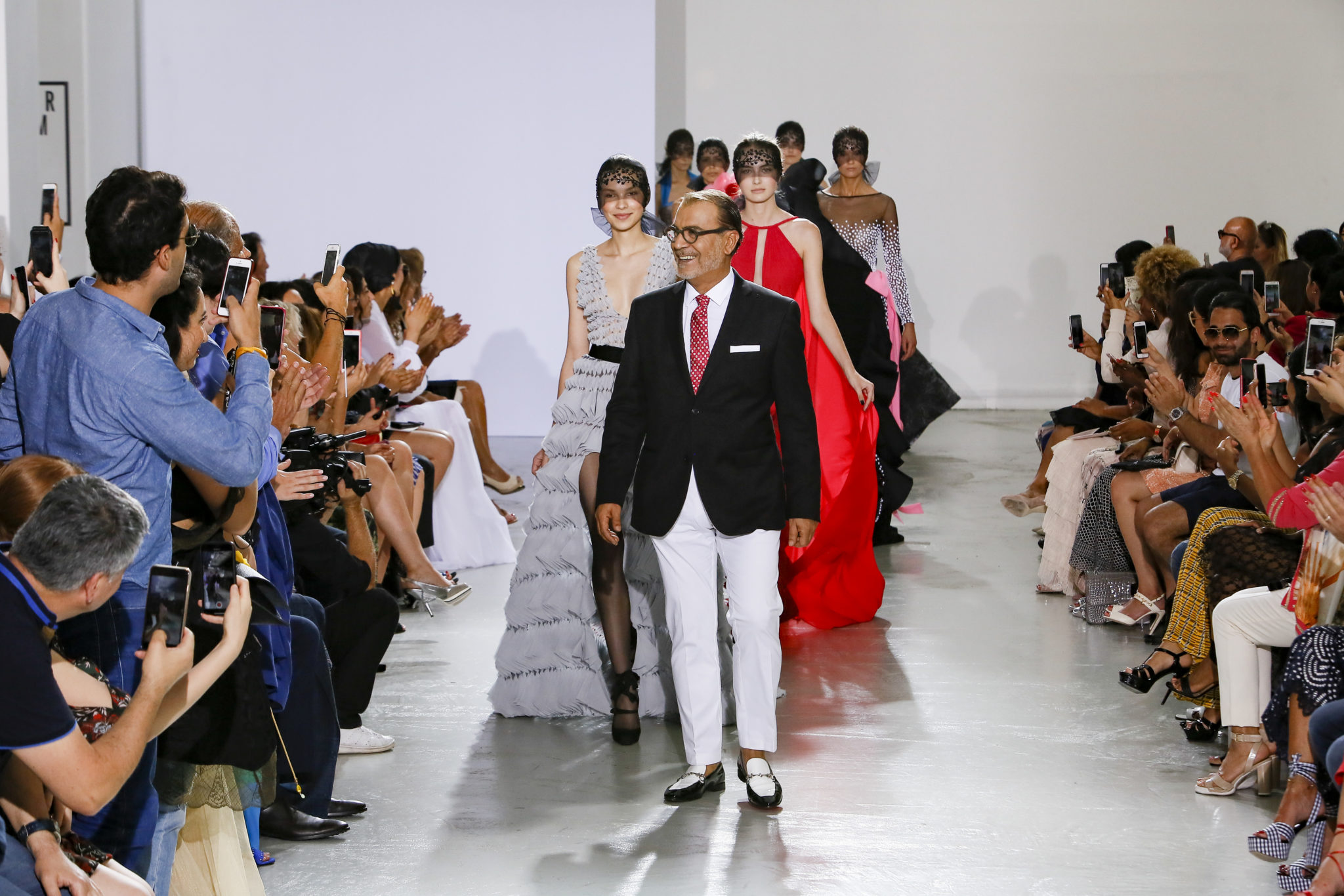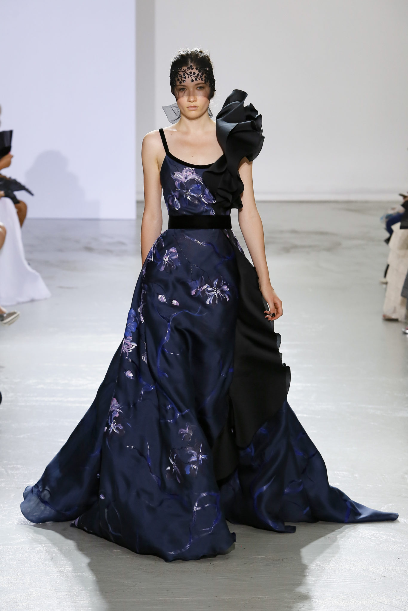 AUTOMNE-HIVER 2018-2019 Georges Chakra sème allégrement le trouble, celui d’une beauté actuelle avec une allure fin de siècle. Un brin mystérieuse, excentrique. Le noir fait autorité, l’argent, le rouge, le shocking pink et l’orange flamboyant viennent perturber l’ordre établi du noir. Le tulle plissé, la mousseline découpée, des mille-feuilles de gaze, viennent parfois se poser sur une robe, une veste, un col ou bien encore une jupe. De la brillance avec de la dentelle lamée, velours lumineux, jais, cristaux et sequins. Les volumes structurés, les bustes corsetés, les tailles marquées imposent une silhouette altière. Des effets graphiques donnés par des découpes soulignées de rubans de velours. Le tulle omniprésent dans la collection se pare de mille feux pour une robe de mariée en parfaite parité entre fragilité et puissance.