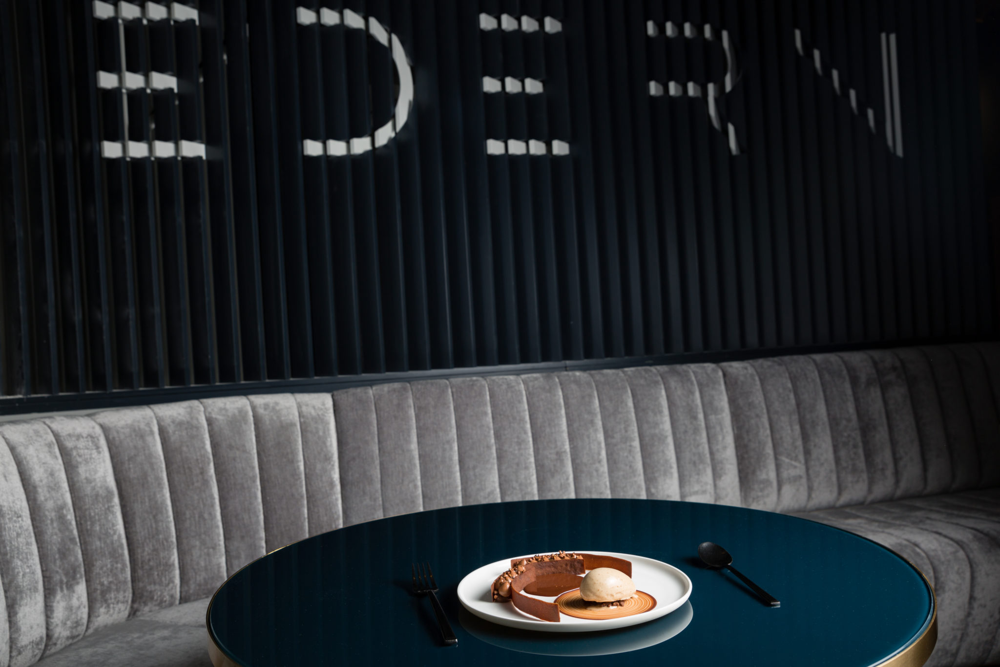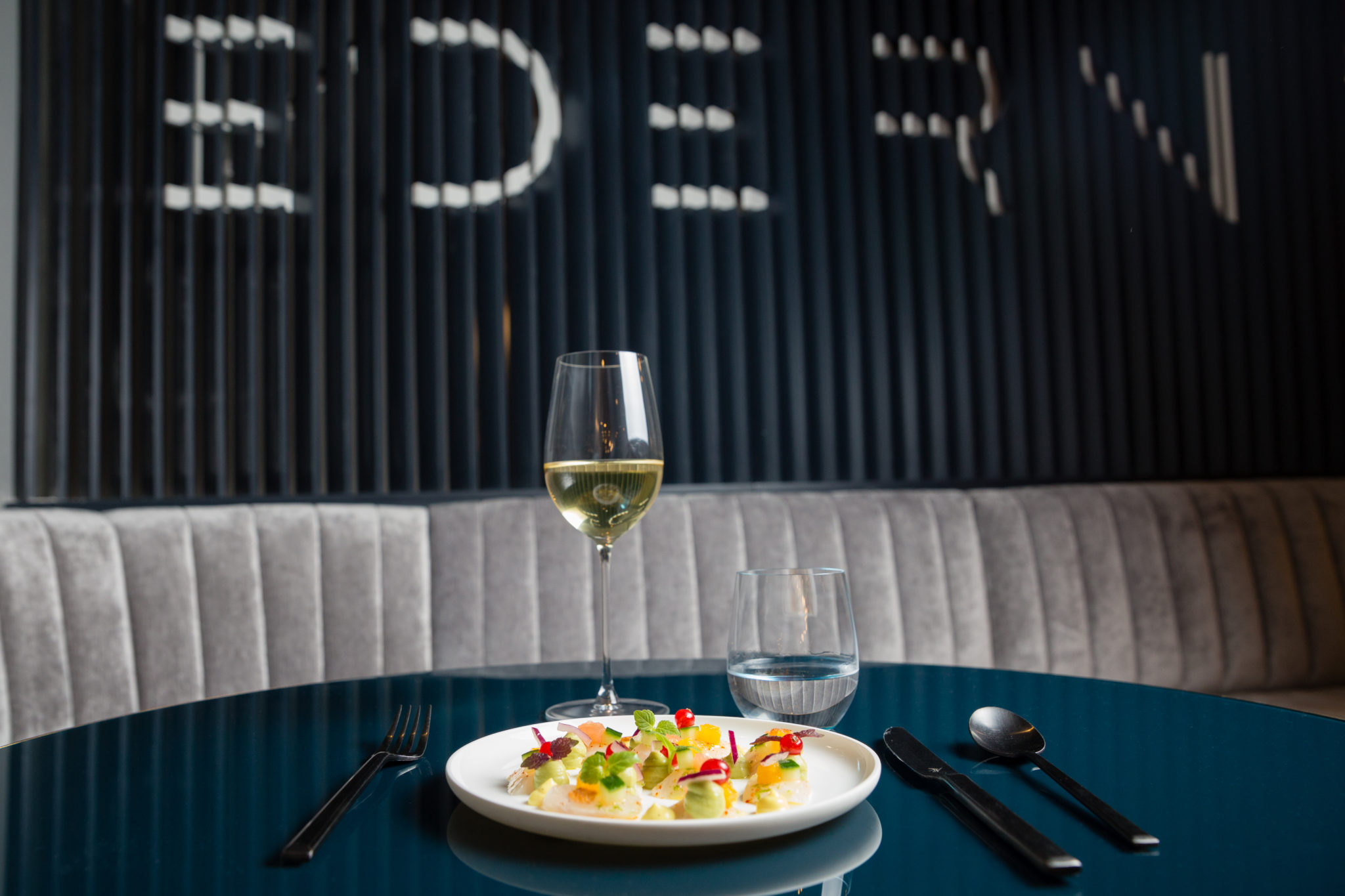 Sur des accords bruts, grisés et charbon, EDERN s’ouvre sur un restaurant de 60 places et son bar à cocktails. Un esprit graphique et une ambiance aux tonalités champagne et cuivré, fauteuils en cuir beige et banquettes bien accordées aux impressions marbrées. Distillées ici et là, les toiles explosives et pop des maîtres du street-art, artistes confirmés et émergents mélangés.