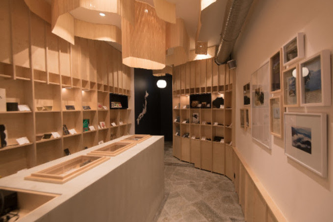 *Comptoir sous vitrine pour présenter des produits artisanaux de Niigata comme de la coutellerie, des planches à découper…