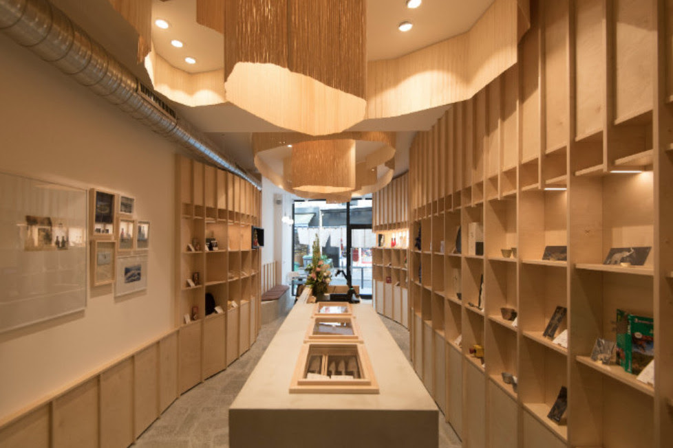 Quatre fois plus longue que large, elle est conçue comme un parcours, avec des espaces bien définis. Cette longue trame s’enroule et se déroule pour créer des rayonnages. Un effet appuyé par le travail au plafond d’un décor en paille de riz, évoquant les lanternes japonaises. Ajouré, il accompagne le sens de la visite et permet un éclairage diffus de la boutique.