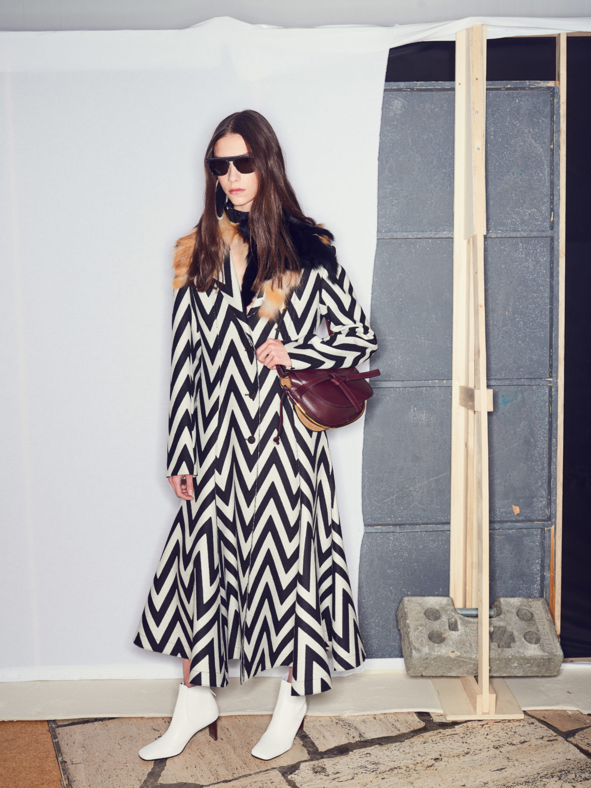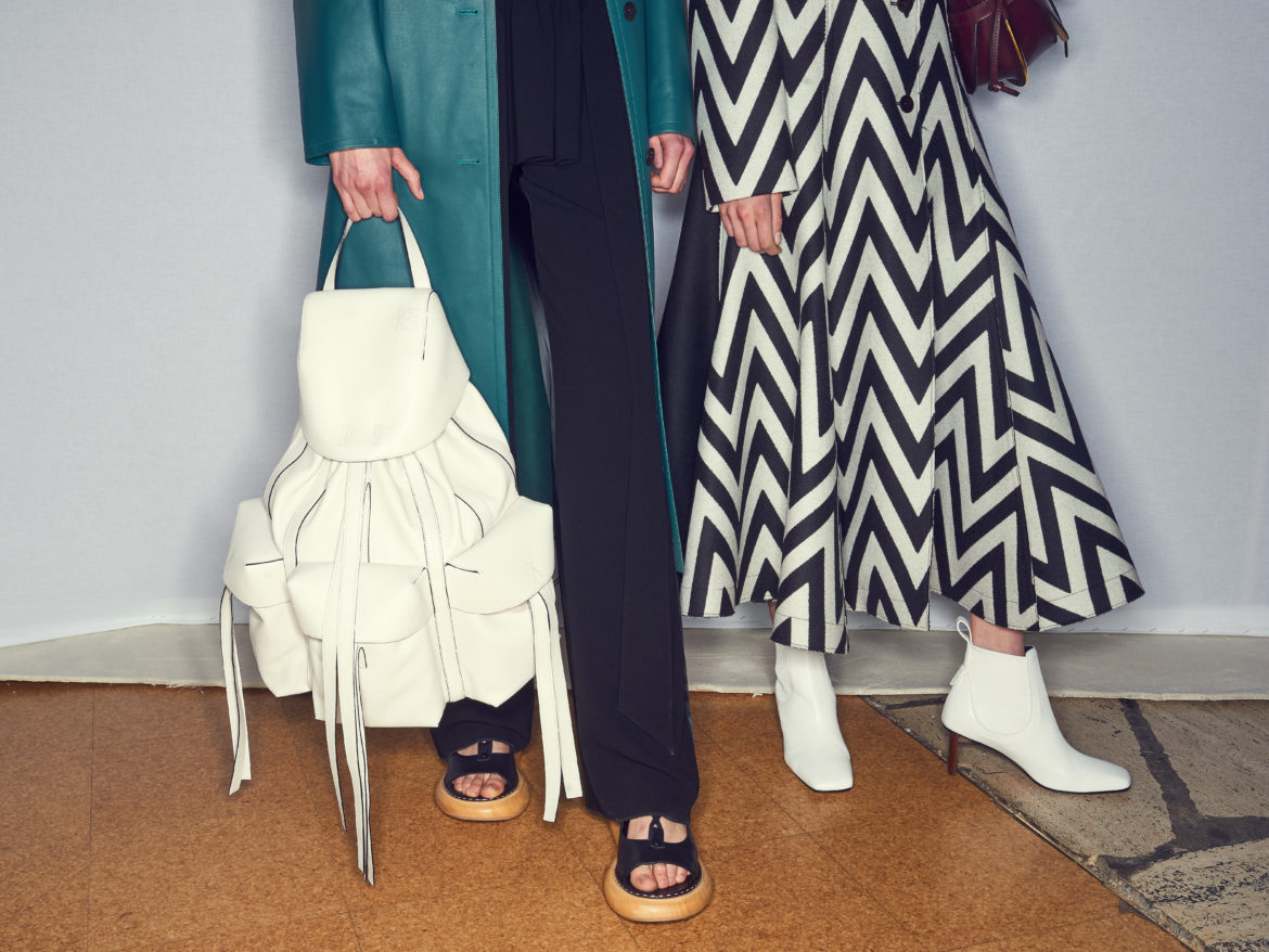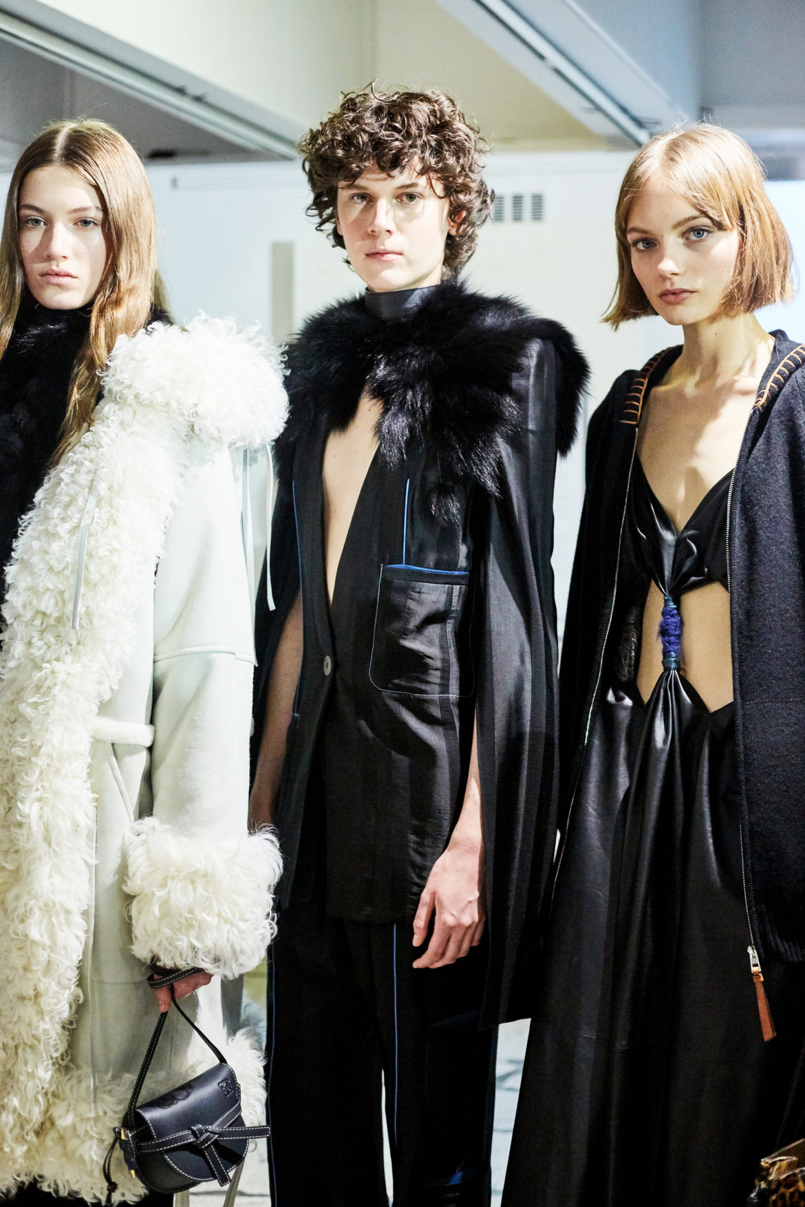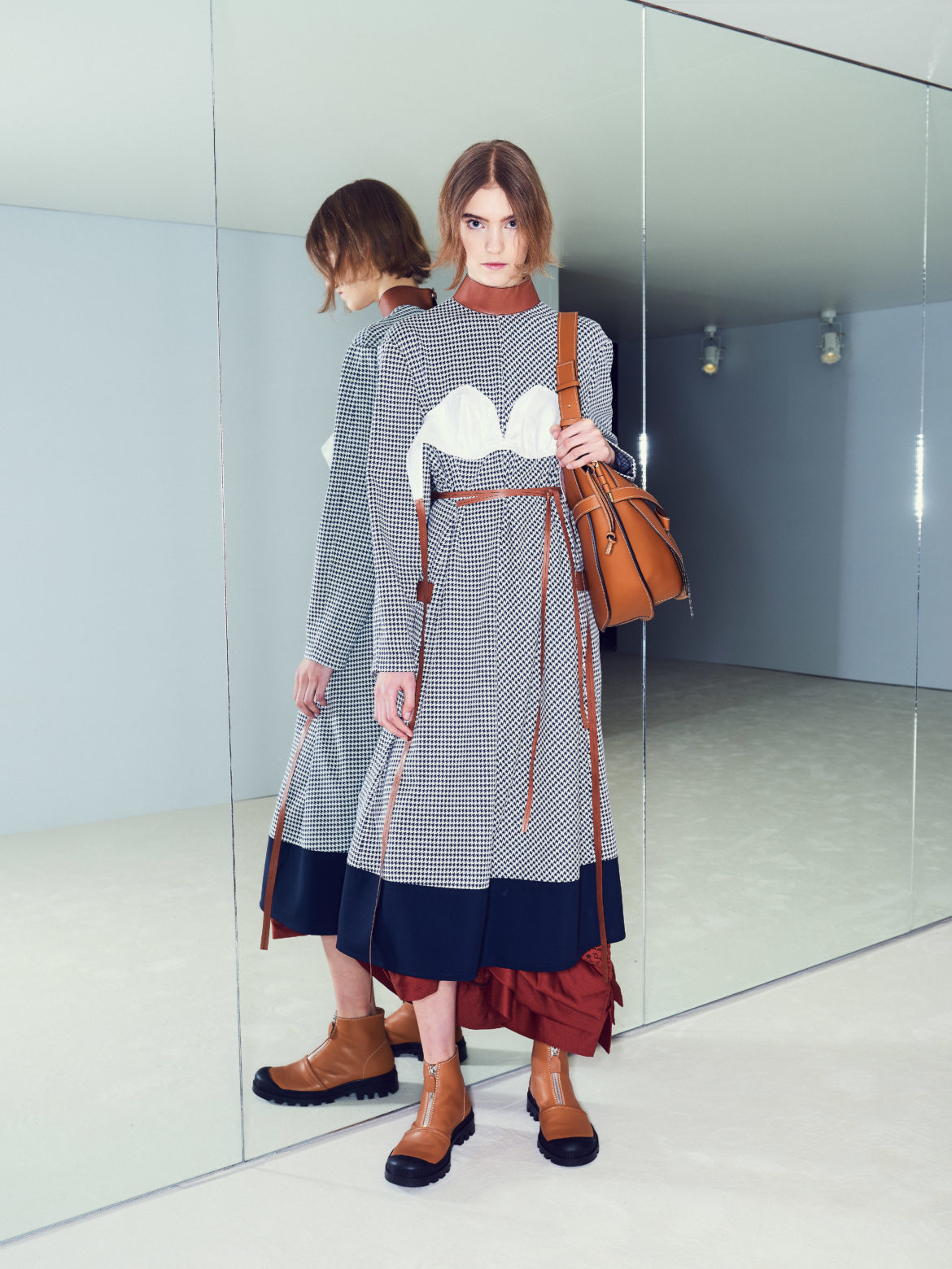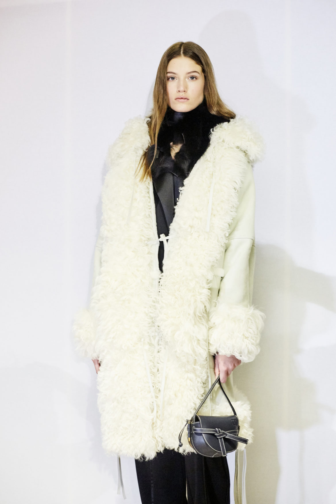 Questioning the facade of the introvert, the LOEWE Women’s Fall Winter 2018 collection designed by creative director Jonathan Anderson inhabits a pensive space where the organic meets the industrial. Disrupted by decadent moments of primitivism, austerity reigns – as shapes nod to the mid-century shifted through a contemporary lens.
