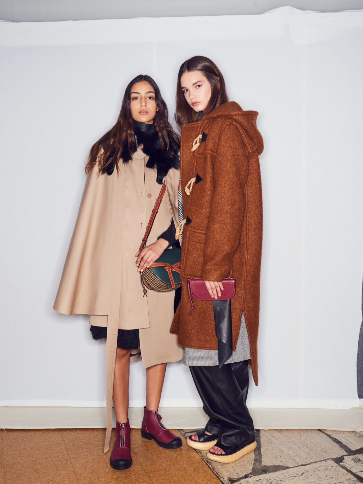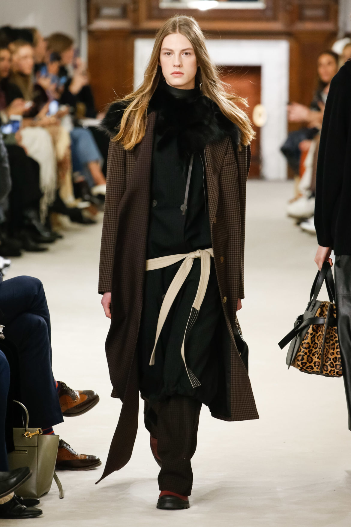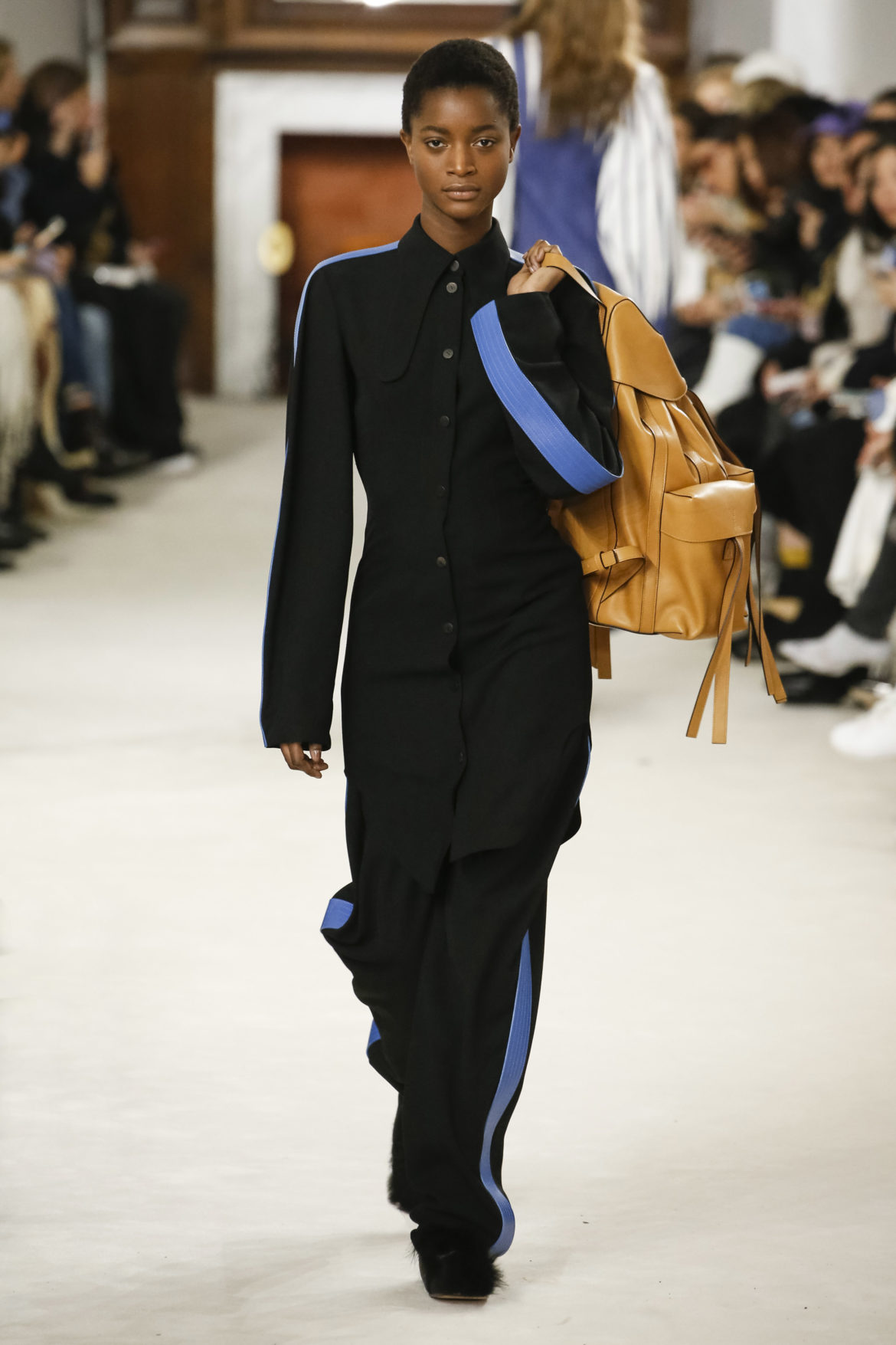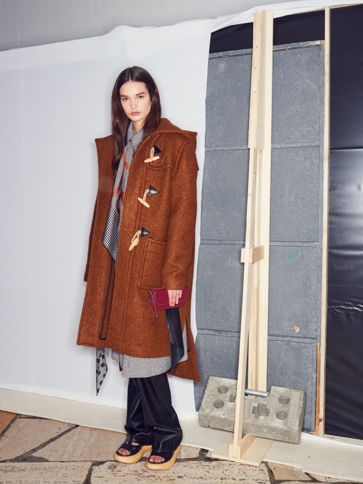 Questioning the facade of the introvert, the LOEWE Women’s Fall Winter 2018 collection designed by creative director Jonathan Anderson inhabits a pensive space where the organic meets the industrial. Disrupted by decadent moments of primitivism, austerity reigns – as shapes nod to the mid-century shifted through a contemporary lens.