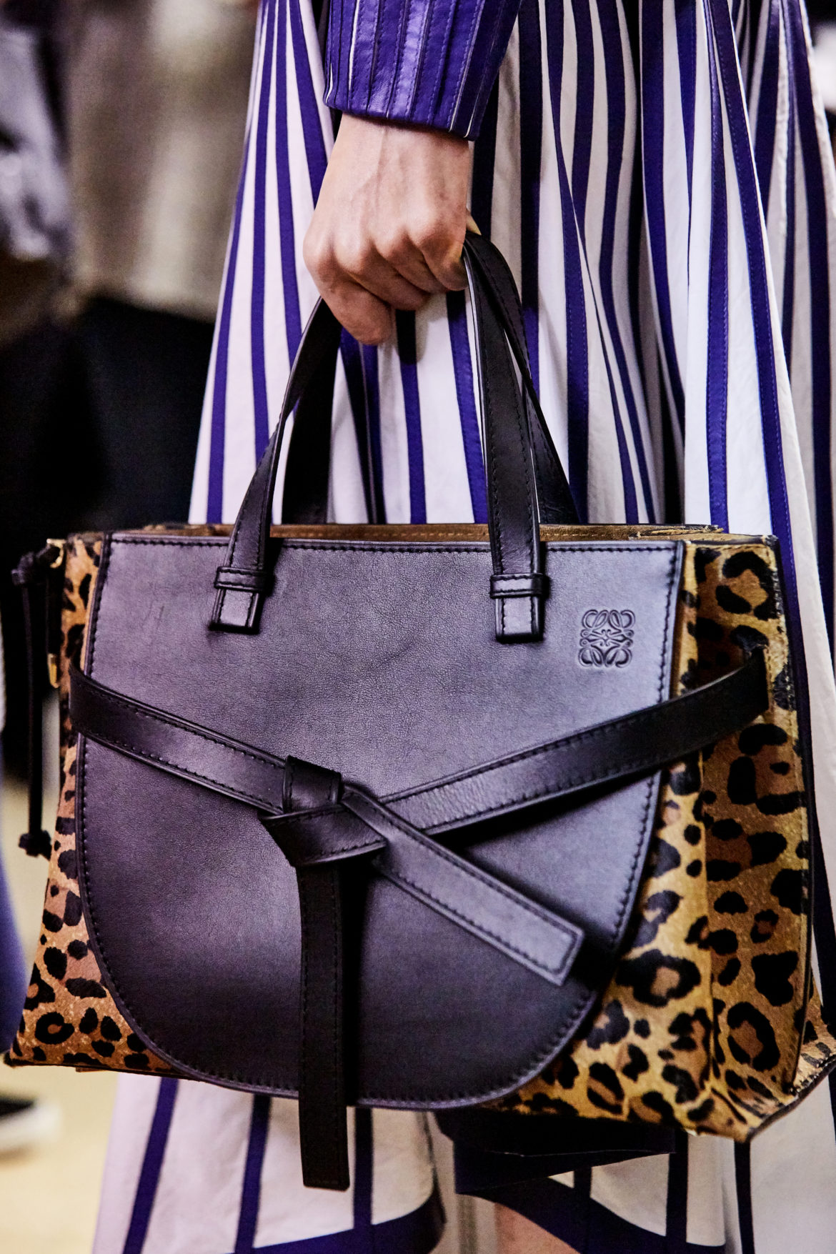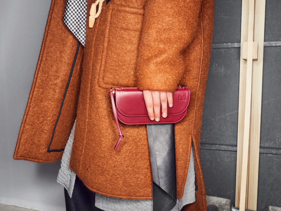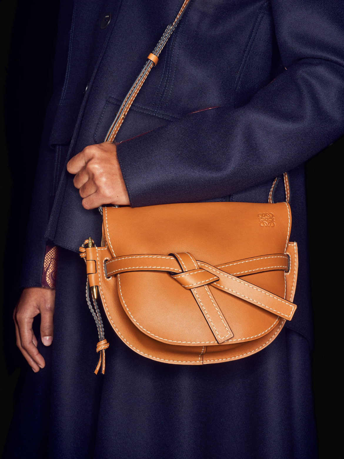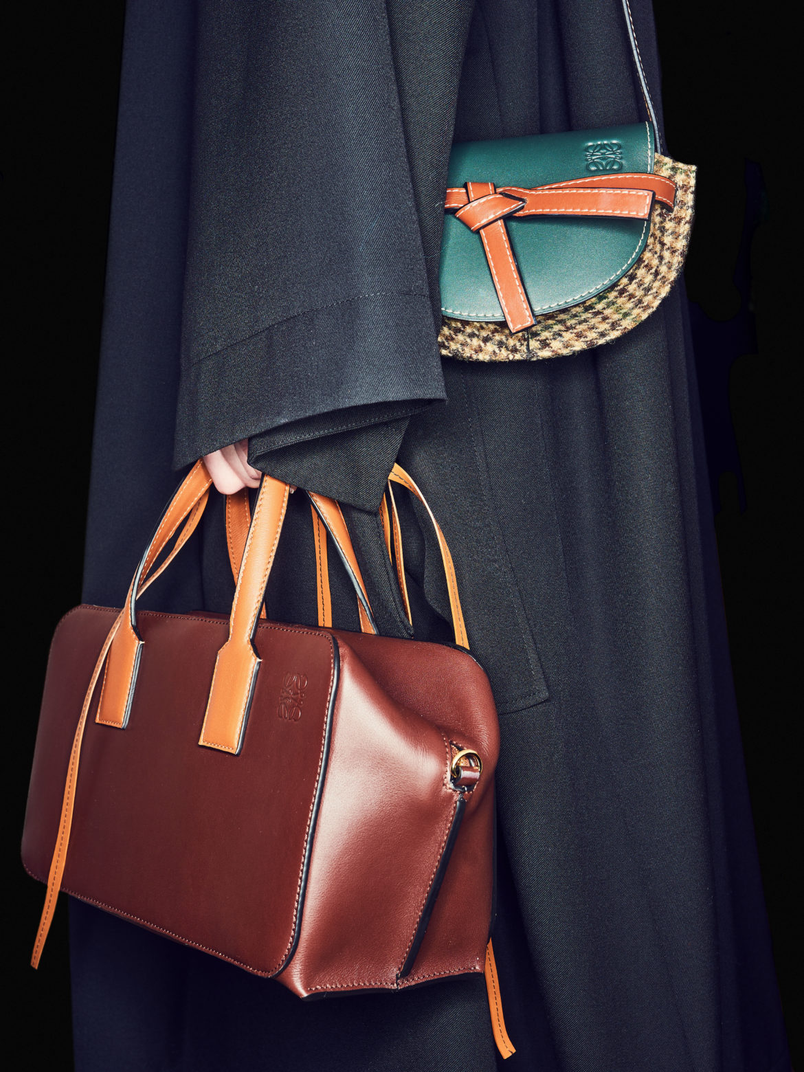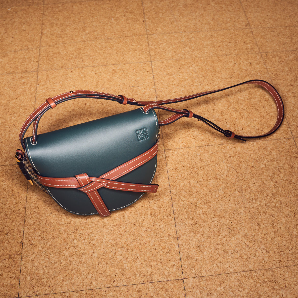 In a LOEWE take on the traditional saddle bag, the knotted ‘Gate’ bag returns for Fall Winter 2018 re-imagined in burnished box calfskin, paneled inhound’s tooth wool. It is updated in a miniature style and an exotic top-handled tote.