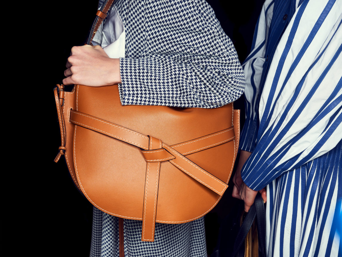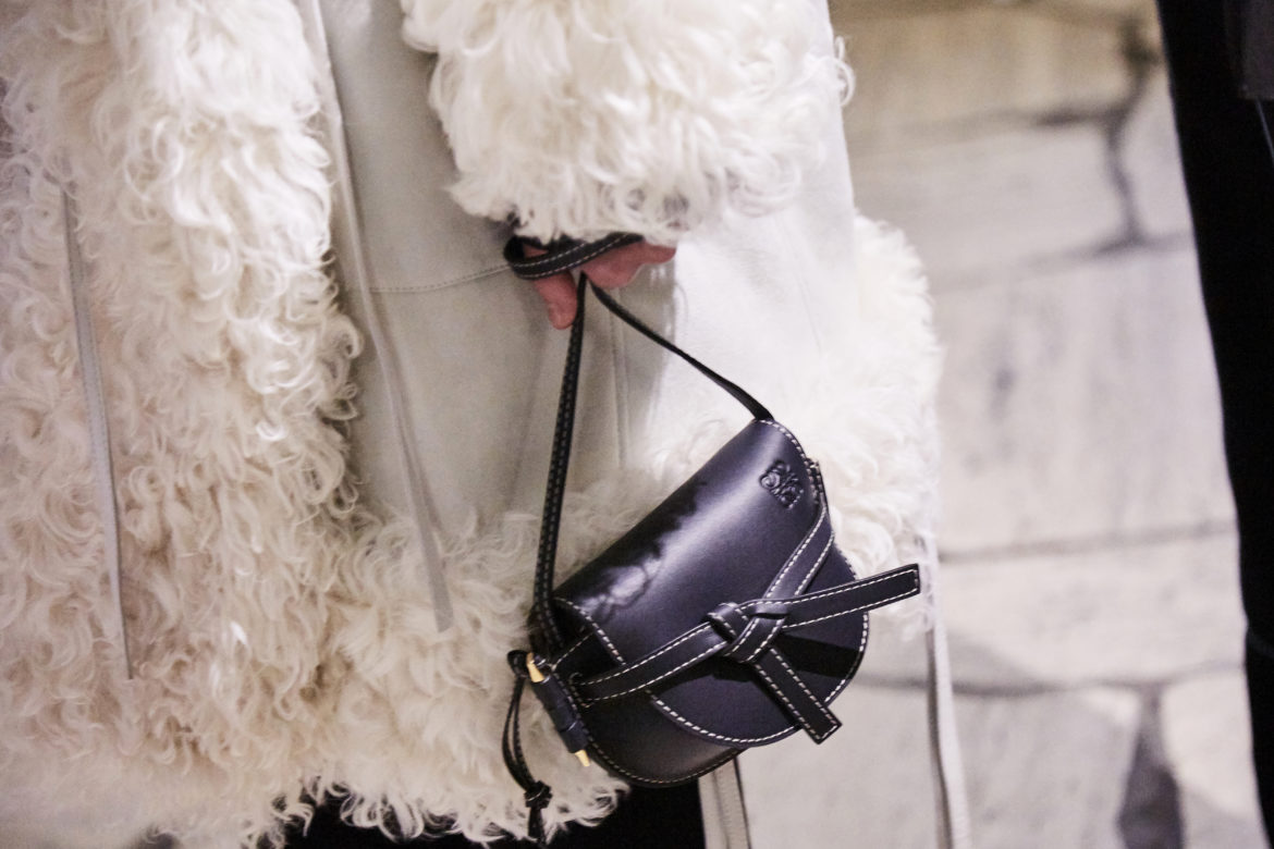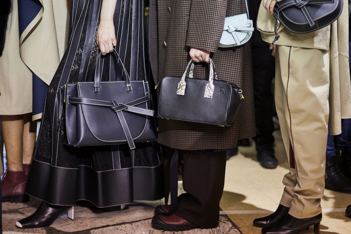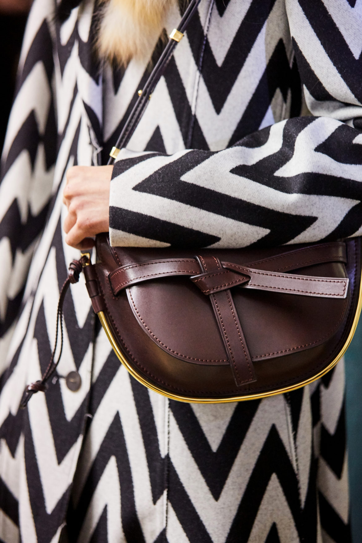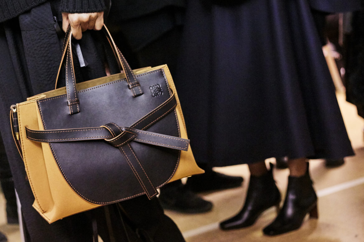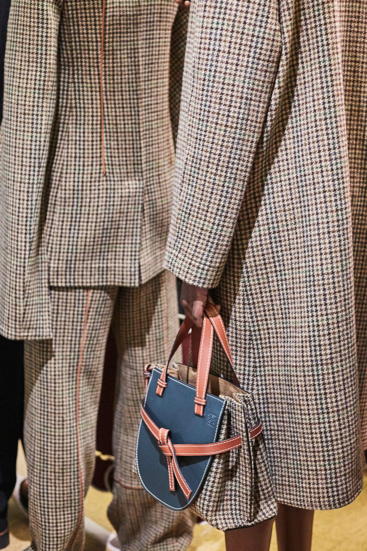 In a LOEWE take on the traditional saddle bag, the knotted ‘Gate’ bag returns for Fall Winter 2018 re-imagined in burnished box calfskin, paneled inhound’s tooth wool. It is updated in a miniature style and an exotic top-handled tote.