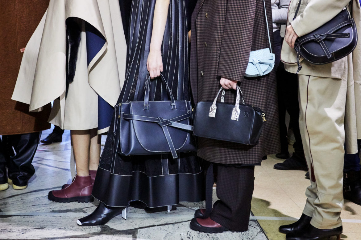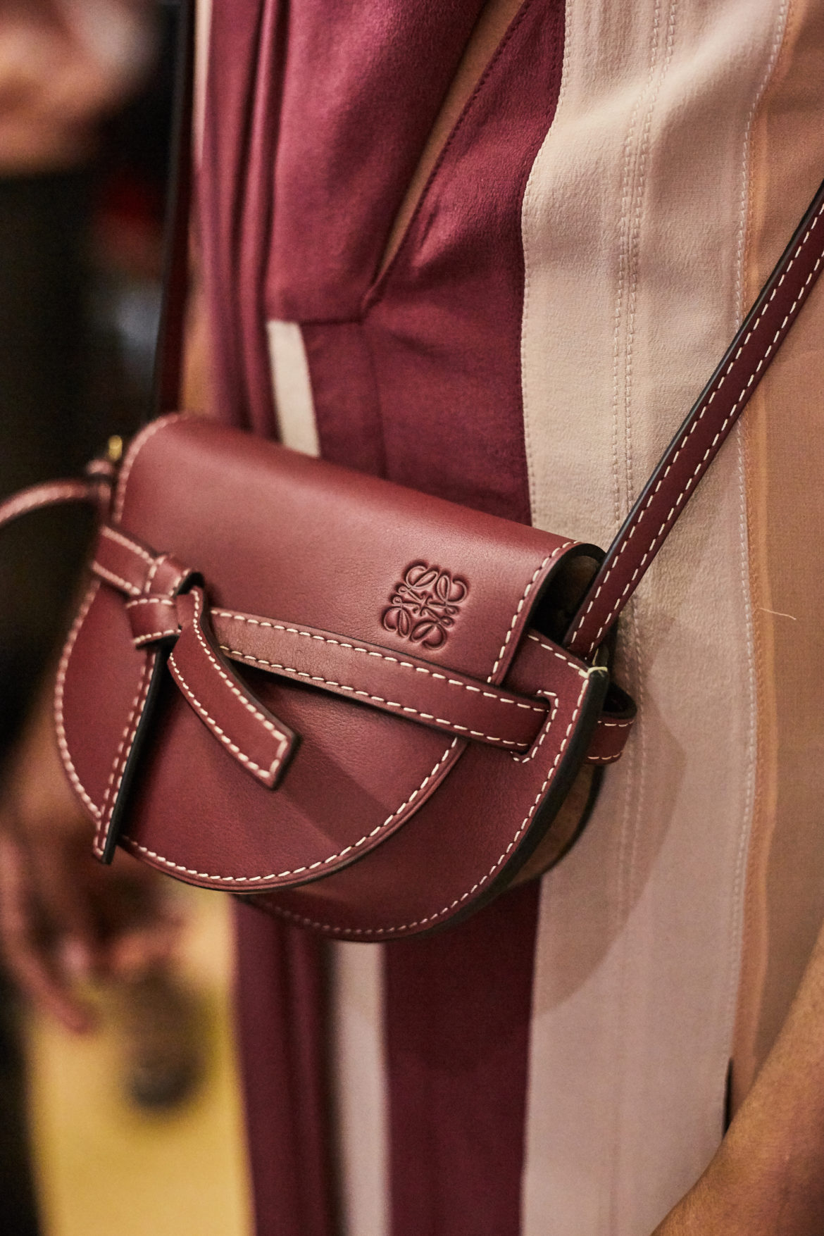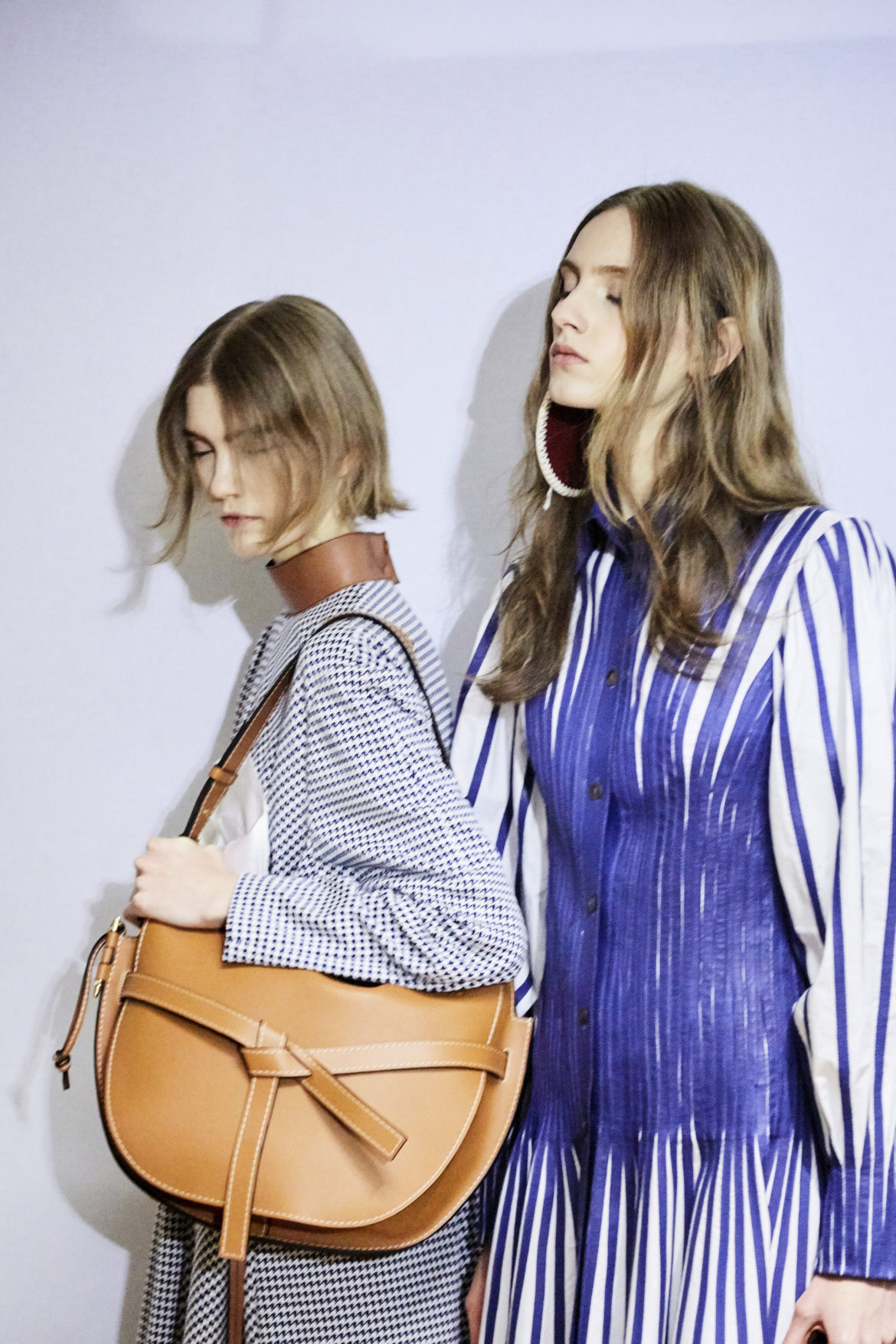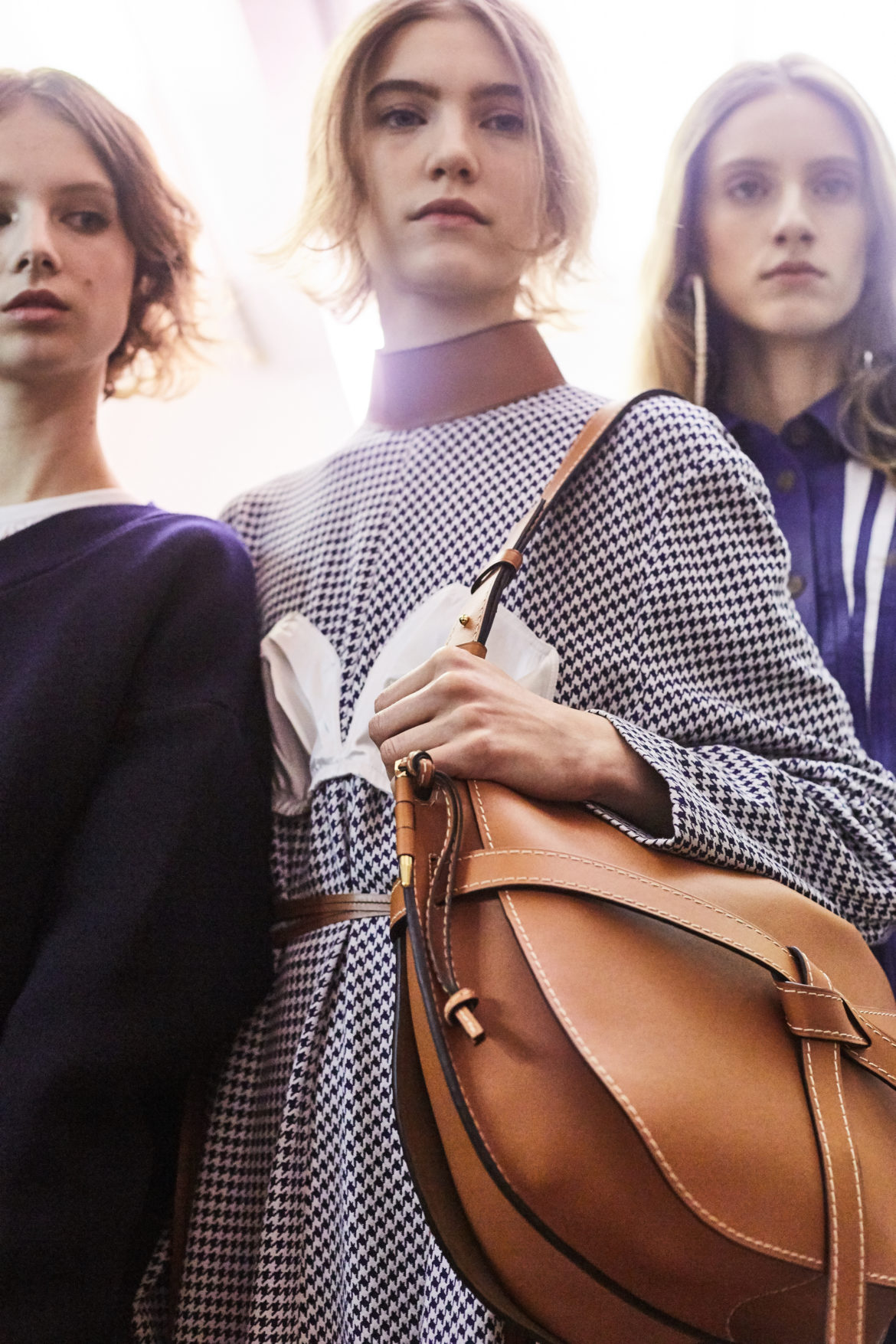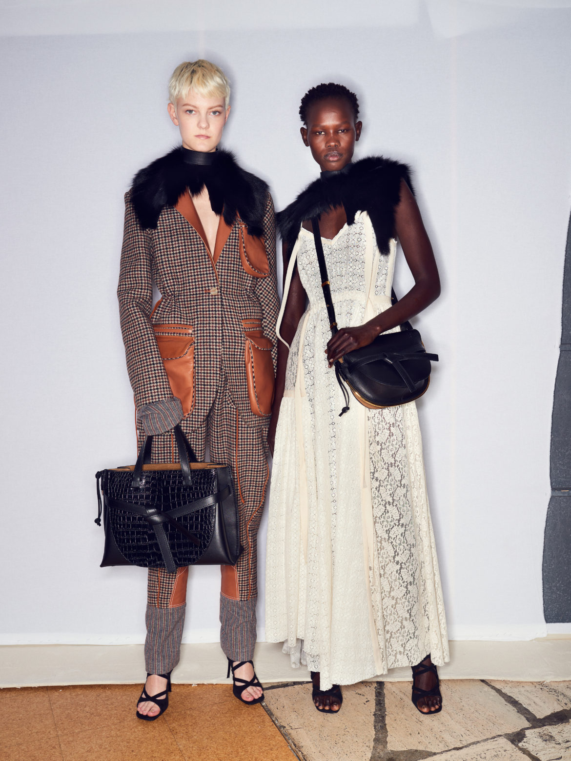 In a LOEWE take on the traditional saddle bag, the knotted ‘Gate’ bag returns for Fall Winter 2018 re-imagined in burnished box calfskin, paneled inhound’s tooth wool. It is updated in a miniature style and an exotic top-handled tote.
