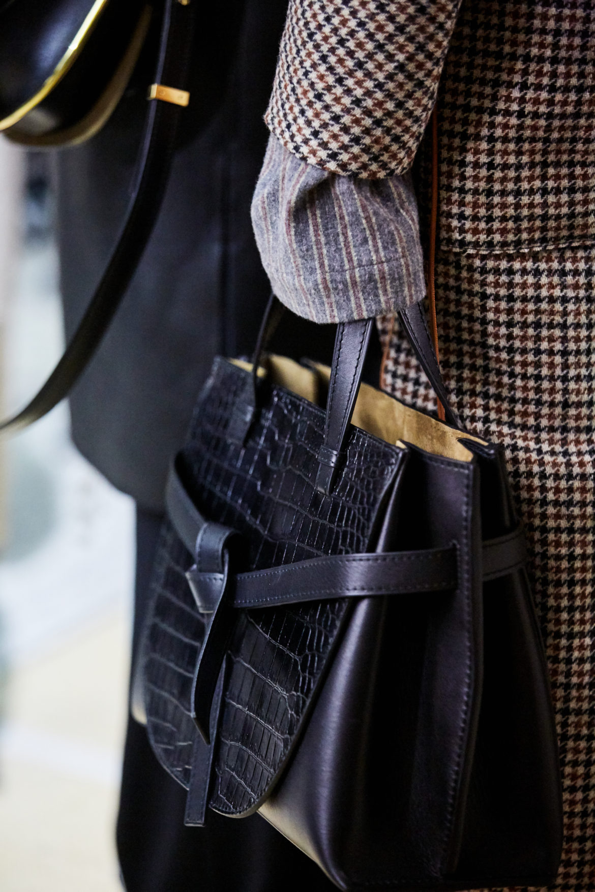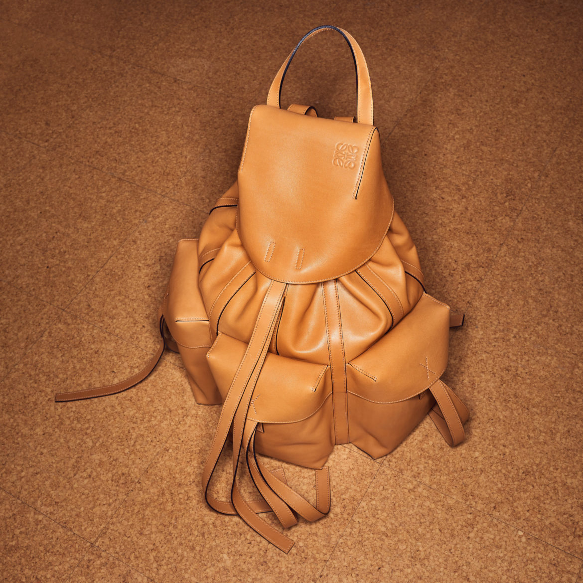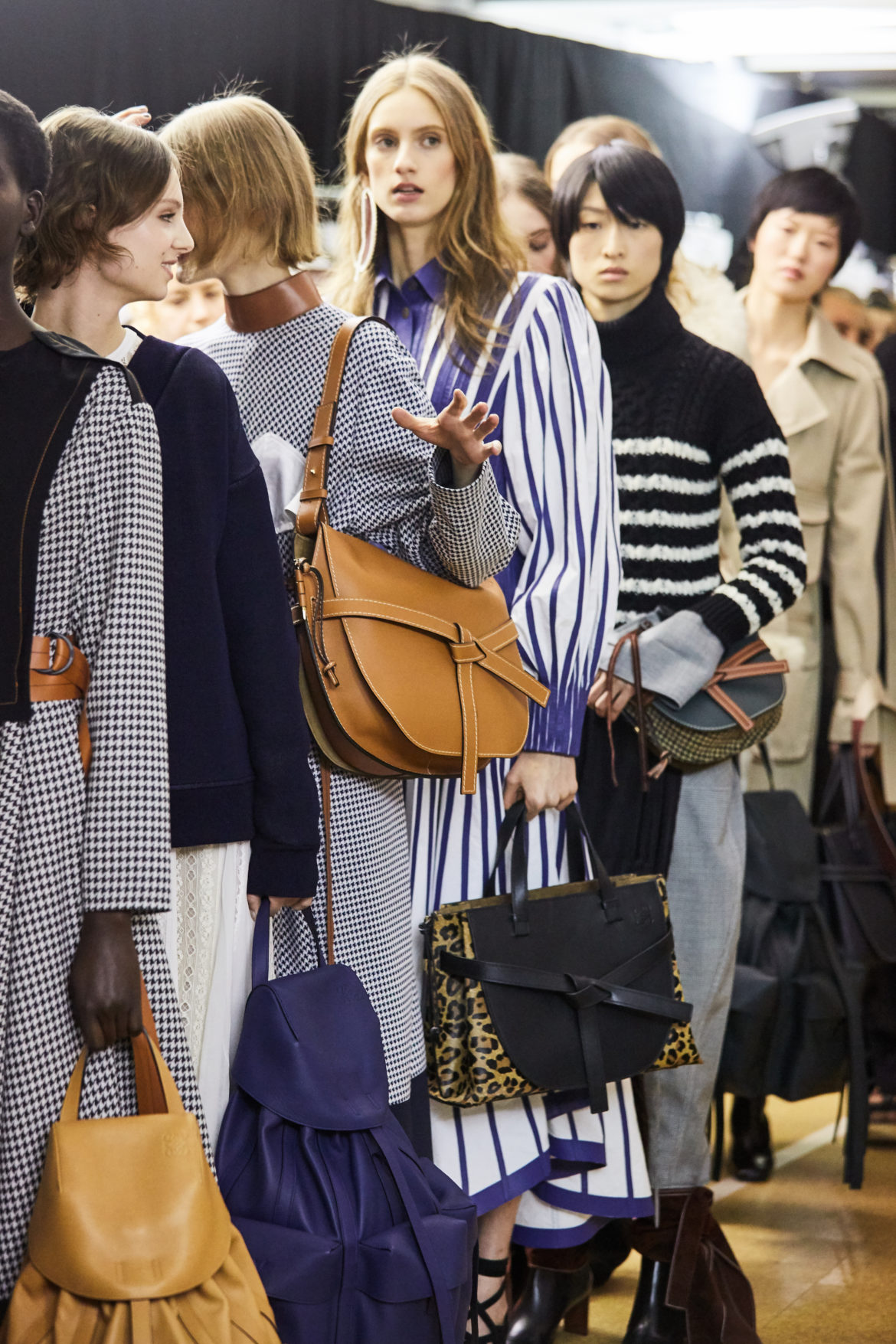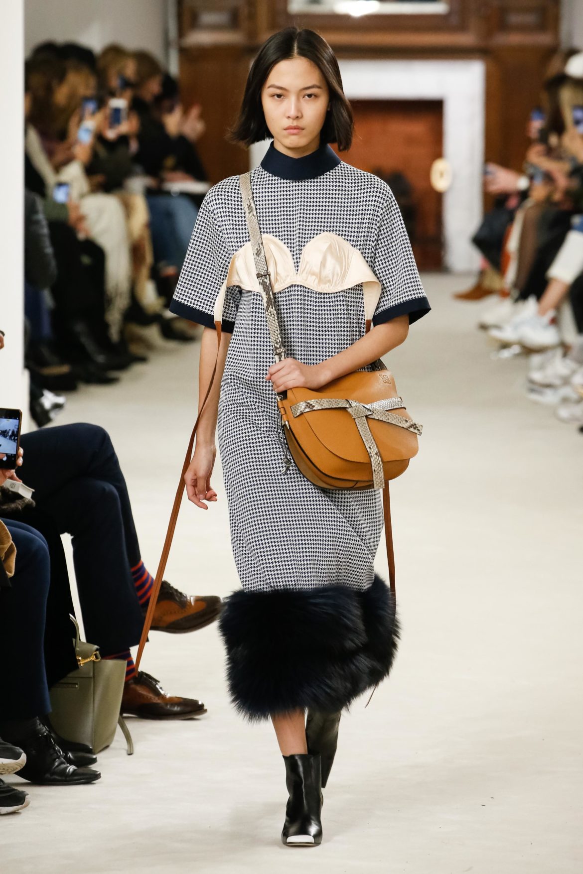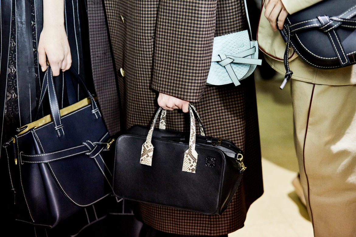 In a LOEWE take on the traditional saddle bag, the knotted ‘Gate’ bag returns for Fall Winter 2018 re-imagined in burnished box calfskin, paneled inhound’s tooth wool. It is updated in a miniature style and an exotic top-handled tote.