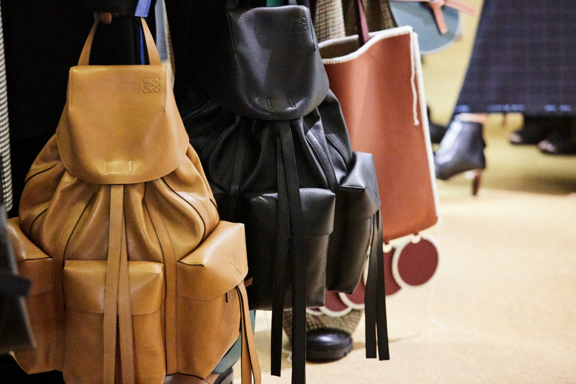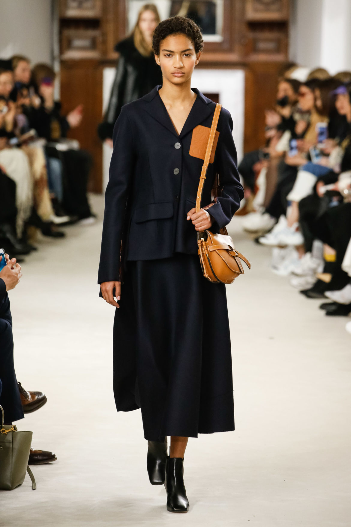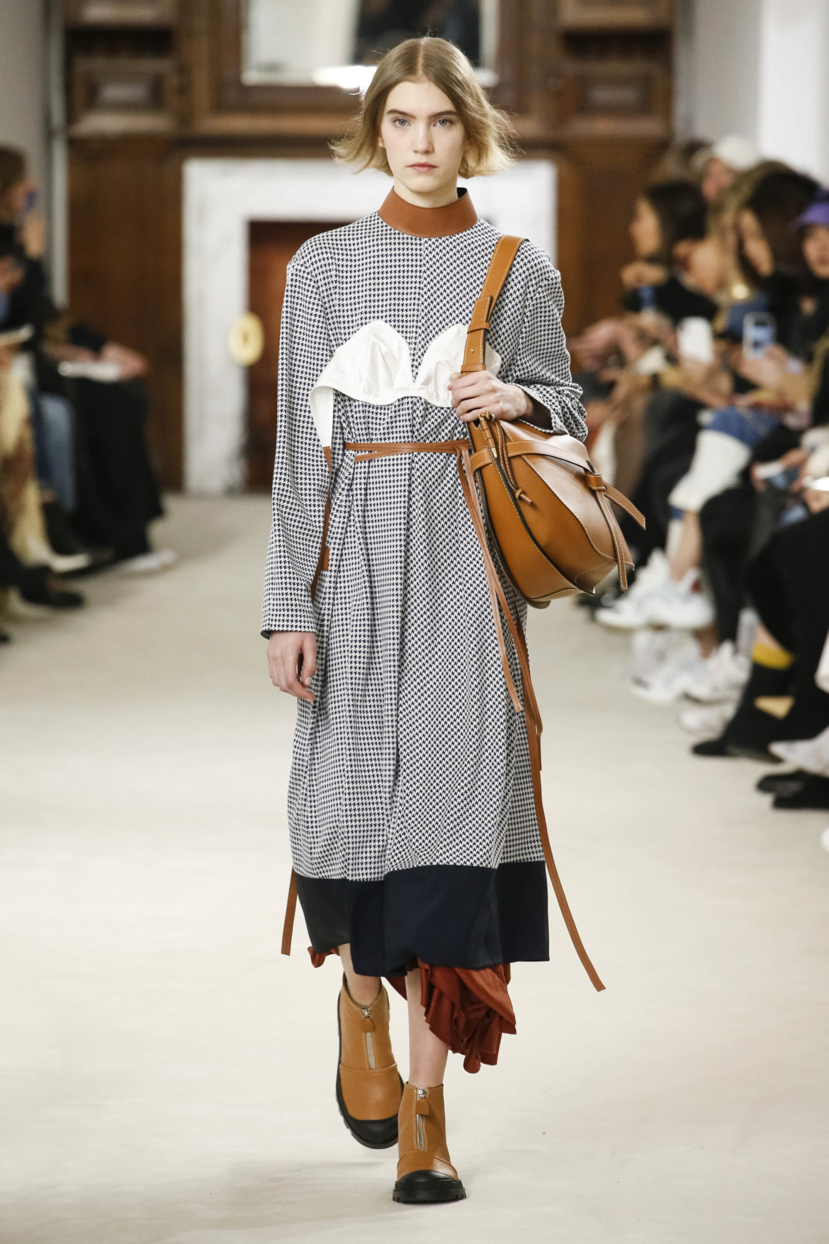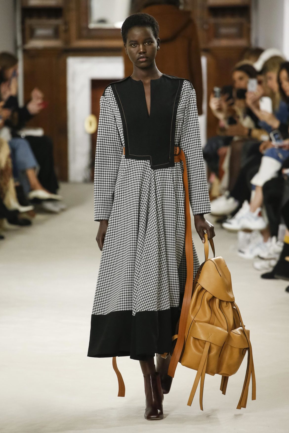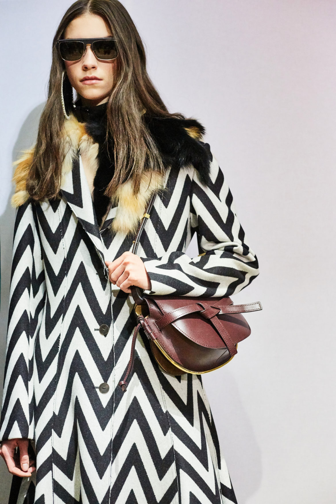 In a LOEWE take on the traditional saddle bag, the knotted ‘Gate’ bag returns for Fall Winter 2018 re-imagined in burnished box calfskin, paneled inhound’s tooth wool. It is updated in a miniature style and an exotic top-handled tote.