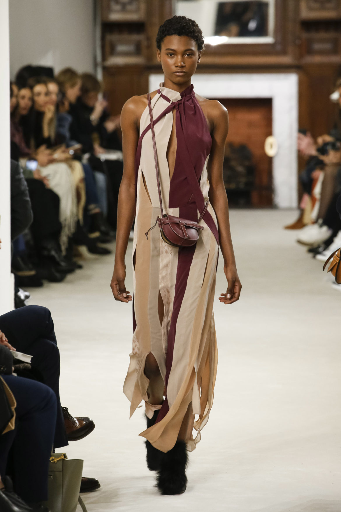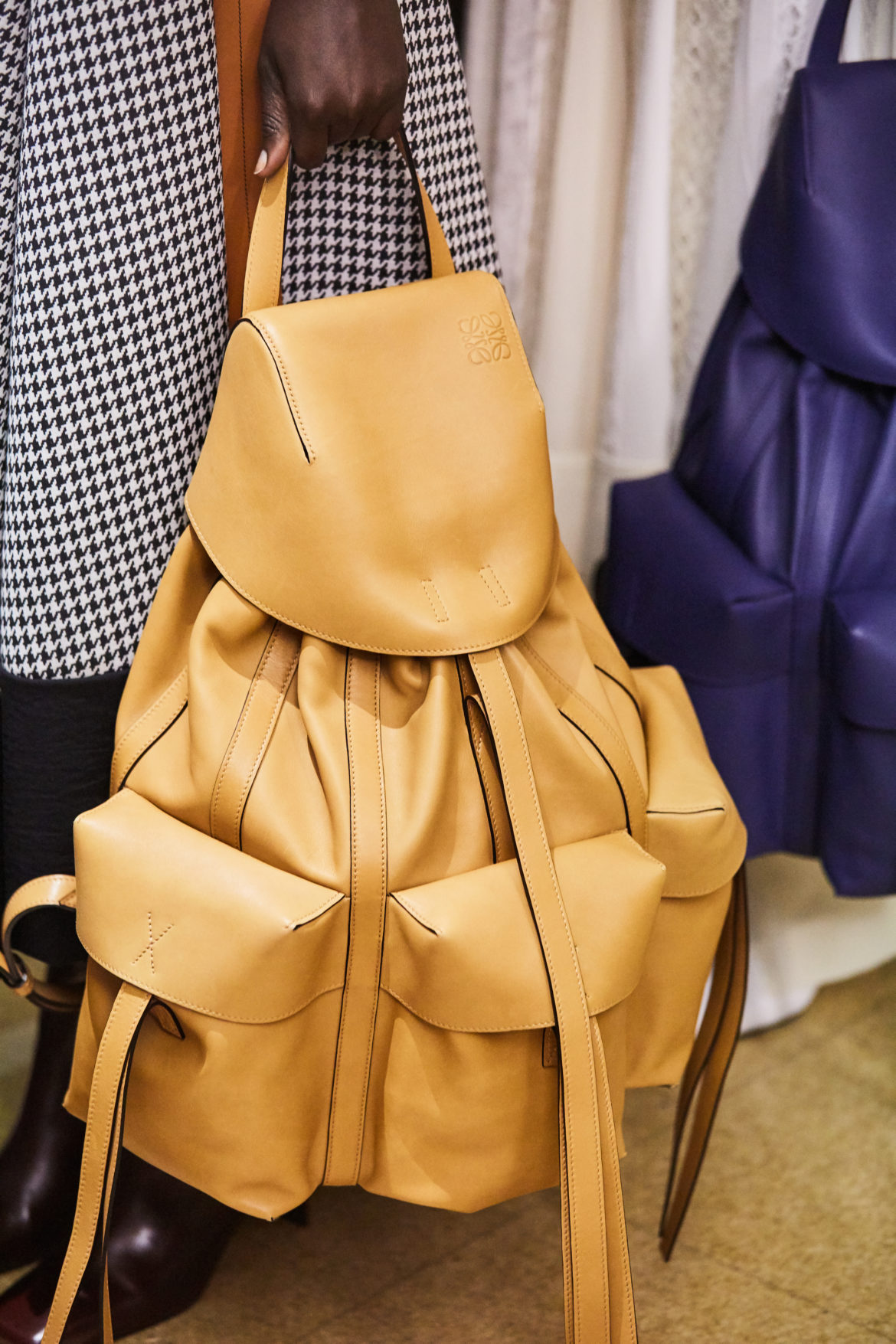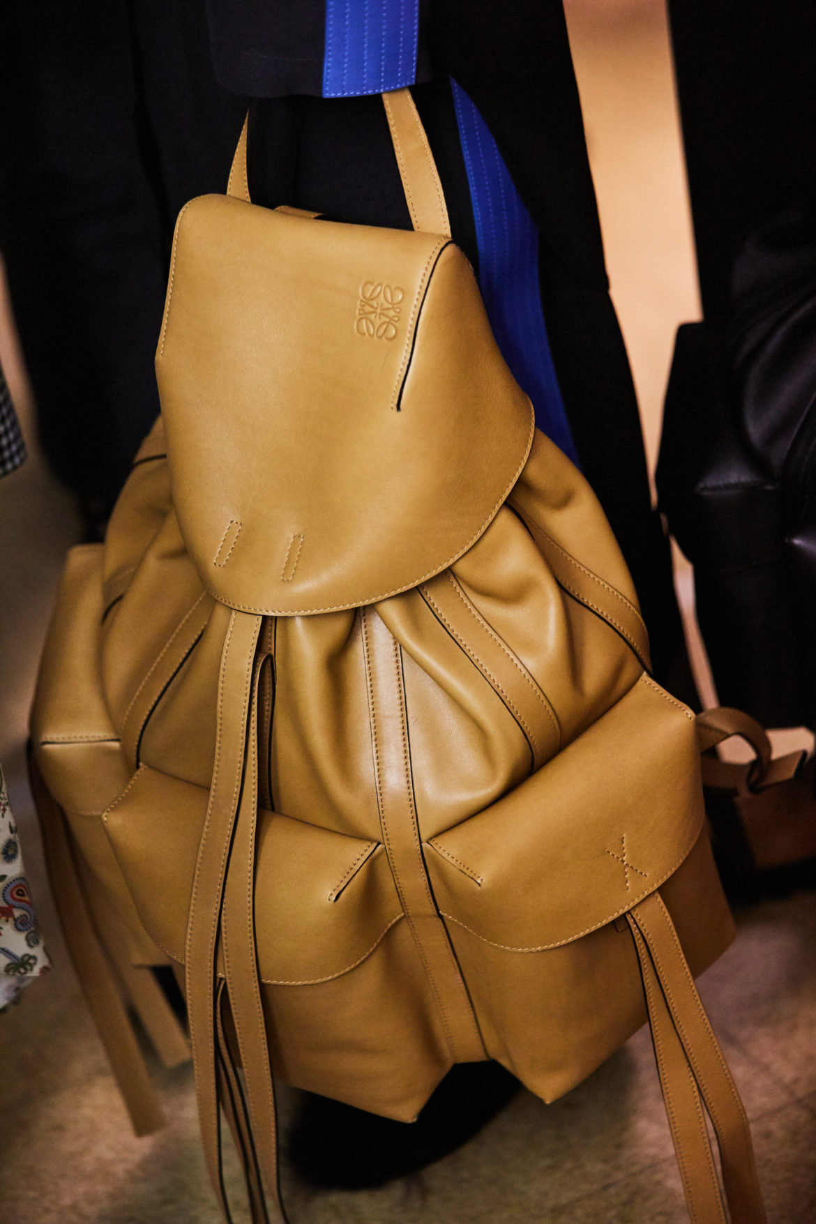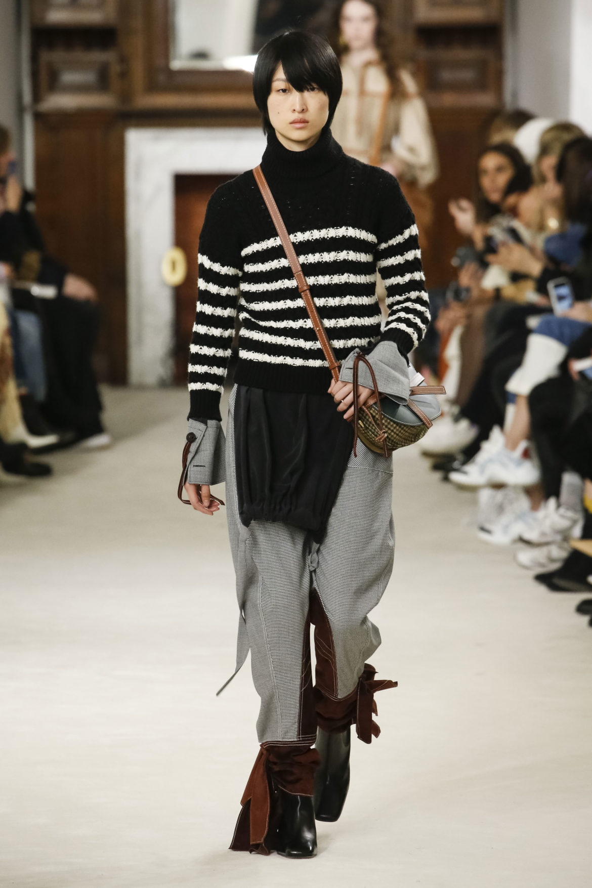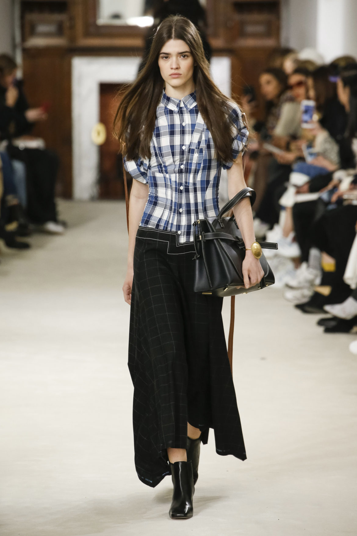 In a LOEWE take on the traditional saddle bag, the knotted ‘Gate’ bag returns for Fall Winter 2018 re-imagined in burnished box calfskin, paneled inhound’s tooth wool. It is updated in a miniature style and an exotic top-handled tote.