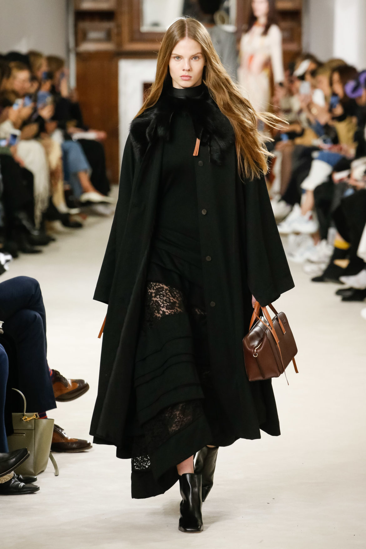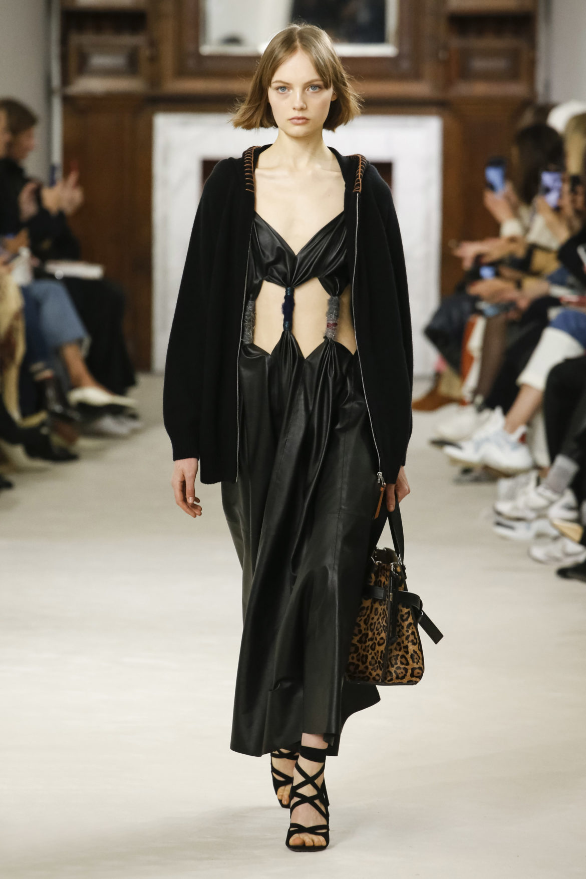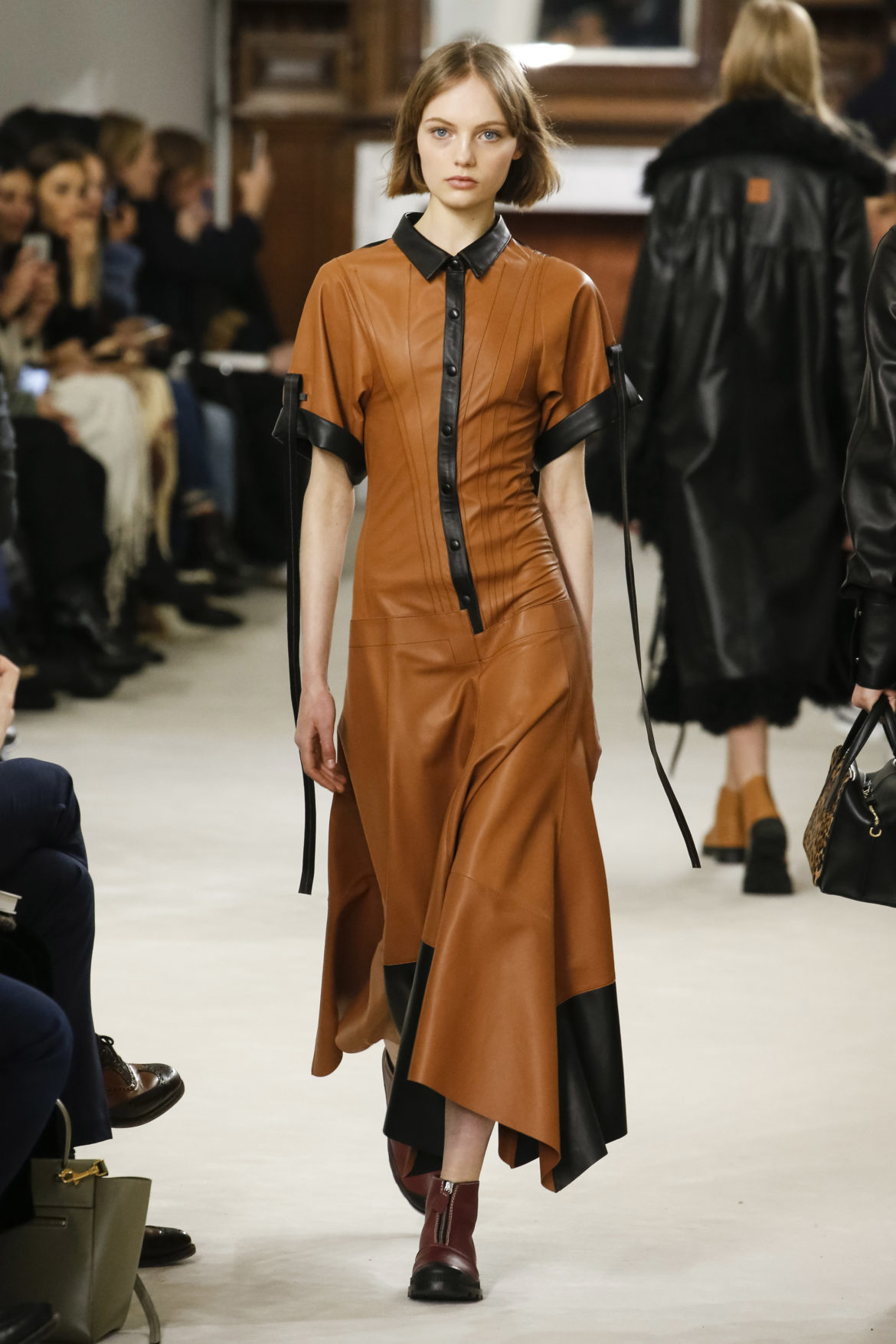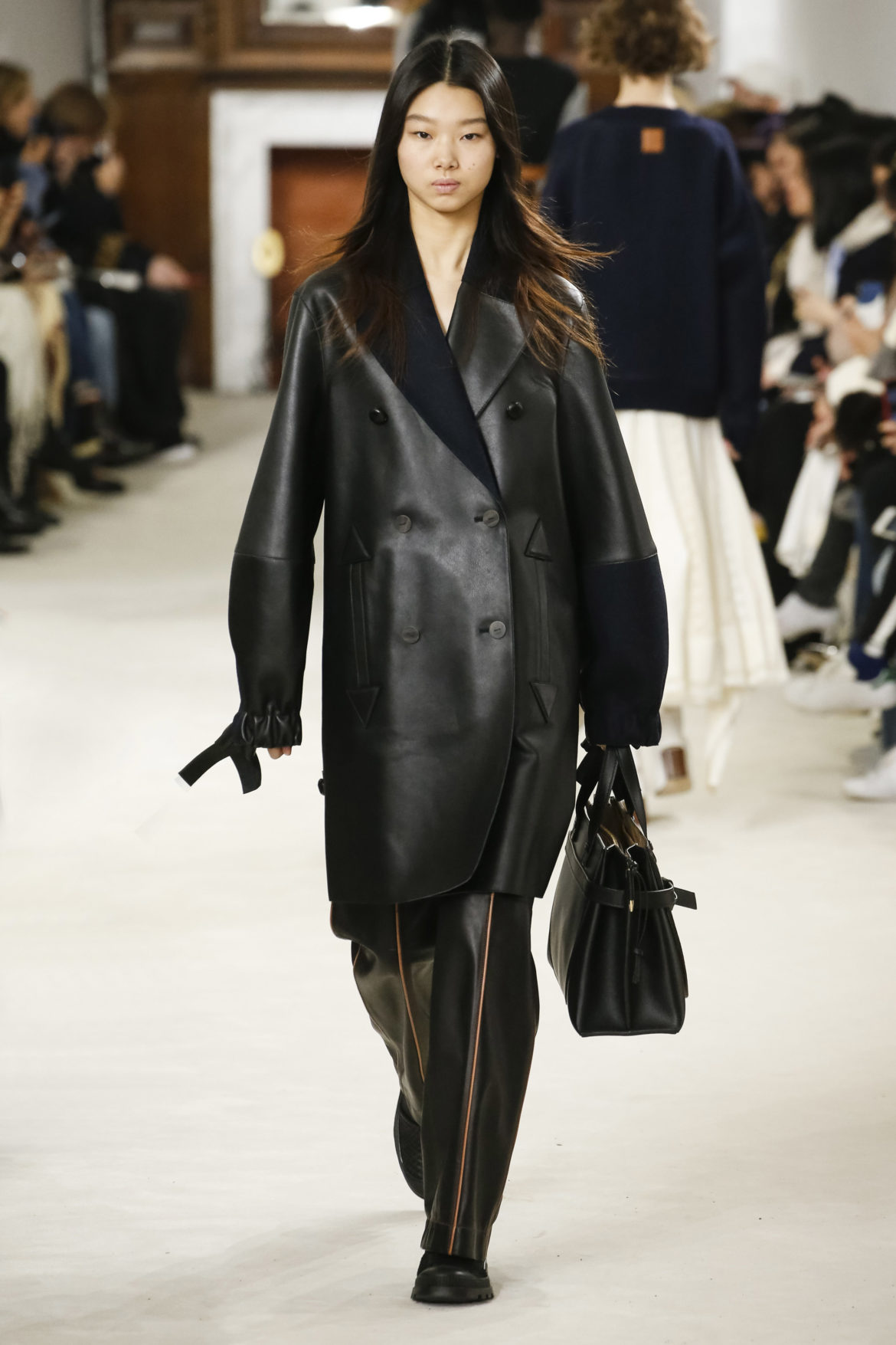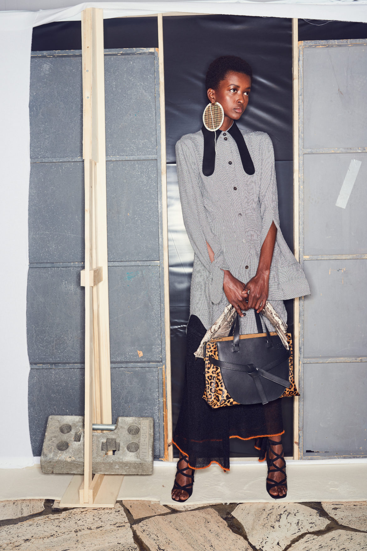 Embracing LOEWE tradition, leather is worked as both surface and adornment. Smooth topstitched calfskin imposes structure on cotton plissé dresses, is spliced through lace, or falls in vertical panels down soft smocks and trousers. Flared coats and capes create ample volume in flat gabardine, plush shearling, or raw-cut optical jacquard.