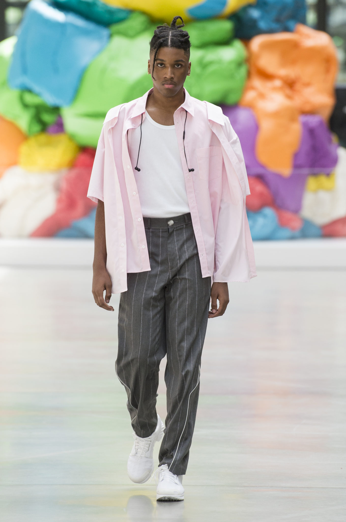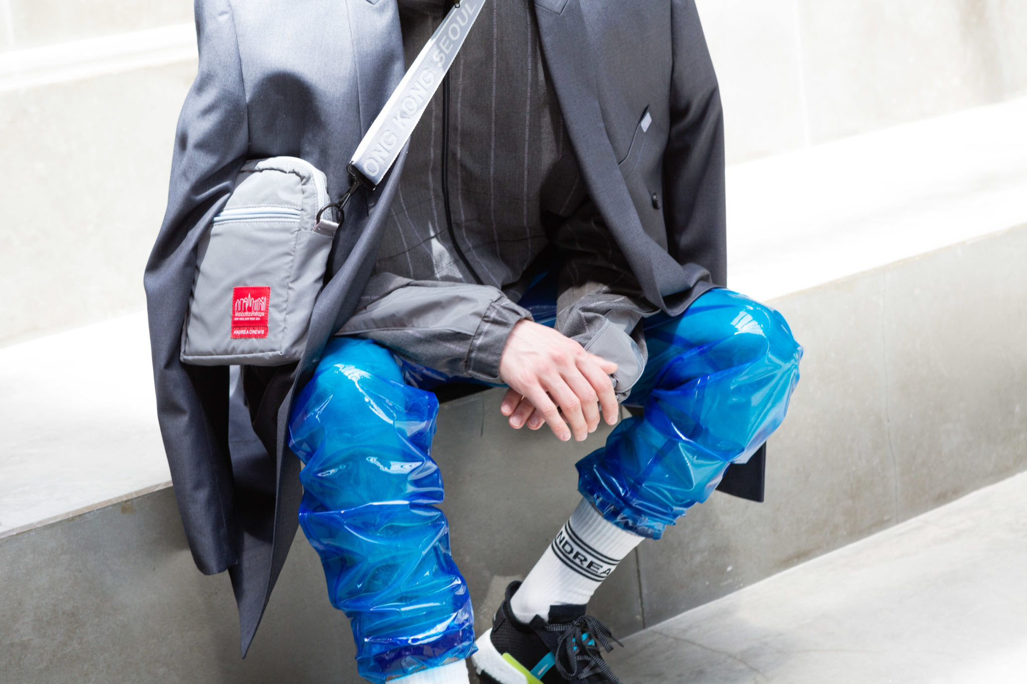 Conscient de son pouvoir, l’homme Andrea Crews prend contrôle du monde qui l’entoure et redéfinit le style du business man. Il porte sa veste retournée, détournée, upcyclée ; sa chemise corporate sous un jogging de cuir, et les icônes sur son tee shirt de star s’appellent Snowden ou Assange…