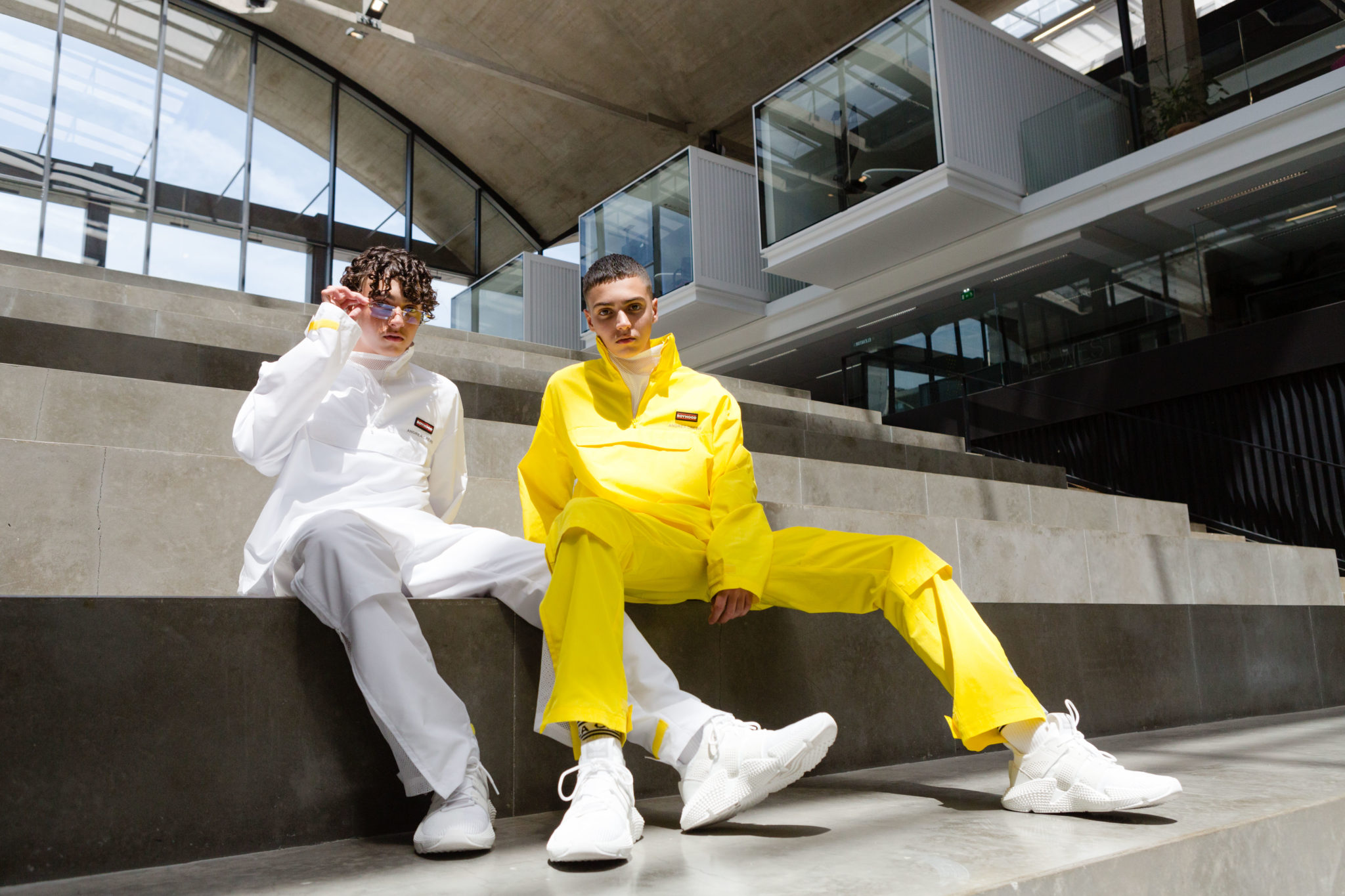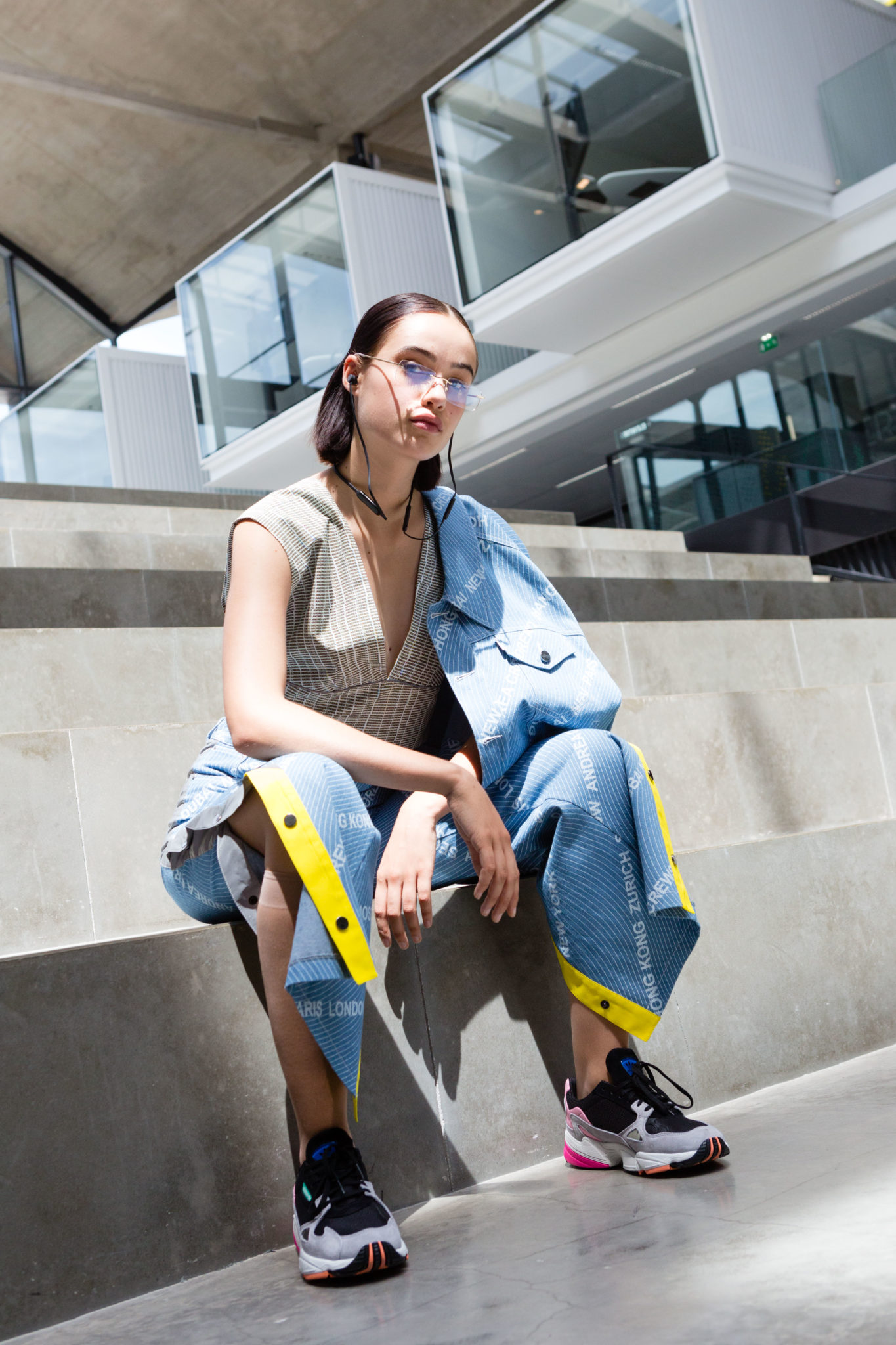 Sportswear et Officewear se mixent et se superposent, les matières imitent les coques d’ordinateurs et sont brandées par les puces électroniques de nos cartes bancaires. La gamme de couleur se décline en niveaux de gris-beige des machines rétro-futuristes, éclairée par les flashs du reflective et les pastels intemporels des cols gris.