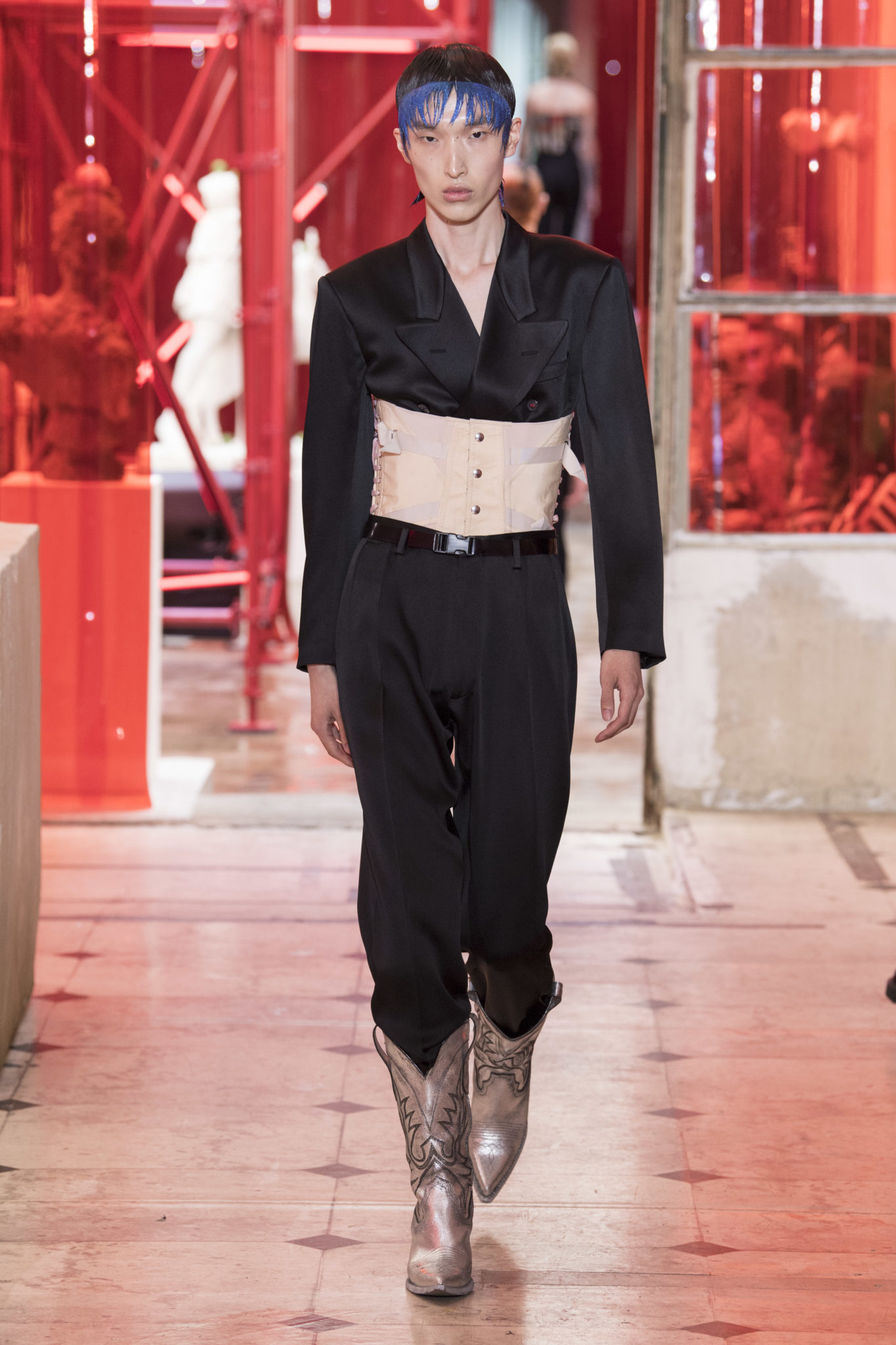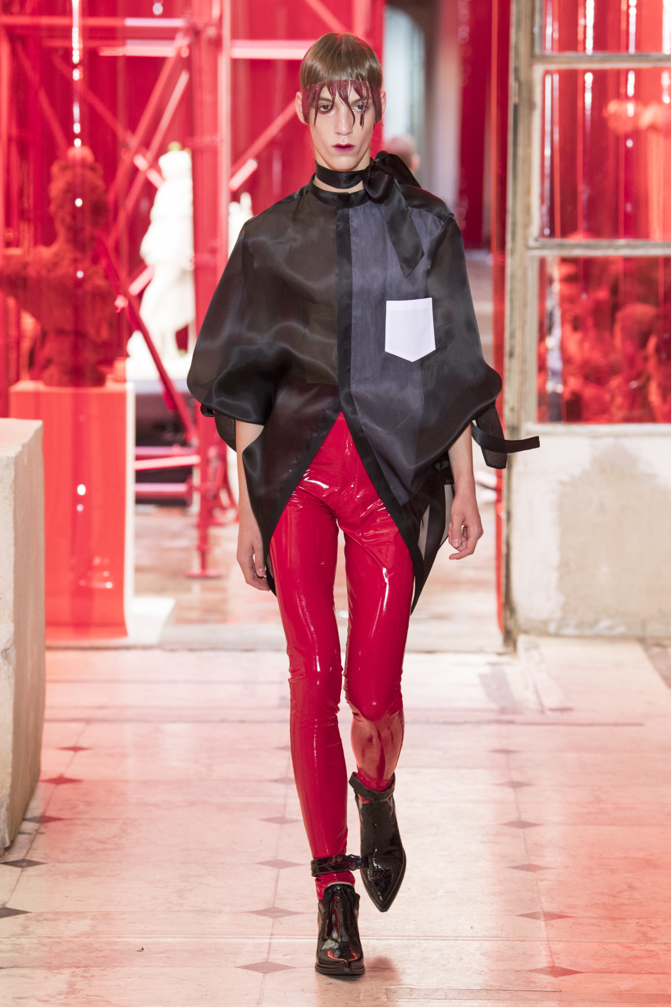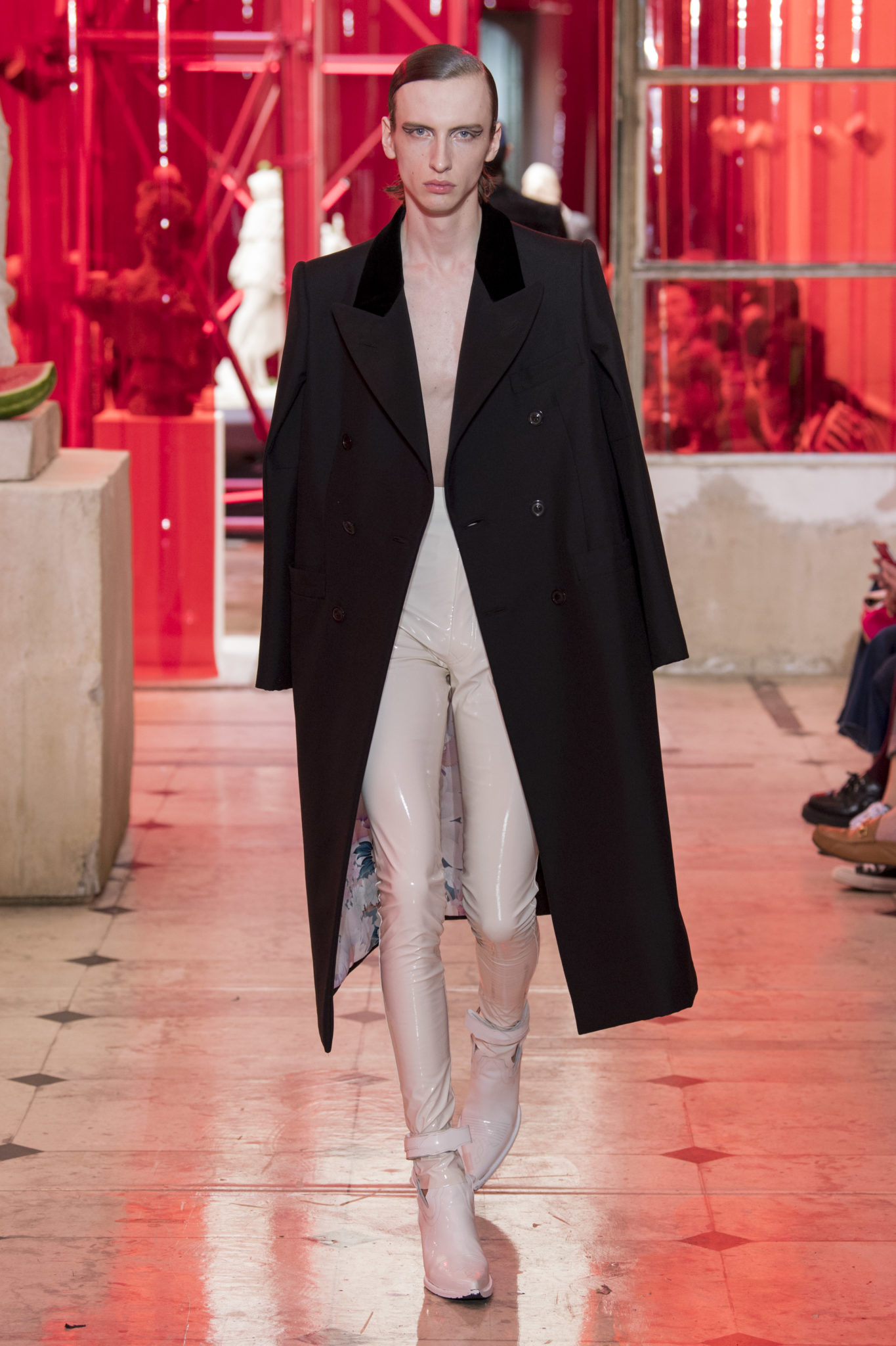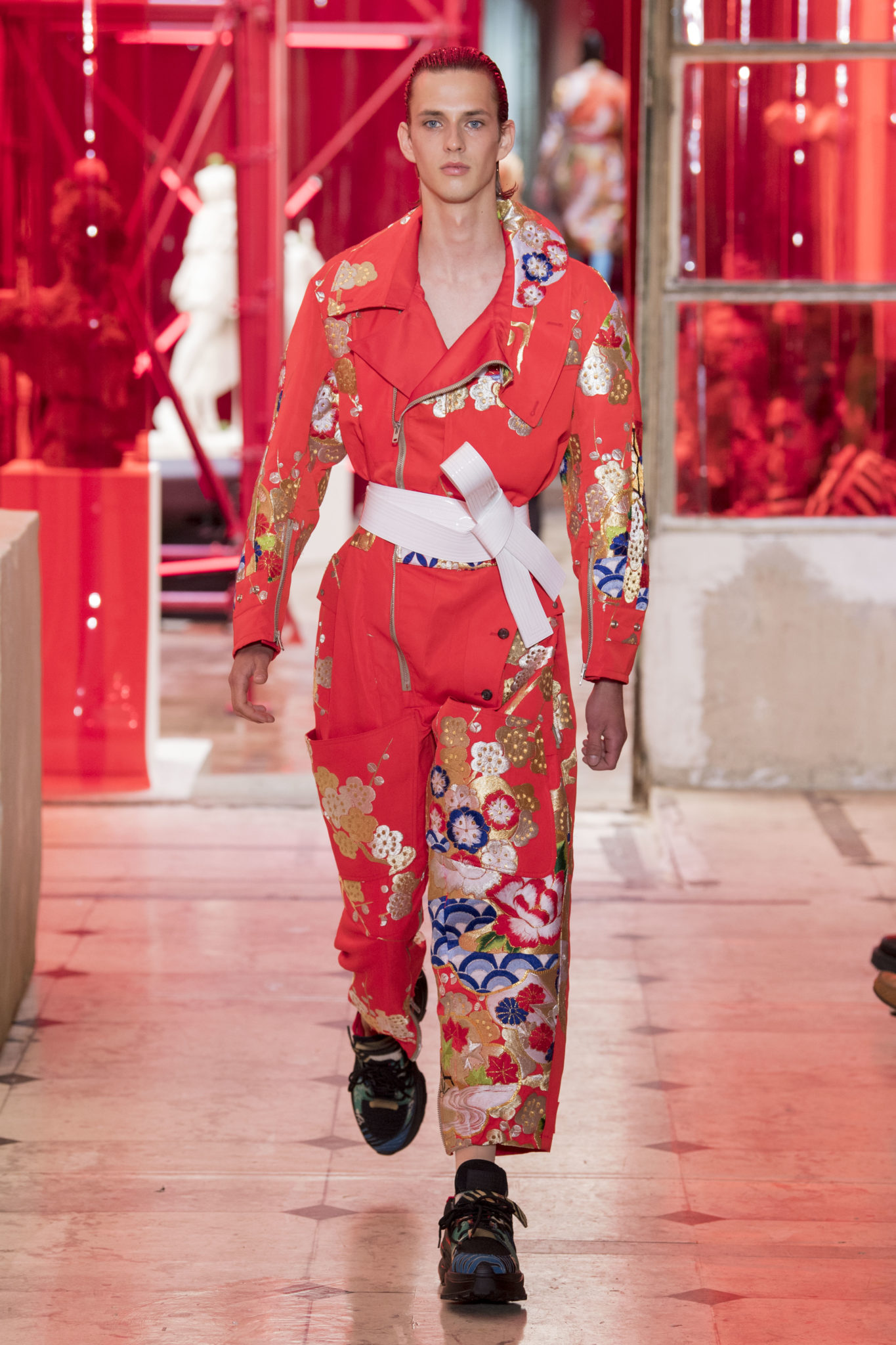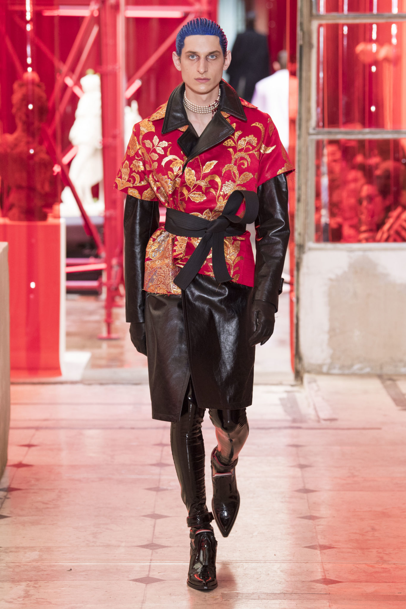 eassessing the future of dressmaking in the men’s wardrobe, Maison Margiela presents its first full Artisanal menswear collection. The show signifies an unrestricted foray onto the territory of haute couture for men in a conversation with a new masculinity in motion. Opening the doors to the deft skills of creative director John Galliano and the 163 rue Saint-Maur ateliers, the presentation is staged as the house works in view. The collection is exclusively bespoke and will inform a men’s ready-to-wear line to be included in a co-ed Spring – Summer 2019 Défilé show in September. Reflecting on the streetwear culture of the current menswear climate, John Galliano exercises his pyramidical approach to creation through an exploration of new values. It is an appreciation of the current evolution of male dress codes, and the desire to take it to unexplored places of craftsmanship for a young generation. The bias-cut – a technique native to the creative language of John Galliano – transforms traditional bespoke tailoring into a mercurial and hyper-modern take on suit-making. Executed in silks and tweeds, bias-cutting generates a harmonious exchange between fabric and body, expressed in a louche and liberating silhouette for an advancing male dress sense. The intricacy, techniques and time inherent to haute couture are applied to traditional ideas of male dress in a transcendence of gender-specific uniforms. It is the experimental proposal of a reimagined sexuality, sensuality and individuality for a new mentality. Rooted in authenticity, garments informed by the wardrobes of formalwear and leisure pursuits undergo a process of repurposing. Original kimonos – some from the eighteenth century – are reconditioned into garments for the contemporary wardrobe. Corsetry, cape cuts in outerwear, and hand-embroidery in surface decoration nod at classic couture codes, whereas rubber and leather moulding reflect a less traditional approach to craftsmanship. The Artisanal show is embedded in expert dressmaking and a new consideration of the tradition of haute couture. Drawing on terminology established in recent Artisanal proposals, notions of relaxed glamour, dressing in haste, appropriating the inappropriate, and dressing in reverse underpin the collection. House techniques such as anonymity of the lining, the memory of, and décortiqué, materialise throughout, honouring and honing the Artisanal identity of Maison Margiela. ‘Through the potential of Artisanal possibilities, conventional dress codes are broken down in a discovery of diverse individualities for a new age of self-expression.’ – Maison Margiela. Materials Authentic fabrications known from classic tailoring and haute couture form the foundation for the collection. Satin-back crêpe and tweed serve as canvases for bias-cutting in tailoring, while wool, twill and leather enter into outerwear. Drawing on the bespoke women’s wardrobe, textiles such as boucle, organza, chiffon, silk, jacquard and fine knit amplify the Artisanal volume, alongside the inevitable couture element of plume. They are contrasted by bold materials in the shape of vinyl, rubber, patent leather, and plastic. Original and antique kimonos are recycled and repurposed into new incarnations, bonded to their own lining. Technique The technique through which creative director John Galliano has historically expressed himself, biascutting is explored in menswear for a languid and dynamic approach to tailoring. Contrary to cutting straight-of-grain, bias-cutting materialises when the material is cut at an angle, allowing the natural elasticity in the fabric to hit the bias. The result is a virile, unparalleled sense of movement and a feeling of non-constriction. Recycled kimonos are deconstructed thread by thread, bonded to their own lining and transformed into new garments. Outerwear is cut like capes, evoking an unmistakable haute couture shape. Outdoor wardrobe staples are shrunken and transformed into shirts. Plume is encased in painted plastic. Hand-embroidery and hand-beading further cement the Artisanal prowess of the collection. Employing recently established house techniques, décortiqué appears when a garment or accessory is reduced to its structural core, while anonymity of the lining signifies the revelation of garment constructions traditionally concealed. The memory of illustrates the impression of a familiar motif in a garment. Dressing in haste is evoked by the gesticular encasing of outfits in fine silk knit tops, and dressing in reverse is the repurposing of garment layers traditionally assigned a certain function. Palette Black, white and off-white set the authentic tones for the collection. They come alive alongside red, pink and turquoise, backed up by motifs from kimonos and leopard, as well as vintage and animated prints. Finally, gold and silver serve as a manifestation of the high dressmaking embodied by the Artisanal collection. Accessories The techniques of haute couture inform hand-worked jewellery constructed from hand-made materials. Custom designed embroideries are created in a meeting between leisure pursuits and techno. Painstaking beadwork such as ladylike pearl necklaces, also native to haute couture, are embellished with blood drops made of tiny beads and resin paint. A décortiqué hat evokes codes from the hunting wardrobe, while high-shine leather belts with sportswear clasps echo an idea of the staple accessory. Launched last year, the Glam Slam bag appears colour-coded to the collection. Formal men’s shoes, Santiago boots and Tabi boots feature in décortiqué editions. The Artisanal men’s trainer makes its debut, in rubber, hand-embroidery and recycled original kimono fabric.