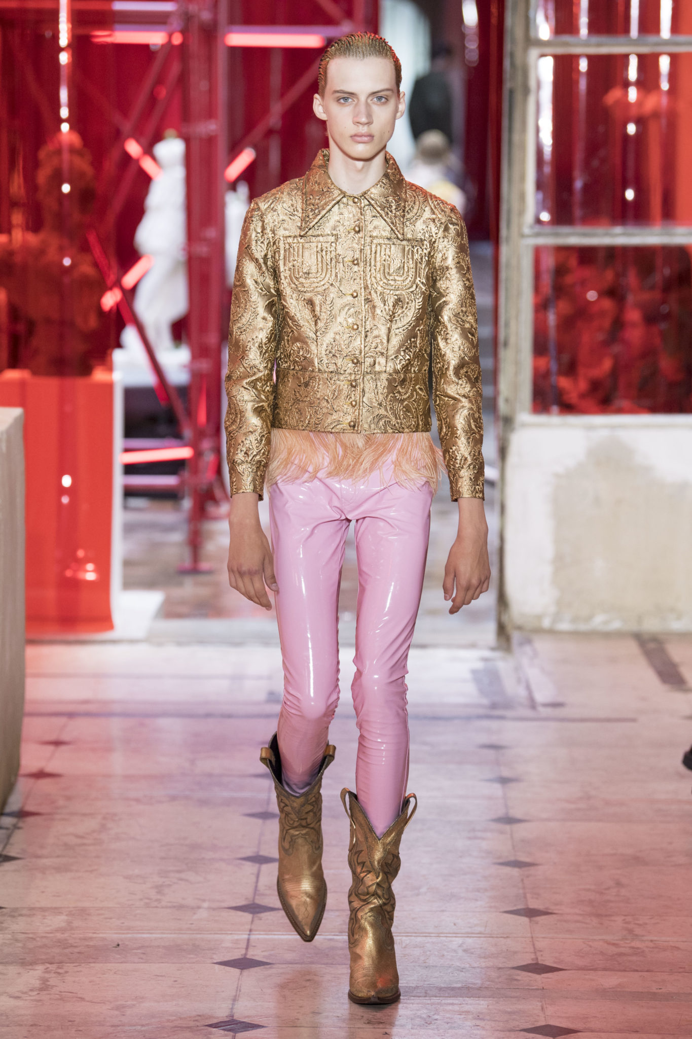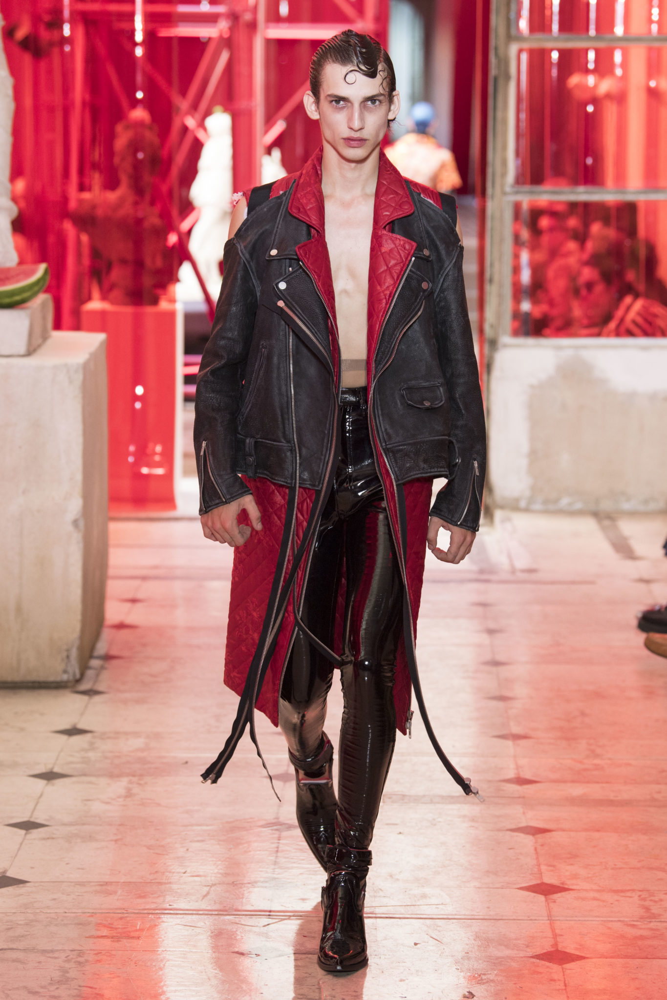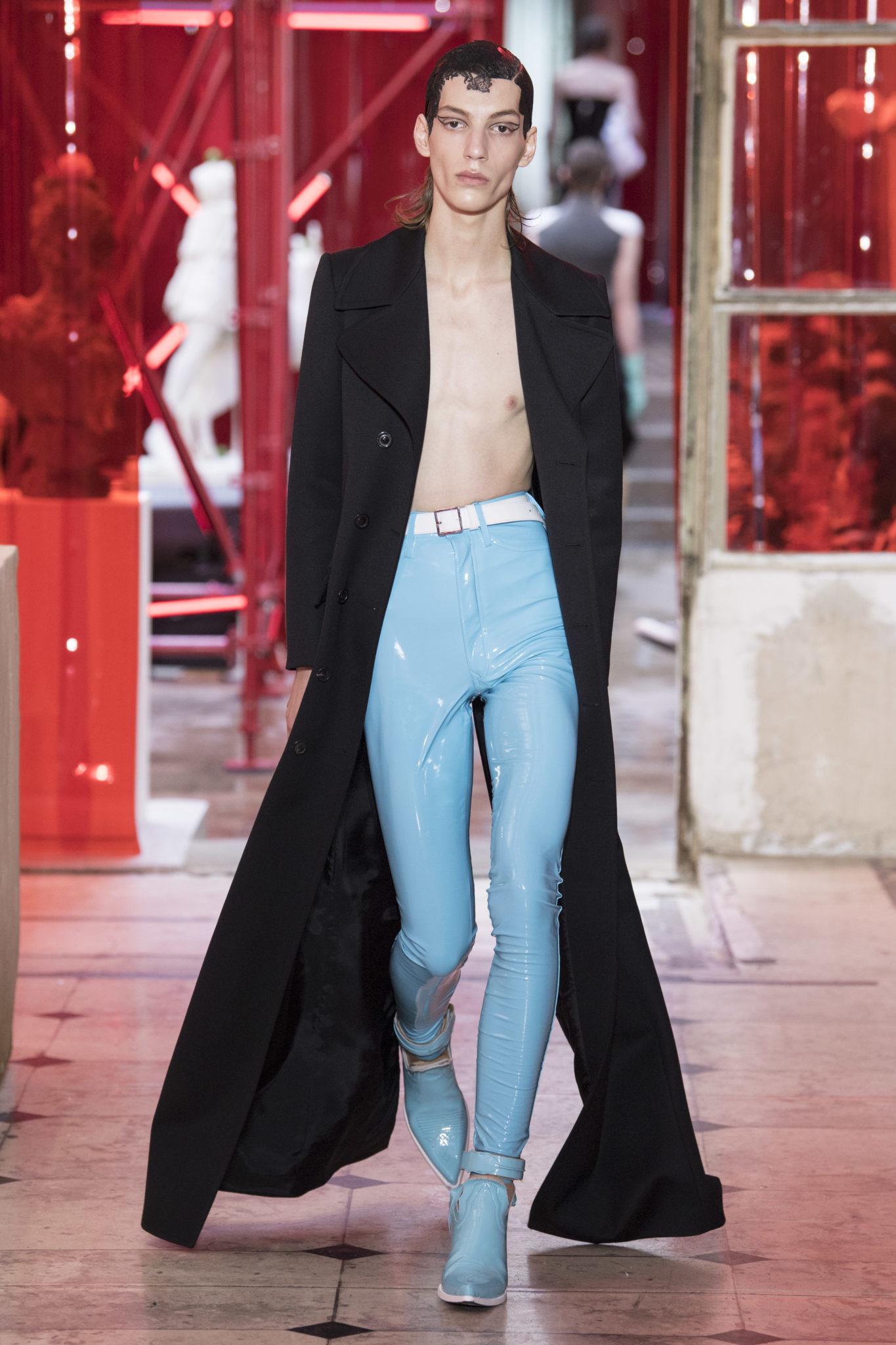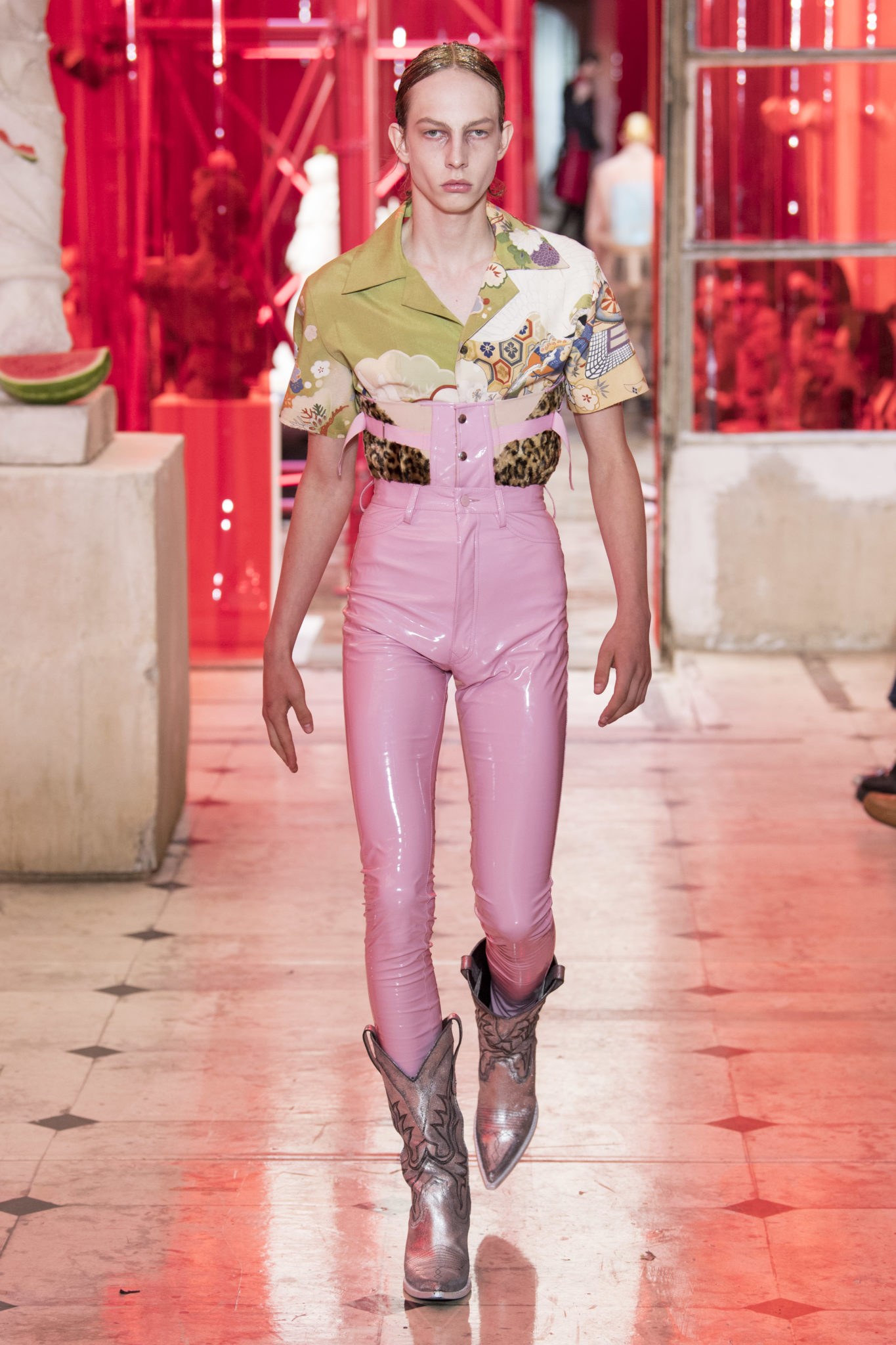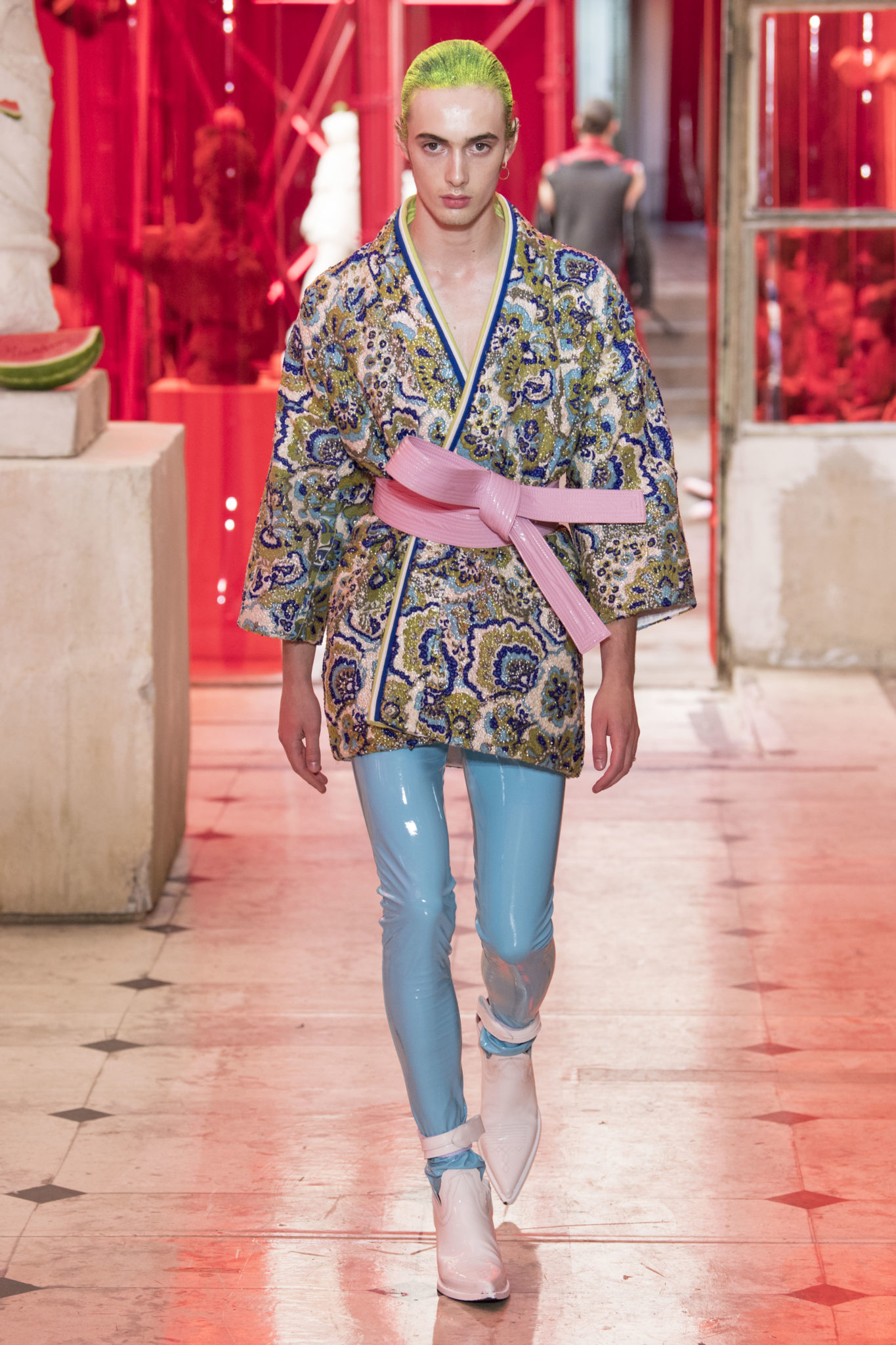 eassessing the future of dressmaking in the men’s wardrobe, Maison Margiela presents its first full Artisanal menswear collection. The show signifies an unrestricted foray onto the territory of haute couture for men in a conversation with a new masculinity in motion. Opening the doors to the deft skills of creative director John Galliano and the 163 rue Saint-Maur ateliers, the presentation is staged as the house works in view. The collection is exclusively bespoke and will inform a men’s ready-to-wear line to be included in a co-ed Spring – Summer 2019 Défilé show in September. Reflecting on the streetwear culture of the current menswear climate, John Galliano exercises his pyramidical approach to creation through an exploration of new values. It is an appreciation of the current evolution of male dress codes, and the desire to take it to unexplored places of craftsmanship for a young generation. The bias-cut – a technique native to the creative language of John Galliano – transforms traditional bespoke tailoring into a mercurial and hyper-modern take on suit-making. Executed in silks and tweeds, bias-cutting generates a harmonious exchange between fabric and body, expressed in a louche and liberating silhouette for an advancing male dress sense. The intricacy, techniques and time inherent to haute couture are applied to traditional ideas of male dress in a transcendence of gender-specific uniforms. It is the experimental proposal of a reimagined sexuality, sensuality and individuality for a new mentality. Rooted in authenticity, garments informed by the wardrobes of formalwear and leisure pursuits undergo a process of repurposing. Original kimonos – some from the eighteenth century – are reconditioned into garments for the contemporary wardrobe. Corsetry, cape cuts in outerwear, and hand-embroidery in surface decoration nod at classic couture codes, whereas rubber and leather moulding reflect a less traditional approach to craftsmanship. The Artisanal show is embedded in expert dressmaking and a new consideration of the tradition of haute couture. Drawing on terminology established in recent Artisanal proposals, notions of relaxed glamour, dressing in haste, appropriating the inappropriate, and dressing in reverse underpin the collection. House techniques such as anonymity of the lining, the memory of, and décortiqué, materialise throughout, honouring and honing the Artisanal identity of Maison Margiela. ‘Through the potential of Artisanal possibilities, conventional dress codes are broken down in a discovery of diverse individualities for a new age of self-expression.’ – Maison Margiela. Materials Authentic fabrications known from classic tailoring and haute couture form the foundation for the collection. Satin-back crêpe and tweed serve as canvases for bias-cutting in tailoring, while wool, twill and leather enter into outerwear. Drawing on the bespoke women’s wardrobe, textiles such as boucle, organza, chiffon, silk, jacquard and fine knit amplify the Artisanal volume, alongside the inevitable couture element of plume. They are contrasted by bold materials in the shape of vinyl, rubber, patent leather, and plastic. Original and antique kimonos are recycled and repurposed into new incarnations, bonded to their own lining. Technique The technique through which creative director John Galliano has historically expressed himself, biascutting is explored in menswear for a languid and dynamic approach to tailoring. Contrary to cutting straight-of-grain, bias-cutting materialises when the material is cut at an angle, allowing the natural elasticity in the fabric to hit the bias. The result is a virile, unparalleled sense of movement and a feeling of non-constriction. Recycled kimonos are deconstructed thread by thread, bonded to their own lining and transformed into new garments. Outerwear is cut like capes, evoking an unmistakable haute couture shape. Outdoor wardrobe staples are shrunken and transformed into shirts. Plume is encased in painted plastic. Hand-embroidery and hand-beading further cement the Artisanal prowess of the collection. Employing recently established house techniques, décortiqué appears when a garment or accessory is reduced to its structural core, while anonymity of the lining signifies the revelation of garment constructions traditionally concealed. The memory of illustrates the impression of a familiar motif in a garment. Dressing in haste is evoked by the gesticular encasing of outfits in fine silk knit tops, and dressing in reverse is the repurposing of garment layers traditionally assigned a certain function. Palette Black, white and off-white set the authentic tones for the collection. They come alive alongside red, pink and turquoise, backed up by motifs from kimonos and leopard, as well as vintage and animated prints. Finally, gold and silver serve as a manifestation of the high dressmaking embodied by the Artisanal collection. Accessories The techniques of haute couture inform hand-worked jewellery constructed from hand-made materials. Custom designed embroideries are created in a meeting between leisure pursuits and techno. Painstaking beadwork such as ladylike pearl necklaces, also native to haute couture, are embellished with blood drops made of tiny beads and resin paint. A décortiqué hat evokes codes from the hunting wardrobe, while high-shine leather belts with sportswear clasps echo an idea of the staple accessory. Launched last year, the Glam Slam bag appears colour-coded to the collection. Formal men’s shoes, Santiago boots and Tabi boots feature in décortiqué editions. The Artisanal men’s trainer makes its debut, in rubber, hand-embroidery and recycled original kimono fabric.