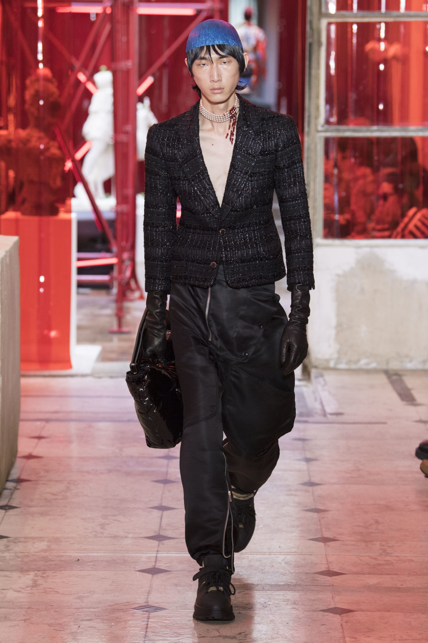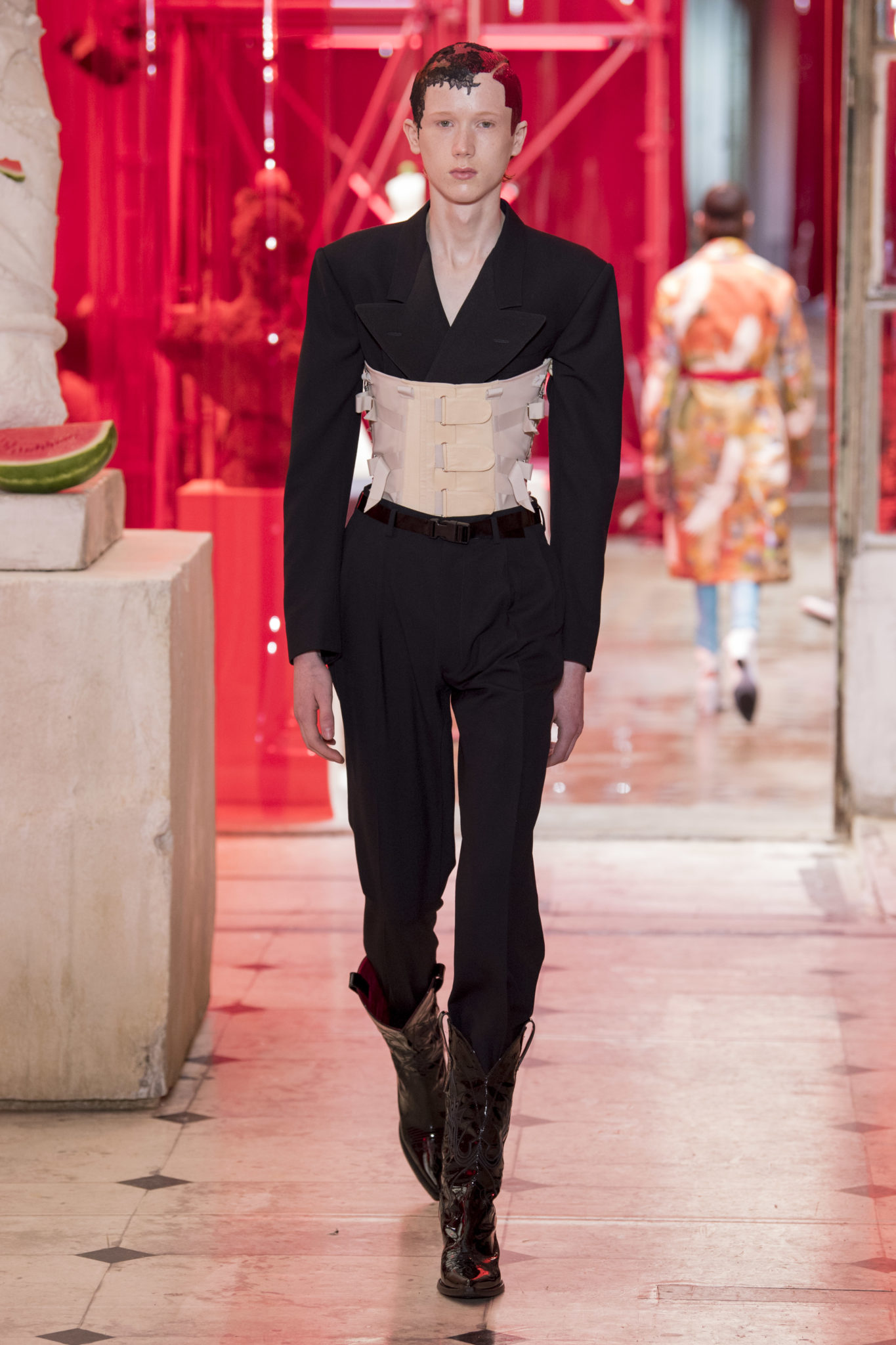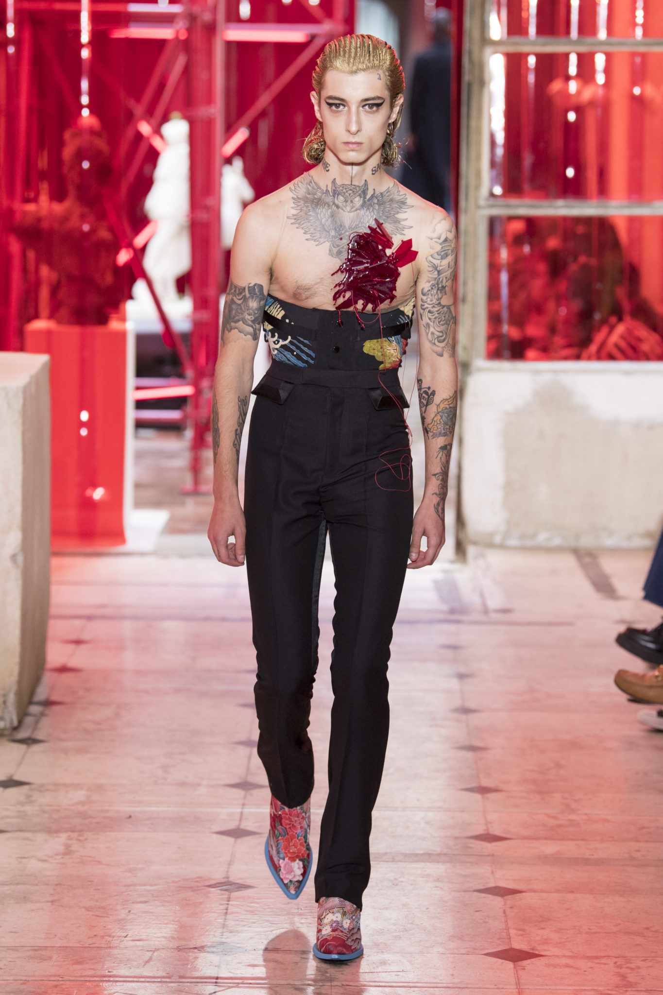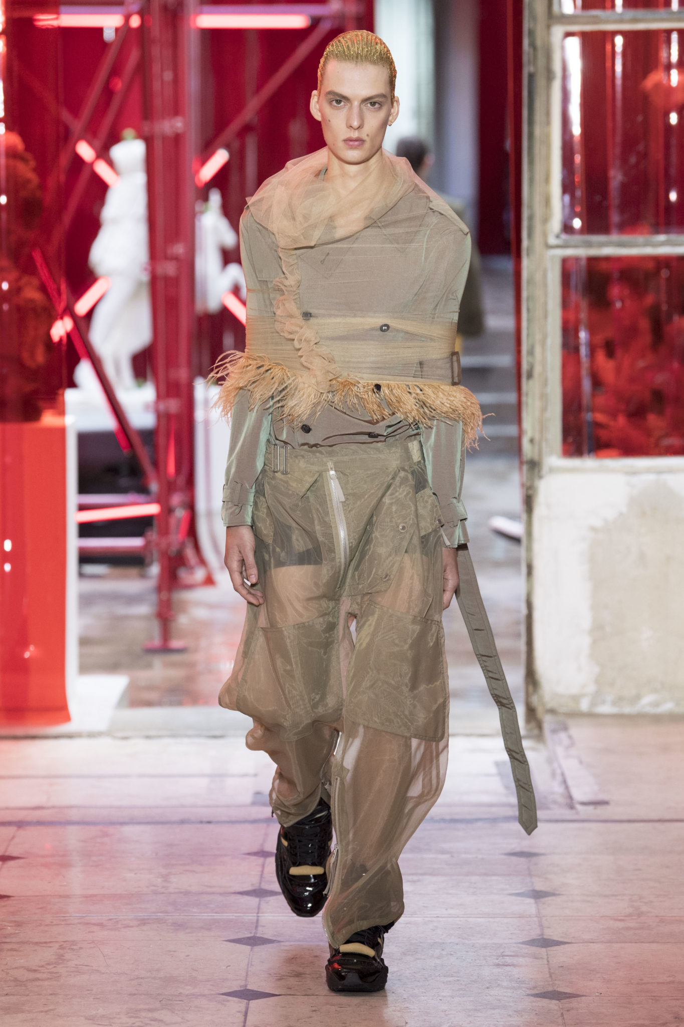 eassessing the future of dressmaking in the men’s wardrobe, Maison Margiela presents its first full Artisanal menswear collection. The show signifies an unrestricted foray onto the territory of haute couture for men in a conversation with a new masculinity in motion. Opening the doors to the deft skills of creative director John Galliano and the 163 rue Saint-Maur ateliers, the presentation is staged as the house works in view. The collection is exclusively bespoke and will inform a men’s ready-to-wear line to be included in a co-ed Spring – Summer 2019 Défilé show in September. Reflecting on the streetwear culture of the current menswear climate, John Galliano exercises his pyramidical approach to creation through an exploration of new values. It is an appreciation of the current evolution of male dress codes, and the desire to take it to unexplored places of craftsmanship for a young generation. The bias-cut – a technique native to the creative language of John Galliano – transforms traditional bespoke tailoring into a mercurial and hyper-modern take on suit-making. Executed in silks and tweeds, bias-cutting generates a harmonious exchange between fabric and body, expressed in a louche and liberating silhouette for an advancing male dress sense. The intricacy, techniques and time inherent to haute couture are applied to traditional ideas of male dress in a transcendence of gender-specific uniforms. It is the experimental proposal of a reimagined sexuality, sensuality and individuality for a new mentality. Rooted in authenticity, garments informed by the wardrobes of formalwear and leisure pursuits undergo a process of repurposing. Original kimonos – some from the eighteenth century – are reconditioned into garments for the contemporary wardrobe. Corsetry, cape cuts in outerwear, and hand-embroidery in surface decoration nod at classic couture codes, whereas rubber and leather moulding reflect a less traditional approach to craftsmanship. The Artisanal show is embedded in expert dressmaking and a new consideration of the tradition of haute couture. Drawing on terminology established in recent Artisanal proposals, notions of relaxed glamour, dressing in haste, appropriating the inappropriate, and dressing in reverse underpin the collection. House techniques such as anonymity of the lining, the memory of, and décortiqué, materialise throughout, honouring and honing the Artisanal identity of Maison Margiela. ‘Through the potential of Artisanal possibilities, conventional dress codes are broken down in a discovery of diverse individualities for a new age of self-expression.’ – Maison Margiela. Materials Authentic fabrications known from classic tailoring and haute couture form the foundation for the collection. Satin-back crêpe and tweed serve as canvases for bias-cutting in tailoring, while wool, twill and leather enter into outerwear. Drawing on the bespoke women’s wardrobe, textiles such as boucle, organza, chiffon, silk, jacquard and fine knit amplify the Artisanal volume, alongside the inevitable couture element of plume. They are contrasted by bold materials in the shape of vinyl, rubber, patent leather, and plastic. Original and antique kimonos are recycled and repurposed into new incarnations, bonded to their own lining. Technique The technique through which creative director John Galliano has historically expressed himself, biascutting is explored in menswear for a languid and dynamic approach to tailoring. Contrary to cutting straight-of-grain, bias-cutting materialises when the material is cut at an angle, allowing the natural elasticity in the fabric to hit the bias. The result is a virile, unparalleled sense of movement and a feeling of non-constriction. Recycled kimonos are deconstructed thread by thread, bonded to their own lining and transformed into new garments. Outerwear is cut like capes, evoking an unmistakable haute couture shape. Outdoor wardrobe staples are shrunken and transformed into shirts. Plume is encased in painted plastic. Hand-embroidery and hand-beading further cement the Artisanal prowess of the collection. Employing recently established house techniques, décortiqué appears when a garment or accessory is reduced to its structural core, while anonymity of the lining signifies the revelation of garment constructions traditionally concealed. The memory of illustrates the impression of a familiar motif in a garment. Dressing in haste is evoked by the gesticular encasing of outfits in fine silk knit tops, and dressing in reverse is the repurposing of garment layers traditionally assigned a certain function. Palette Black, white and off-white set the authentic tones for the collection. They come alive alongside red, pink and turquoise, backed up by motifs from kimonos and leopard, as well as vintage and animated prints. Finally, gold and silver serve as a manifestation of the high dressmaking embodied by the Artisanal collection. Accessories The techniques of haute couture inform hand-worked jewellery constructed from hand-made materials. Custom designed embroideries are created in a meeting between leisure pursuits and techno. Painstaking beadwork such as ladylike pearl necklaces, also native to haute couture, are embellished with blood drops made of tiny beads and resin paint. A décortiqué hat evokes codes from the hunting wardrobe, while high-shine leather belts with sportswear clasps echo an idea of the staple accessory. Launched last year, the Glam Slam bag appears colour-coded to the collection. Formal men’s shoes, Santiago boots and Tabi boots feature in décortiqué editions. The Artisanal men’s trainer makes its debut, in rubber, hand-embroidery and recycled original kimono fabric.