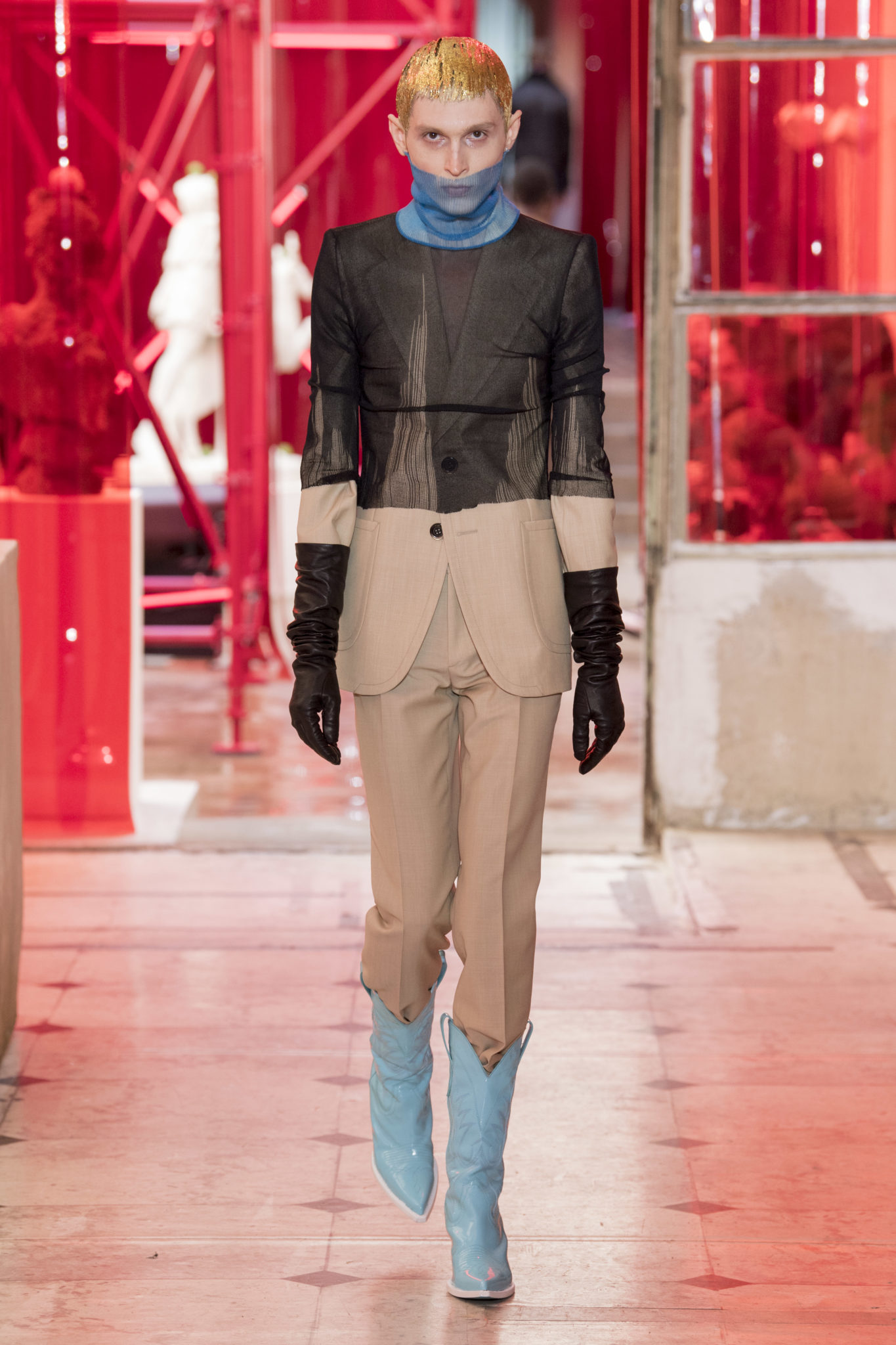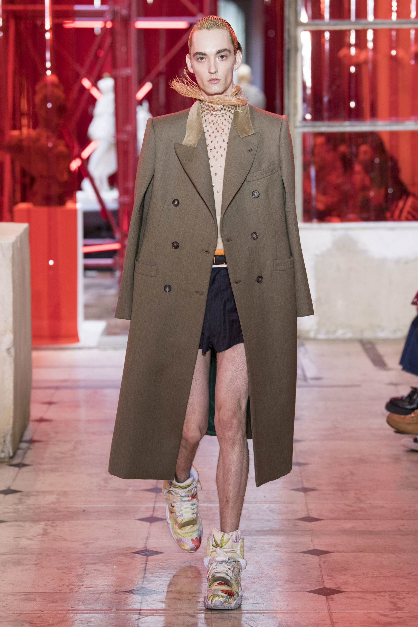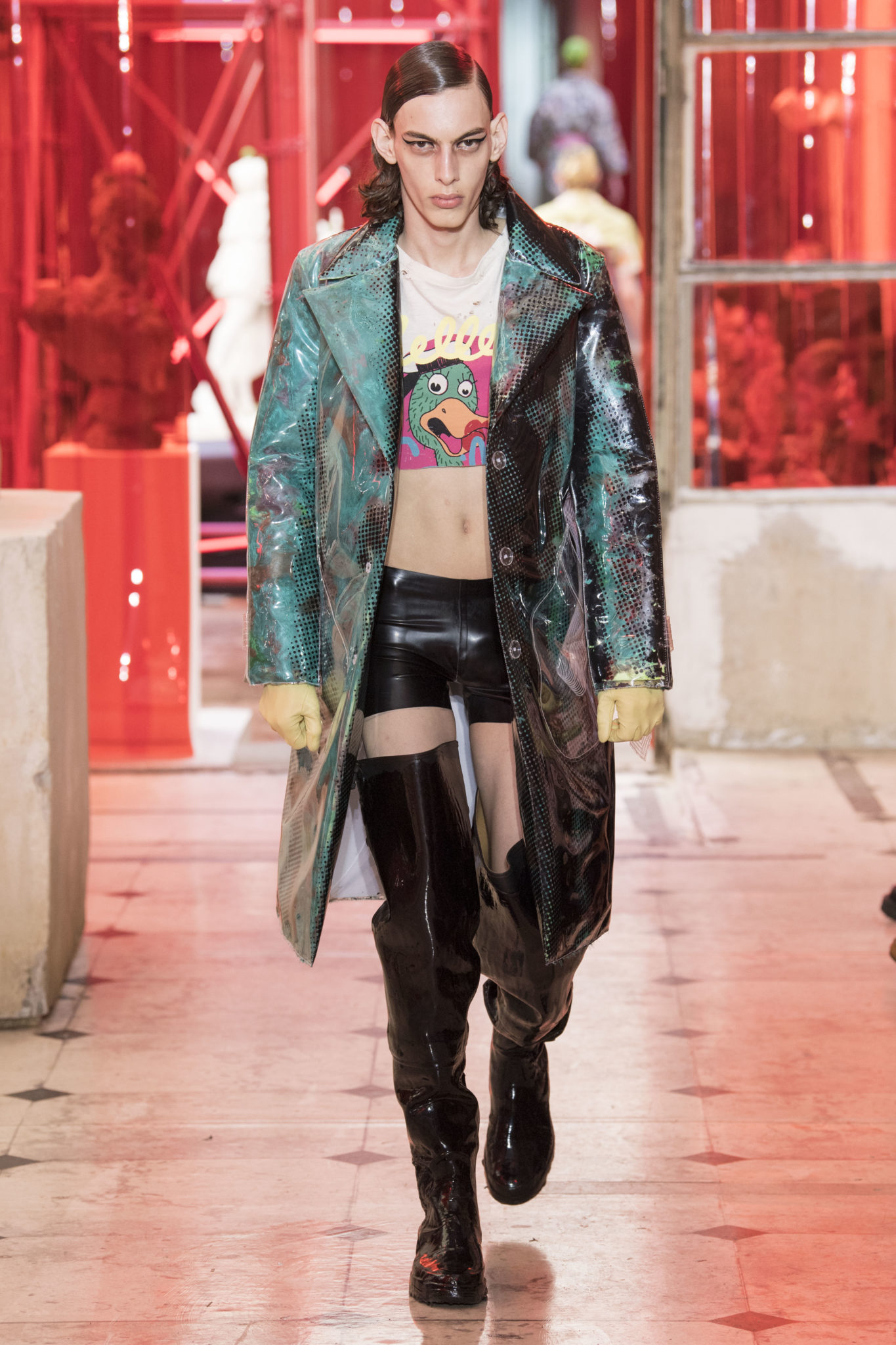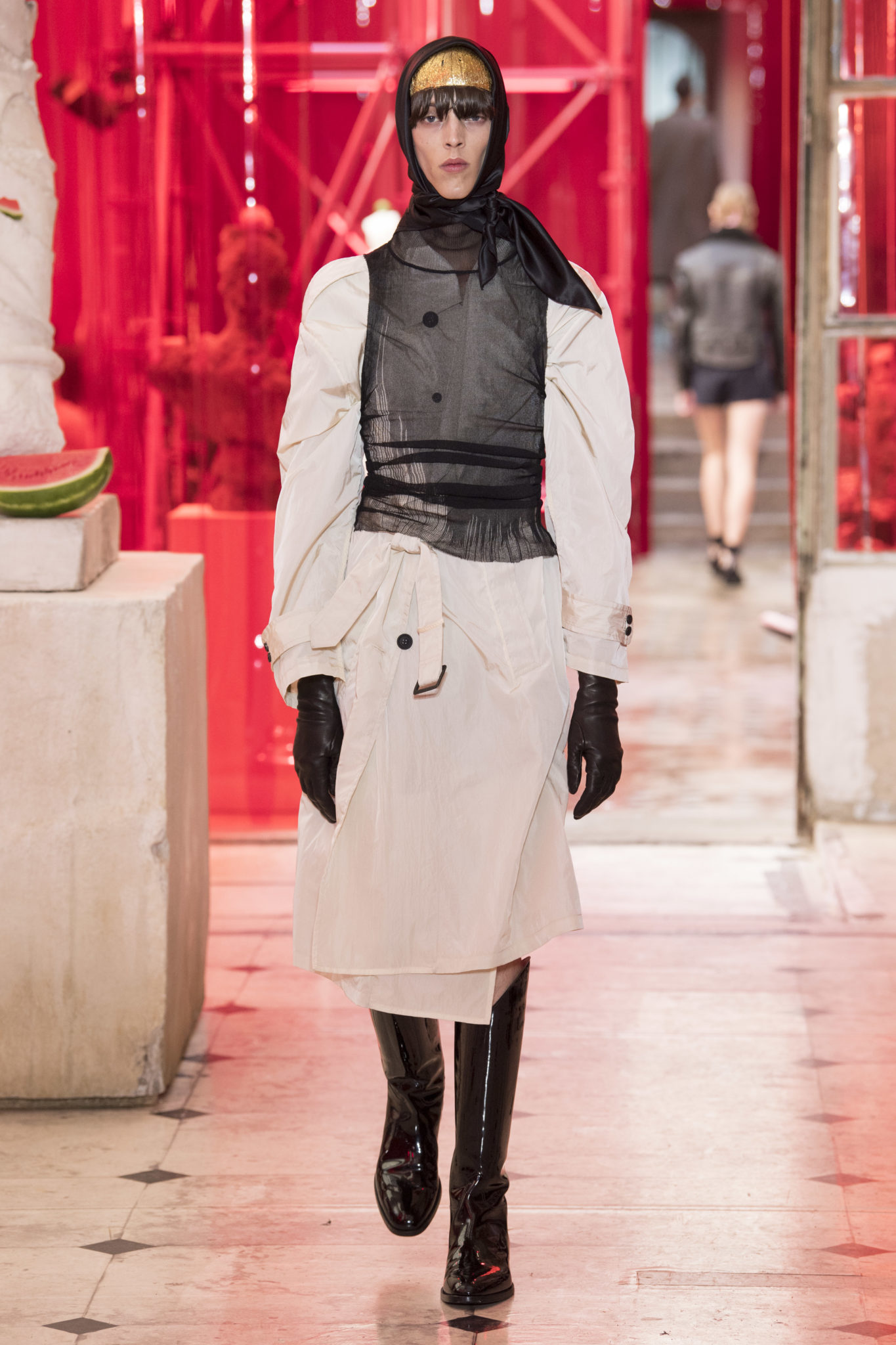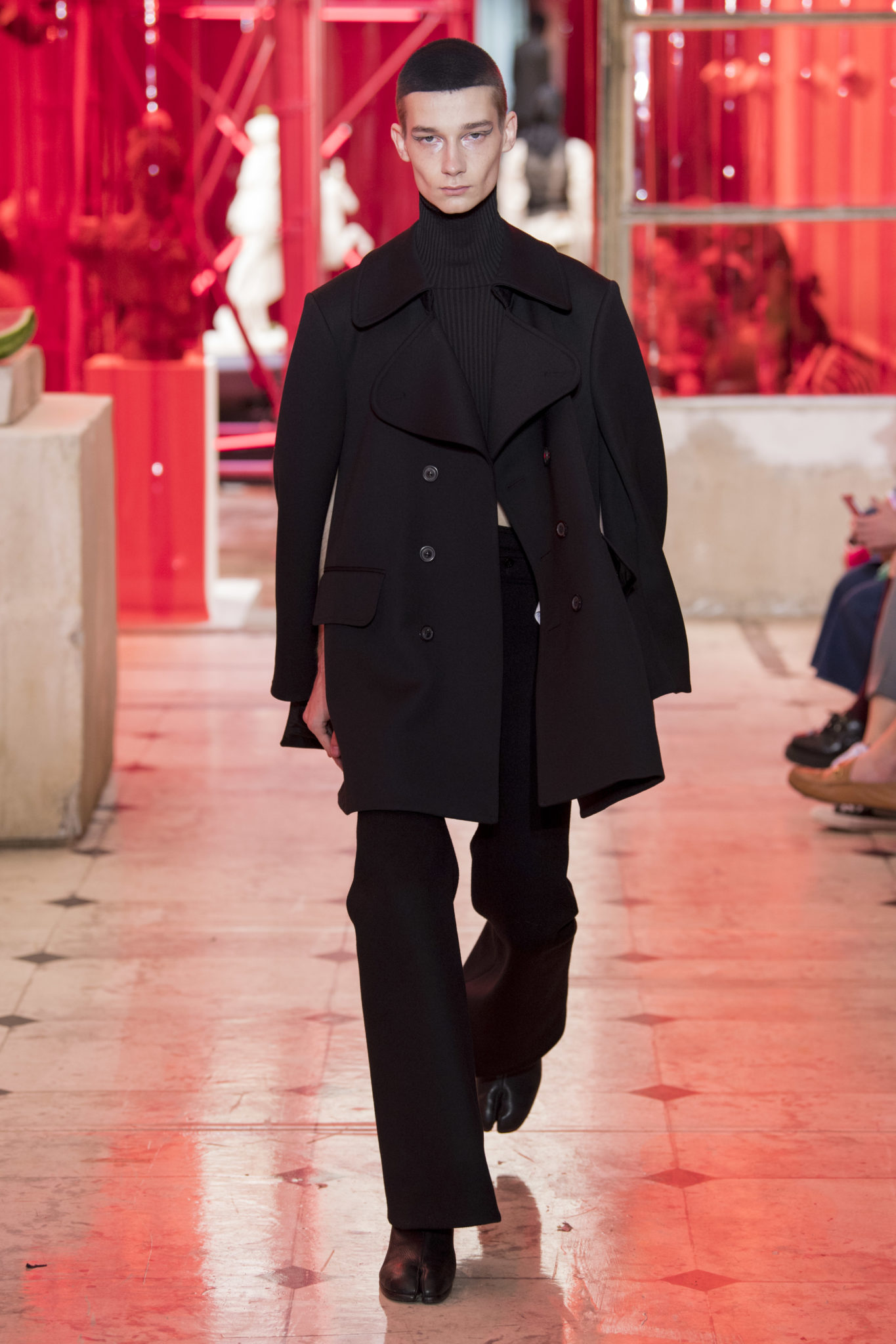 eassessing the future of dressmaking in the men’s wardrobe, Maison Margiela presents its first full Artisanal menswear collection. The show signifies an unrestricted foray onto the territory of haute couture for men in a conversation with a new masculinity in motion. Opening the doors to the deft skills of creative director John Galliano and the 163 rue Saint-Maur ateliers, the presentation is staged as the house works in view. The collection is exclusively bespoke and will inform a men’s ready-to-wear line to be included in a co-ed Spring – Summer 2019 Défilé show in September. Reflecting on the streetwear culture of the current menswear climate, John Galliano exercises his pyramidical approach to creation through an exploration of new values. It is an appreciation of the current evolution of male dress codes, and the desire to take it to unexplored places of craftsmanship for a young generation. The bias-cut – a technique native to the creative language of John Galliano – transforms traditional bespoke tailoring into a mercurial and hyper-modern take on suit-making. Executed in silks and tweeds, bias-cutting generates a harmonious exchange between fabric and body, expressed in a louche and liberating silhouette for an advancing male dress sense. The intricacy, techniques and time inherent to haute couture are applied to traditional ideas of male dress in a transcendence of gender-specific uniforms. It is the experimental proposal of a reimagined sexuality, sensuality and individuality for a new mentality. Rooted in authenticity, garments informed by the wardrobes of formalwear and leisure pursuits undergo a process of repurposing. Original kimonos – some from the eighteenth century – are reconditioned into garments for the contemporary wardrobe. Corsetry, cape cuts in outerwear, and hand-embroidery in surface decoration nod at classic couture codes, whereas rubber and leather moulding reflect a less traditional approach to craftsmanship. The Artisanal show is embedded in expert dressmaking and a new consideration of the tradition of haute couture. Drawing on terminology established in recent Artisanal proposals, notions of relaxed glamour, dressing in haste, appropriating the inappropriate, and dressing in reverse underpin the collection. House techniques such as anonymity of the lining, the memory of, and décortiqué, materialise throughout, honouring and honing the Artisanal identity of Maison Margiela. ‘Through the potential of Artisanal possibilities, conventional dress codes are broken down in a discovery of diverse individualities for a new age of self-expression.’ – Maison Margiela. Materials Authentic fabrications known from classic tailoring and haute couture form the foundation for the collection. Satin-back crêpe and tweed serve as canvases for bias-cutting in tailoring, while wool, twill and leather enter into outerwear. Drawing on the bespoke women’s wardrobe, textiles such as boucle, organza, chiffon, silk, jacquard and fine knit amplify the Artisanal volume, alongside the inevitable couture element of plume. They are contrasted by bold materials in the shape of vinyl, rubber, patent leather, and plastic. Original and antique kimonos are recycled and repurposed into new incarnations, bonded to their own lining. Technique The technique through which creative director John Galliano has historically expressed himself, biascutting is explored in menswear for a languid and dynamic approach to tailoring. Contrary to cutting straight-of-grain, bias-cutting materialises when the material is cut at an angle, allowing the natural elasticity in the fabric to hit the bias. The result is a virile, unparalleled sense of movement and a feeling of non-constriction. Recycled kimonos are deconstructed thread by thread, bonded to their own lining and transformed into new garments. Outerwear is cut like capes, evoking an unmistakable haute couture shape. Outdoor wardrobe staples are shrunken and transformed into shirts. Plume is encased in painted plastic. Hand-embroidery and hand-beading further cement the Artisanal prowess of the collection. Employing recently established house techniques, décortiqué appears when a garment or accessory is reduced to its structural core, while anonymity of the lining signifies the revelation of garment constructions traditionally concealed. The memory of illustrates the impression of a familiar motif in a garment. Dressing in haste is evoked by the gesticular encasing of outfits in fine silk knit tops, and dressing in reverse is the repurposing of garment layers traditionally assigned a certain function. Palette Black, white and off-white set the authentic tones for the collection. They come alive alongside red, pink and turquoise, backed up by motifs from kimonos and leopard, as well as vintage and animated prints. Finally, gold and silver serve as a manifestation of the high dressmaking embodied by the Artisanal collection. Accessories The techniques of haute couture inform hand-worked jewellery constructed from hand-made materials. Custom designed embroideries are created in a meeting between leisure pursuits and techno. Painstaking beadwork such as ladylike pearl necklaces, also native to haute couture, are embellished with blood drops made of tiny beads and resin paint. A décortiqué hat evokes codes from the hunting wardrobe, while high-shine leather belts with sportswear clasps echo an idea of the staple accessory. Launched last year, the Glam Slam bag appears colour-coded to the collection. Formal men’s shoes, Santiago boots and Tabi boots feature in décortiqué editions. The Artisanal men’s trainer makes its debut, in rubber, hand-embroidery and recycled original kimono fabric.
