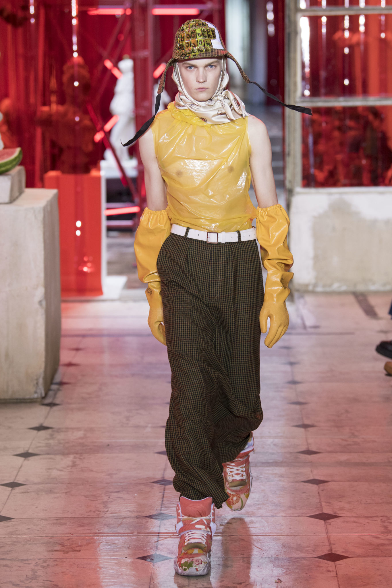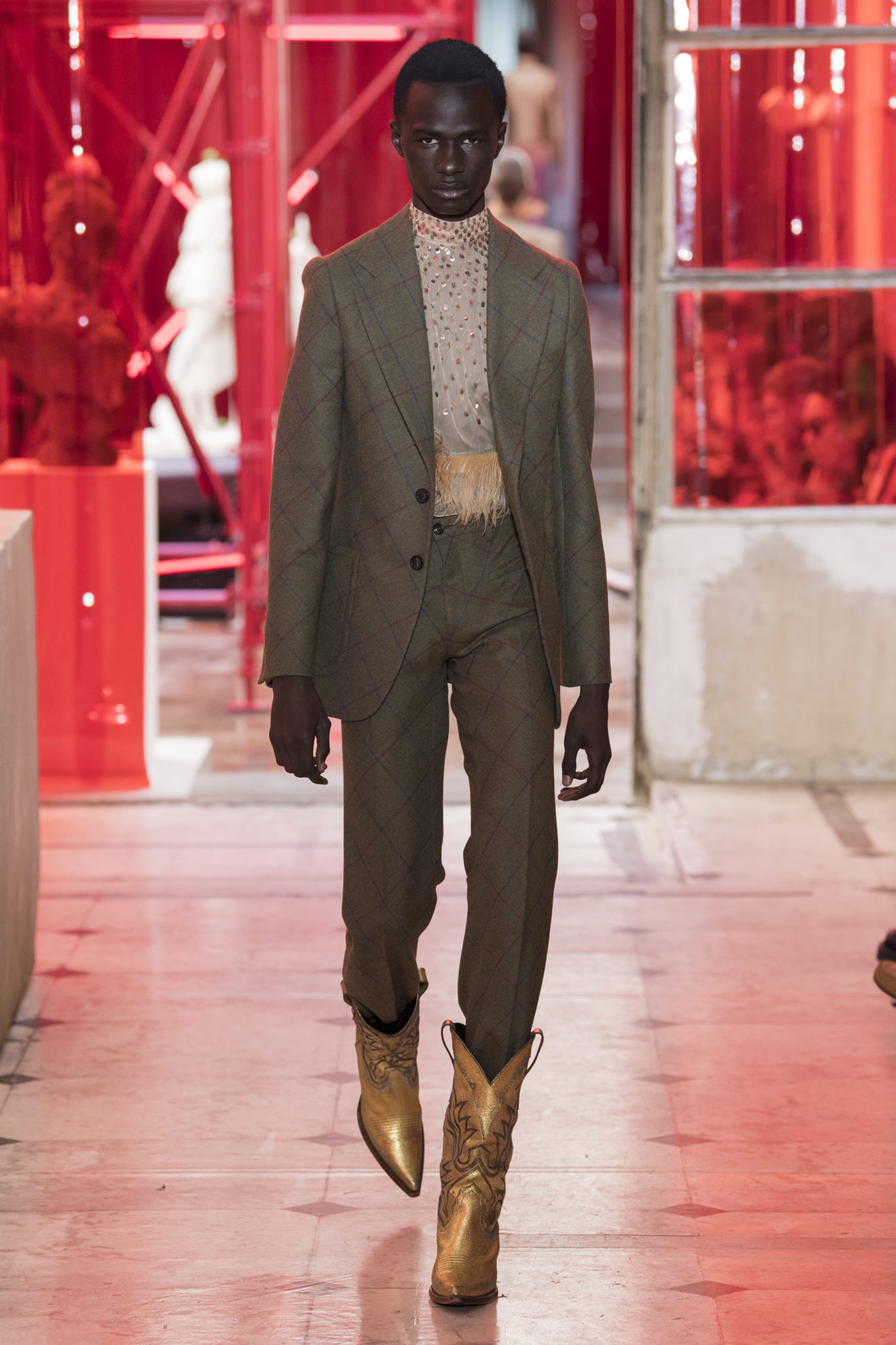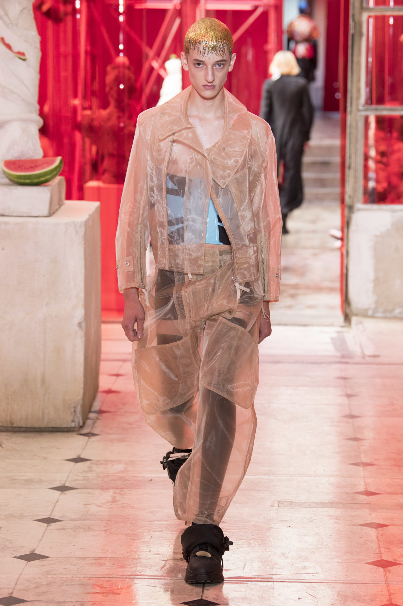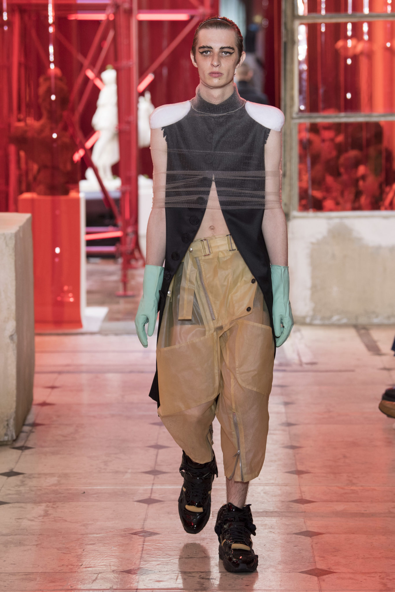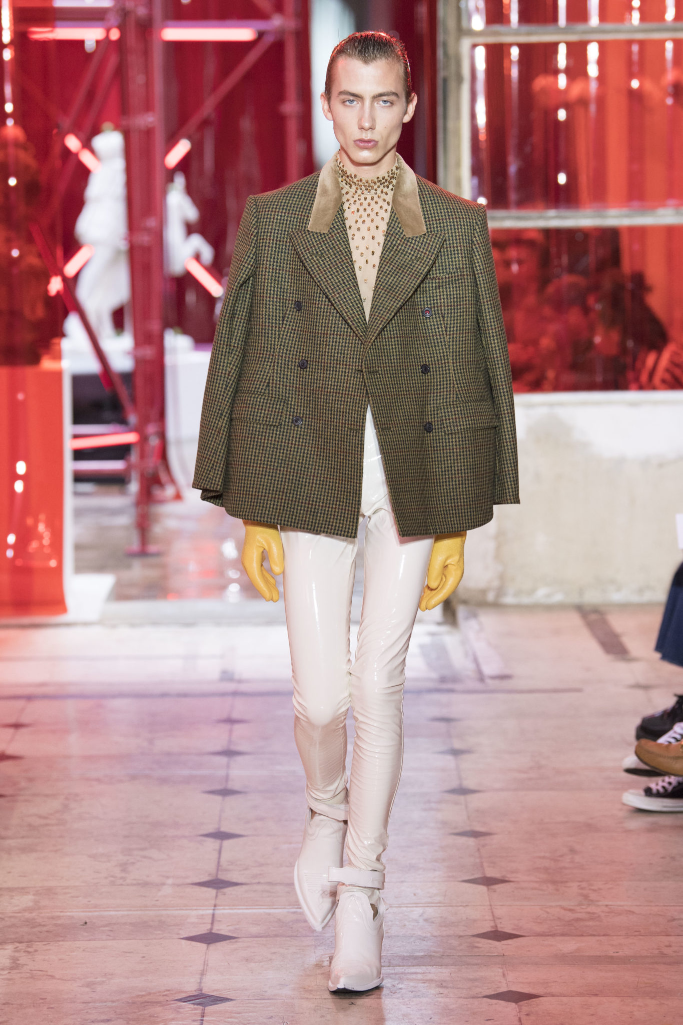 eassessing the future of dressmaking in the men’s wardrobe, Maison Margiela presents its first full Artisanal menswear collection. The show signifies an unrestricted foray onto the territory of haute couture for men in a conversation with a new masculinity in motion. Opening the doors to the deft skills of creative director John Galliano and the 163 rue Saint-Maur ateliers, the presentation is staged as the house works in view. The collection is exclusively bespoke and will inform a men’s ready-to-wear line to be included in a co-ed Spring – Summer 2019 Défilé show in September. Reflecting on the streetwear culture of the current menswear climate, John Galliano exercises his pyramidical approach to creation through an exploration of new values. It is an appreciation of the current evolution of male dress codes, and the desire to take it to unexplored places of craftsmanship for a young generation. The bias-cut – a technique native to the creative language of John Galliano – transforms traditional bespoke tailoring into a mercurial and hyper-modern take on suit-making. Executed in silks and tweeds, bias-cutting generates a harmonious exchange between fabric and body, expressed in a louche and liberating silhouette for an advancing male dress sense. The intricacy, techniques and time inherent to haute couture are applied to traditional ideas of male dress in a transcendence of gender-specific uniforms. It is the experimental proposal of a reimagined sexuality, sensuality and individuality for a new mentality. Rooted in authenticity, garments informed by the wardrobes of formalwear and leisure pursuits undergo a process of repurposing. Original kimonos – some from the eighteenth century – are reconditioned into garments for the contemporary wardrobe. Corsetry, cape cuts in outerwear, and hand-embroidery in surface decoration nod at classic couture codes, whereas rubber and leather moulding reflect a less traditional approach to craftsmanship. The Artisanal show is embedded in expert dressmaking and a new consideration of the tradition of haute couture. Drawing on terminology established in recent Artisanal proposals, notions of relaxed glamour, dressing in haste, appropriating the inappropriate, and dressing in reverse underpin the collection. House techniques such as anonymity of the lining, the memory of, and décortiqué, materialise throughout, honouring and honing the Artisanal identity of Maison Margiela. ‘Through the potential of Artisanal possibilities, conventional dress codes are broken down in a discovery of diverse individualities for a new age of self-expression.’ – Maison Margiela. Materials Authentic fabrications known from classic tailoring and haute couture form the foundation for the collection. Satin-back crêpe and tweed serve as canvases for bias-cutting in tailoring, while wool, twill and leather enter into outerwear. Drawing on the bespoke women’s wardrobe, textiles such as boucle, organza, chiffon, silk, jacquard and fine knit amplify the Artisanal volume, alongside the inevitable couture element of plume. They are contrasted by bold materials in the shape of vinyl, rubber, patent leather, and plastic. Original and antique kimonos are recycled and repurposed into new incarnations, bonded to their own lining. Technique The technique through which creative director John Galliano has historically expressed himself, biascutting is explored in menswear for a languid and dynamic approach to tailoring. Contrary to cutting straight-of-grain, bias-cutting materialises when the material is cut at an angle, allowing the natural elasticity in the fabric to hit the bias. The result is a virile, unparalleled sense of movement and a feeling of non-constriction. Recycled kimonos are deconstructed thread by thread, bonded to their own lining and transformed into new garments. Outerwear is cut like capes, evoking an unmistakable haute couture shape. Outdoor wardrobe staples are shrunken and transformed into shirts. Plume is encased in painted plastic. Hand-embroidery and hand-beading further cement the Artisanal prowess of the collection. Employing recently established house techniques, décortiqué appears when a garment or accessory is reduced to its structural core, while anonymity of the lining signifies the revelation of garment constructions traditionally concealed. The memory of illustrates the impression of a familiar motif in a garment. Dressing in haste is evoked by the gesticular encasing of outfits in fine silk knit tops, and dressing in reverse is the repurposing of garment layers traditionally assigned a certain function. Palette Black, white and off-white set the authentic tones for the collection. They come alive alongside red, pink and turquoise, backed up by motifs from kimonos and leopard, as well as vintage and animated prints. Finally, gold and silver serve as a manifestation of the high dressmaking embodied by the Artisanal collection. Accessories The techniques of haute couture inform hand-worked jewellery constructed from hand-made materials. Custom designed embroideries are created in a meeting between leisure pursuits and techno. Painstaking beadwork such as ladylike pearl necklaces, also native to haute couture, are embellished with blood drops made of tiny beads and resin paint. A décortiqué hat evokes codes from the hunting wardrobe, while high-shine leather belts with sportswear clasps echo an idea of the staple accessory. Launched last year, the Glam Slam bag appears colour-coded to the collection. Formal men’s shoes, Santiago boots and Tabi boots feature in décortiqué editions. The Artisanal men’s trainer makes its debut, in rubber, hand-embroidery and recycled original kimono fabric.