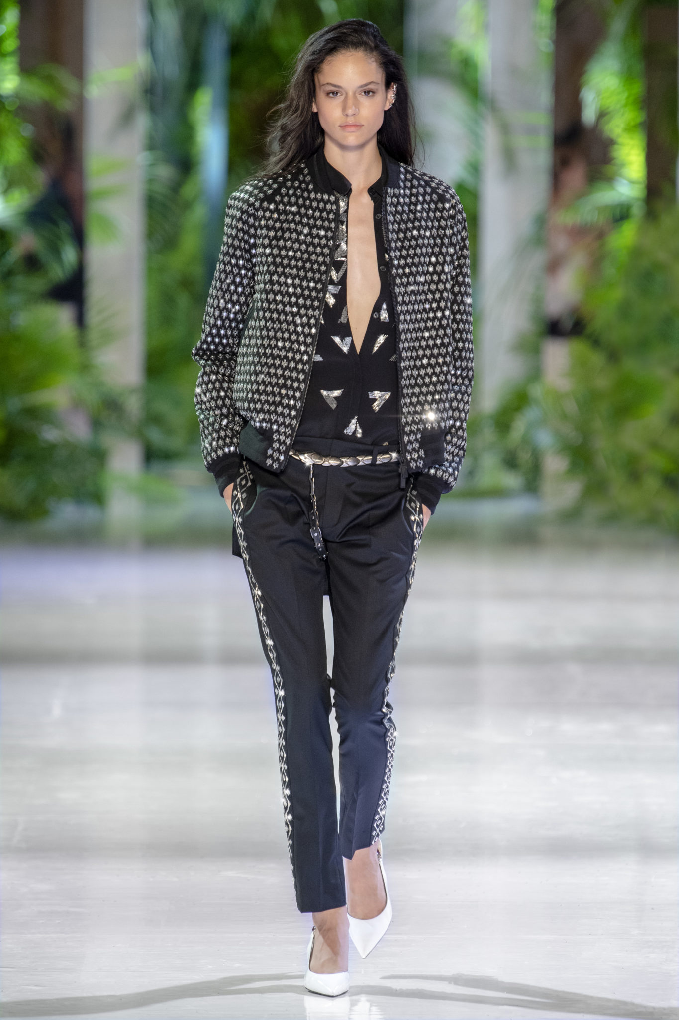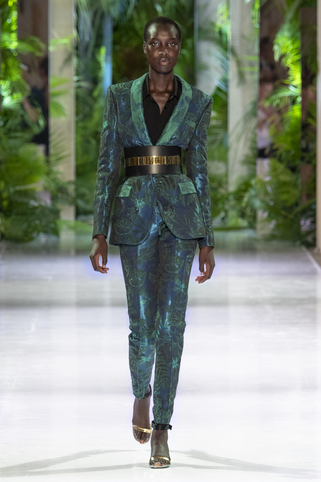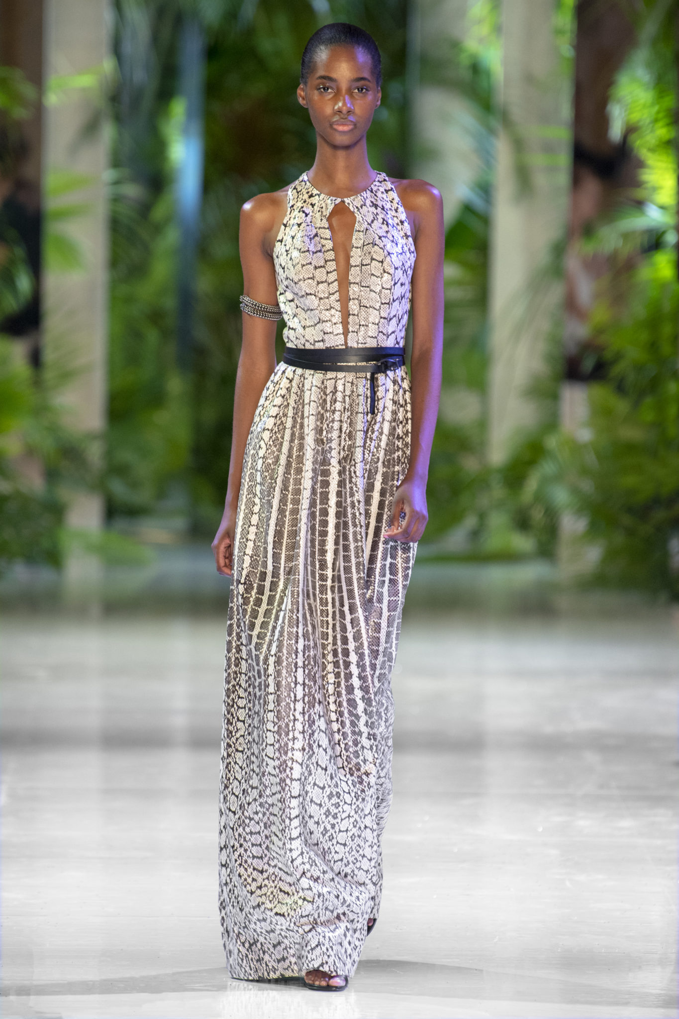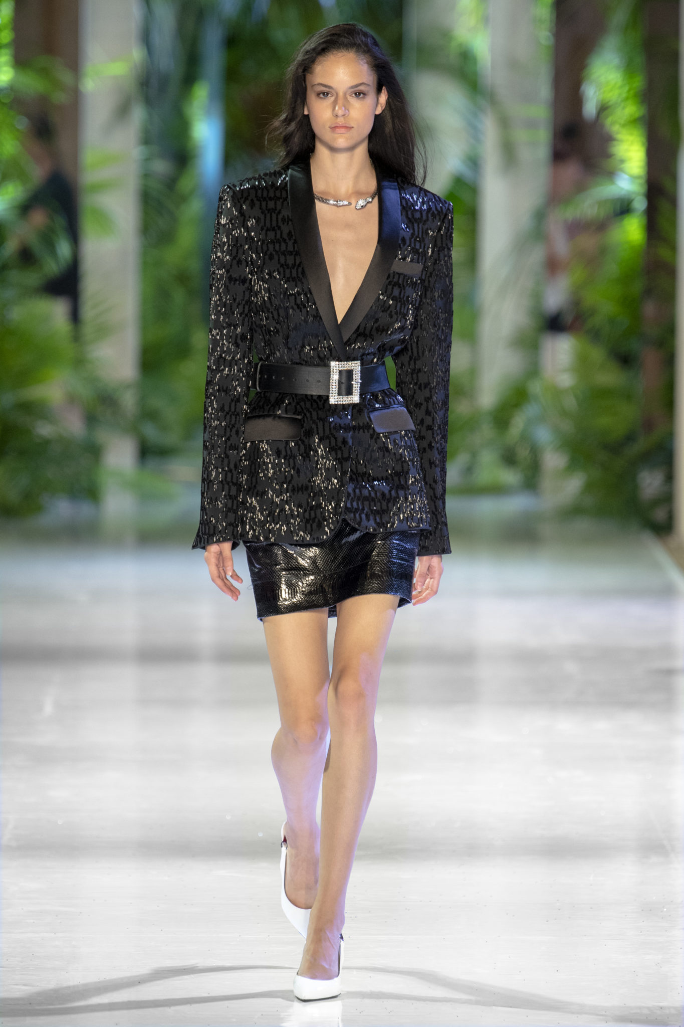 animaliers d’inspiration tropicale viennent compléter les looks: la texture métallique des ceintures est retravaillée façon python. Les colliers prennent la forme de serpents. Et les bijoux qui viennent envelopper l’oreille se superposent à des boucles d’oreilles aux longues franges, ajoutant une touche d’exubérance à la collection.