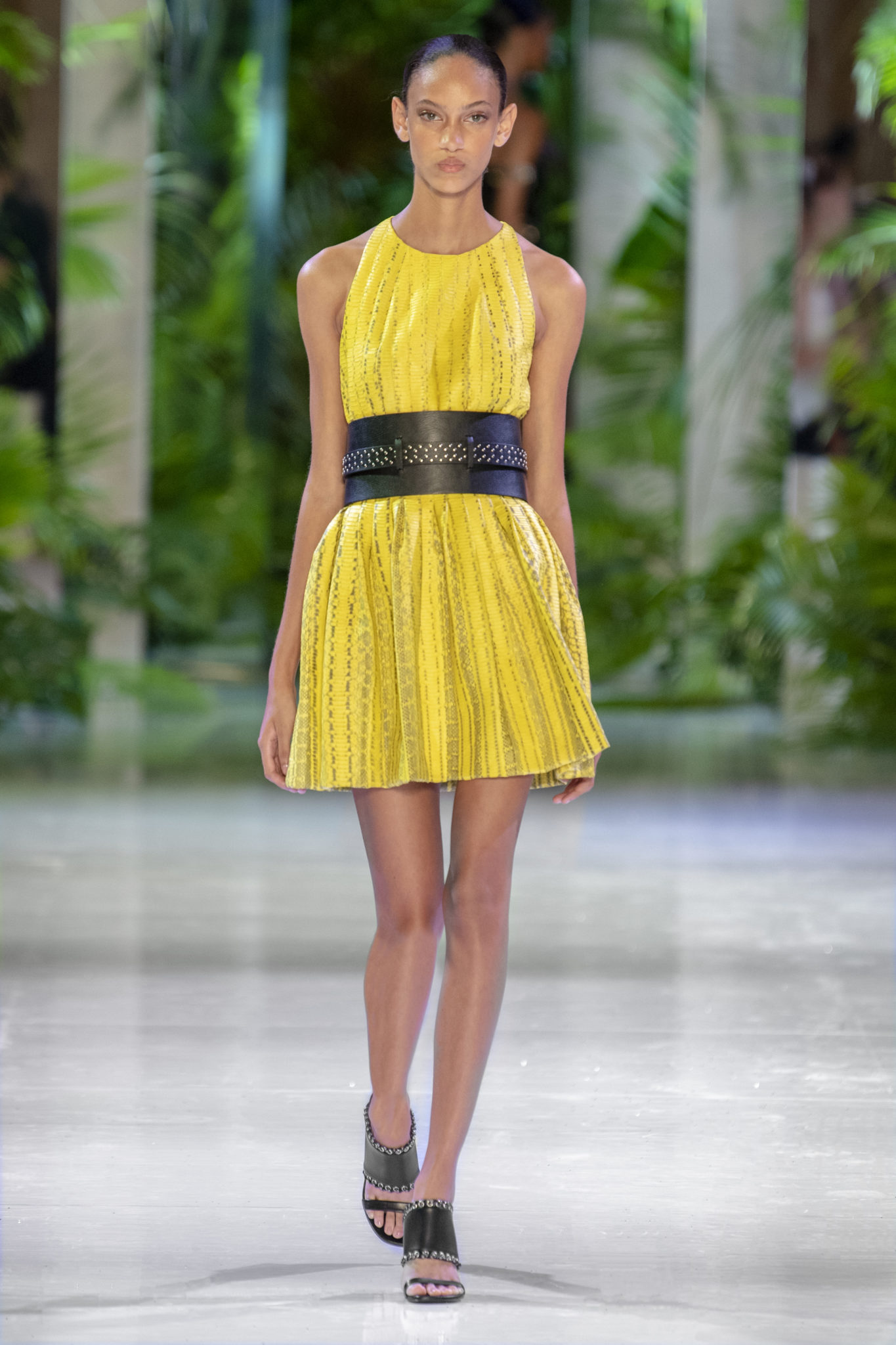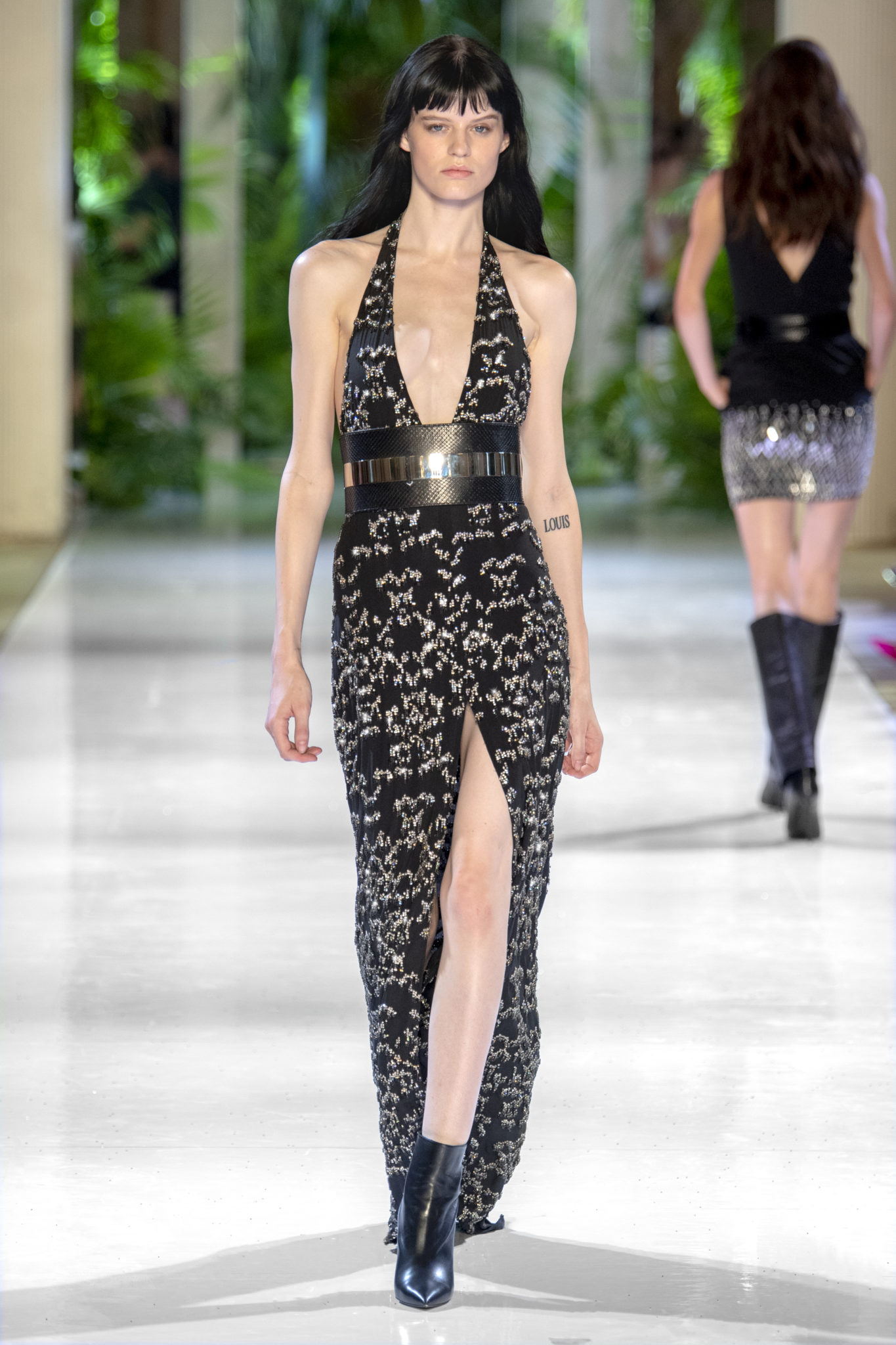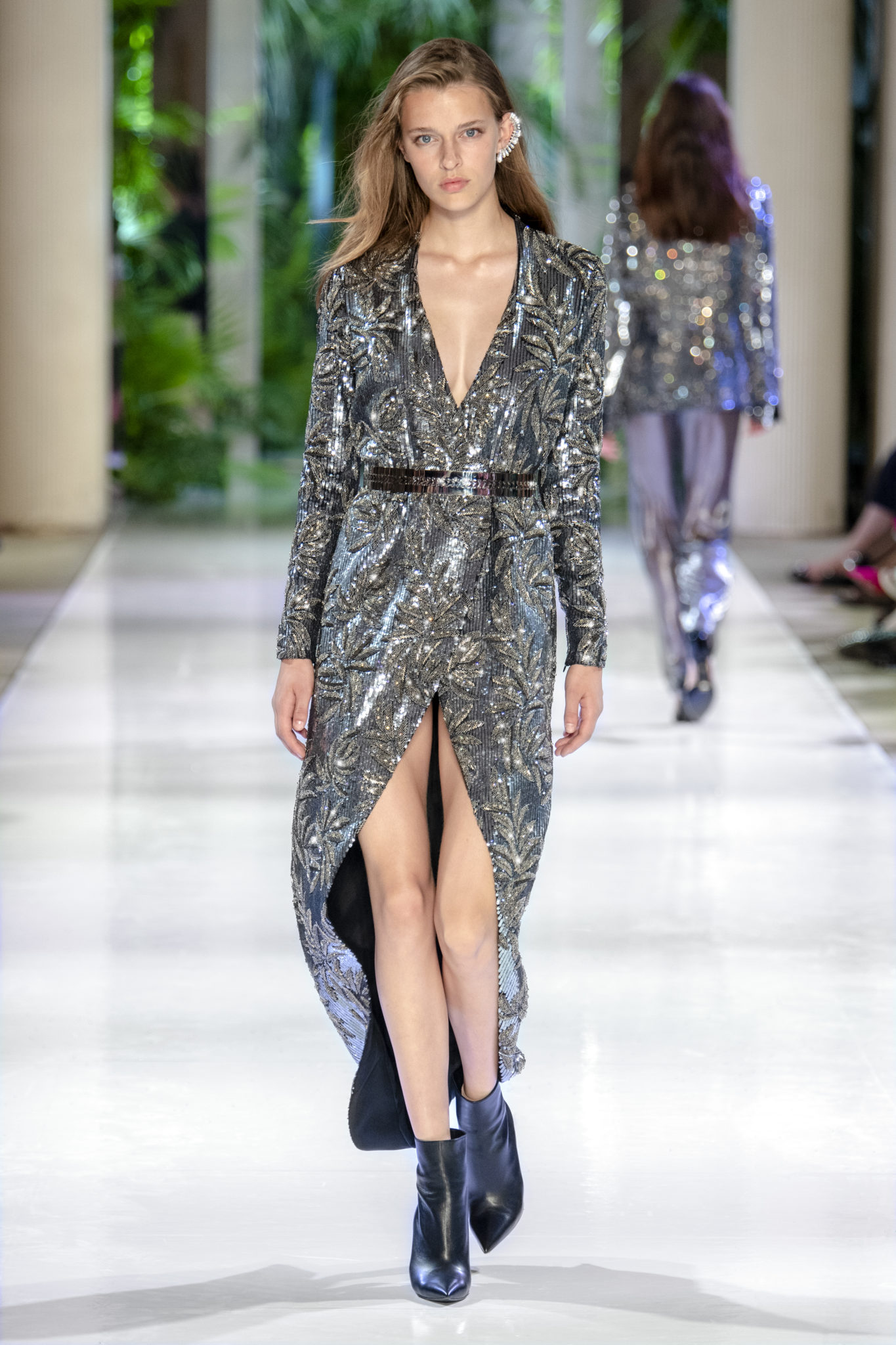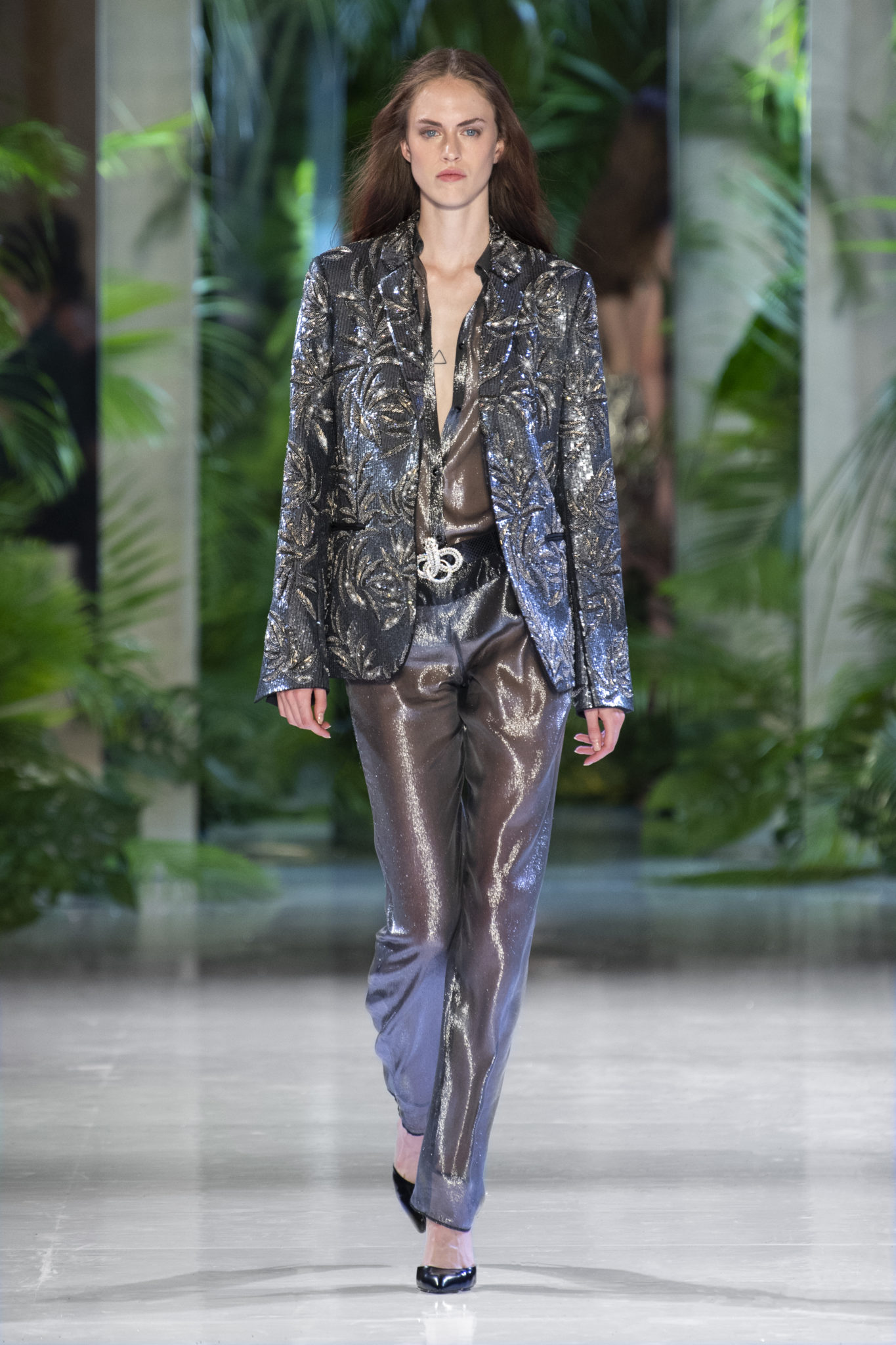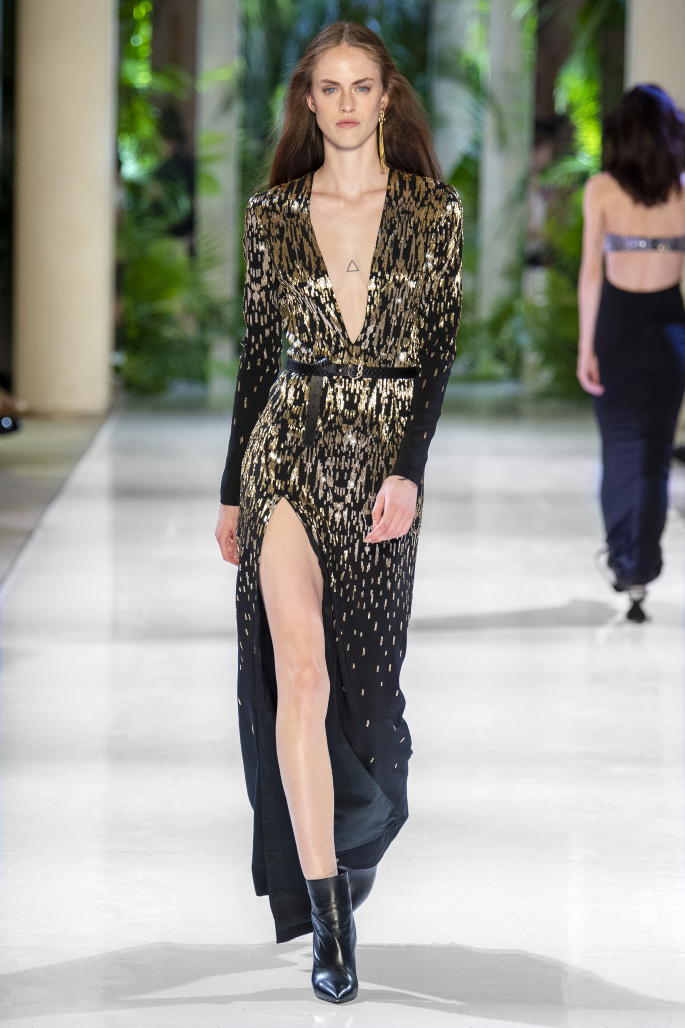 animaliers d’inspiration tropicale viennent compléter les looks: la texture métallique des ceintures est retravaillée façon python. Les colliers prennent la forme de serpents. Et les bijoux qui viennent envelopper l’oreille se superposent à des boucles d’oreilles aux longues franges, ajoutant une touche d’exubérance à la collection.