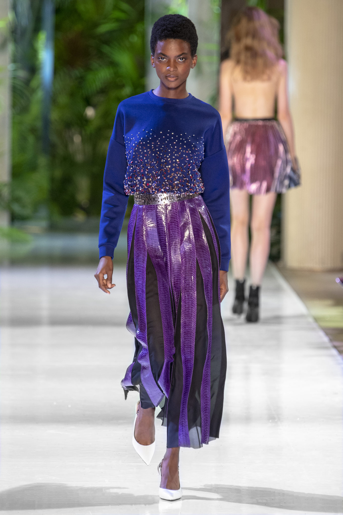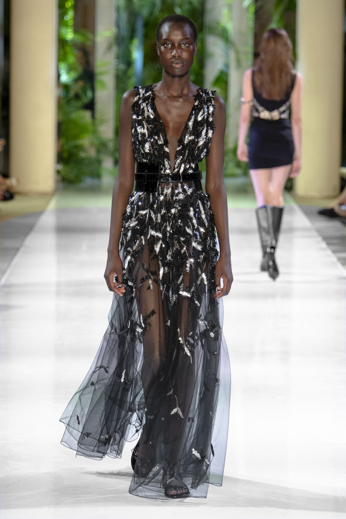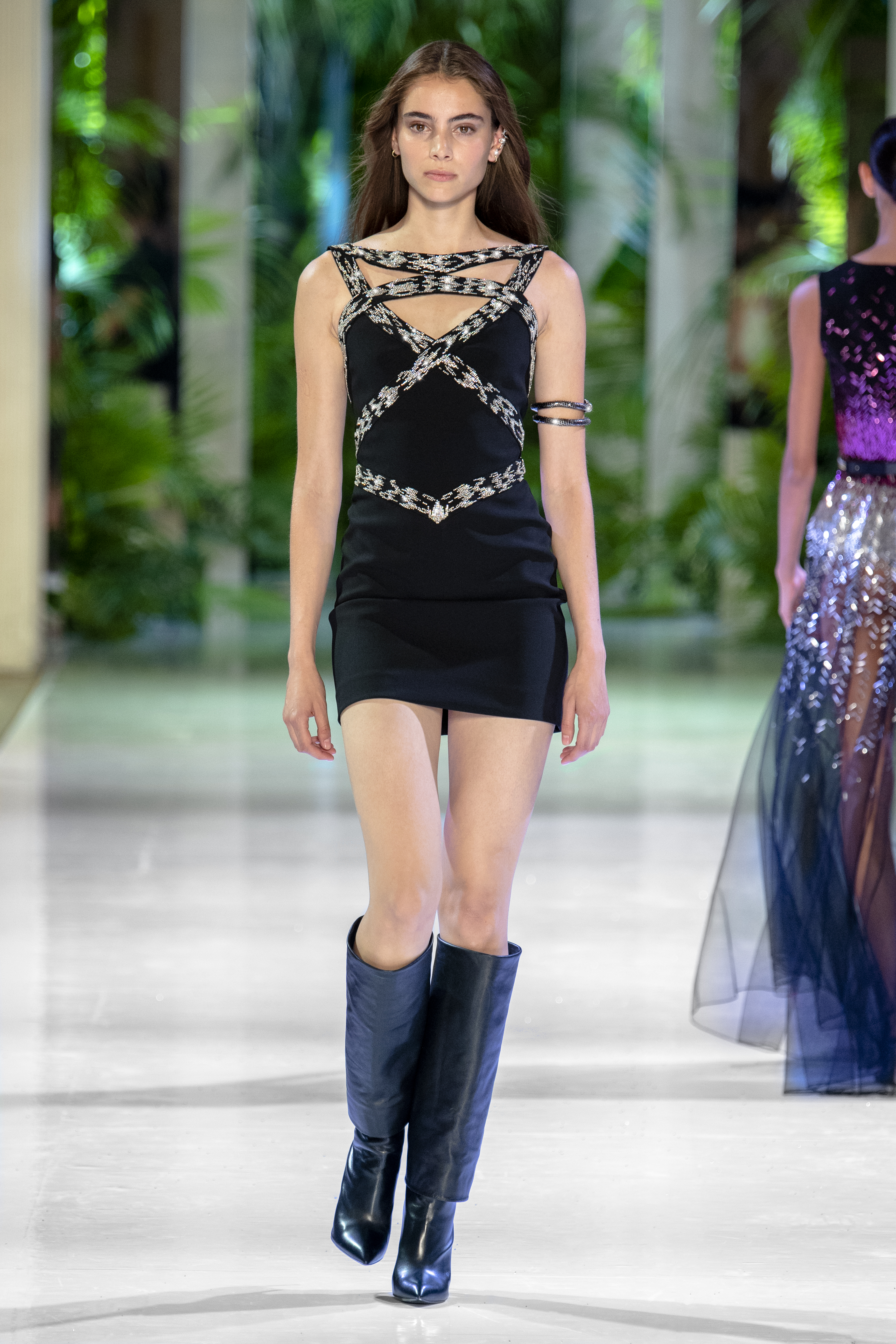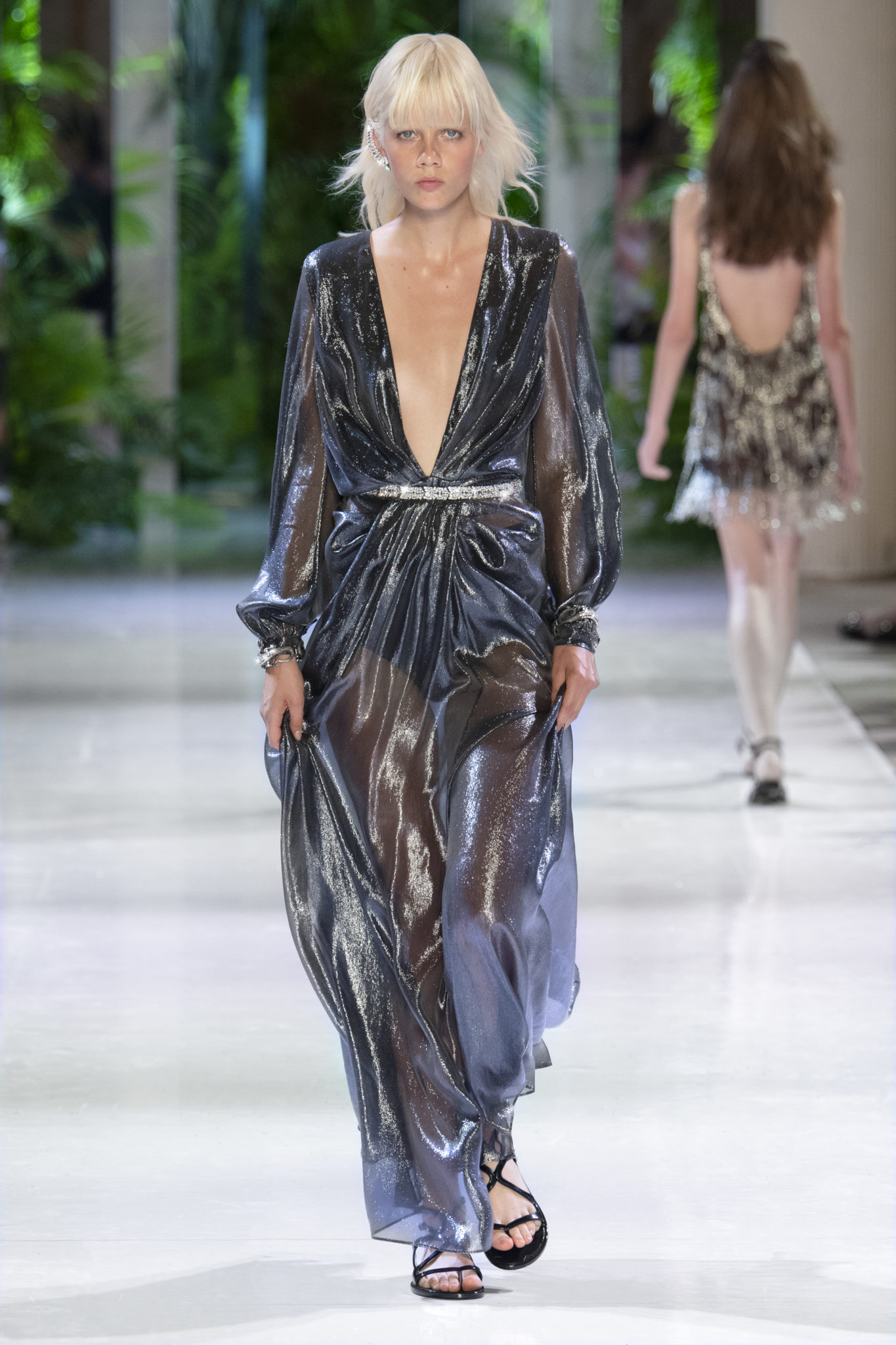 animaliers d’inspiration tropicale viennent compléter les looks: la texture métallique des ceintures est retravaillée façon python. Les colliers prennent la forme de serpents. Et les bijoux qui viennent envelopper l’oreille se superposent à des boucles d’oreilles aux longues franges, ajoutant une touche d’exubérance à la collection.