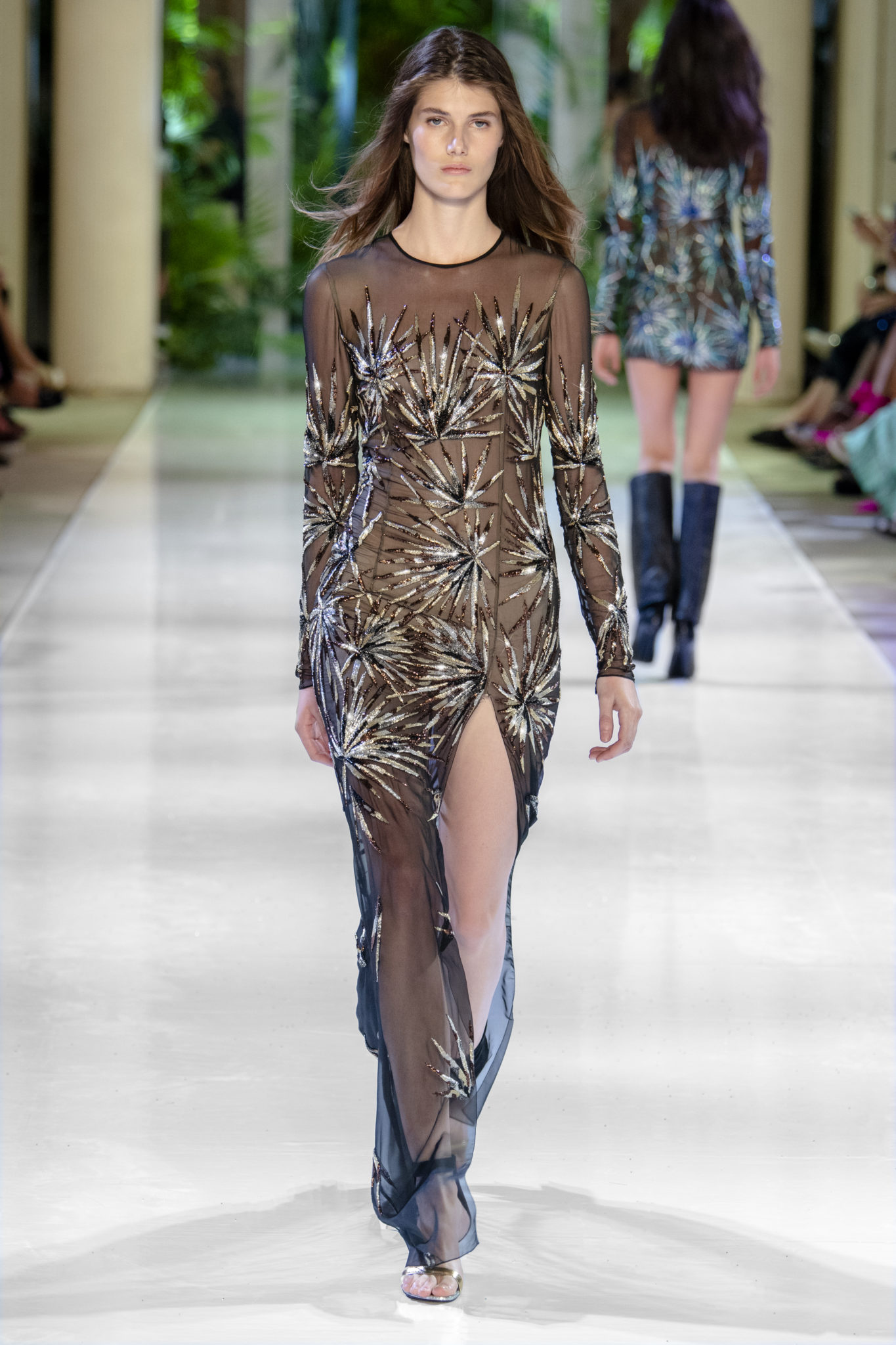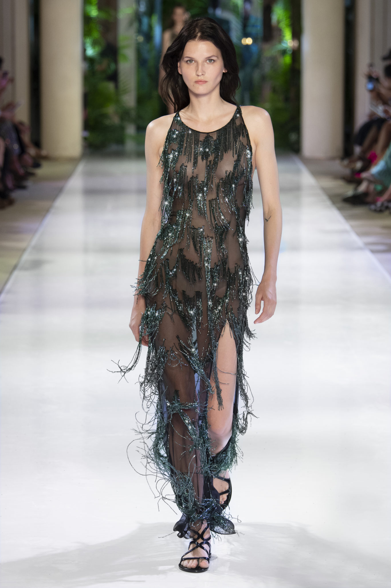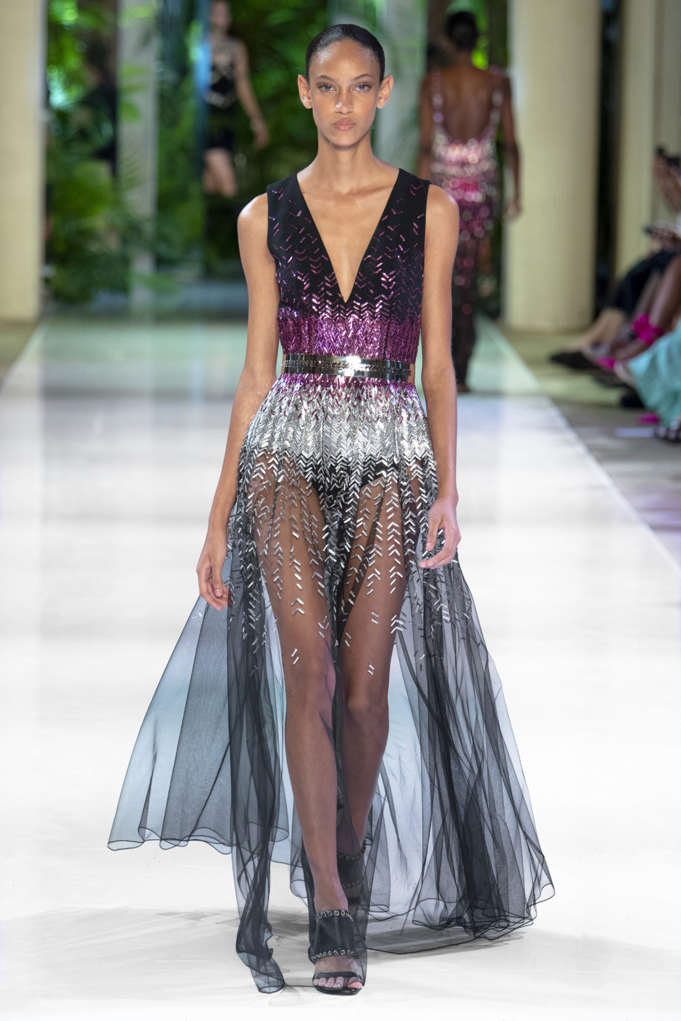 Plissés, broderies, chaînes, transparences et lurex: les classiques du savoir-faire Azzaro se métissent avec des peaux de