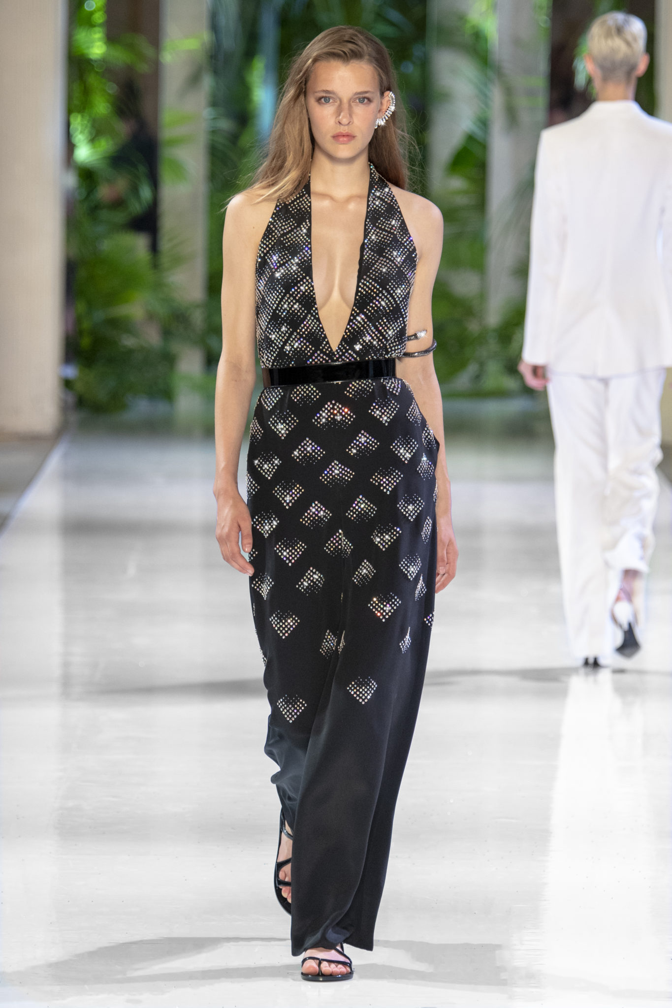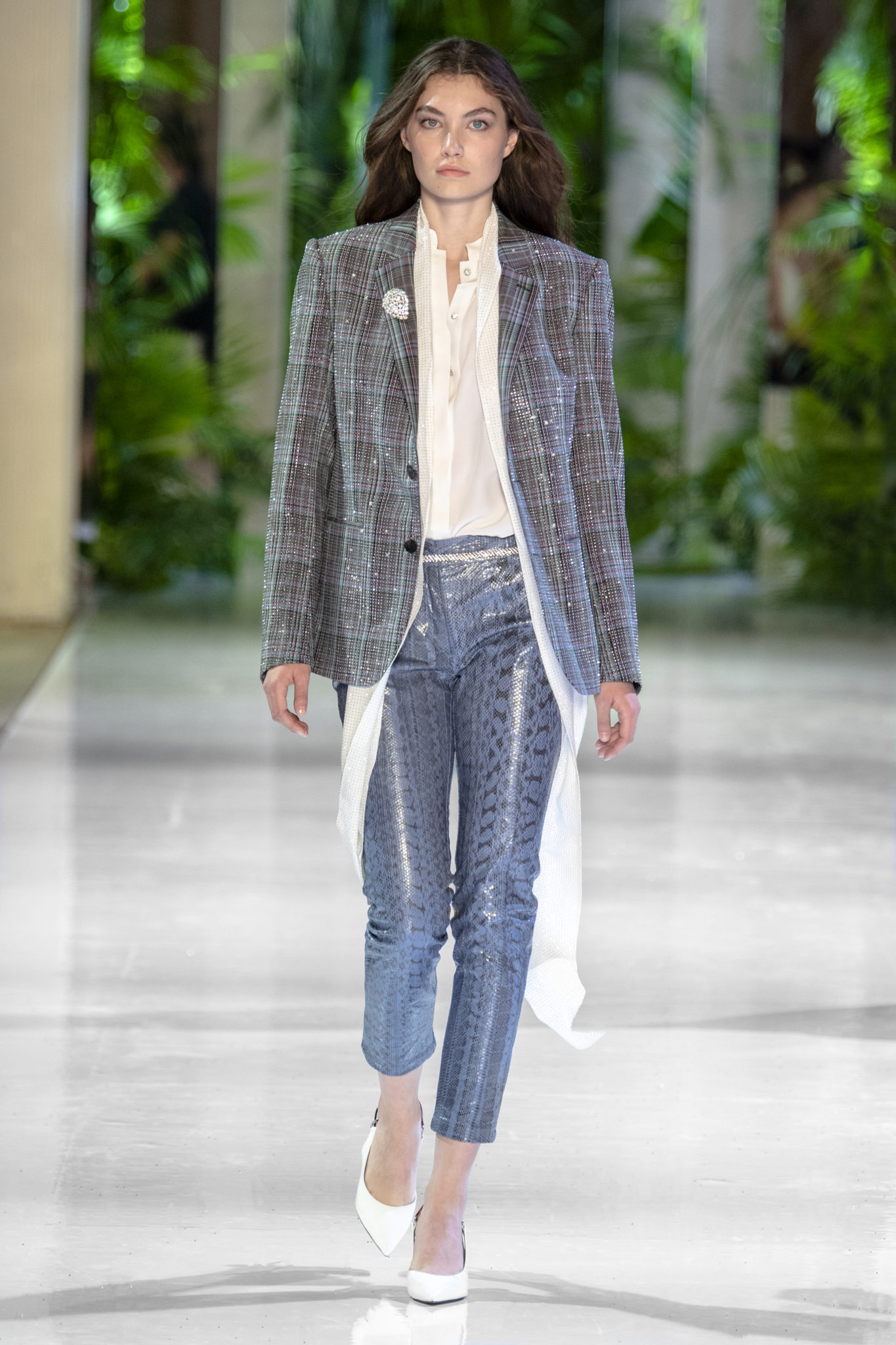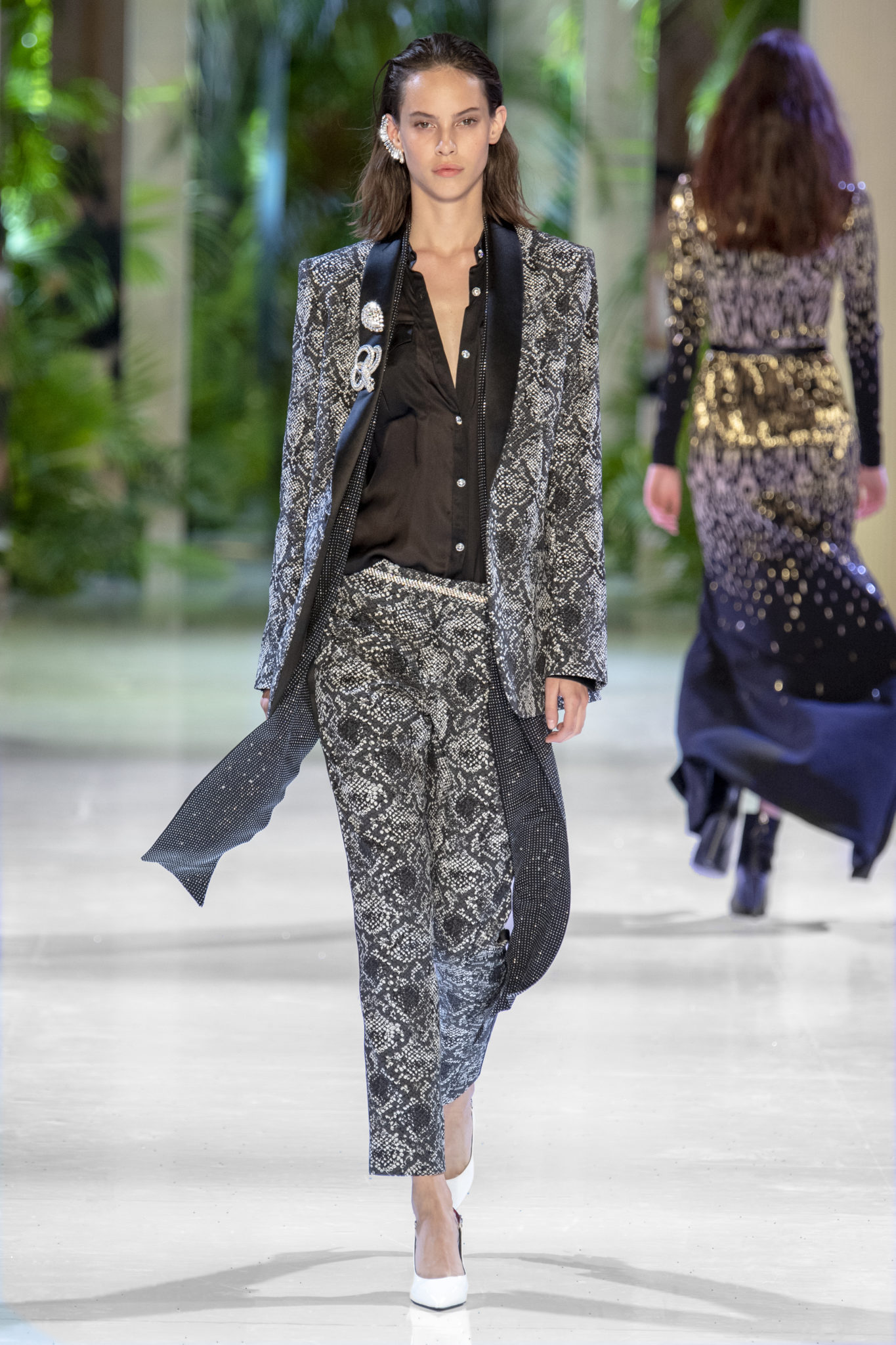 robe masculine se mêlent à des pièces féminines pour un chic tomboy et une allure désinvolte. Un blazer à carreaux délicatement brodé de strass s’associe à un jean en python bleu-gris; un costume jacquard de palmiers devient une arme de séduction lorsqu’il est ceinturé; un smoking orné de strass monochrome scintille.