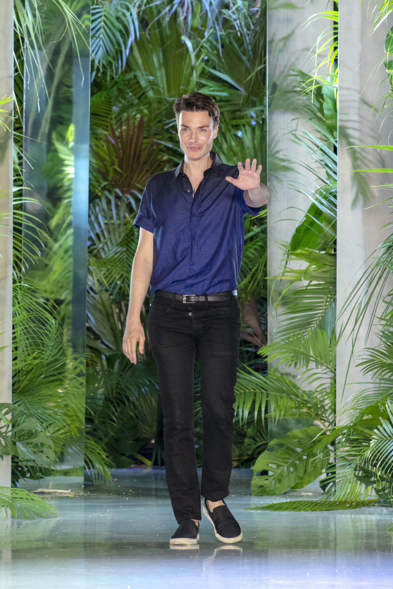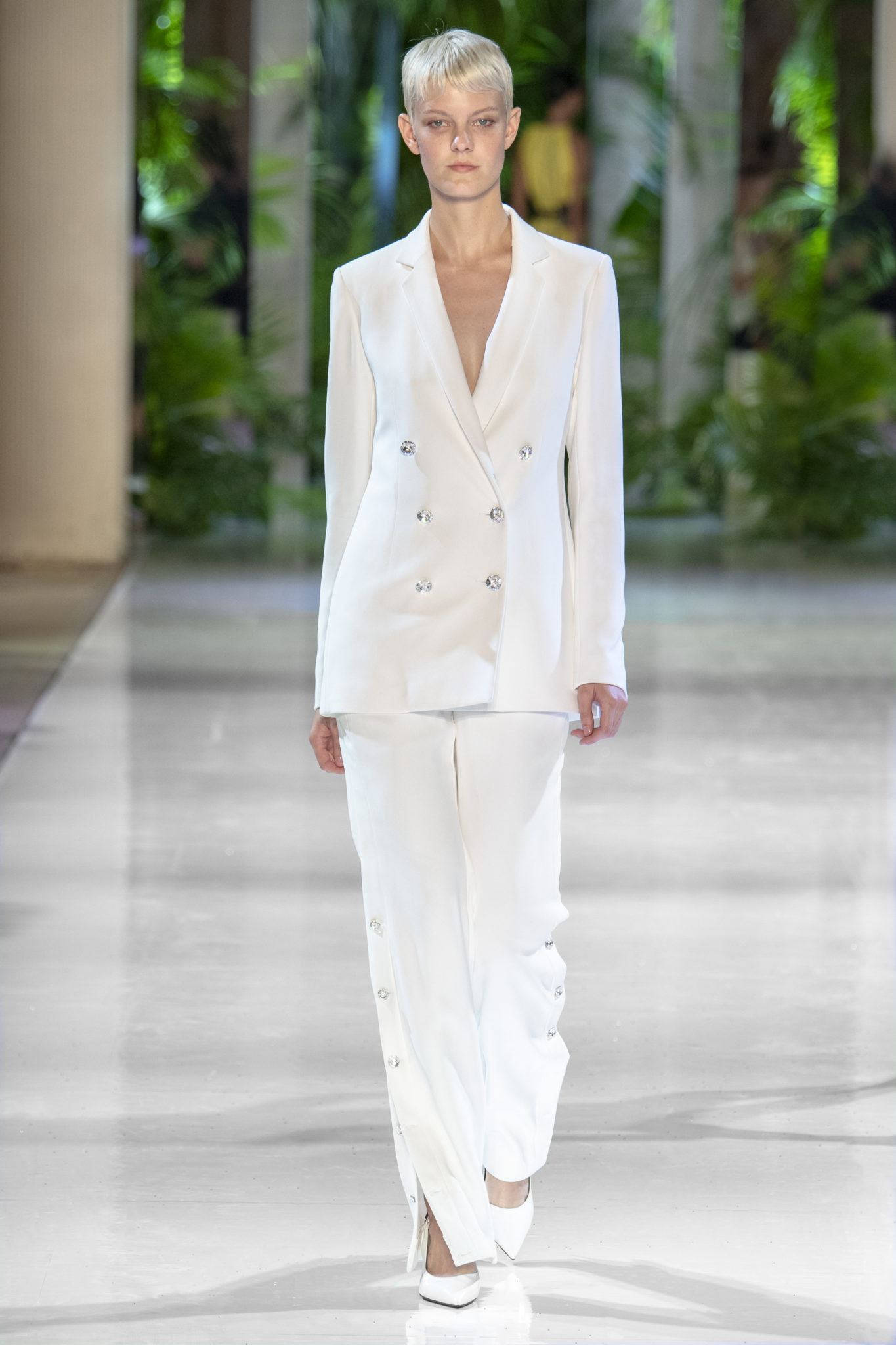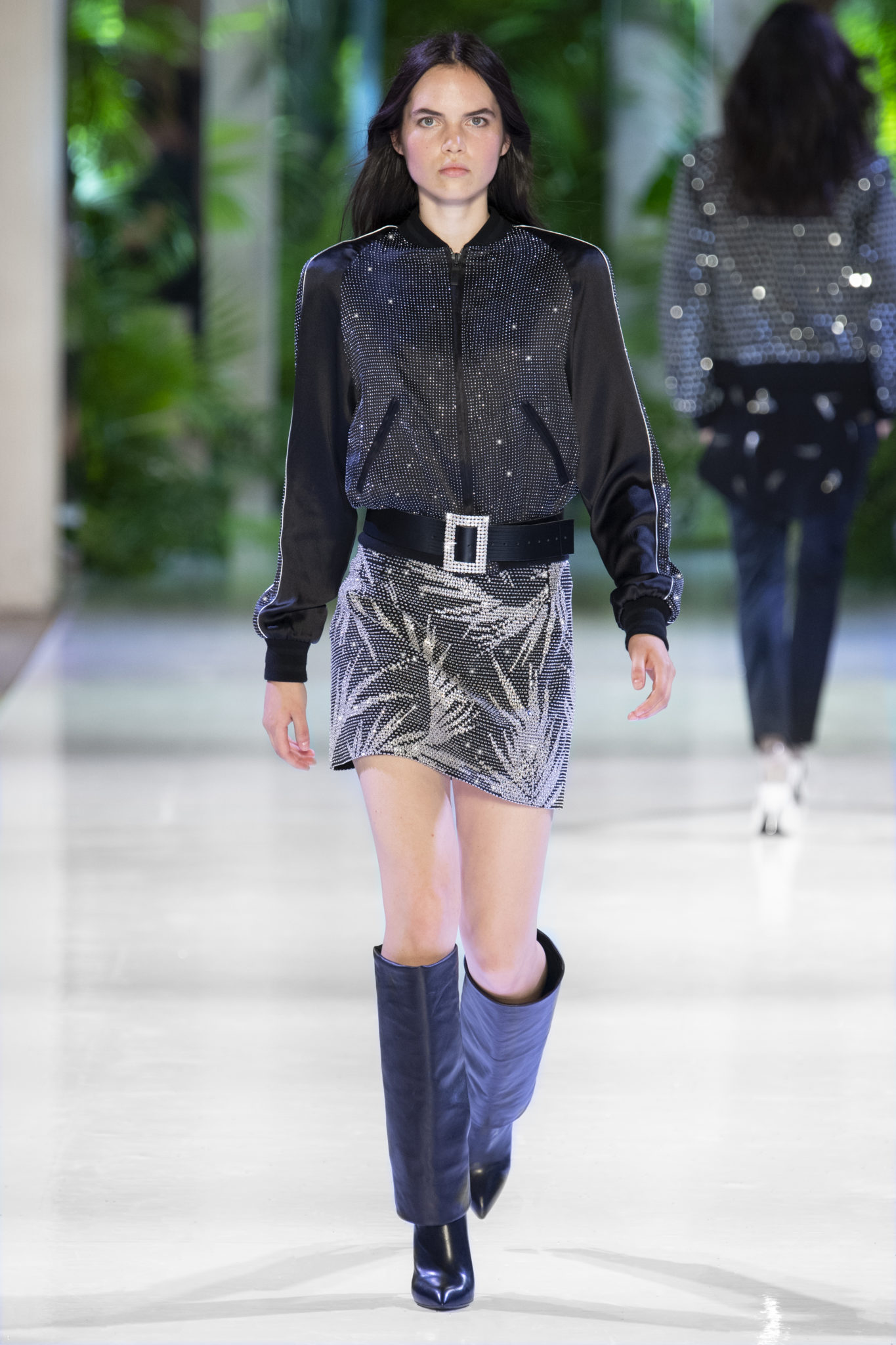 robe masculine se mêlent à des pièces féminines pour un chic tomboy et une allure désinvolte. Un blazer à carreaux délicatement brodé de strass s’associe à un jean en python bleu-gris; un costume jacquard de palmiers devient une arme de séduction lorsqu’il est ceinturé; un smoking orné de strass monochrome scintille.