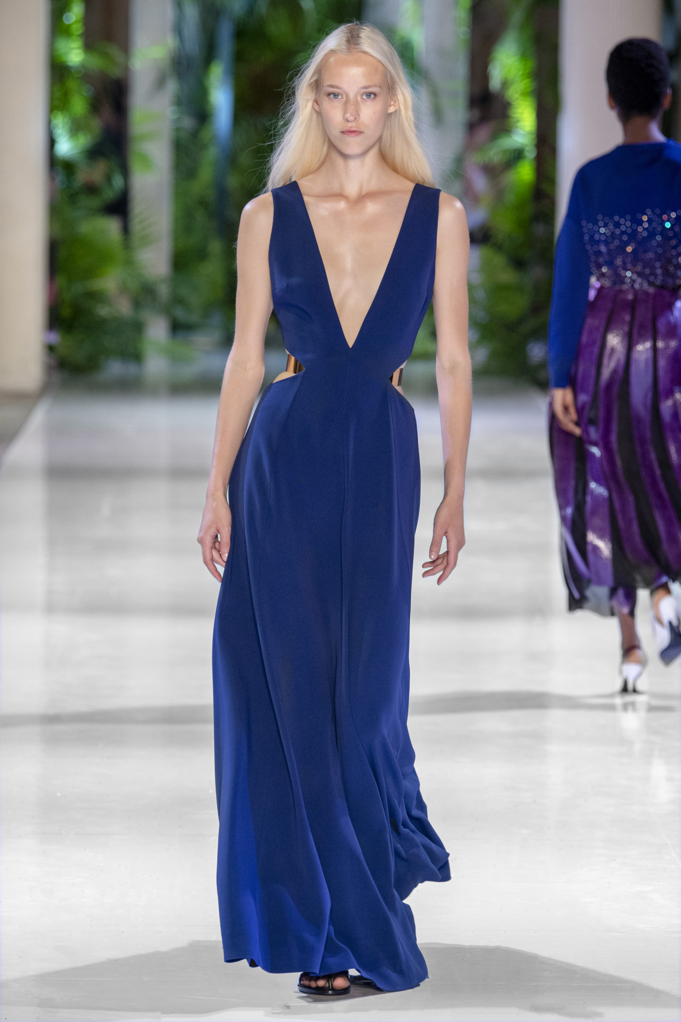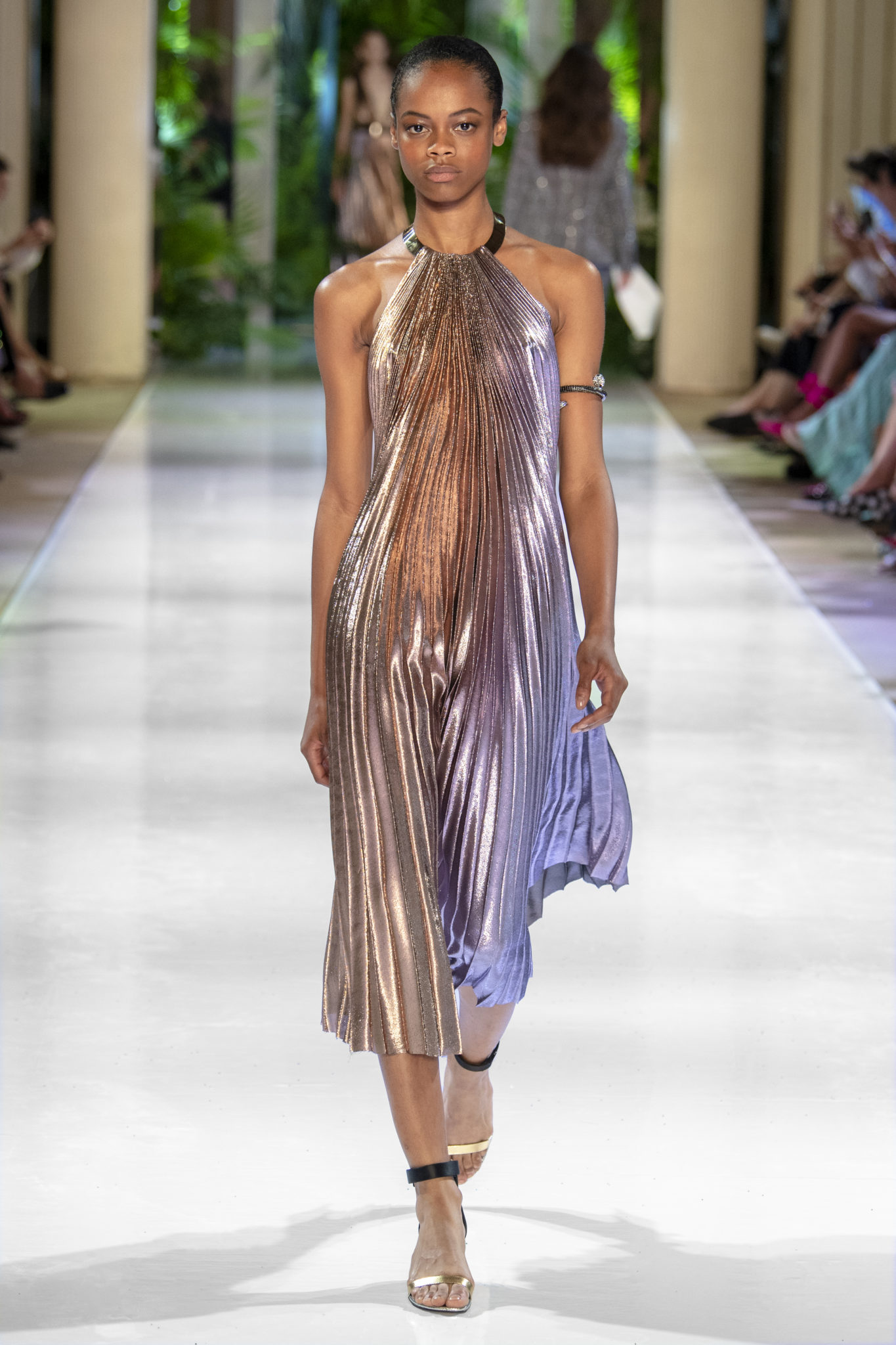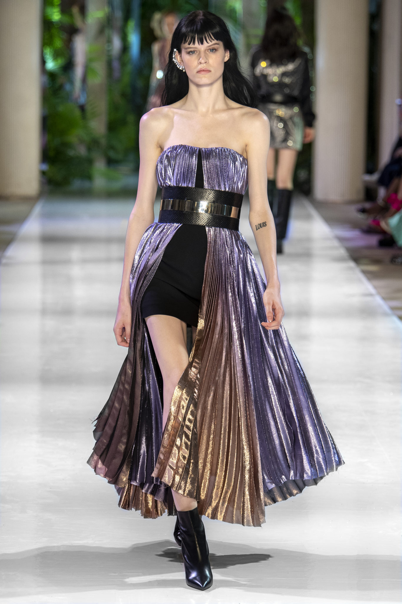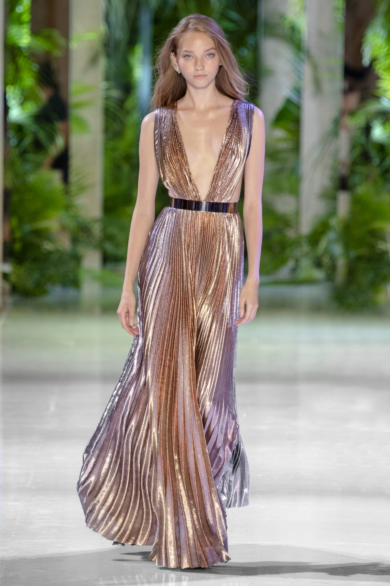 retravaillé en plissé soleil dans un dégradé de couleurs allant du bleu au fuchsia ou du pourpre à mordoré est complété de ceintures en métal or et argent pour une attitude conquérante.