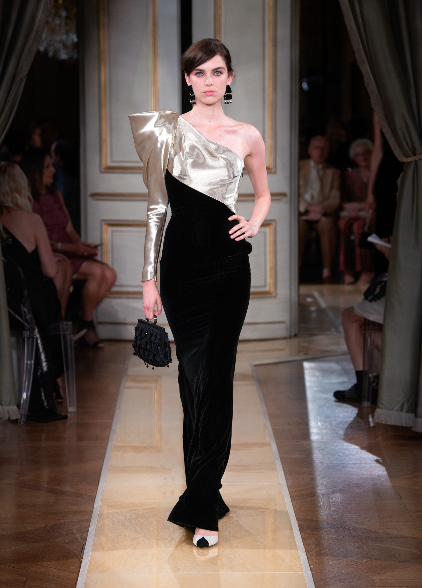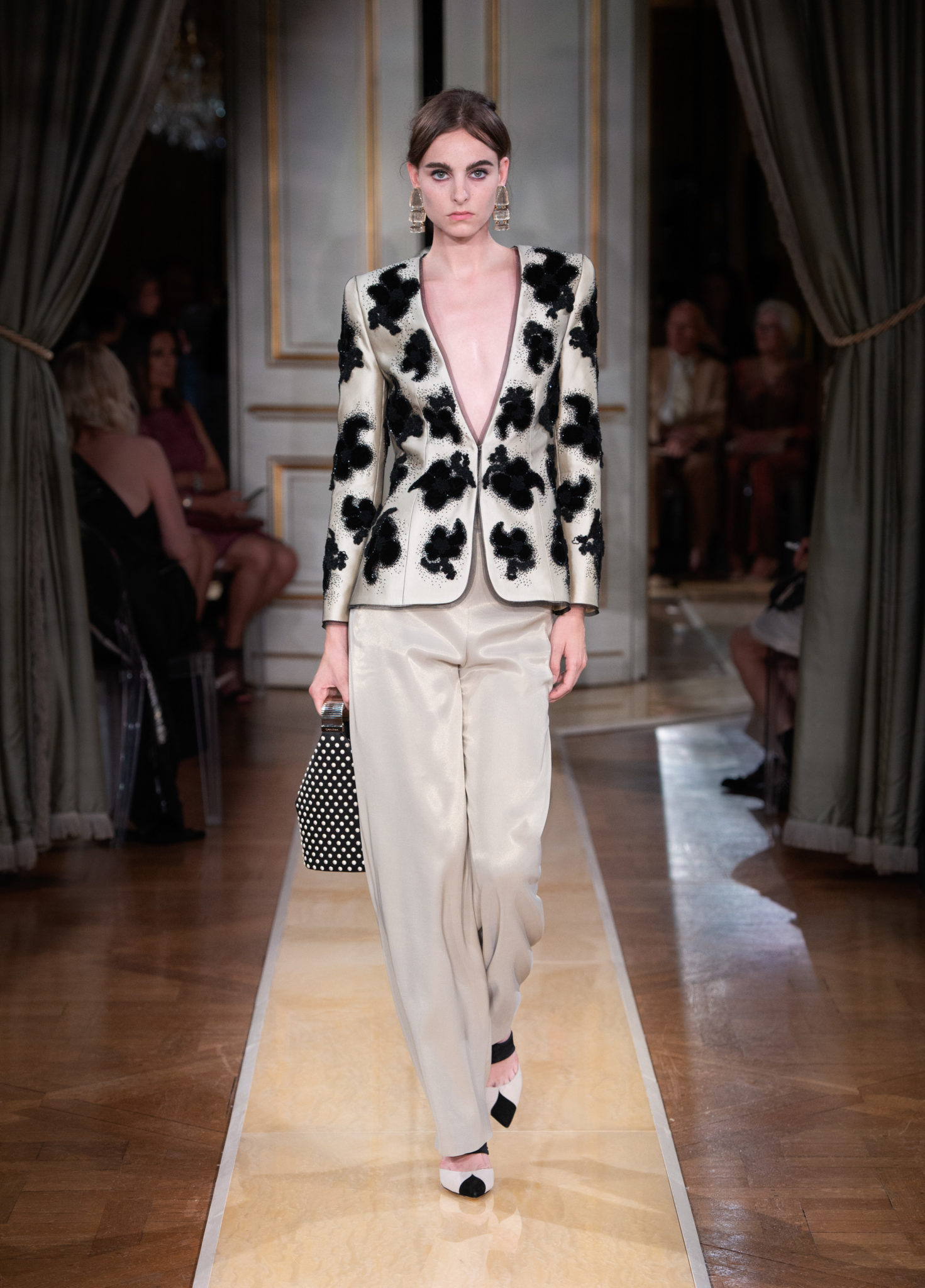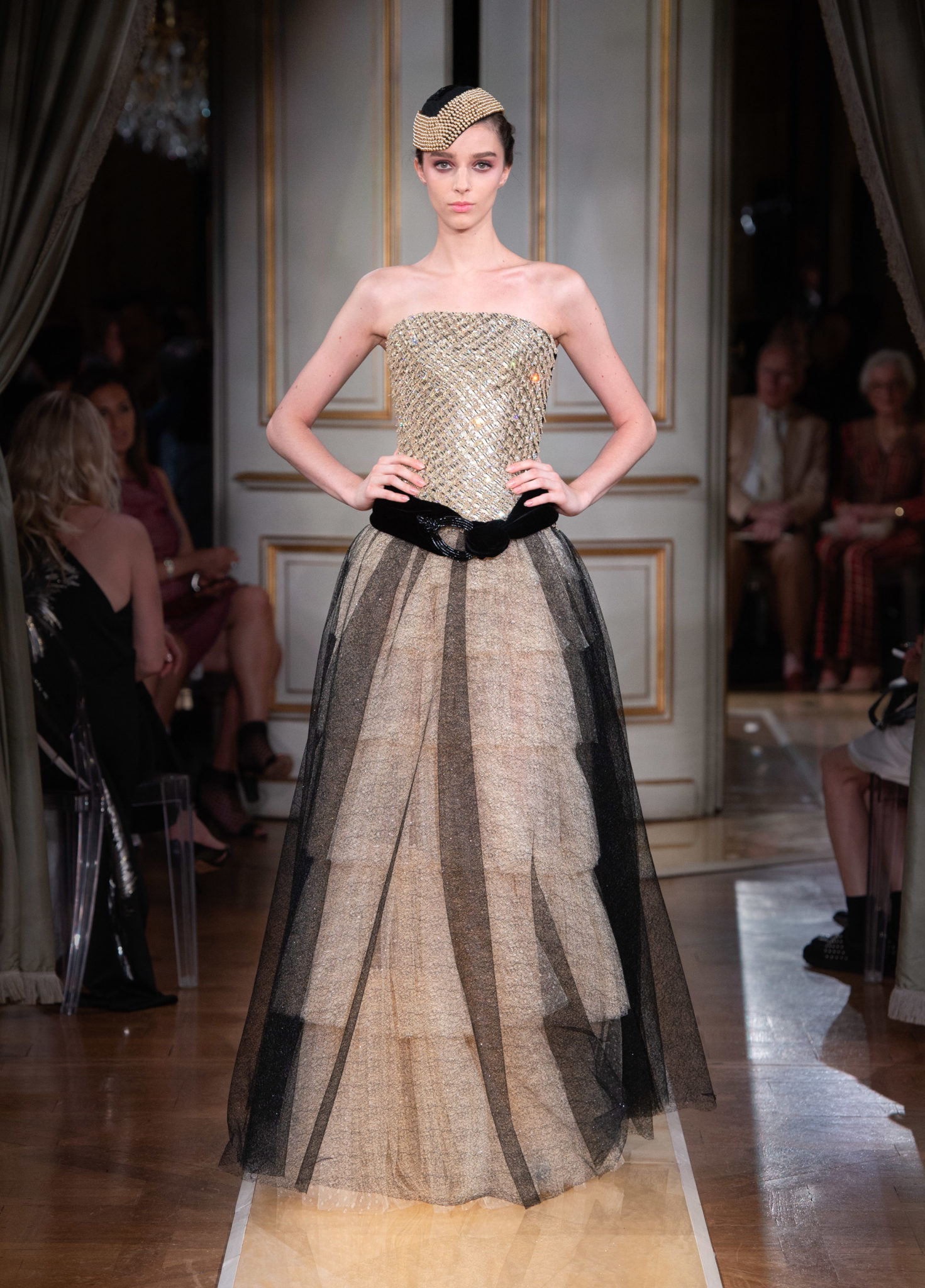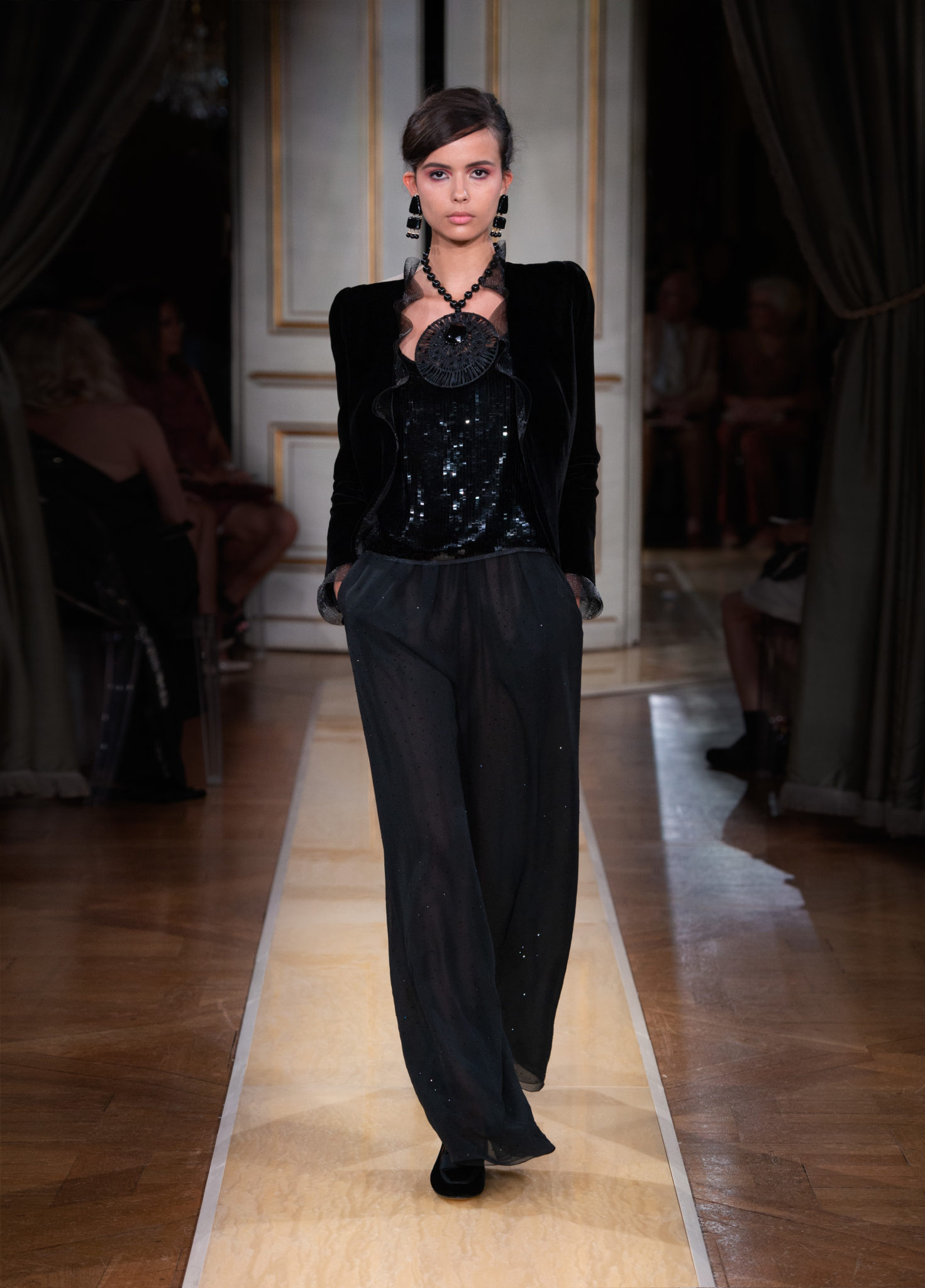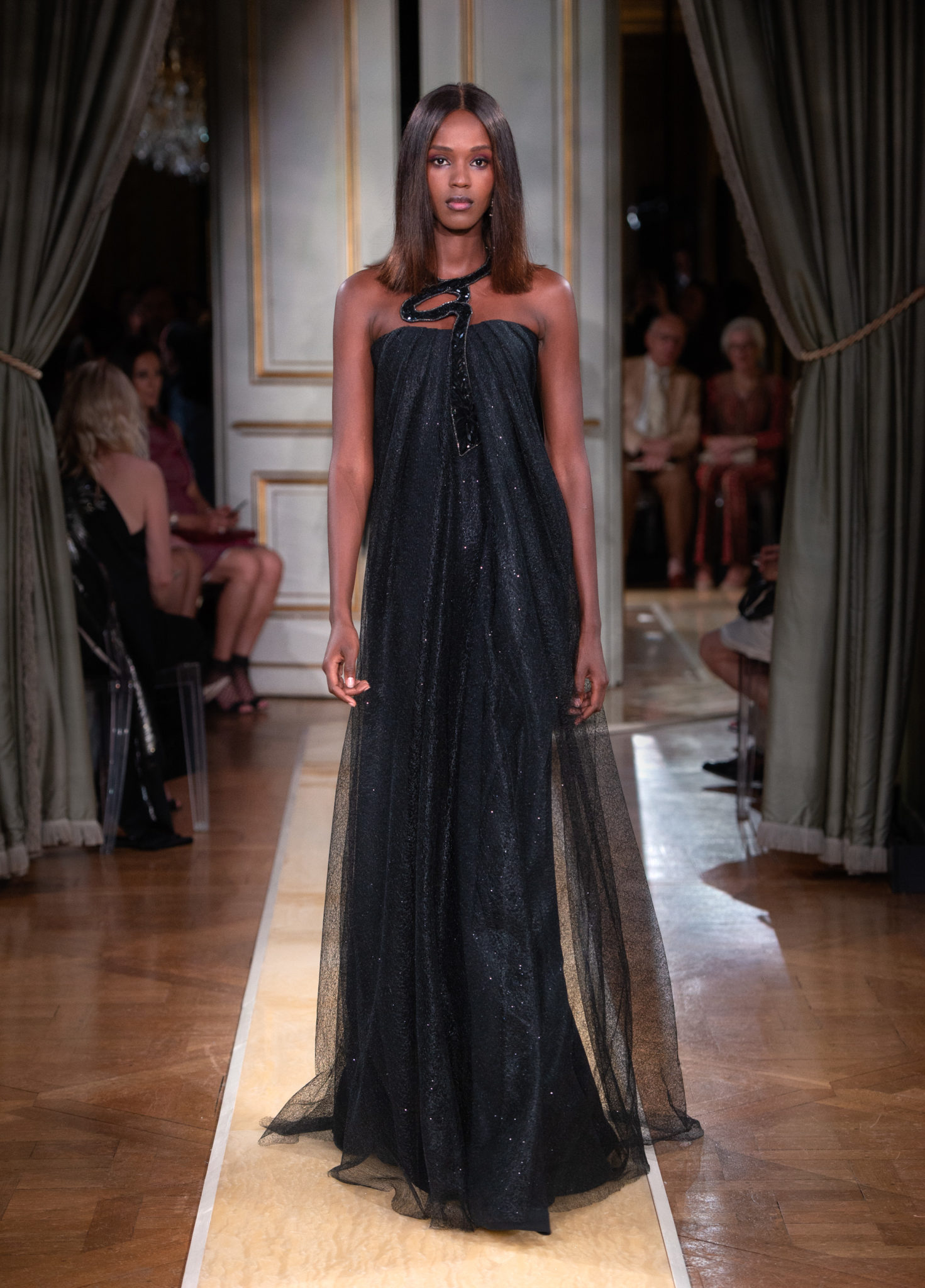 RACONTER À LA NOUVELLE GÉNÉRATION LE VRAI SENS DE LA HAUTE COUTURE, EN LA PRÉSENTANT COMME LES DÉFILÉS DE MODE D’AUTREFOIS, L’ESSENCE MÊME DU LUXE ET LA PERFECTION, C’EST UNE INTENTION QUI S’EST TRANSFORMÉE EN INSPIRATION POUR GIORGIO ARMANI. CETTE HAUTE COUTURE S’EXPRIME À TRAVERS UN STYLE SCULPTURAL, SOMPTUEUX, MAIS AUSSI PAR LA RICHESSE DES TISSUS PERMETTANT DE RÉALISER DES VÊTEMENTS SPECTACULAIRES AUX ALTERNANCES DE TONS NOIRS ET CHAMPAGNE. COMME LE SMOKING EN SATIN BRILLANT, QUINTESSENCE DE L’ÉLÉGANT, DÉCLINÉ DANS CETTE INATTENDUE COMBINAISON DE COULEUR, OU LA ROBE TULIPE EN VELOURS ET CRÊPE CADY, OU BIEN ENCORE CETTE SUBLIME ROBE RÉALISÉE AVEC DES CENTAINES DE MÈTRES DE TULLE VAPOREUX. UNE PROFUSION DE PETITS VOLANTS SUR LESQUELS LE VENT SEMBLE SOUFFLER DONNENT DU MOUVEMENT À LA LONGUE ROBE NOIRE.