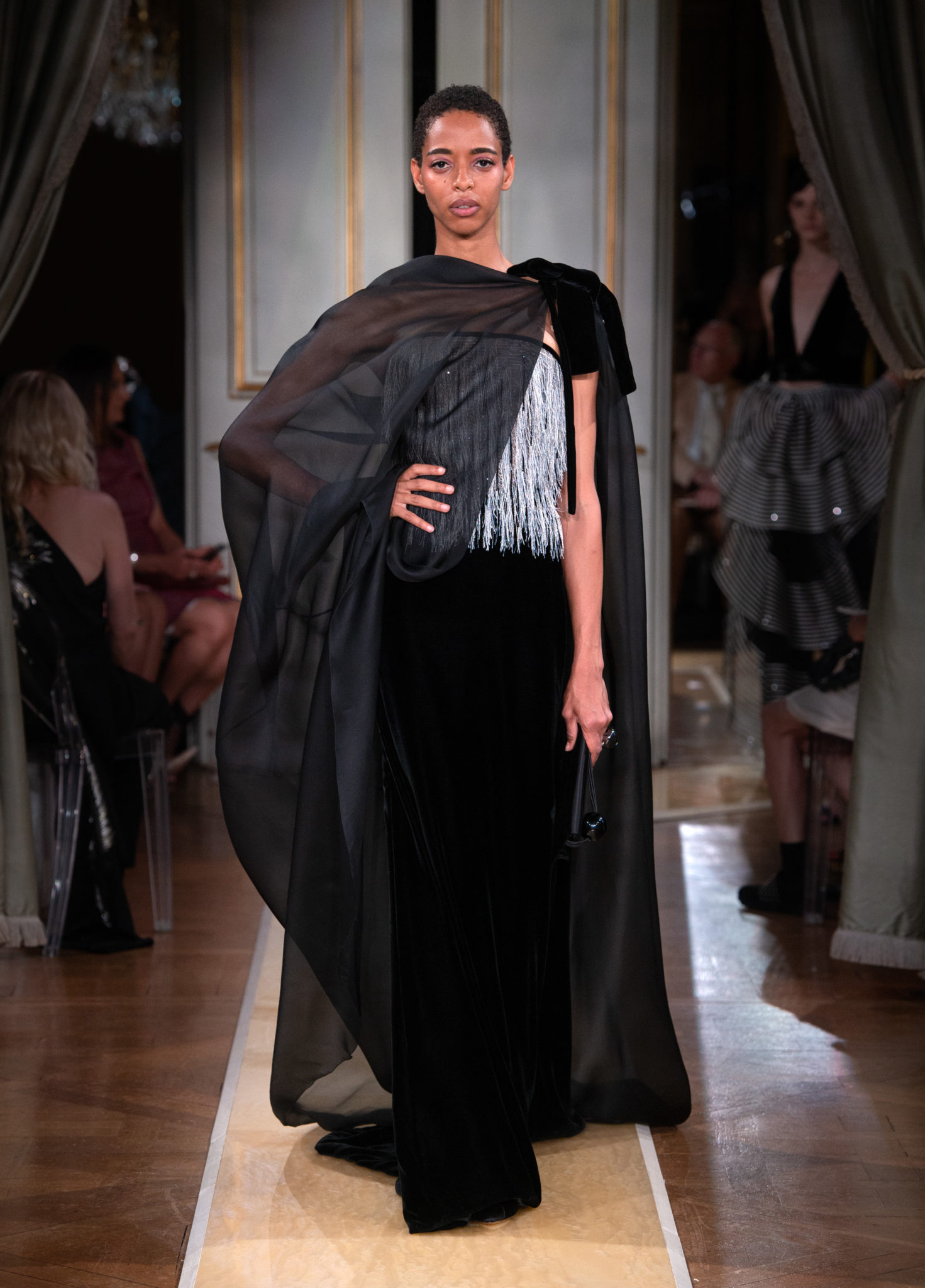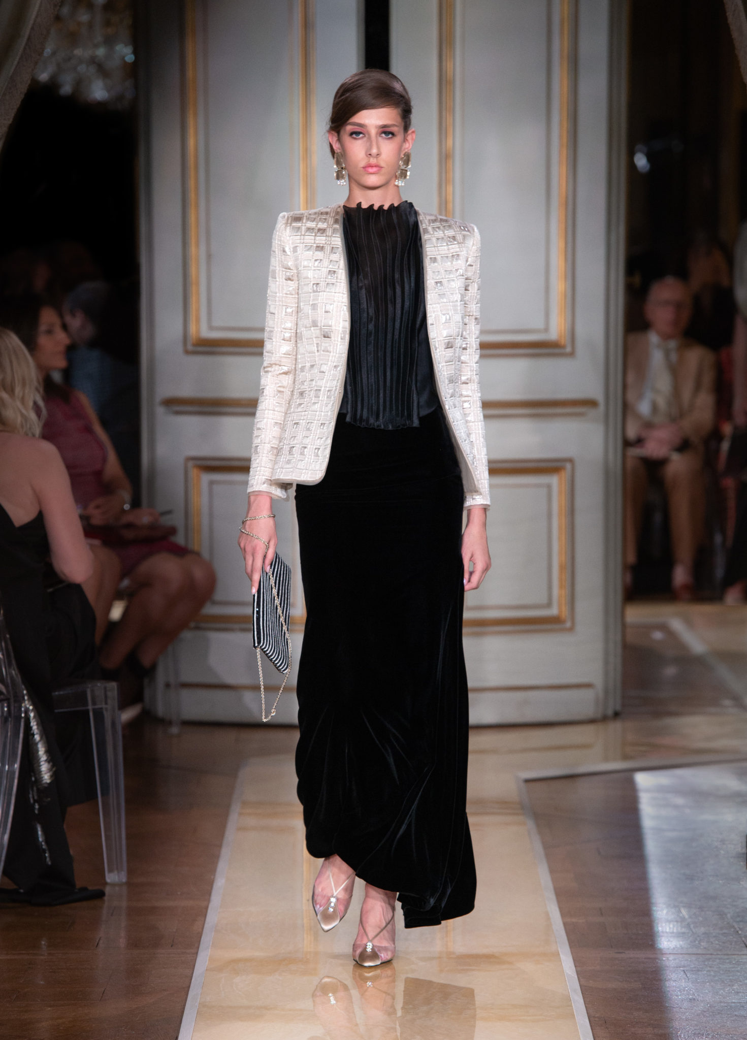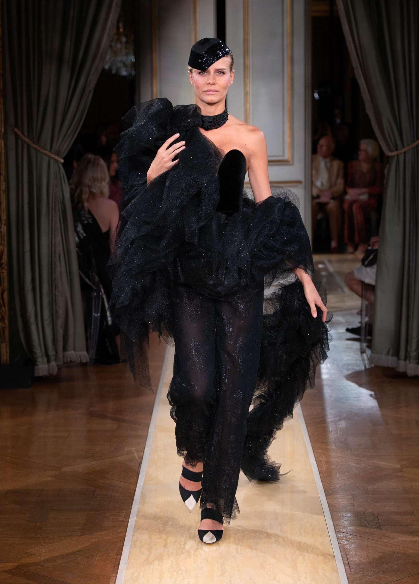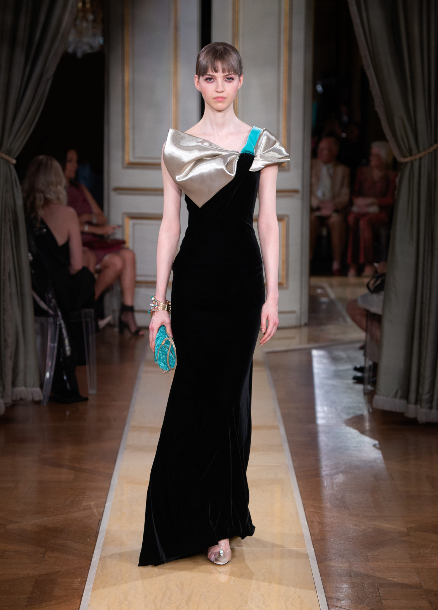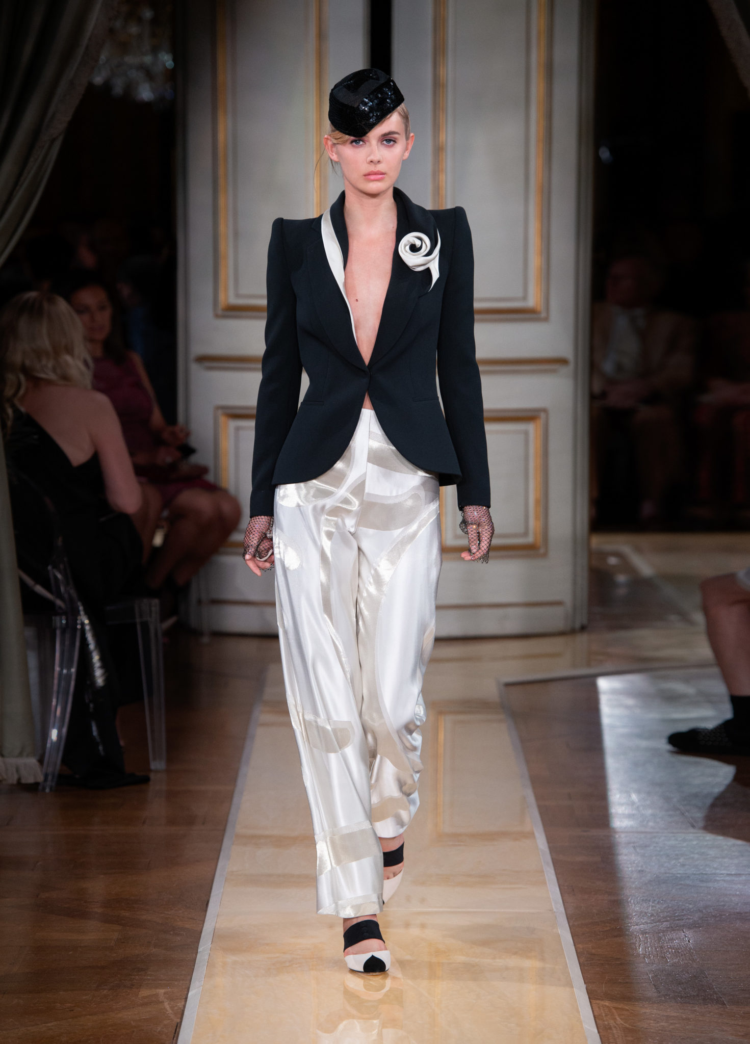 RACONTER À LA NOUVELLE GÉNÉRATION LE VRAI SENS DE LA HAUTE COUTURE, EN LA PRÉSENTANT COMME LES DÉFILÉS DE MODE D’AUTREFOIS, L’ESSENCE MÊME DU LUXE ET LA PERFECTION, C’EST UNE INTENTION QUI S’EST TRANSFORMÉE EN INSPIRATION POUR GIORGIO ARMANI. CETTE HAUTE COUTURE S’EXPRIME À TRAVERS UN STYLE SCULPTURAL, SOMPTUEUX, MAIS AUSSI PAR LA RICHESSE DES TISSUS PERMETTANT DE RÉALISER DES VÊTEMENTS SPECTACULAIRES AUX ALTERNANCES DE TONS NOIRS ET CHAMPAGNE. COMME LE SMOKING EN SATIN BRILLANT, QUINTESSENCE DE L’ÉLÉGANT, DÉCLINÉ DANS CETTE INATTENDUE COMBINAISON DE COULEUR, OU LA ROBE TULIPE EN VELOURS ET CRÊPE CADY, OU BIEN ENCORE CETTE SUBLIME ROBE RÉALISÉE AVEC DES CENTAINES DE MÈTRES DE TULLE VAPOREUX. UNE PROFUSION DE PETITS VOLANTS SUR LESQUELS LE VENT SEMBLE SOUFFLER DONNENT DU MOUVEMENT À LA LONGUE ROBE NOIRE.