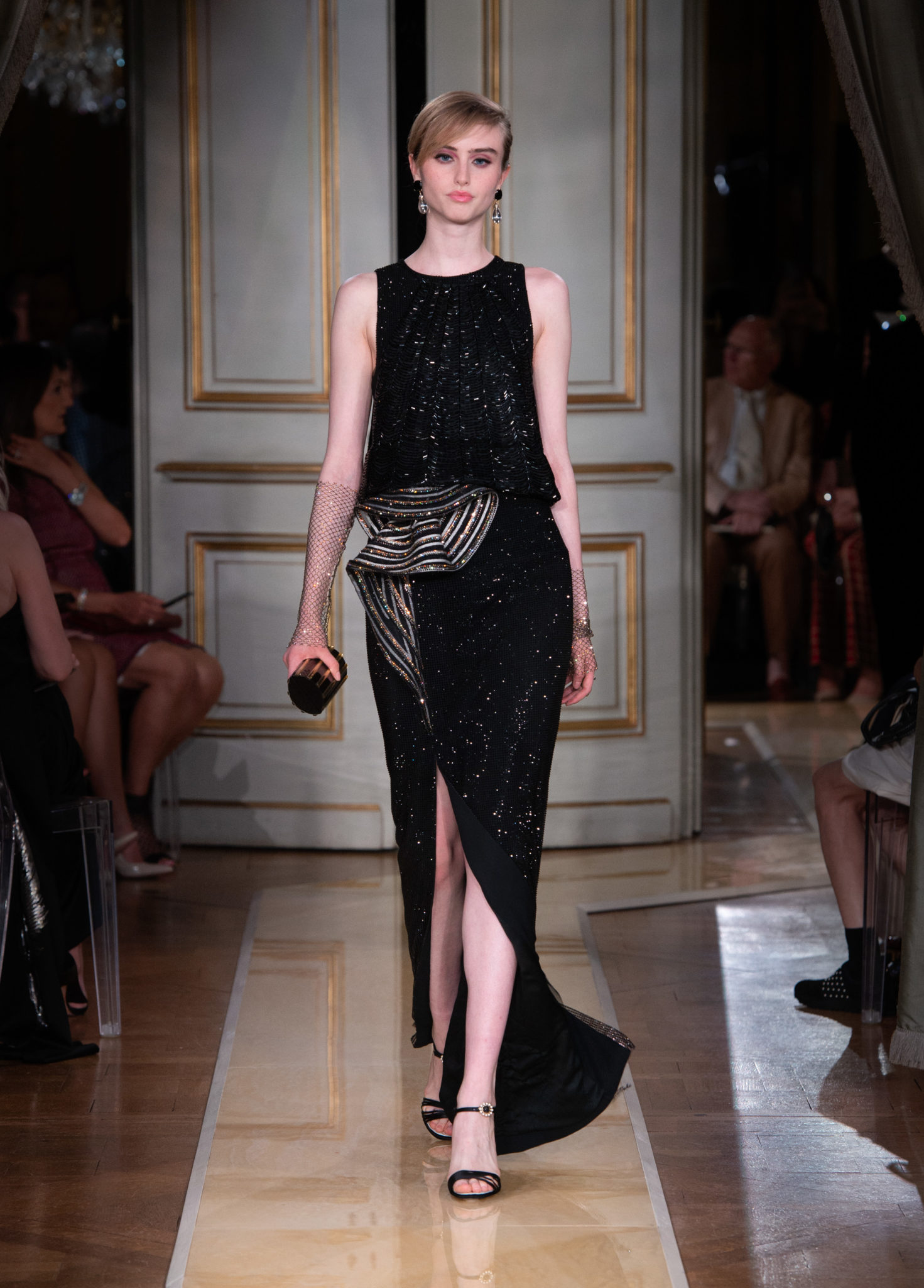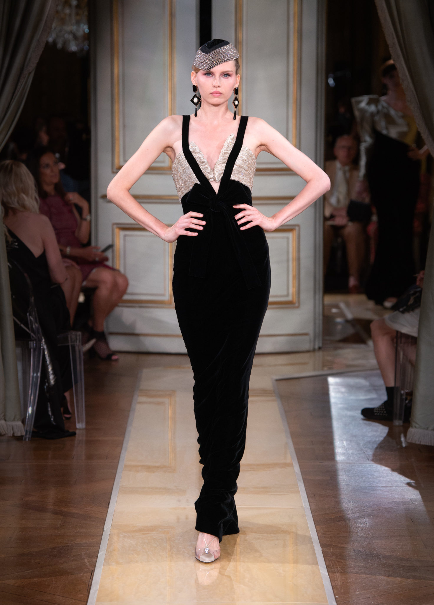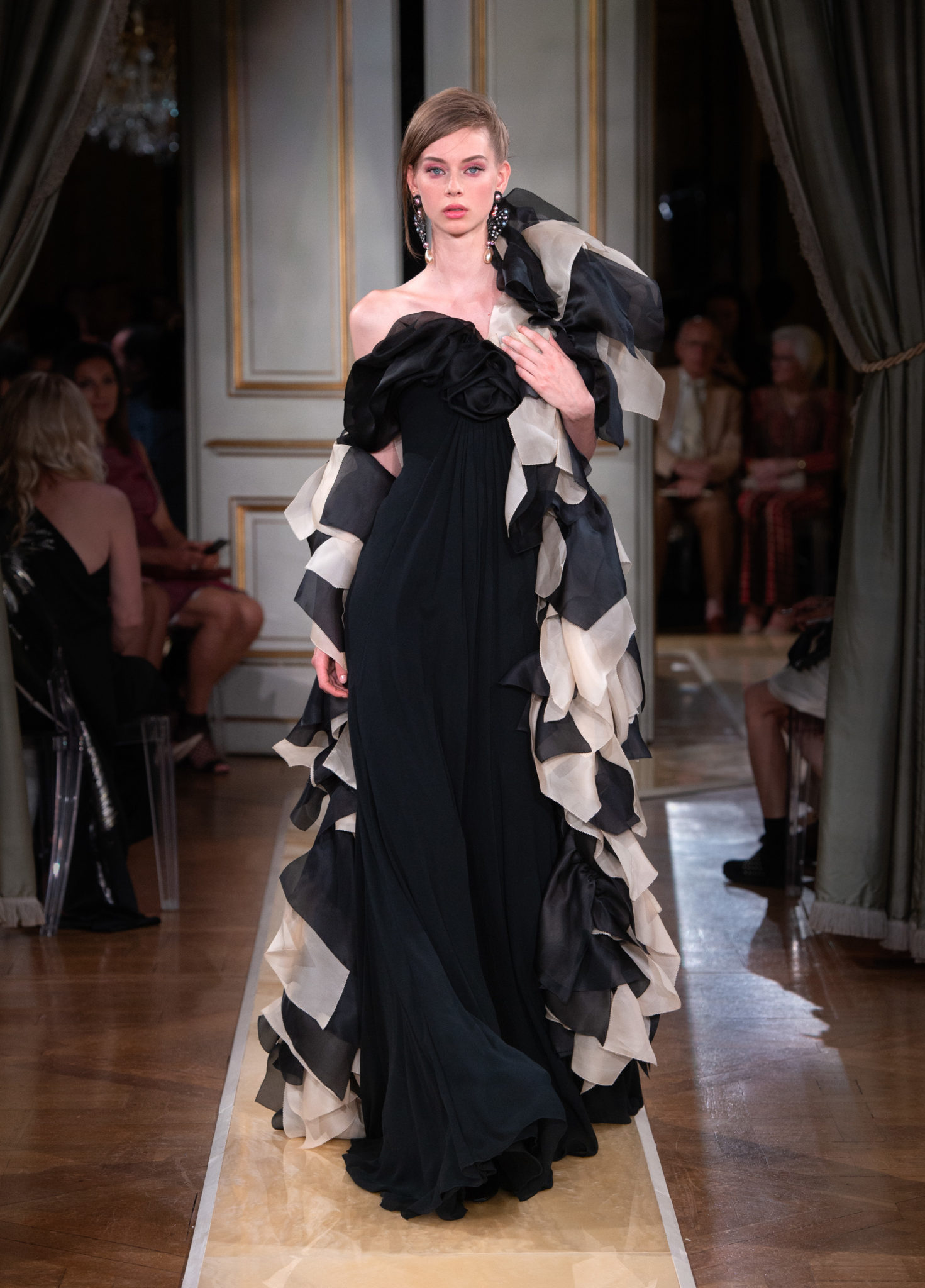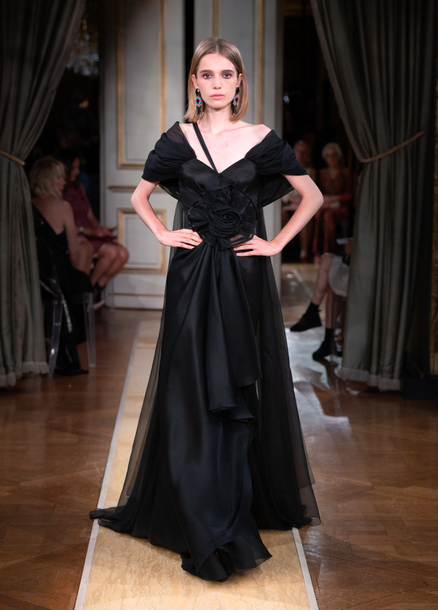 RACONTER À LA NOUVELLE GÉNÉRATION LE VRAI SENS DE LA HAUTE COUTURE, EN LA PRÉSENTANT COMME LES DÉFILÉS DE MODE D’AUTREFOIS, L’ESSENCE MÊME DU LUXE ET LA PERFECTION, C’EST UNE INTENTION QUI S’EST TRANSFORMÉE EN INSPIRATION POUR GIORGIO ARMANI. CETTE HAUTE COUTURE S’EXPRIME À TRAVERS UN STYLE SCULPTURAL, SOMPTUEUX, MAIS AUSSI PAR LA RICHESSE DES TISSUS PERMETTANT DE RÉALISER DES VÊTEMENTS SPECTACULAIRES AUX ALTERNANCES DE TONS NOIRS ET CHAMPAGNE. COMME LE SMOKING EN SATIN BRILLANT, QUINTESSENCE DE L’ÉLÉGANT, DÉCLINÉ DANS CETTE INATTENDUE COMBINAISON DE COULEUR, OU LA ROBE TULIPE EN VELOURS ET CRÊPE CADY, OU BIEN ENCORE CETTE SUBLIME ROBE RÉALISÉE AVEC DES CENTAINES DE MÈTRES DE TULLE VAPOREUX. UNE PROFUSION DE PETITS VOLANTS SUR LESQUELS LE VENT SEMBLE SOUFFLER DONNENT DU MOUVEMENT À LA LONGUE ROBE NOIRE.