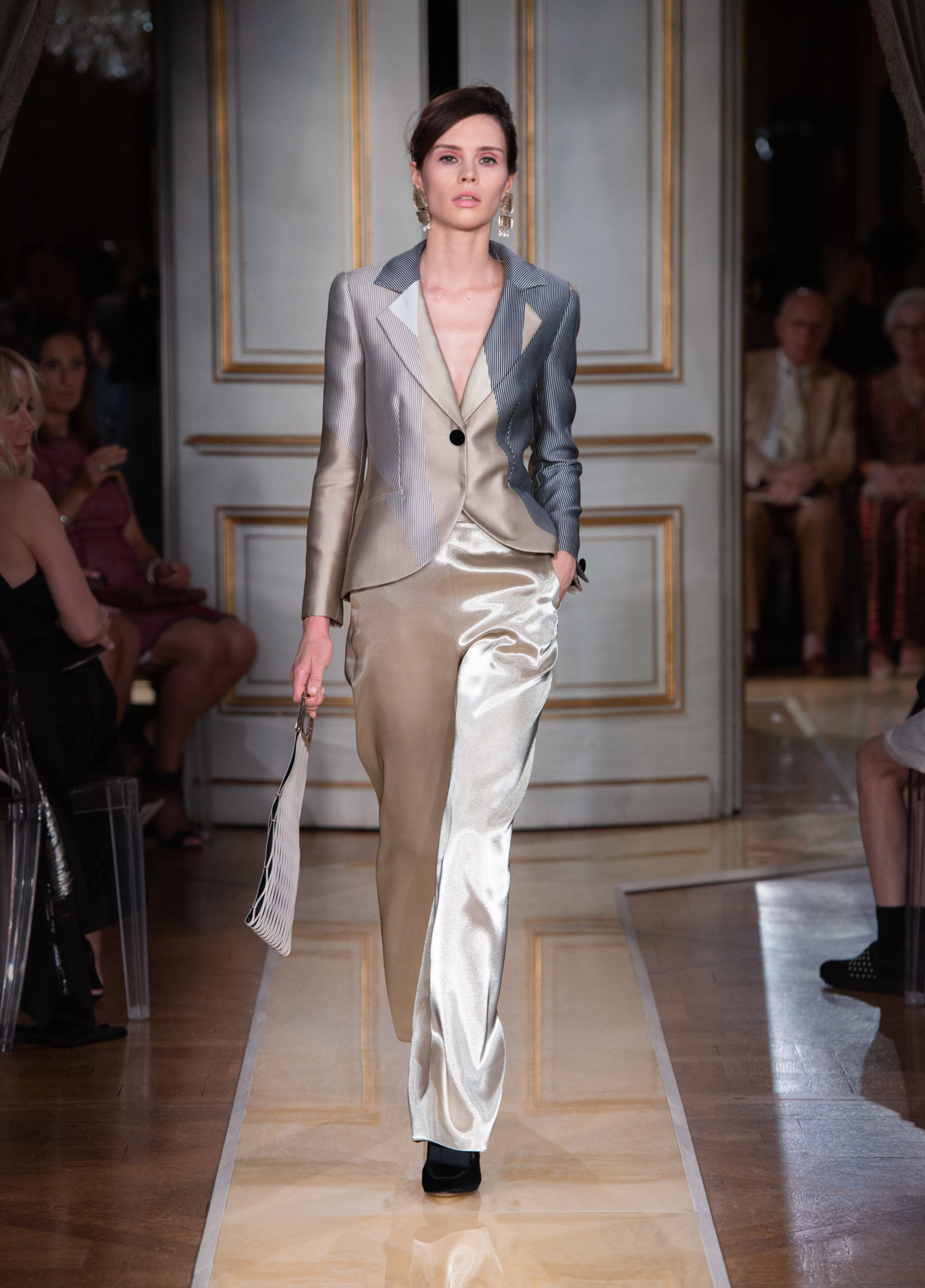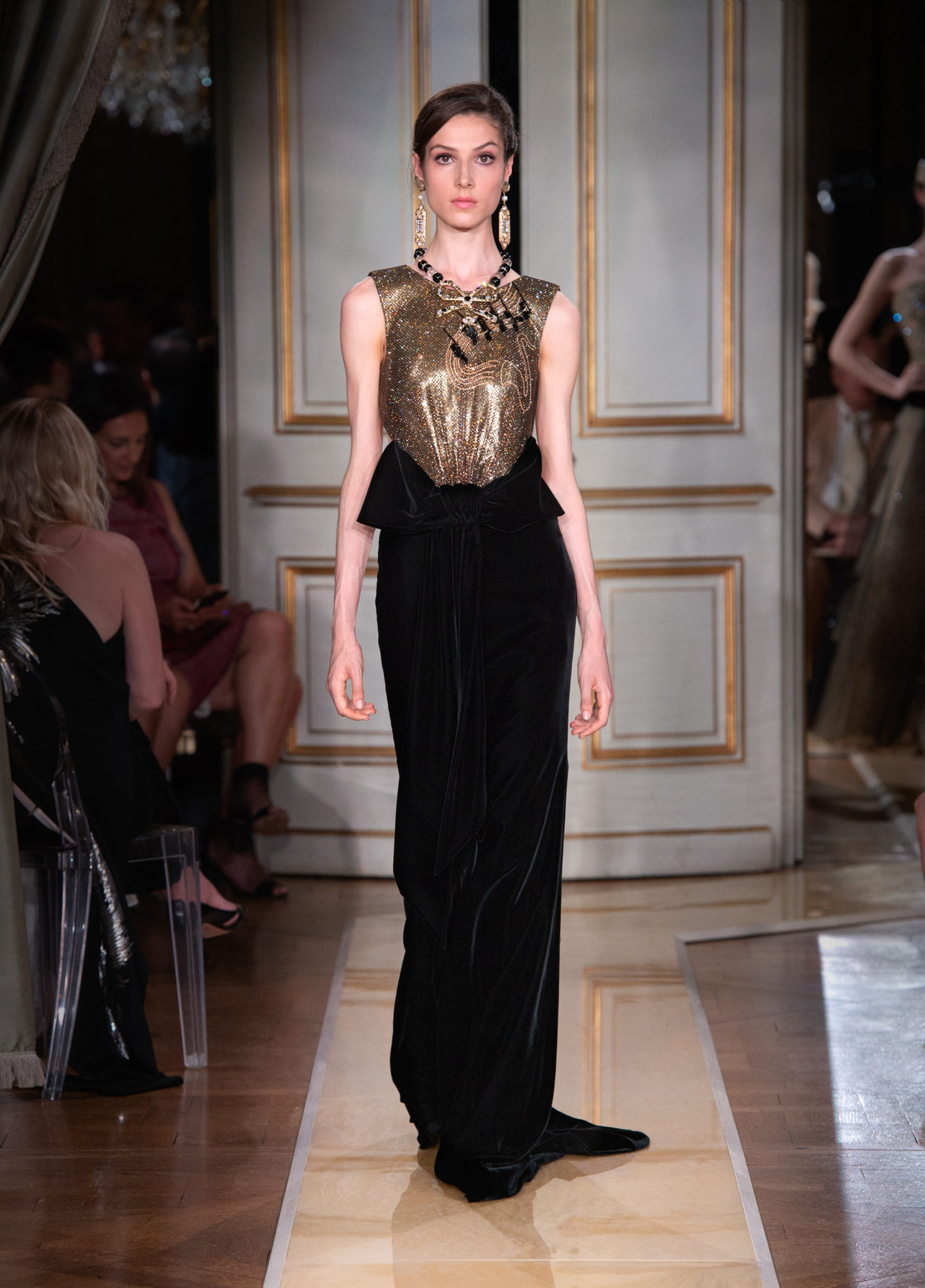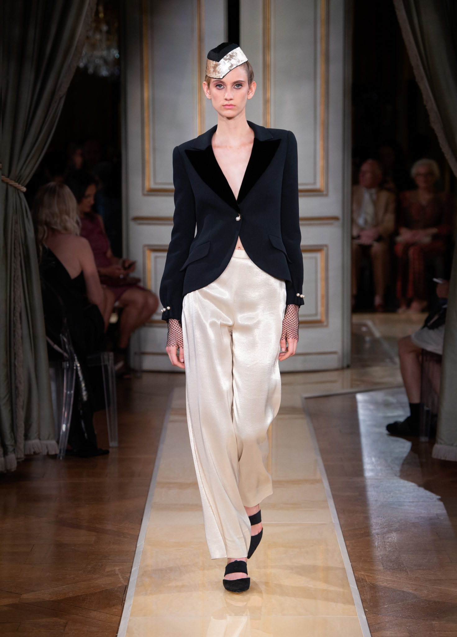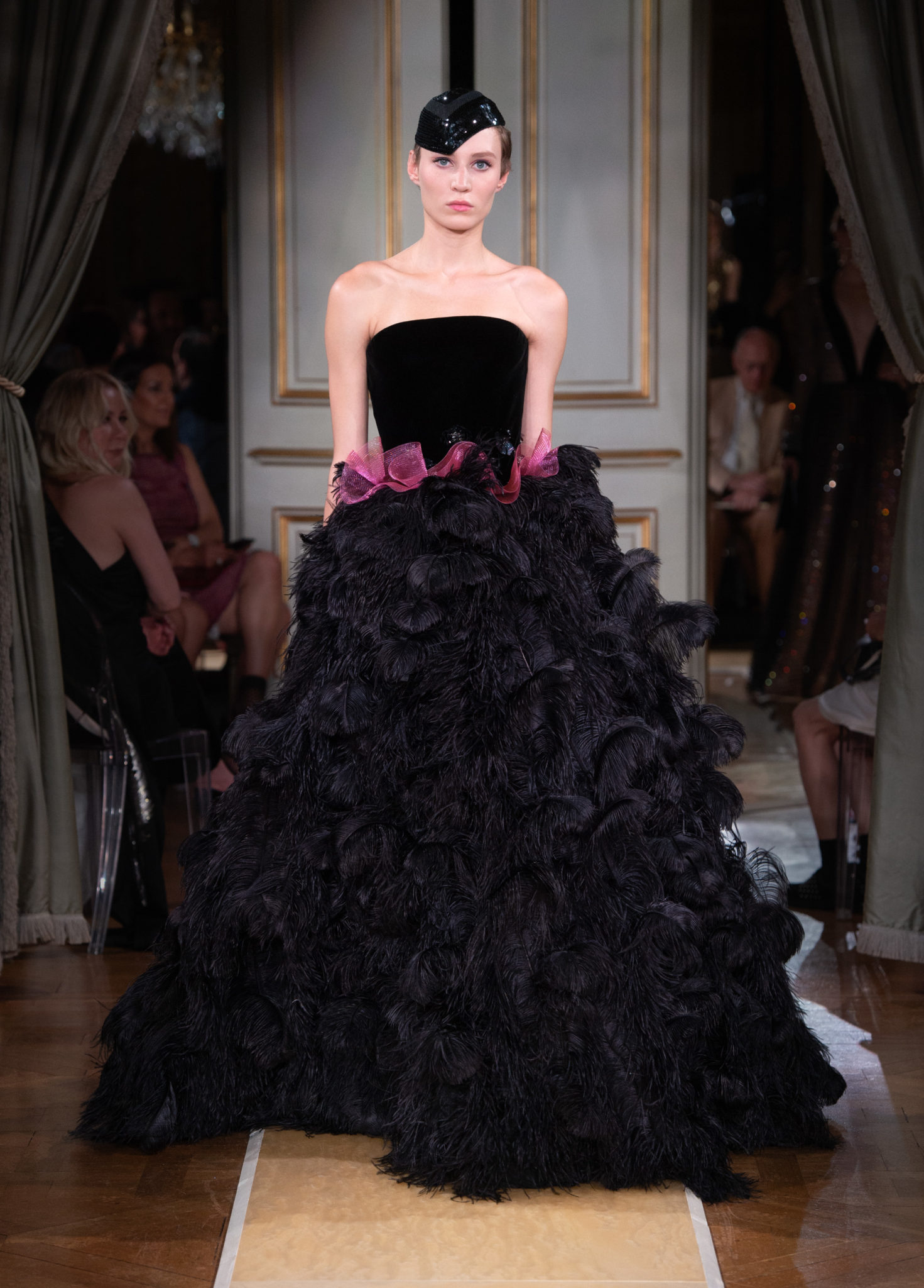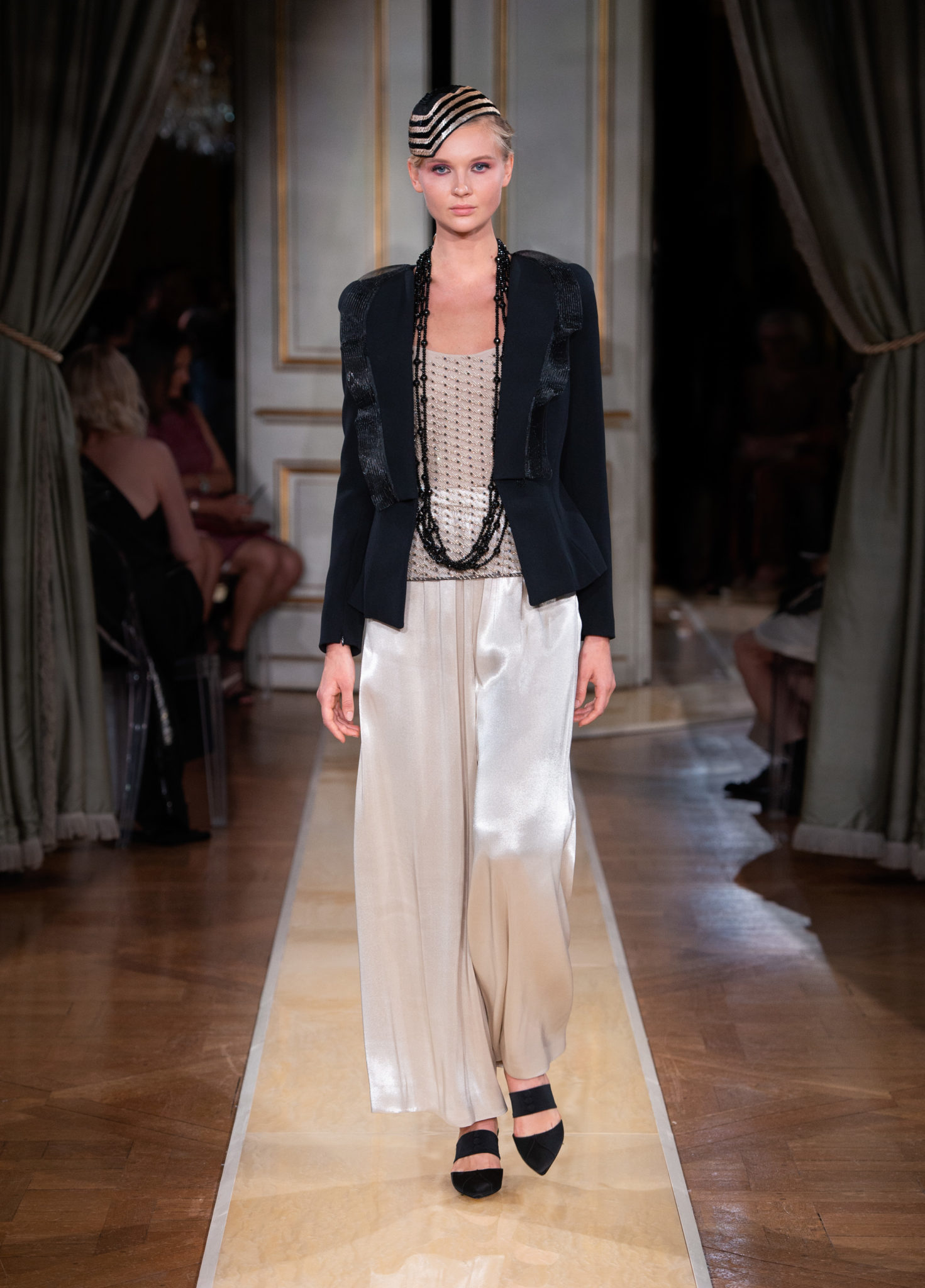 RACONTER À LA NOUVELLE GÉNÉRATION LE VRAI SENS DE LA HAUTE COUTURE, EN LA PRÉSENTANT COMME LES DÉFILÉS DE MODE D’AUTREFOIS, L’ESSENCE MÊME DU LUXE ET LA PERFECTION, C’EST UNE INTENTION QUI S’EST TRANSFORMÉE EN INSPIRATION POUR GIORGIO ARMANI. CETTE HAUTE COUTURE S’EXPRIME À TRAVERS UN STYLE SCULPTURAL, SOMPTUEUX, MAIS AUSSI PAR LA RICHESSE DES TISSUS PERMETTANT DE RÉALISER DES VÊTEMENTS SPECTACULAIRES AUX ALTERNANCES DE TONS NOIRS ET CHAMPAGNE. COMME LE SMOKING EN SATIN BRILLANT, QUINTESSENCE DE L’ÉLÉGANT, DÉCLINÉ DANS CETTE INATTENDUE COMBINAISON DE COULEUR, OU LA ROBE TULIPE EN VELOURS ET CRÊPE CADY, OU BIEN ENCORE CETTE SUBLIME ROBE RÉALISÉE AVEC DES CENTAINES DE MÈTRES DE TULLE VAPOREUX. UNE PROFUSION DE PETITS VOLANTS SUR LESQUELS LE VENT SEMBLE SOUFFLER DONNENT DU MOUVEMENT À LA LONGUE ROBE NOIRE.