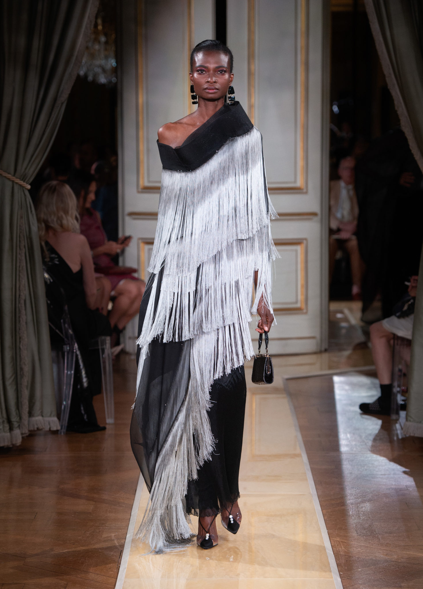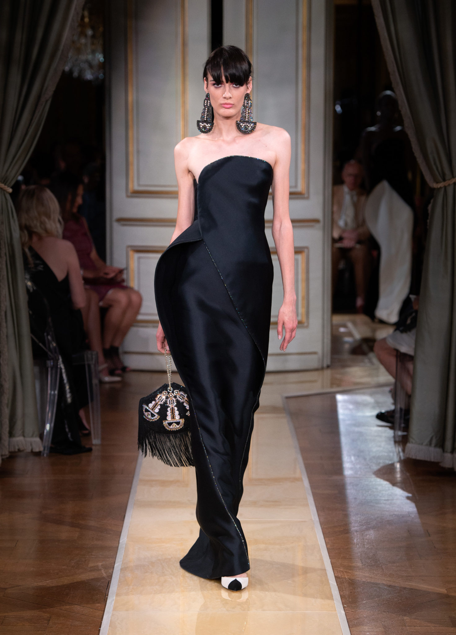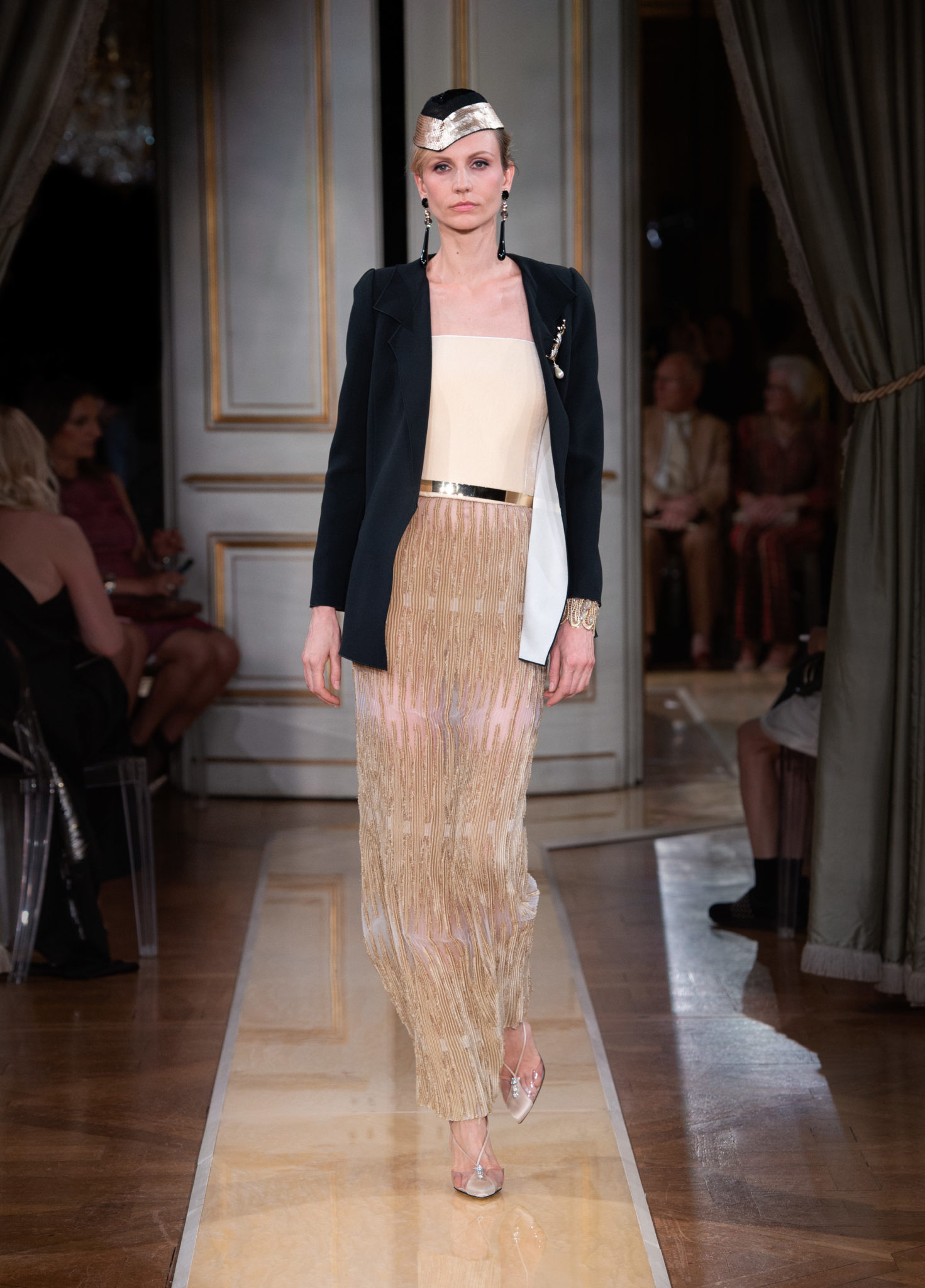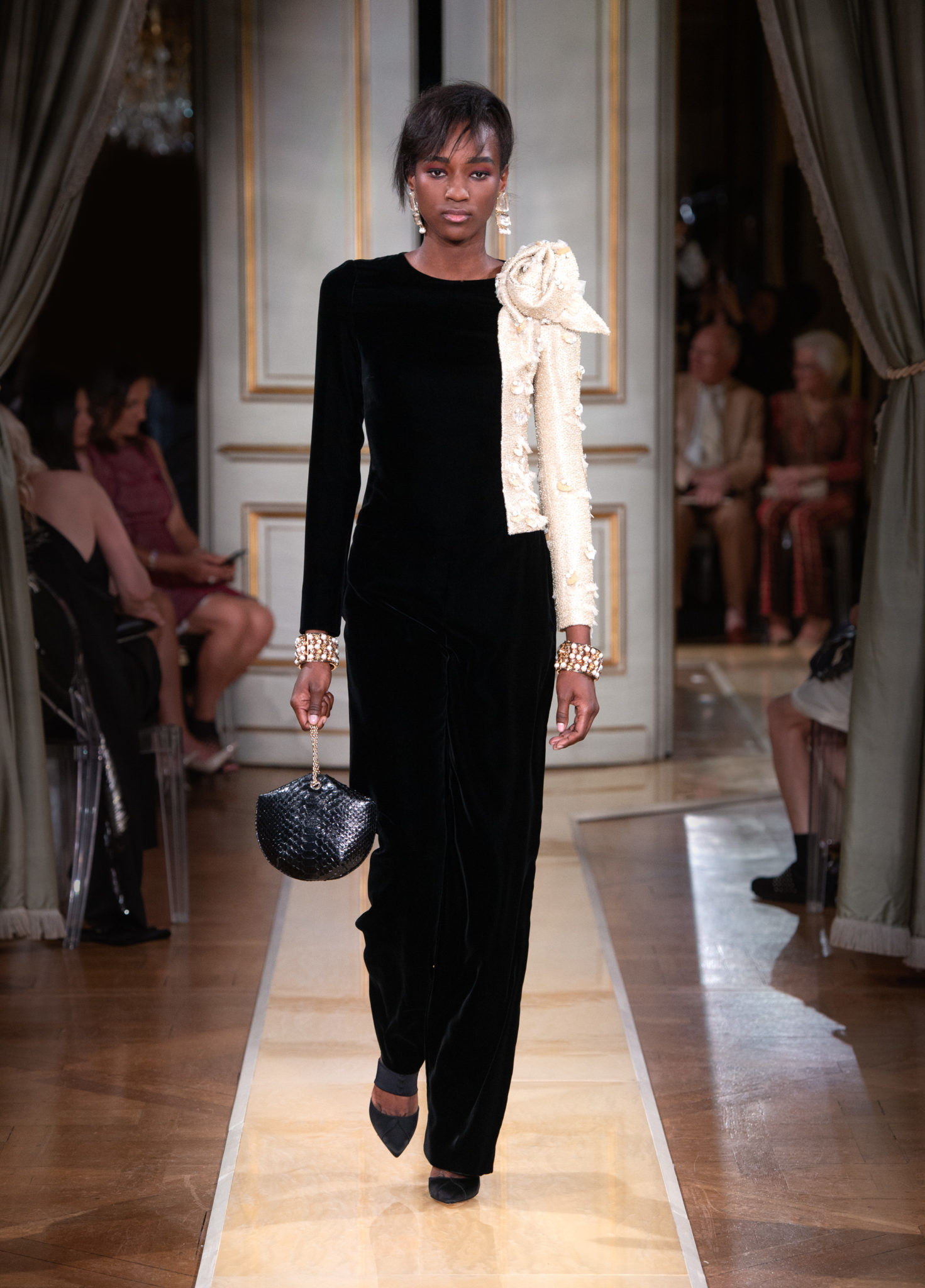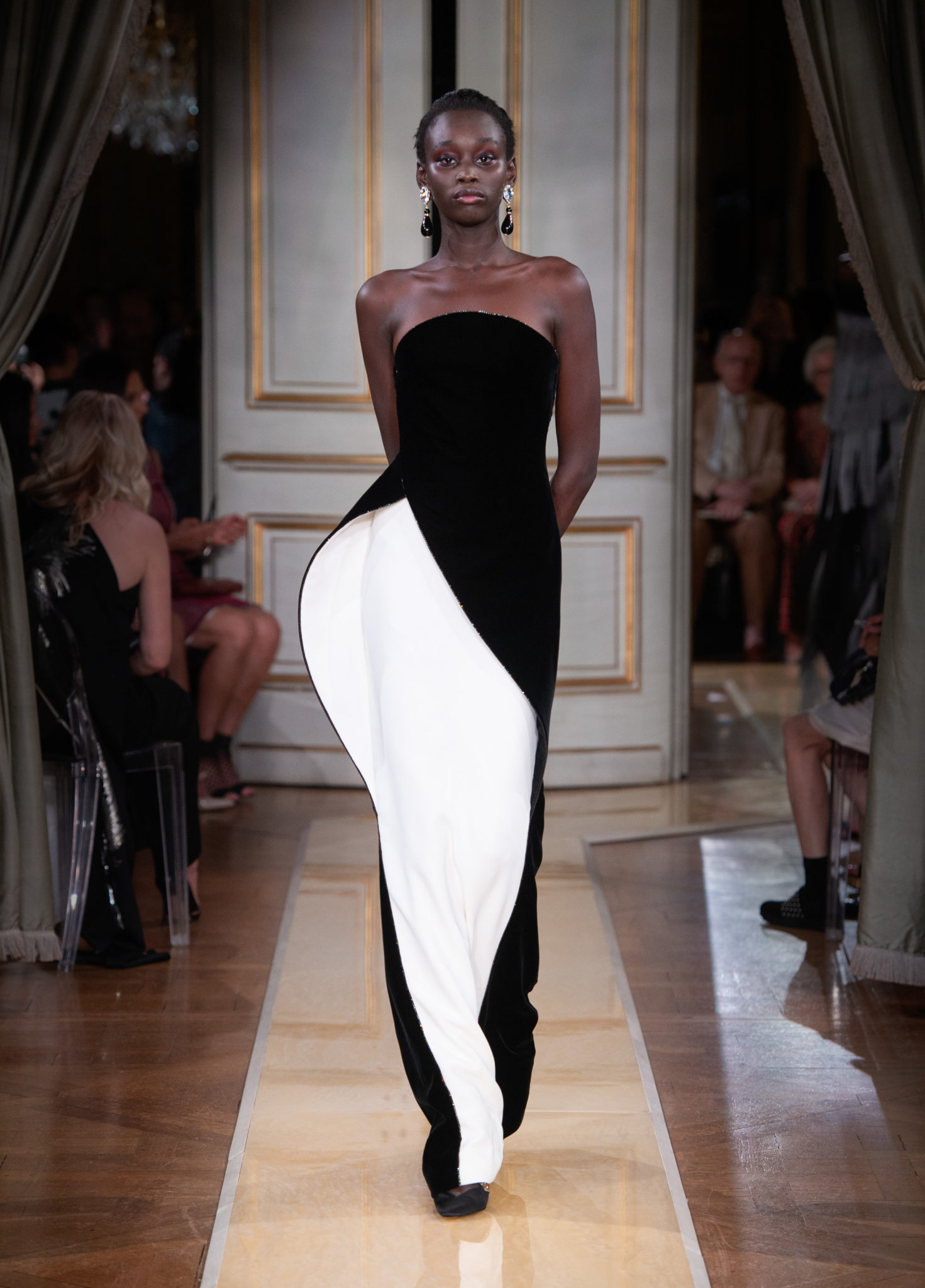 RACONTER À LA NOUVELLE GÉNÉRATION LE VRAI SENS DE LA HAUTE COUTURE, EN LA PRÉSENTANT COMME LES DÉFILÉS DE MODE D’AUTREFOIS, L’ESSENCE MÊME DU LUXE ET LA PERFECTION, C’EST UNE INTENTION QUI S’EST TRANSFORMÉE EN INSPIRATION POUR GIORGIO ARMANI. CETTE HAUTE COUTURE S’EXPRIME À TRAVERS UN STYLE SCULPTURAL, SOMPTUEUX, MAIS AUSSI PAR LA RICHESSE DES TISSUS PERMETTANT DE RÉALISER DES VÊTEMENTS SPECTACULAIRES AUX ALTERNANCES DE TONS NOIRS ET CHAMPAGNE. COMME LE SMOKING EN SATIN BRILLANT, QUINTESSENCE DE L’ÉLÉGANT, DÉCLINÉ DANS CETTE INATTENDUE COMBINAISON DE COULEUR, OU LA ROBE TULIPE EN VELOURS ET CRÊPE CADY, OU BIEN ENCORE CETTE SUBLIME ROBE RÉALISÉE AVEC DES CENTAINES DE MÈTRES DE TULLE VAPOREUX. UNE PROFUSION DE PETITS VOLANTS SUR LESQUELS LE VENT SEMBLE SOUFFLER DONNENT DU MOUVEMENT À LA LONGUE ROBE NOIRE.