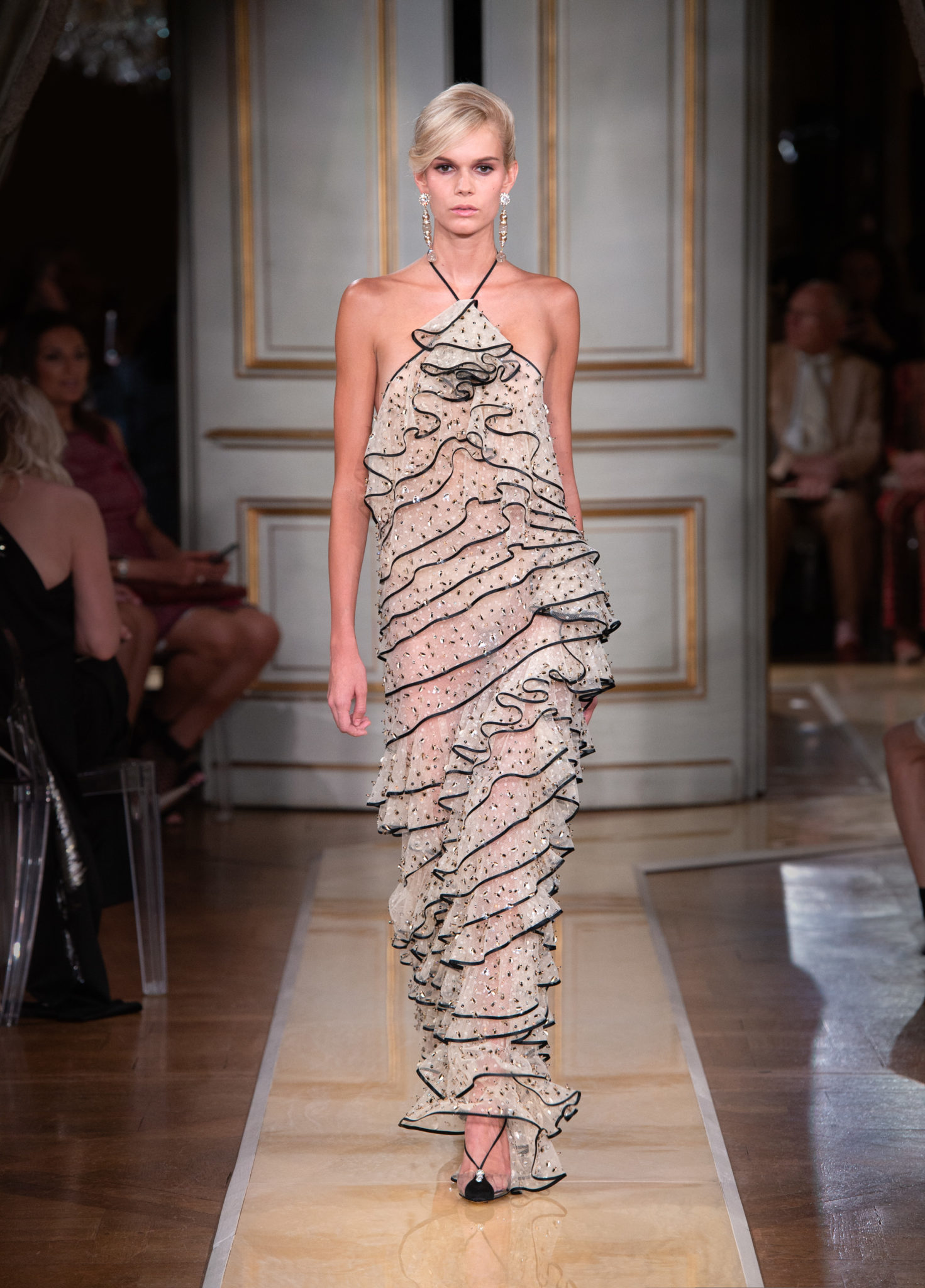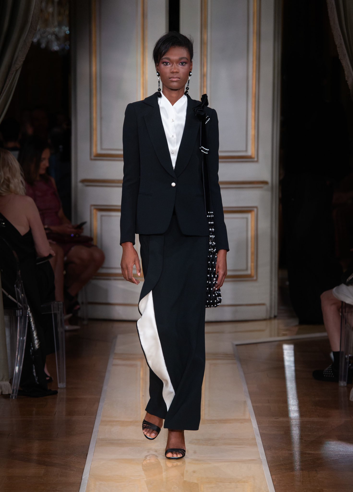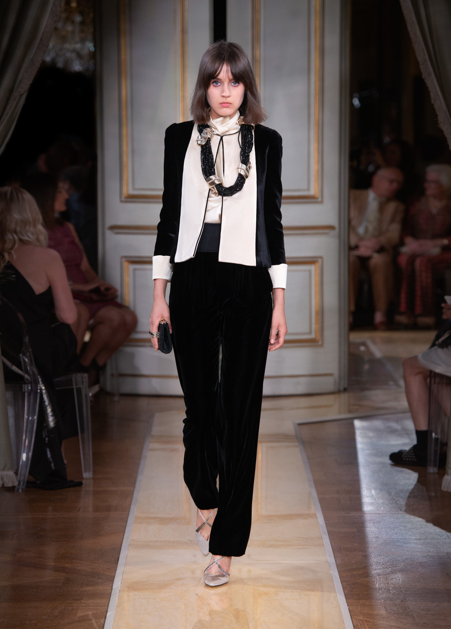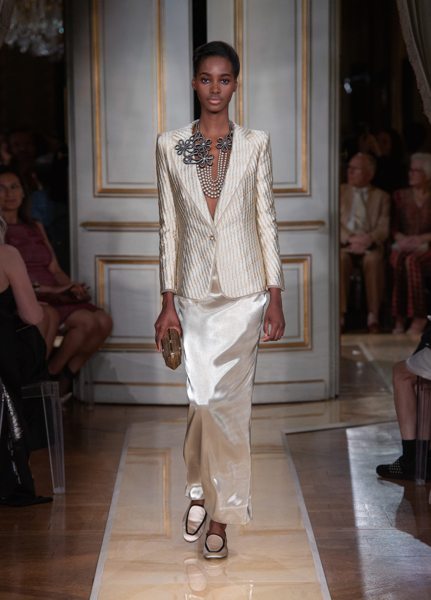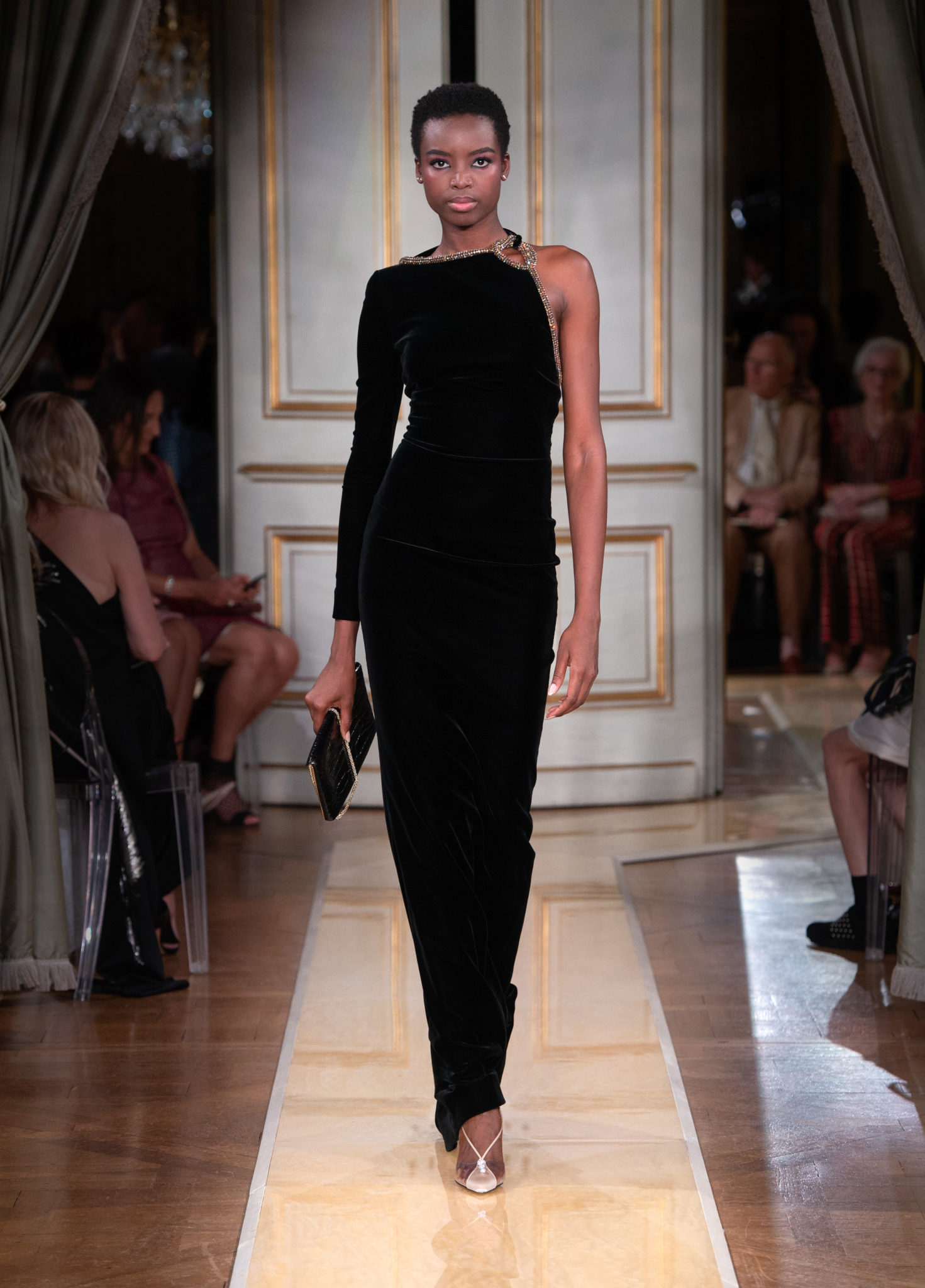RACONTER À LA NOUVELLE GÉNÉRATION LE VRAI SENS DE LA HAUTE COUTURE, EN LA PRÉSENTANT COMME LES DÉFILÉS DE MODE D’AUTREFOIS, L’ESSENCE MÊME DU LUXE ET LA PERFECTION, C’EST UNE INTENTION QUI S’EST TRANSFORMÉE EN INSPIRATION POUR GIORGIO ARMANI. CETTE HAUTE COUTURE S’EXPRIME À TRAVERS UN STYLE SCULPTURAL, SOMPTUEUX, MAIS AUSSI PAR LA RICHESSE DES TISSUS PERMETTANT DE RÉALISER DES VÊTEMENTS SPECTACULAIRES AUX ALTERNANCES DE TONS NOIRS ET CHAMPAGNE. COMME LE SMOKING EN SATIN BRILLANT, QUINTESSENCE DE L’ÉLÉGANT, DÉCLINÉ DANS CETTE INATTENDUE COMBINAISON DE COULEUR, OU LA ROBE TULIPE EN VELOURS ET CRÊPE CADY, OU BIEN ENCORE CETTE SUBLIME ROBE RÉALISÉE AVEC DES CENTAINES DE MÈTRES DE TULLE VAPOREUX. UNE PROFUSION DE PETITS VOLANTS SUR LESQUELS LE VENT SEMBLE SOUFFLER DONNENT DU MOUVEMENT À LA LONGUE ROBE NOIRE.