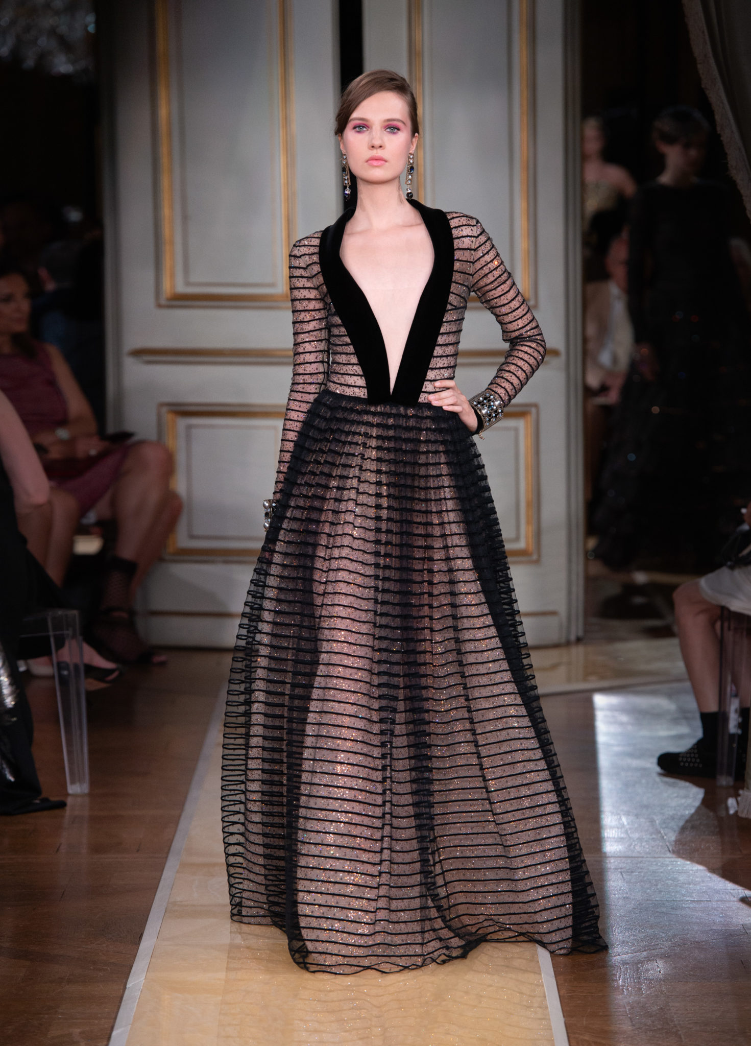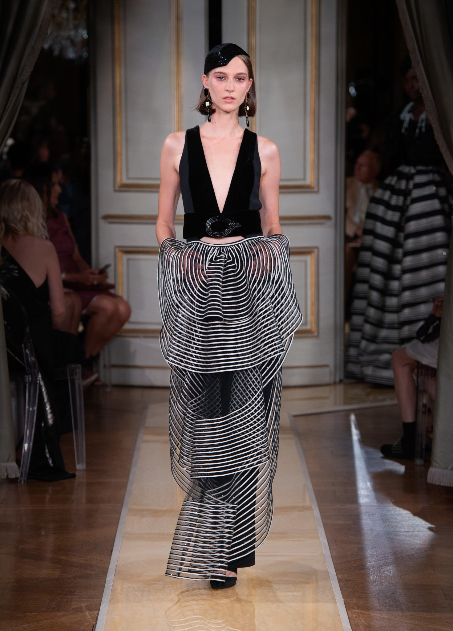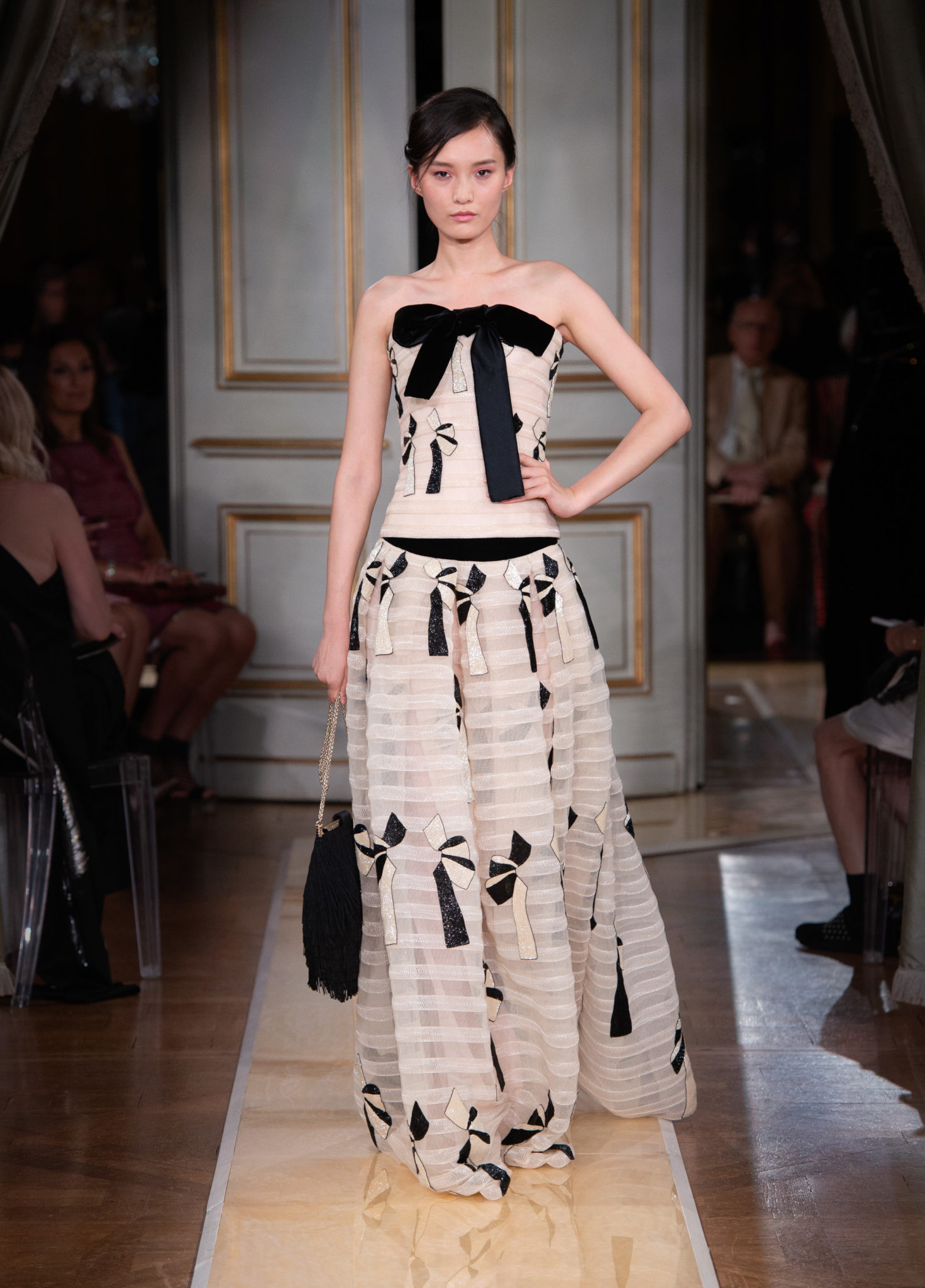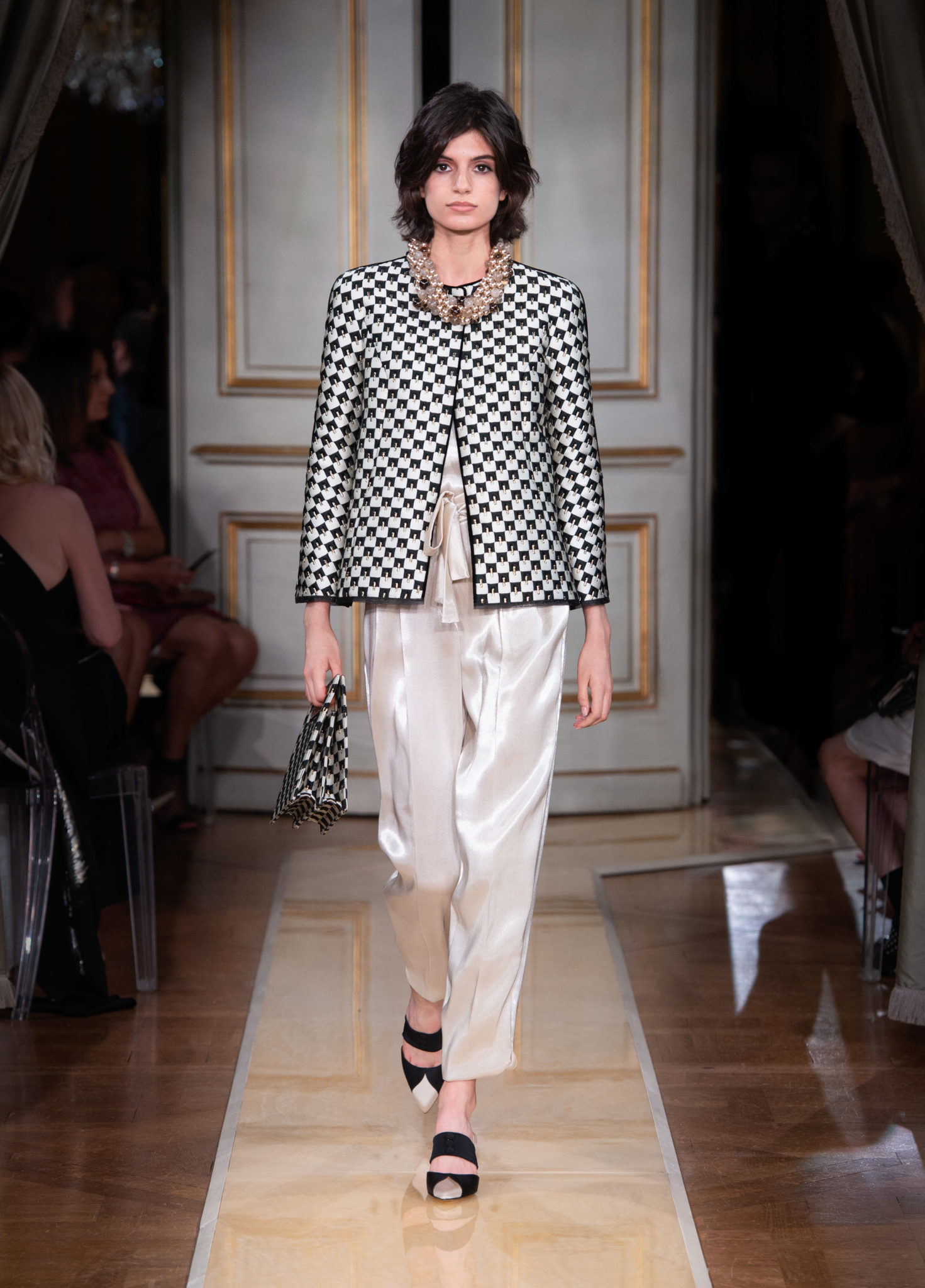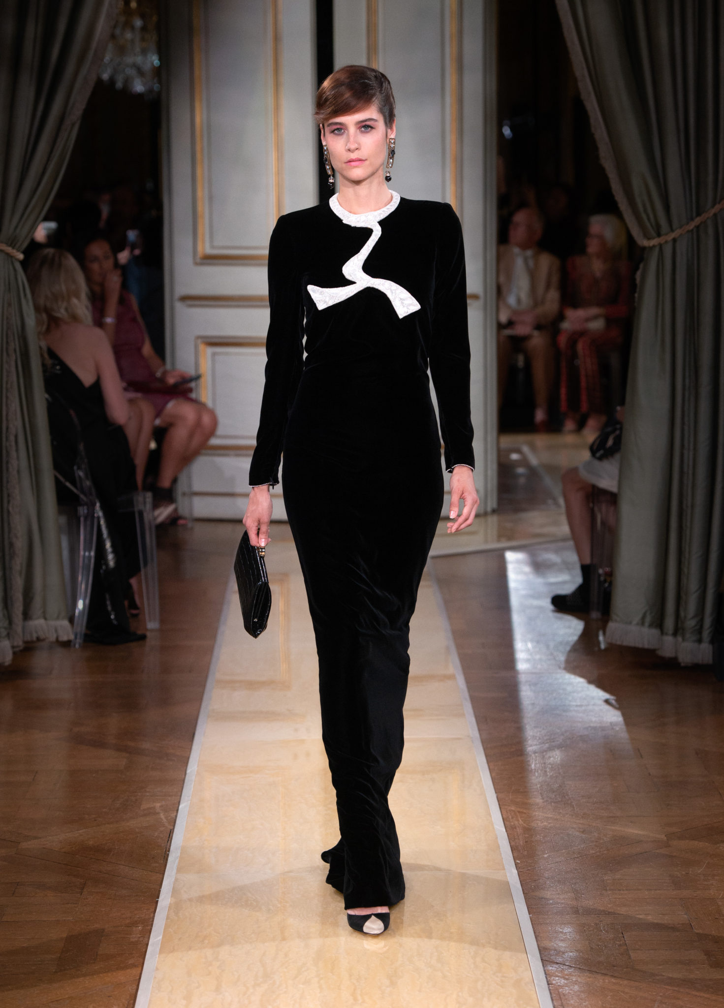 RACONTER À LA NOUVELLE GÉNÉRATION LE VRAI SENS DE LA HAUTE COUTURE, EN LA PRÉSENTANT COMME LES DÉFILÉS DE MODE D’AUTREFOIS, L’ESSENCE MÊME DU LUXE ET LA PERFECTION, C’EST UNE INTENTION QUI S’EST TRANSFORMÉE EN INSPIRATION POUR GIORGIO ARMANI. CETTE HAUTE COUTURE S’EXPRIME À TRAVERS UN STYLE SCULPTURAL, SOMPTUEUX, MAIS AUSSI PAR LA RICHESSE DES TISSUS PERMETTANT DE RÉALISER DES VÊTEMENTS SPECTACULAIRES AUX ALTERNANCES DE TONS NOIRS ET CHAMPAGNE. COMME LE SMOKING EN SATIN BRILLANT, QUINTESSENCE DE L’ÉLÉGANT, DÉCLINÉ DANS CETTE INATTENDUE COMBINAISON DE COULEUR, OU LA ROBE TULIPE EN VELOURS ET CRÊPE CADY, OU BIEN ENCORE CETTE SUBLIME ROBE RÉALISÉE AVEC DES CENTAINES DE MÈTRES DE TULLE VAPOREUX. UNE PROFUSION DE PETITS VOLANTS SUR LESQUELS LE VENT SEMBLE SOUFFLER DONNENT DU MOUVEMENT À LA LONGUE ROBE NOIRE.