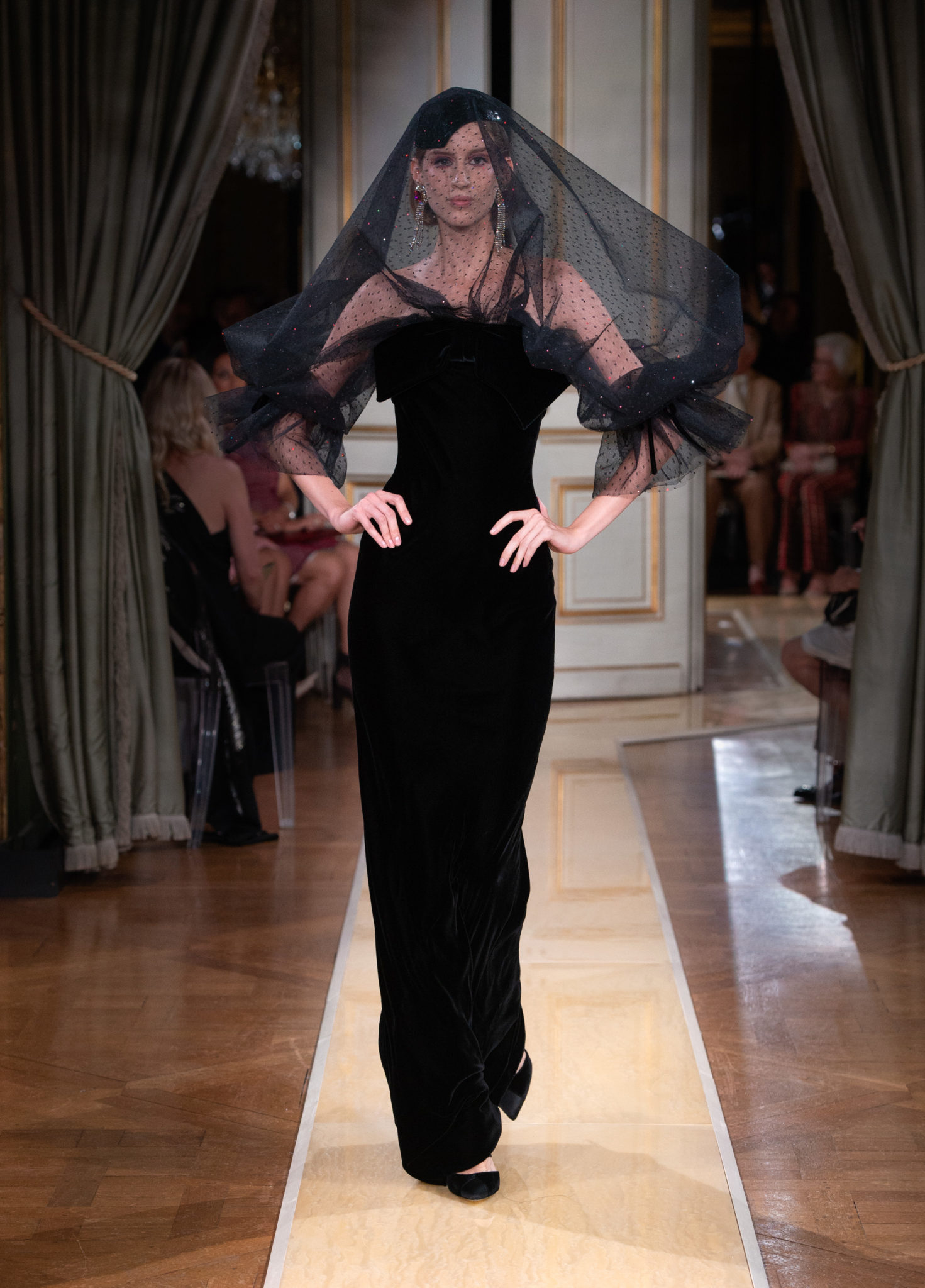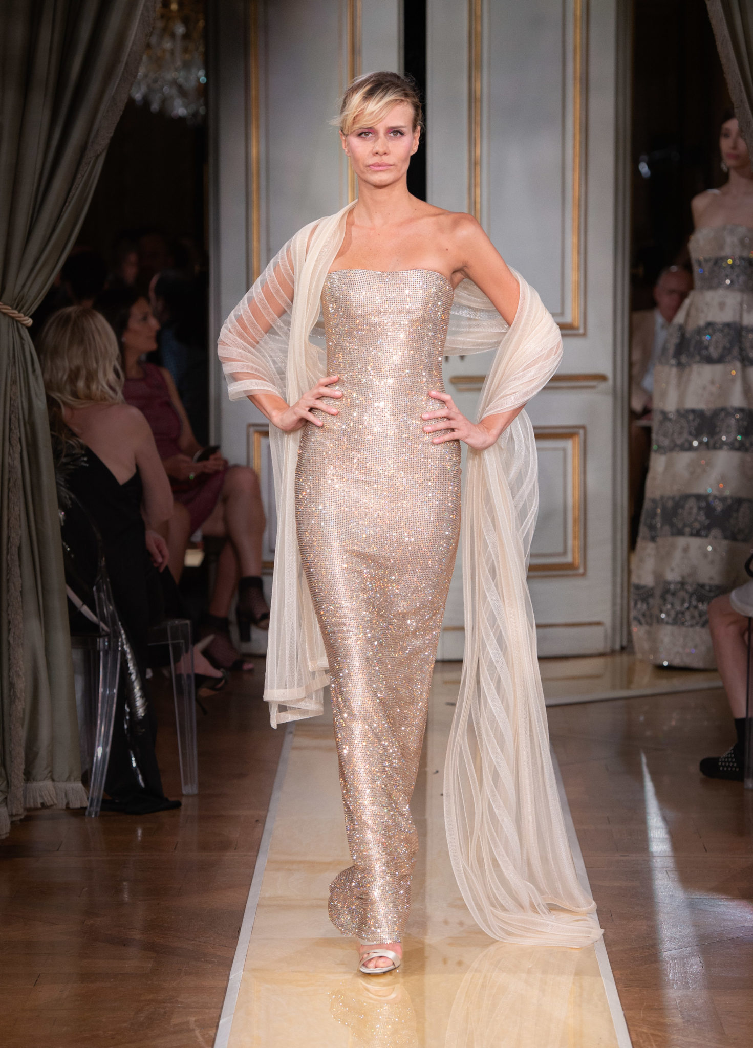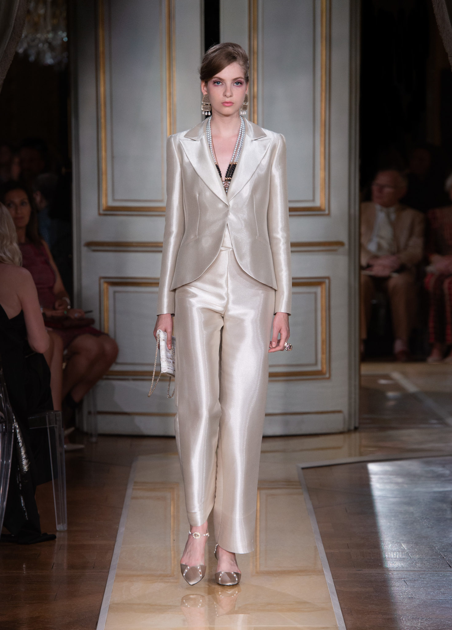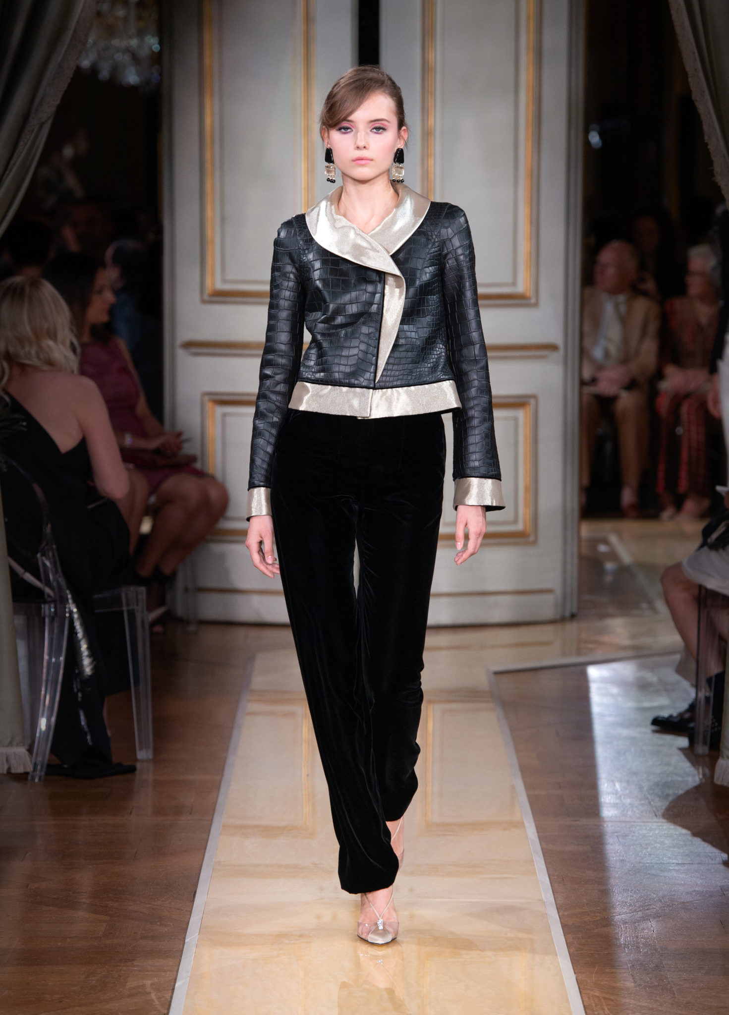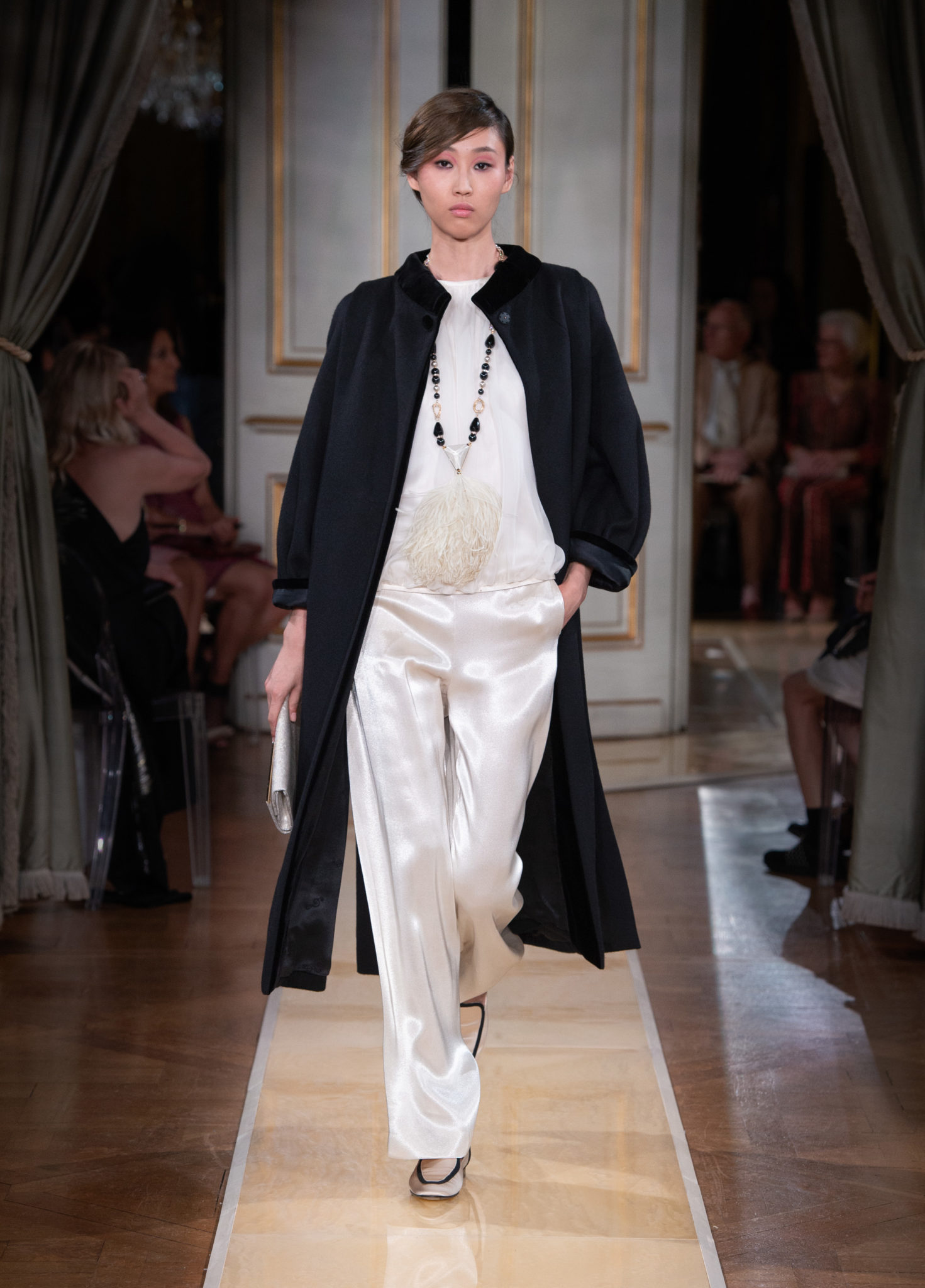 RACONTER À LA NOUVELLE GÉNÉRATION LE VRAI SENS DE LA HAUTE COUTURE, EN LA PRÉSENTANT COMME LES DÉFILÉS DE MODE D’AUTREFOIS, L’ESSENCE MÊME DU LUXE ET LA PERFECTION, C’EST UNE INTENTION QUI S’EST TRANSFORMÉE EN INSPIRATION POUR GIORGIO ARMANI. CETTE HAUTE COUTURE S’EXPRIME À TRAVERS UN STYLE SCULPTURAL, SOMPTUEUX, MAIS AUSSI PAR LA RICHESSE DES TISSUS PERMETTANT DE RÉALISER DES VÊTEMENTS SPECTACULAIRES AUX ALTERNANCES DE TONS NOIRS ET CHAMPAGNE. COMME LE SMOKING EN SATIN BRILLANT, QUINTESSENCE DE L’ÉLÉGANT, DÉCLINÉ DANS CETTE INATTENDUE COMBINAISON DE COULEUR, OU LA ROBE TULIPE EN VELOURS ET CRÊPE CADY, OU BIEN ENCORE CETTE SUBLIME ROBE RÉALISÉE AVEC DES CENTAINES DE MÈTRES DE TULLE VAPOREUX. UNE PROFUSION DE PETITS VOLANTS SUR LESQUELS LE VENT SEMBLE SOUFFLER DONNENT DU MOUVEMENT À LA LONGUE ROBE NOIRE.