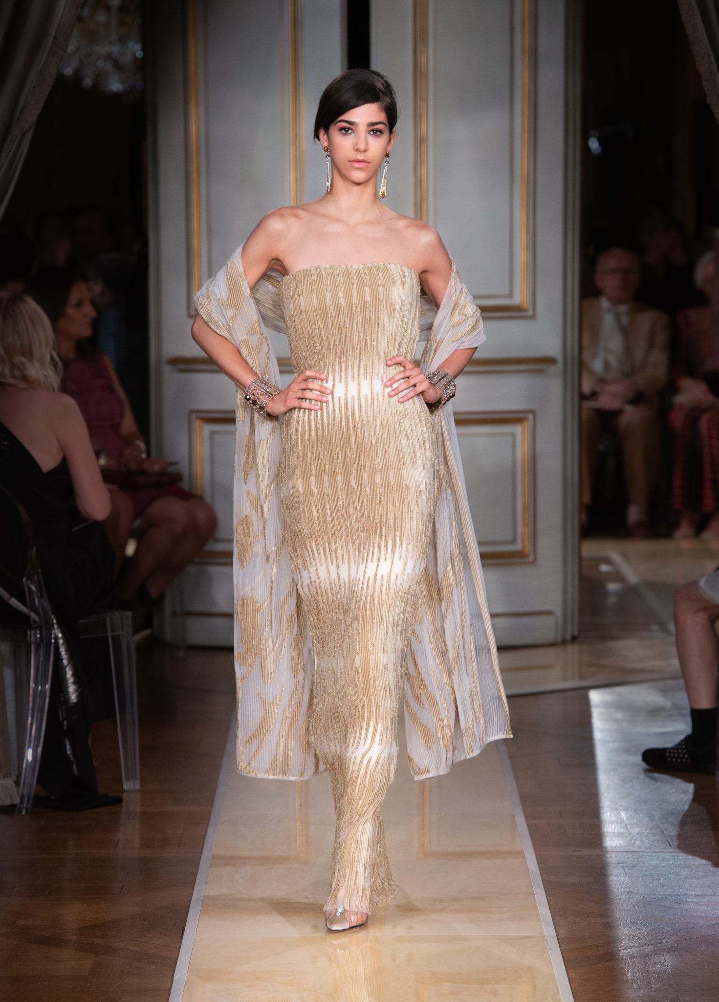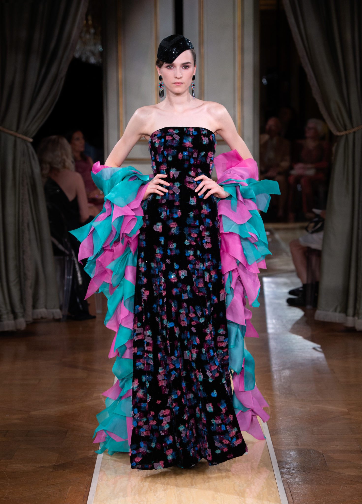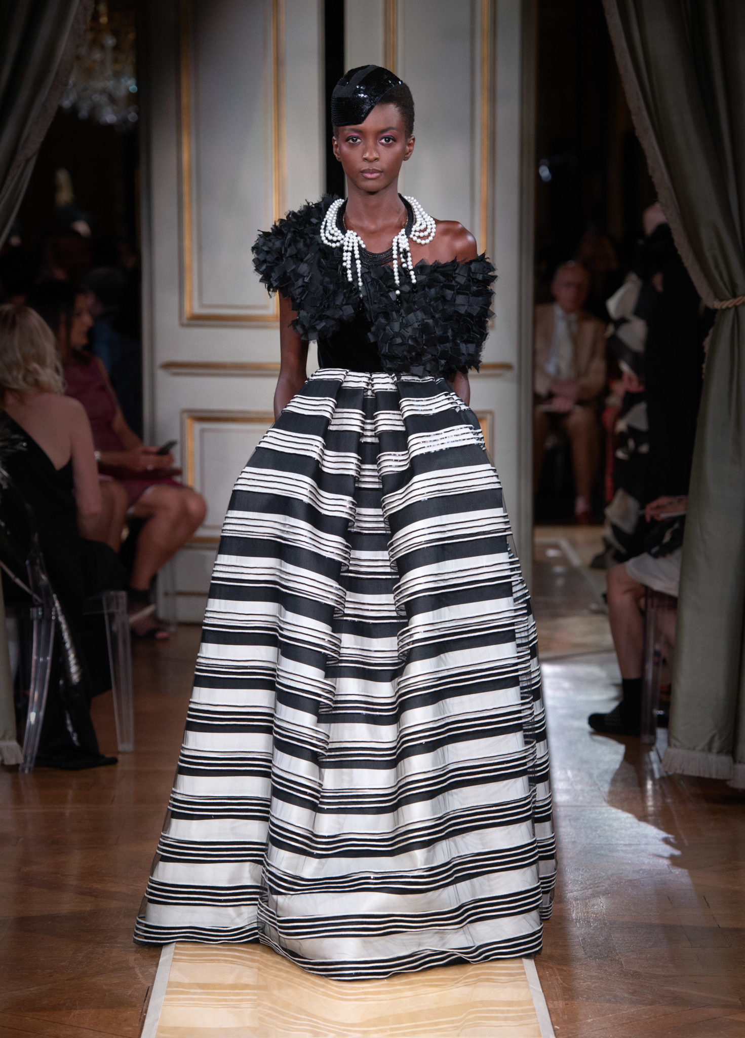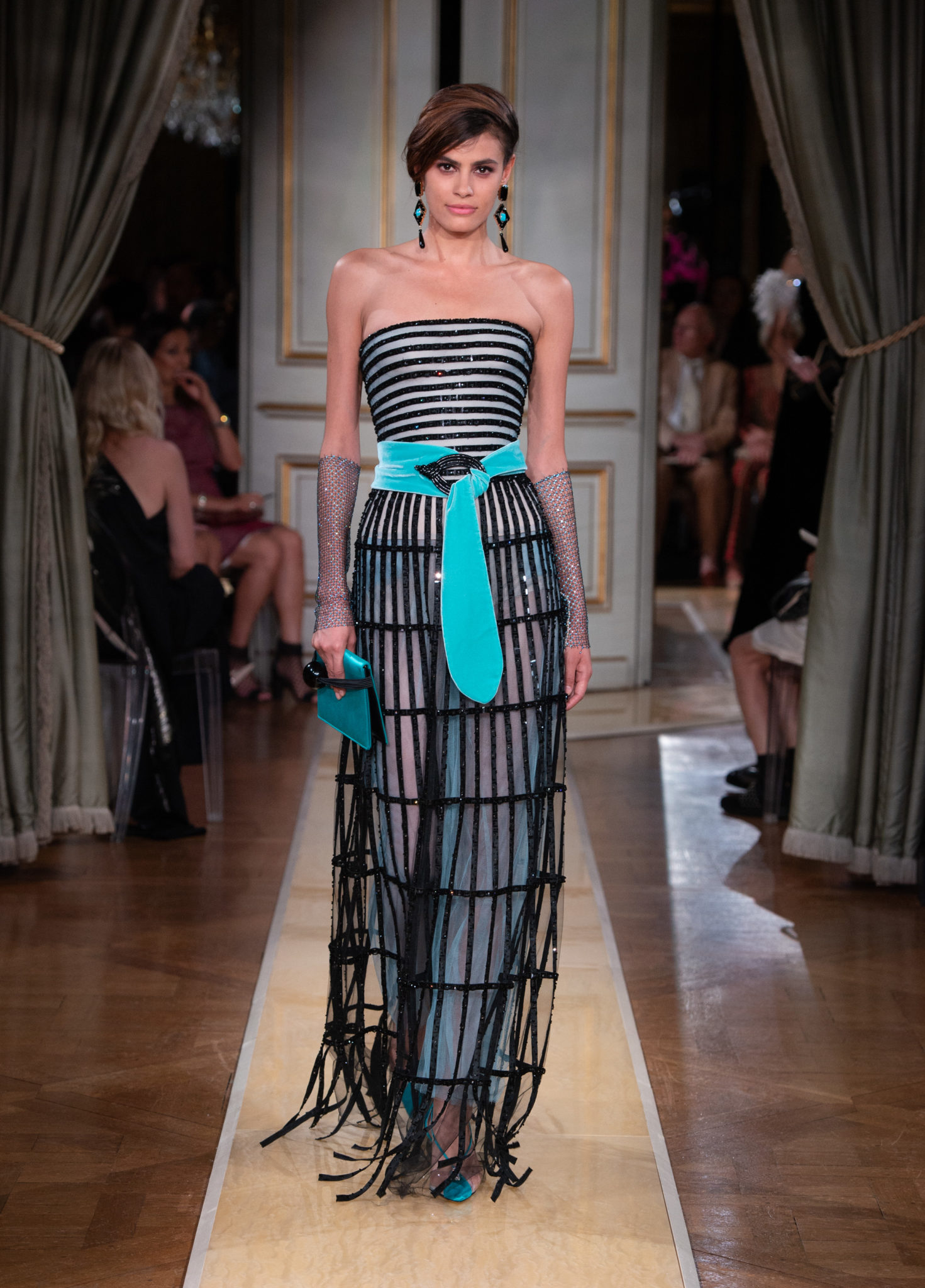 RACONTER À LA NOUVELLE GÉNÉRATION LE VRAI SENS DE LA HAUTE COUTURE, EN LA PRÉSENTANT COMME LES DÉFILÉS DE MODE D’AUTREFOIS, L’ESSENCE MÊME DU LUXE ET LA PERFECTION, C’EST UNE INTENTION QUI S’EST TRANSFORMÉE EN INSPIRATION POUR GIORGIO ARMANI. CETTE HAUTE COUTURE S’EXPRIME À TRAVERS UN STYLE SCULPTURAL, SOMPTUEUX, MAIS AUSSI PAR LA RICHESSE DES TISSUS PERMETTANT DE RÉALISER DES VÊTEMENTS SPECTACULAIRES AUX ALTERNANCES DE TONS NOIRS ET CHAMPAGNE. COMME LE SMOKING EN SATIN BRILLANT, QUINTESSENCE DE L’ÉLÉGANT, DÉCLINÉ DANS CETTE INATTENDUE COMBINAISON DE COULEUR, OU LA ROBE TULIPE EN VELOURS ET CRÊPE CADY, OU BIEN ENCORE CETTE SUBLIME ROBE RÉALISÉE AVEC DES CENTAINES DE MÈTRES DE TULLE VAPOREUX. UNE PROFUSION DE PETITS VOLANTS SUR LESQUELS LE VENT SEMBLE SOUFFLER DONNENT DU MOUVEMENT À LA LONGUE ROBE NOIRE.