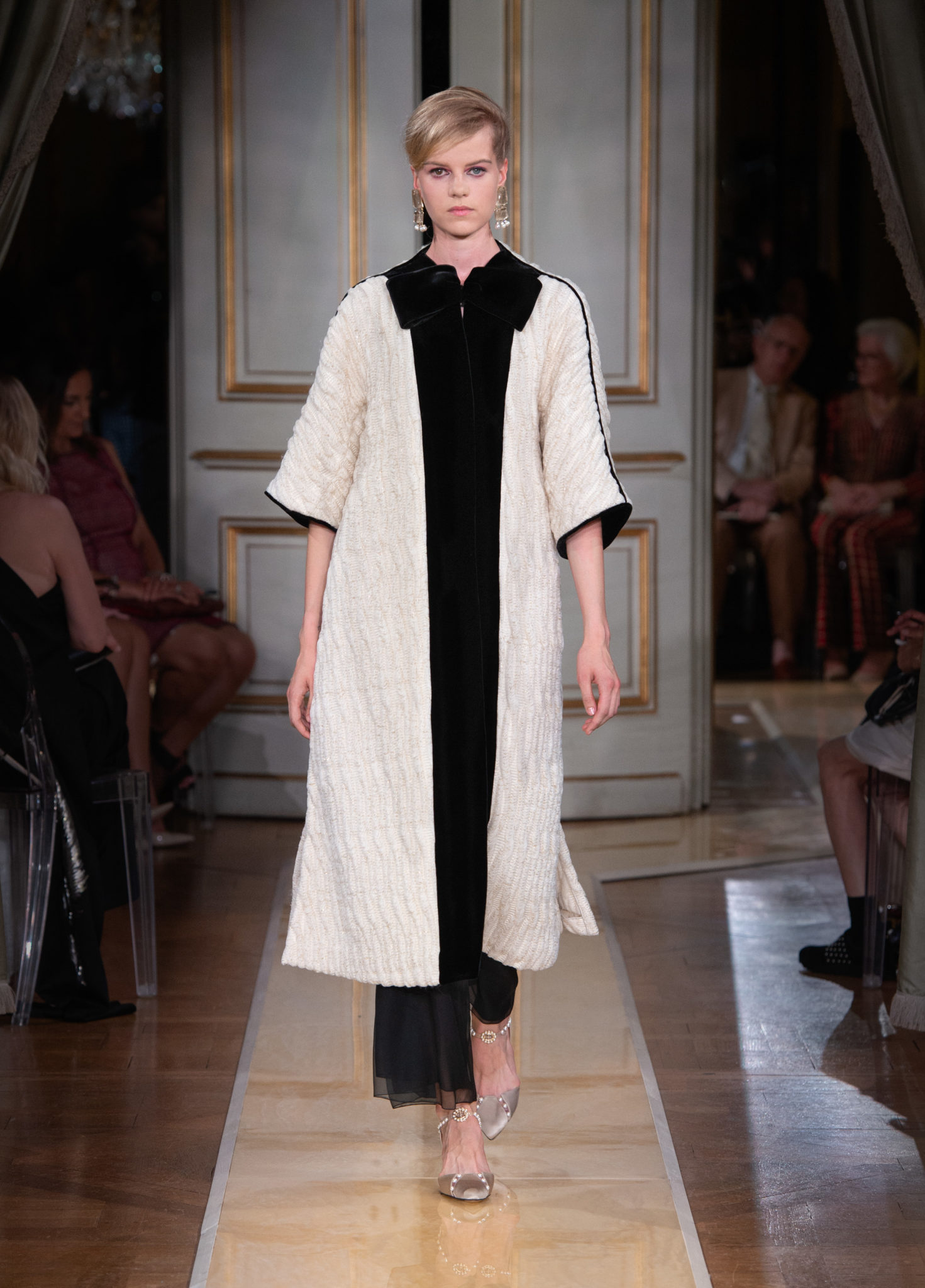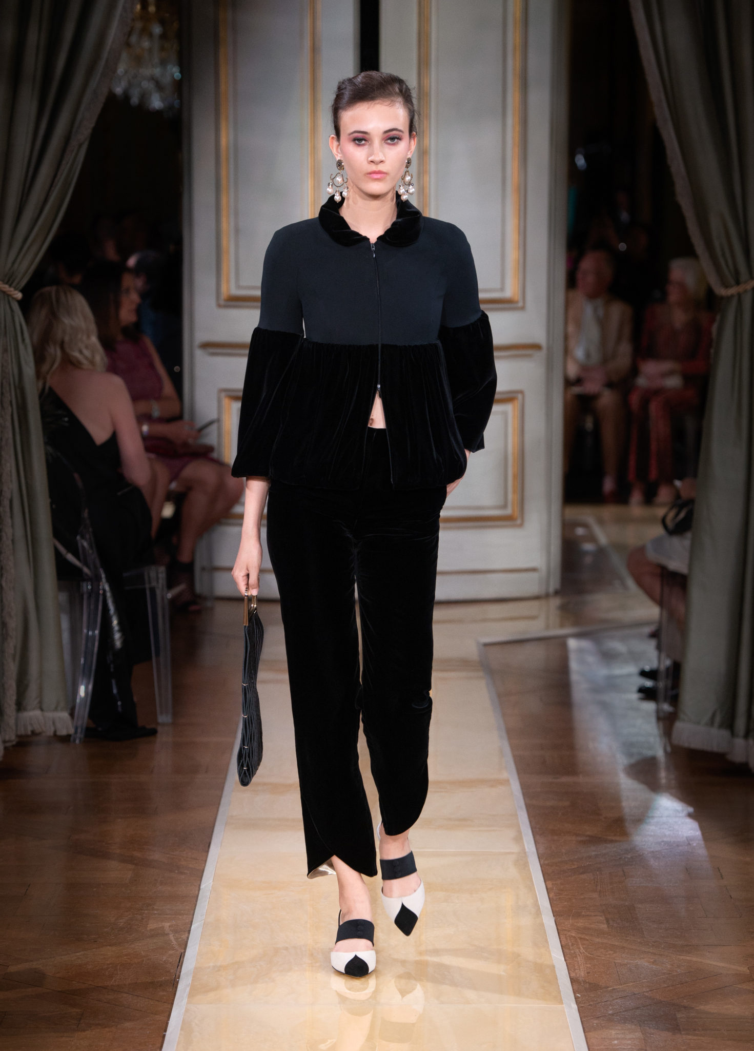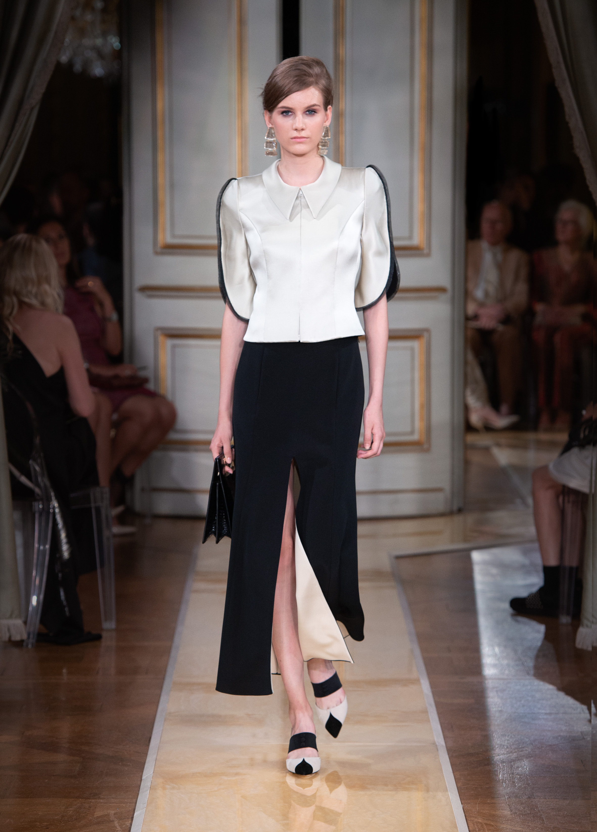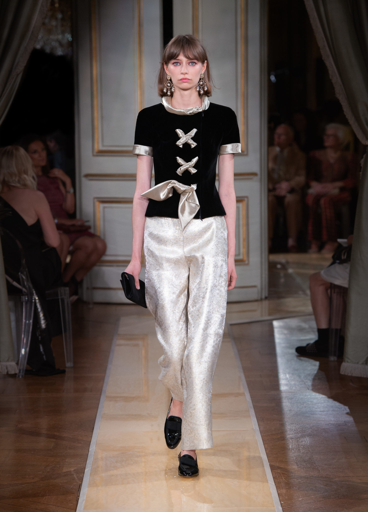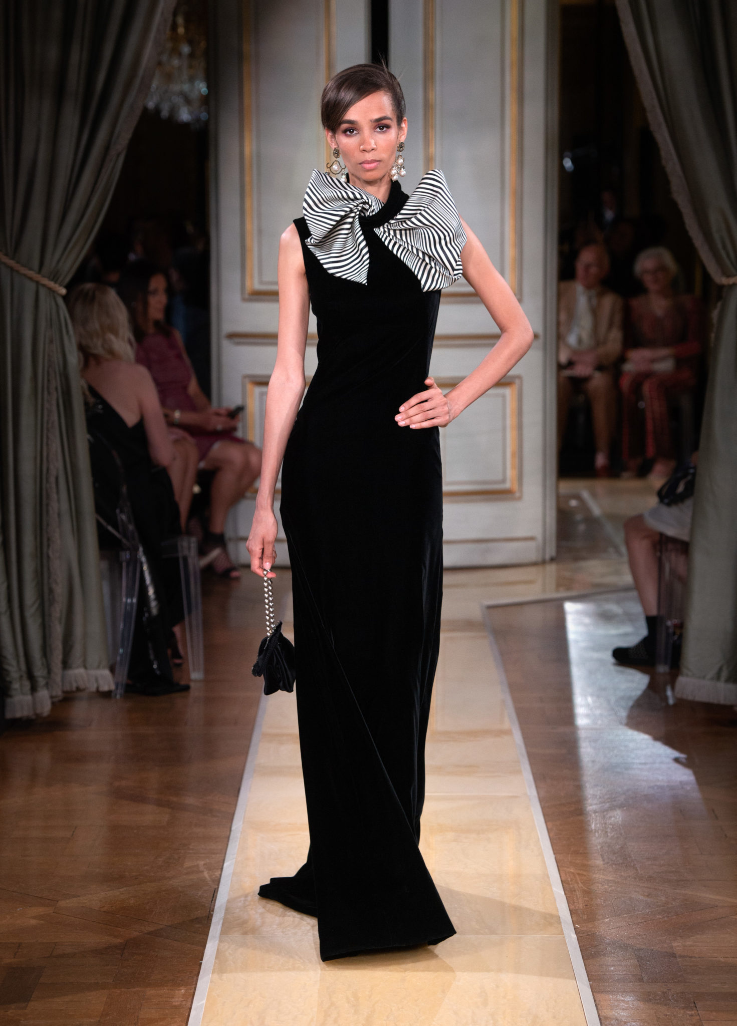 RACONTER À LA NOUVELLE GÉNÉRATION LE VRAI SENS DE LA HAUTE COUTURE, EN LA PRÉSENTANT COMME LES DÉFILÉS DE MODE D’AUTREFOIS, L’ESSENCE MÊME DU LUXE ET LA PERFECTION, C’EST UNE INTENTION QUI S’EST TRANSFORMÉE EN INSPIRATION POUR GIORGIO ARMANI. CETTE HAUTE COUTURE S’EXPRIME À TRAVERS UN STYLE SCULPTURAL, SOMPTUEUX, MAIS AUSSI PAR LA RICHESSE DES TISSUS PERMETTANT DE RÉALISER DES VÊTEMENTS SPECTACULAIRES AUX ALTERNANCES DE TONS NOIRS ET CHAMPAGNE. COMME LE SMOKING EN SATIN BRILLANT, QUINTESSENCE DE L’ÉLÉGANT, DÉCLINÉ DANS CETTE INATTENDUE COMBINAISON DE COULEUR, OU LA ROBE TULIPE EN VELOURS ET CRÊPE CADY, OU BIEN ENCORE CETTE SUBLIME ROBE RÉALISÉE AVEC DES CENTAINES DE MÈTRES DE TULLE VAPOREUX. UNE PROFUSION DE PETITS VOLANTS SUR LESQUELS LE VENT SEMBLE SOUFFLER DONNENT DU MOUVEMENT À LA LONGUE ROBE NOIRE.