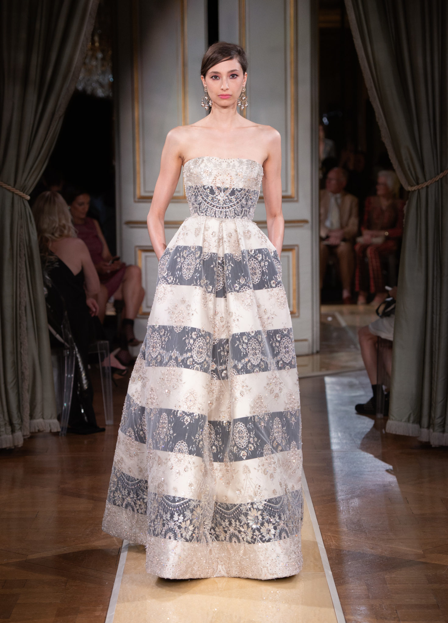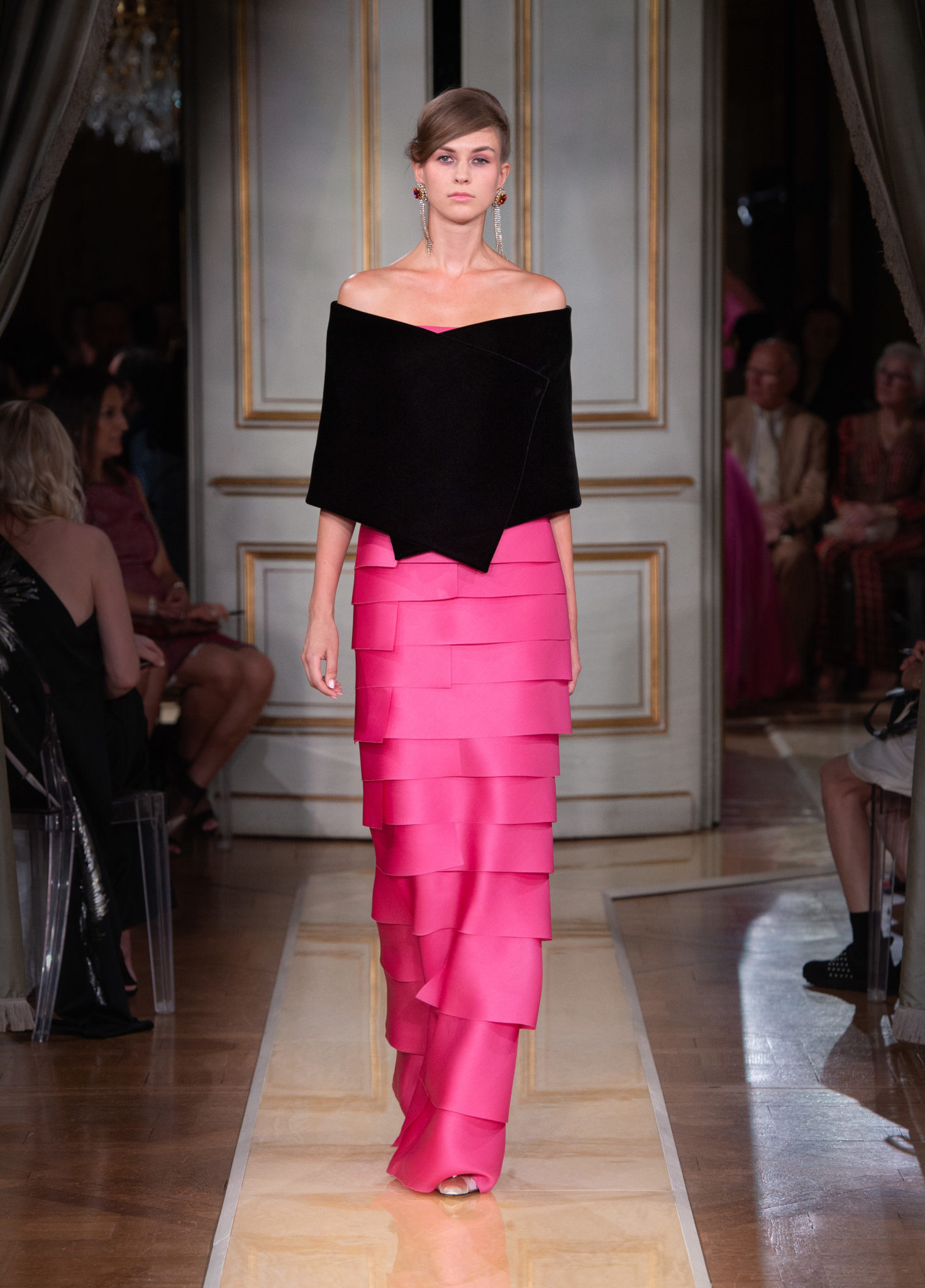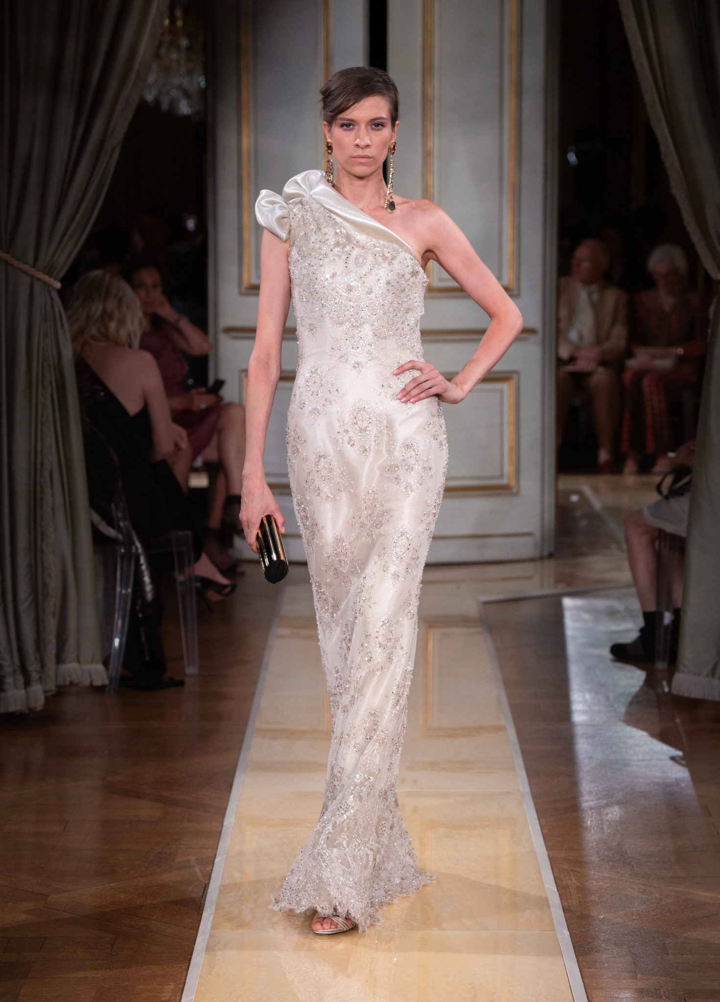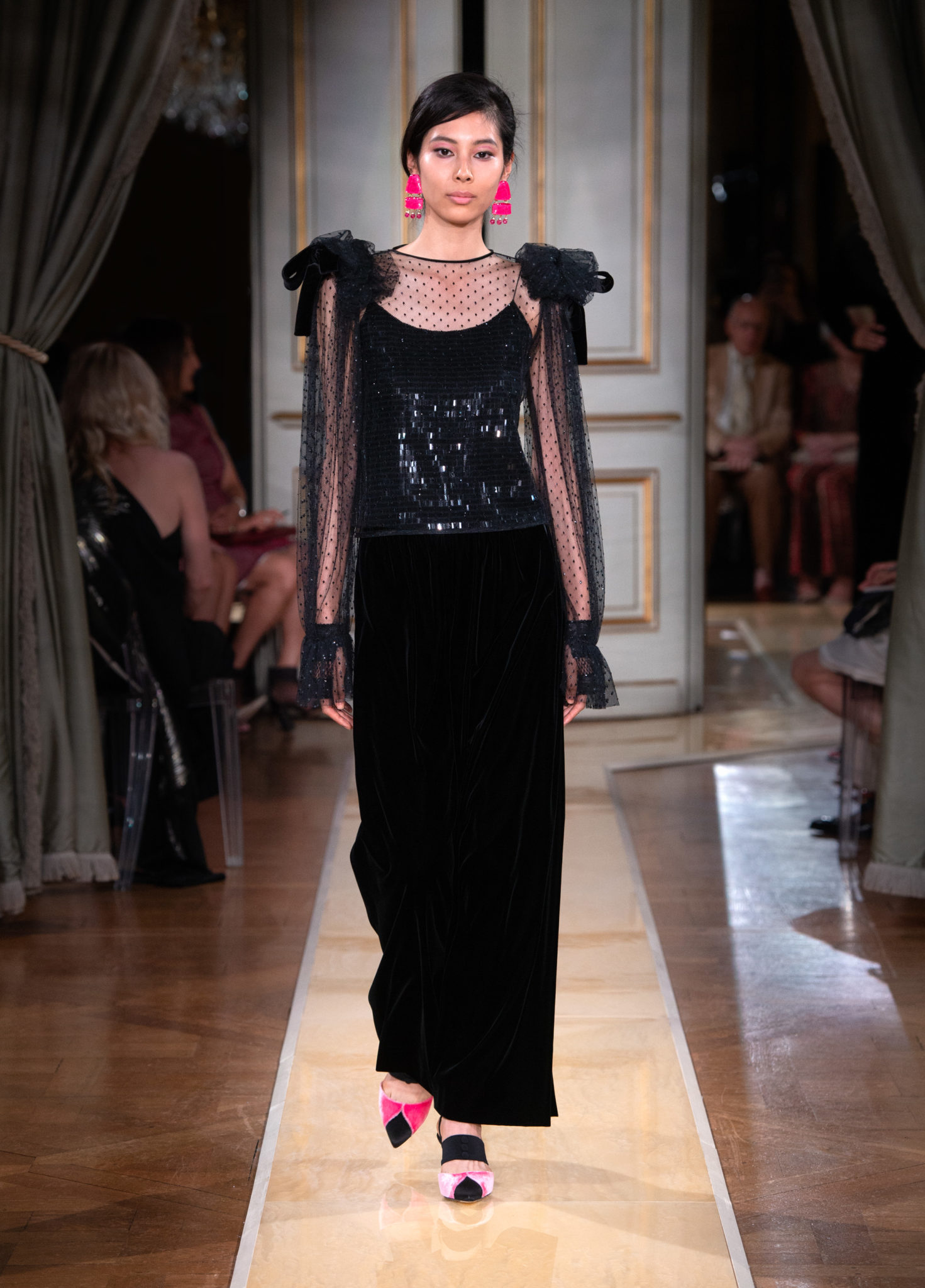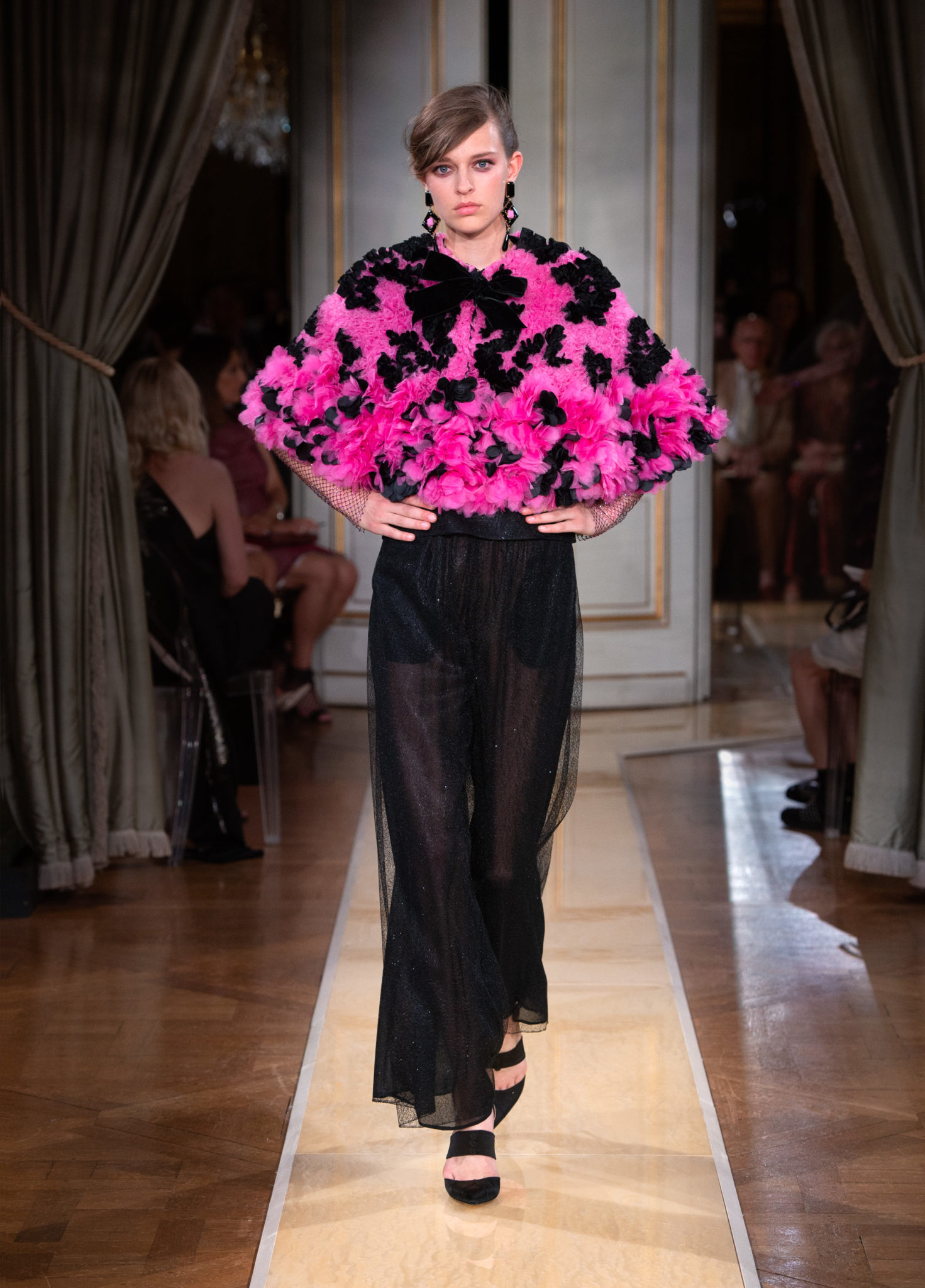 RACONTER À LA NOUVELLE GÉNÉRATION LE VRAI SENS DE LA HAUTE COUTURE, EN LA PRÉSENTANT COMME LES DÉFILÉS DE MODE D’AUTREFOIS, L’ESSENCE MÊME DU LUXE ET LA PERFECTION, C’EST UNE INTENTION QUI S’EST TRANSFORMÉE EN INSPIRATION POUR GIORGIO ARMANI. CETTE HAUTE COUTURE S’EXPRIME À TRAVERS UN STYLE SCULPTURAL, SOMPTUEUX, MAIS AUSSI PAR LA RICHESSE DES TISSUS PERMETTANT DE RÉALISER DES VÊTEMENTS SPECTACULAIRES AUX ALTERNANCES DE TONS NOIRS ET CHAMPAGNE. COMME LE SMOKING EN SATIN BRILLANT, QUINTESSENCE DE L’ÉLÉGANT, DÉCLINÉ DANS CETTE INATTENDUE COMBINAISON DE COULEUR, OU LA ROBE TULIPE EN VELOURS ET CRÊPE CADY, OU BIEN ENCORE CETTE SUBLIME ROBE RÉALISÉE AVEC DES CENTAINES DE MÈTRES DE TULLE VAPOREUX. UNE PROFUSION DE PETITS VOLANTS SUR LESQUELS LE VENT SEMBLE SOUFFLER DONNENT DU MOUVEMENT À LA LONGUE ROBE NOIRE.